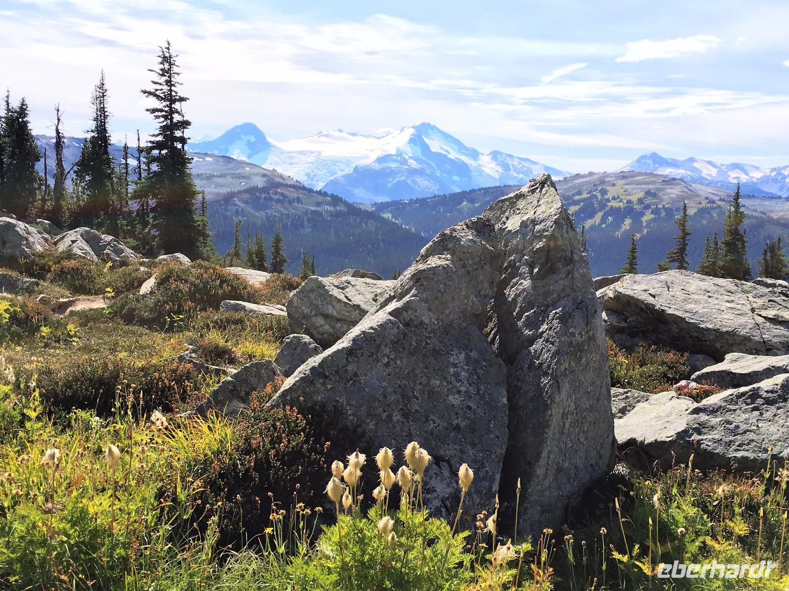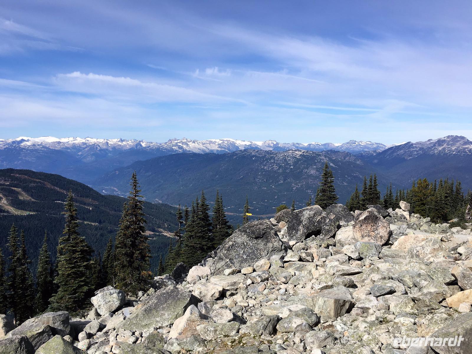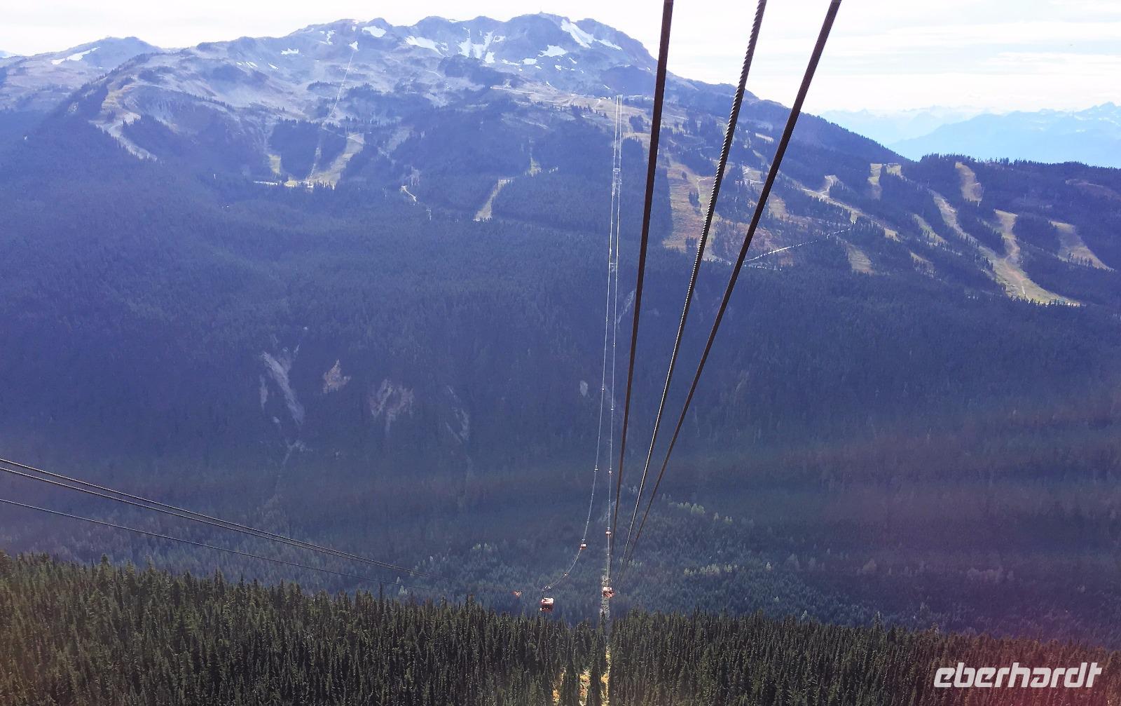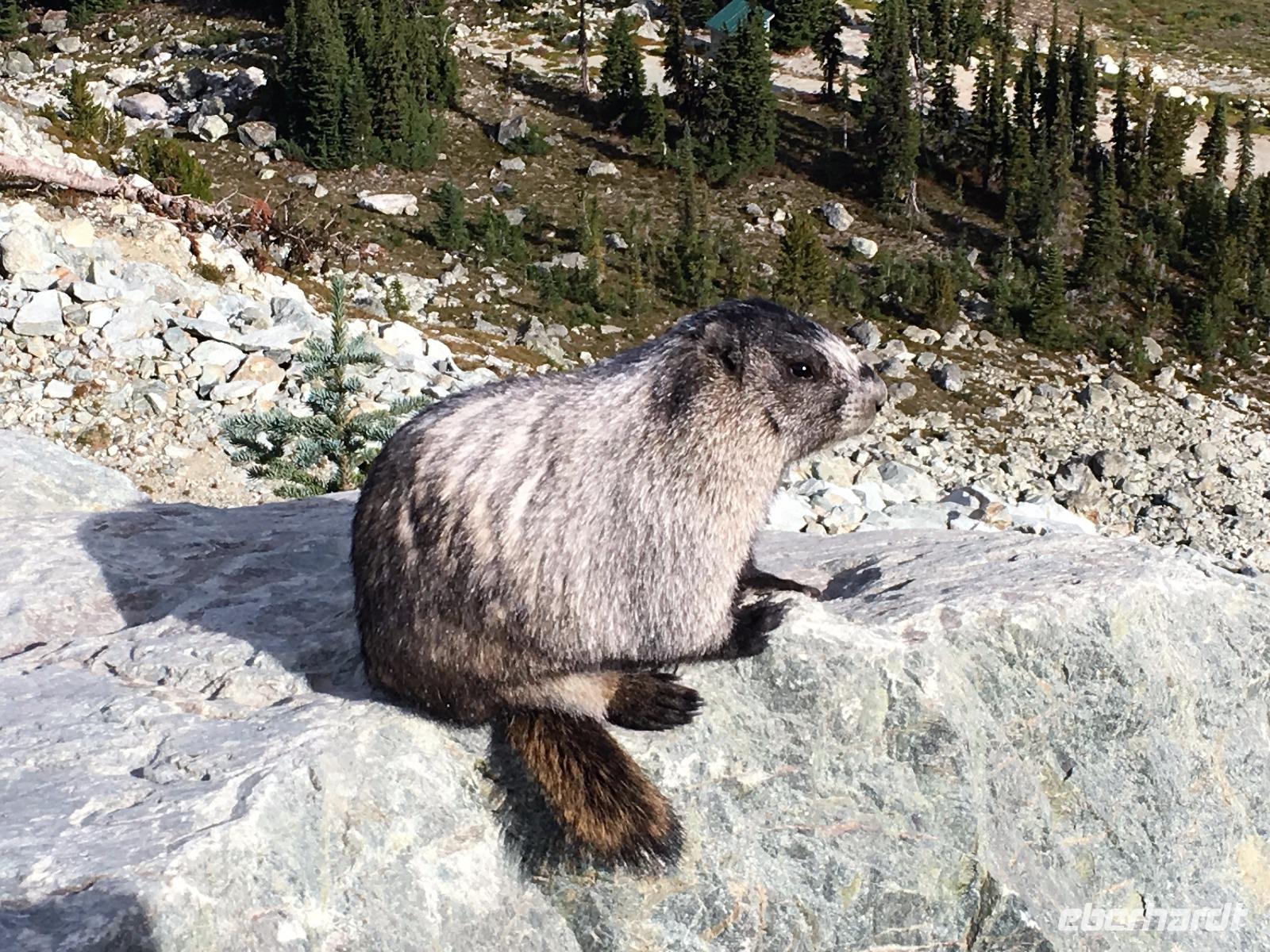 Guten Morgen in Whistler. Ach wie toll, die Sonne strahlt, das ist wunderbar, denn heute werden wir wandern gehen. Vorerst ein derftiges Fruehstueck, danach Picknick Einkauf und hinauf geht es mit 6-er Gondeln auf Whistler Mountain. Da gibt es auch einen Zwischenhalt und wir wollen natuerlich gleich aussteigen, ahhh nein, Elisabeth hat doch gesagt, wir sollen sitzen bleiben bis wir ganz oben auf dem Berg sind. Da ist es schoen, die Kanada- und die 2010 Olympia-Fahnen wehen im zarten Hauch des Windes und wir gehen auch gleich zu der Peak 2 Peak Gondola. Diese schwebende Verbindung der zwei Berge hat die laengste Seilspanne der Welt und ist nicht nur ein Erlebnis sondern auch ein technisches Spitzenprodukt. Die ganze Gruppe passt in eine Gondel und bald schweben wir hoch ueber dem Fitzsimmons Tal. Auf Blackcomb angekommen schauen uns Murmeltiere an. Sie stehen genau wie wir ziemlich unschluessig da. Wer ist wohl mehr am anderen interessiert ? Nach ein paar gelungenen Fotos beginnen wir unsere heutige Wanderung. Entlang des Berges gibt es einen schoenen Pfad ueber Stock und Stein. Den gehen wir fuer gute 1 ½ Stunden und bloss die perfekten Bonsai-Tannen und Fichten begleiten uns. Die Entscheidung auf eine Anhoehe zu wandern ist zwar eine anstrengende fuer einige, aber die Belohnung fuer die Strapazen ist gebuehrend hoch. Blackcomb Lake liegt wunderschoen am Fusse von einer Bergspitze die 7. Himmel heisst. Wir sind auch im 7. Himmel und wandern nach einer Weile und viele Fotos spaeter wieder auf den Weg hinunter und weiter zu einem kleineren See von dem man jedoch eine herrliche Aussicht geniesst. Jetzt ist es Zeit fuers mitgebrachte Picknick. Es wird immer waermer und bald steigen die Temperaturen auf 22 Grad. Fast waeren einige ins Wasser gesprungen. Aber eben nur fast. Also wandern wir wieder zurueck zur Gondel und stehen auf Whistler Mountain in einer Schlange der Leute, die alle auch wieder nach Whistler hinunter fahren wollen und offensichtlich kein Bike und Ritterausruestung bei sich haben. Wie wir ! Die Schlange ist lang aber es geht bloss 10 Minuten und schon sitzen wir in den eierfoermigen Gondeln. Von oben kann man den Downhill Biker zuschauen, wie sie ueber Baeume springen, steile Pfade meistern und ganz enge Kurven mit Riesengeschwindigkeit ueberleben. Beeindruckend ist das schon. Muede kommen wir im Dorf an. Nun hat jeder sein eigenes Programm, in Whistler braucht man mindestens eine Woche, um nur schon das wenigste mitzumachen. Es ist echt eine Spielwiese fuer Erwachsene. Abendbrot gibt es in einem urchigen Lokal mitten im Dorf ehe wir diesen wunderbaren Wandertag beenden. Einige unter uns schwingen noch die Beine bei flotter irischer Musik im Pup damit wir auch noch den letzten Tropfen Energie los werden. Der Geraeuschpegel des Bierfestes droehnt noch lange in die Nacht, aber unser Hotel hat Schallwaende und 3-fach Verglasung. Wussten die, dass wir auch schlafen wollen ?