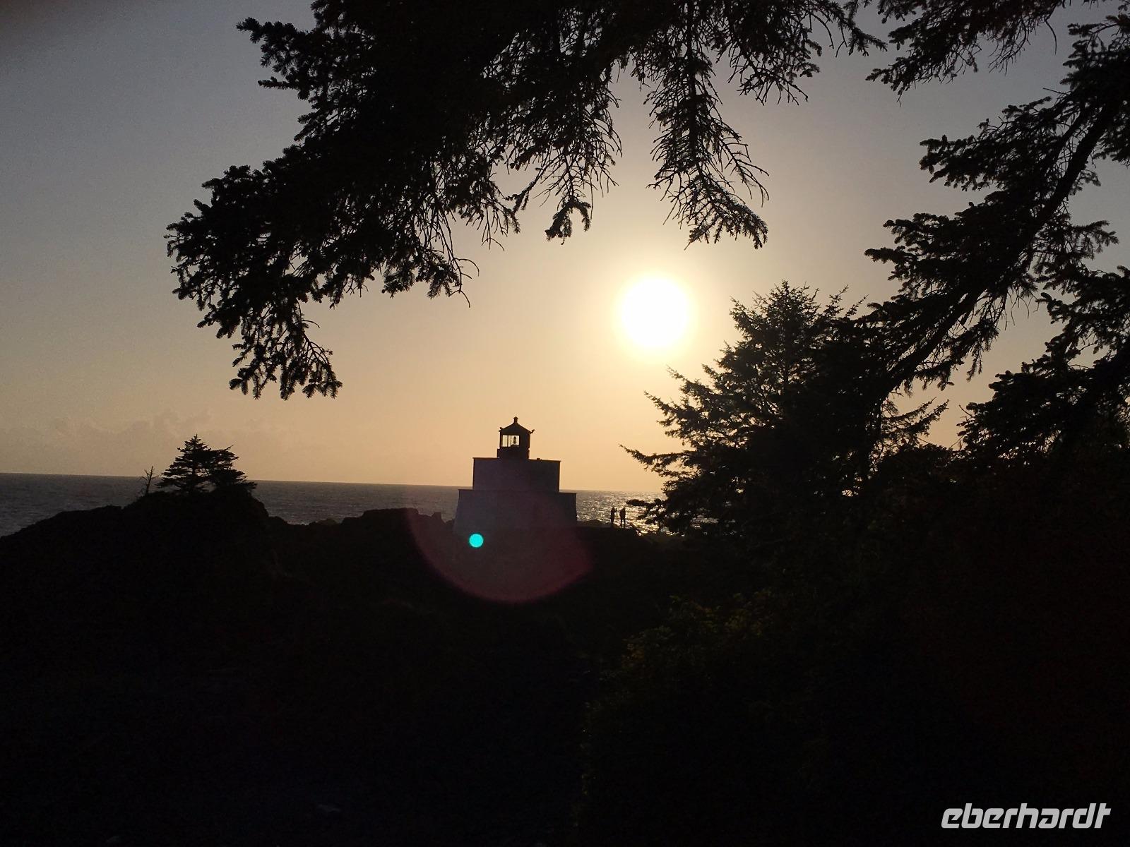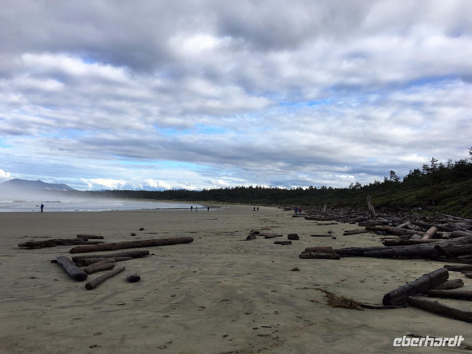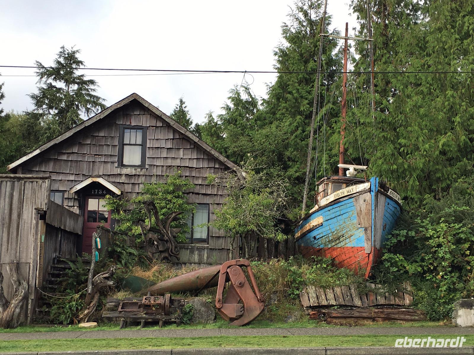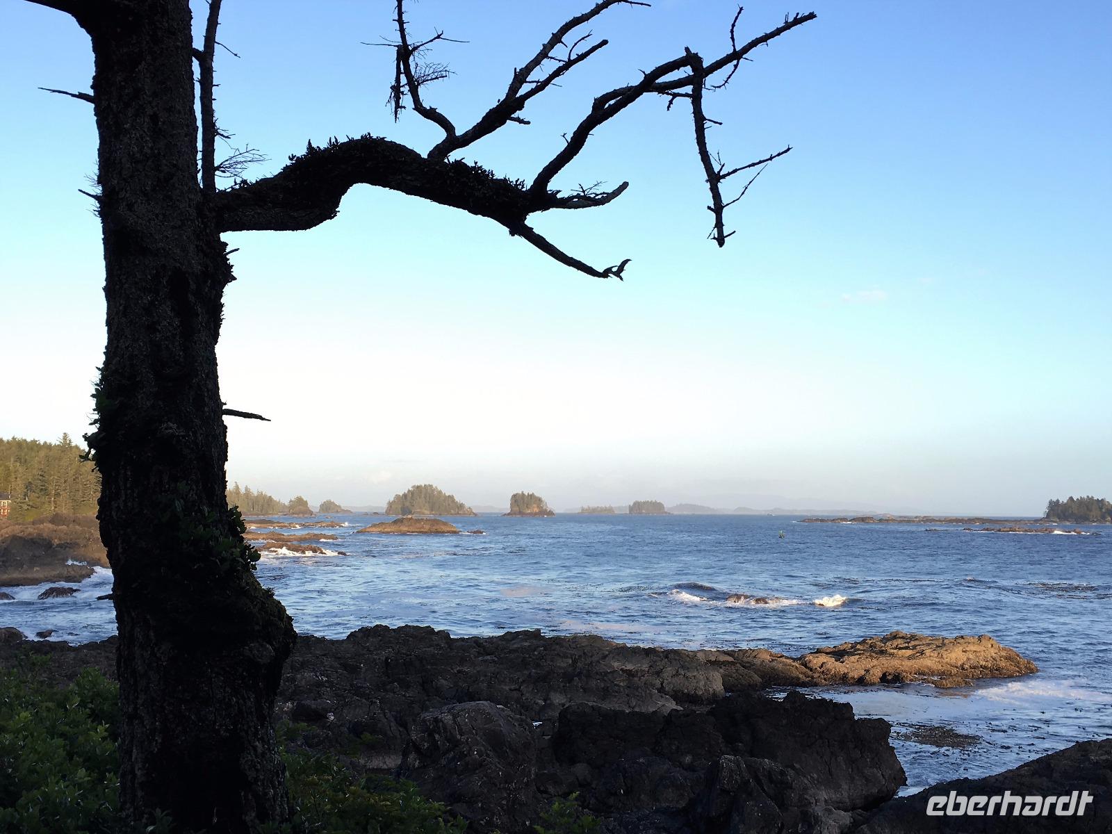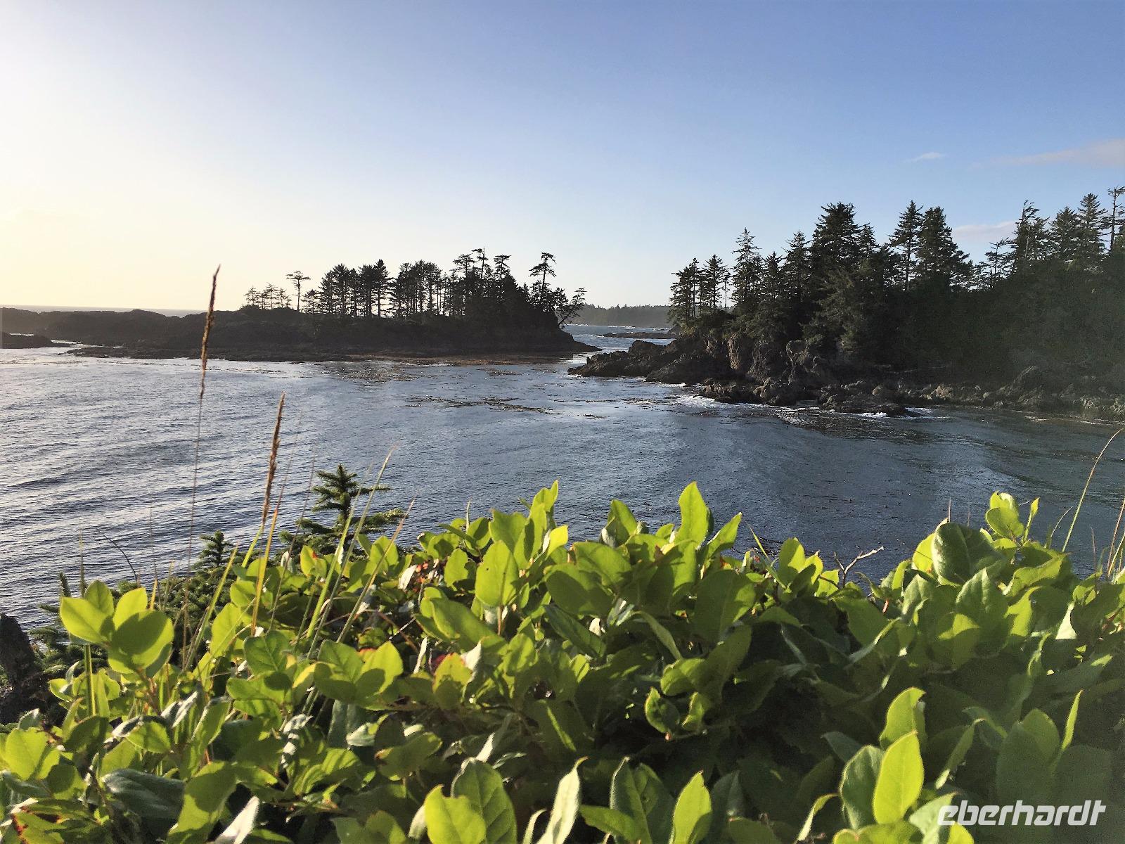Das Fruehstuek schmeckt bestens und ist auch sehr ueppig. Es regnet und so sind wir gar nicht so traurig dies lustige Whistler zu verlassen. Auf der Sea to Sky Highway fahren wir zuegig gen Vancouver. Ein Halt um ein Foto der Tantalus Berge zu schiessen und gleich weiter nach Horseshoe Bay wo die Faehre uns in 1 Stunde 35 Minuten auf die Insel von Vancouver bringen wird. Wir fahren gleich mit dem Bus auf die Faehre und steigen aus um dem Auslaufen beizuwohnen. In der Ferne sieht man die Hochhaeuser von Vancouver. Die Perle des Pazifiks werden wir jedoch erst in 4 Tagen besuchen ! Wir wollen heute nach Ucluelet das ist auf der Westkueste der Insel. Der Mittagsstopp beim Markt in Coombs ist unterhaltsam und die Ziegen stehen wohl auf dem Markthallendach, jedoch unter einem Daechlein da auch sie nicht nass werden wollen. Die Stunde vergeht sehr schnell, da es hier so viel anzuschauen gibt. Waeren die Koffer nicht schon so voll, haetten wir gerne so einen Riesenbudda fuer den lieben Nachbarn, ein Holzspielzeug fuer die Enkelchen oder einen handgefertigten Tontopf fuer den eigenen Garten mitgebracht. Leider, leider. Fuers T-shirt hats gerade noch gereicht. Bis wir wieder im Buss sind, scheint schon fast die Sonne. Ganz vertraeumt gehen wir kurz darauf in einem Urwald spazieren. Die Riesen schauen auf uns Zwerge hinunter und viele Baeume sind von Moos so umgeben, es schaut aus, als haetten die einen Pelzmantel an. Jetzt fahren wir aber weiter, denn die Strecke nach Ucuelet zieht sich immer in die Laenge. Dort angekommen, checken wir ein und fahren gleich an einen schoenen kleinen Strand wo unsere «Romantische Wanderung» startet. Wir wandern eine Stunde der Kueste entlang in einem Regenwald. Die Aussichten aufs Meer sind einfach atemberaubend, die Eindruecke haftend. Brendan holt uns beim Leuchtturm auch wieder ab und bringt uns wieder zurueck ins Dorf. Morgen haben wir auch wieder viel vor also ziehen wir uns auch bald zurueck. Ach ja, vielleicht auch bloss, weil es im Fischerdorf Ucuelet keine Clubs oder Bars gibt !