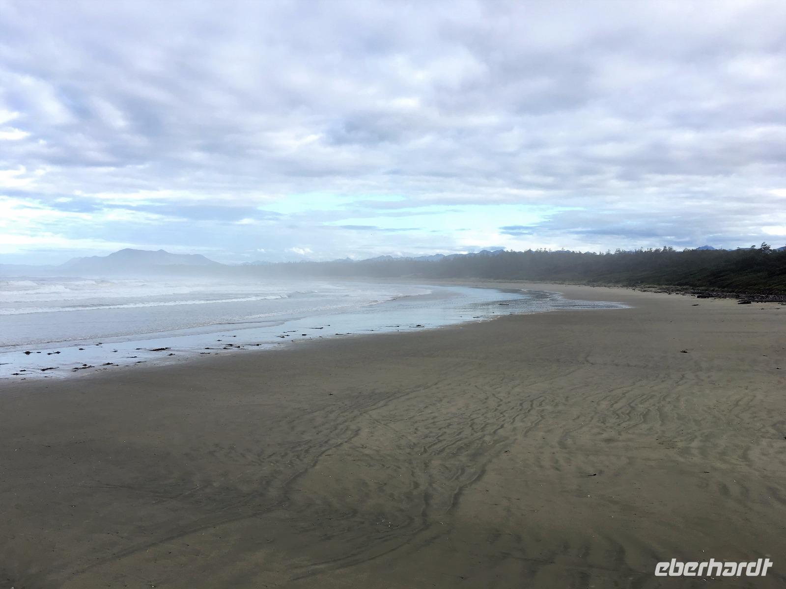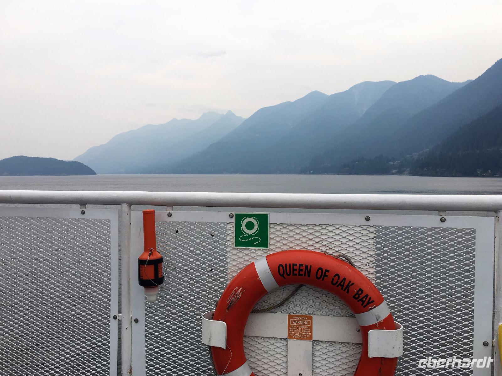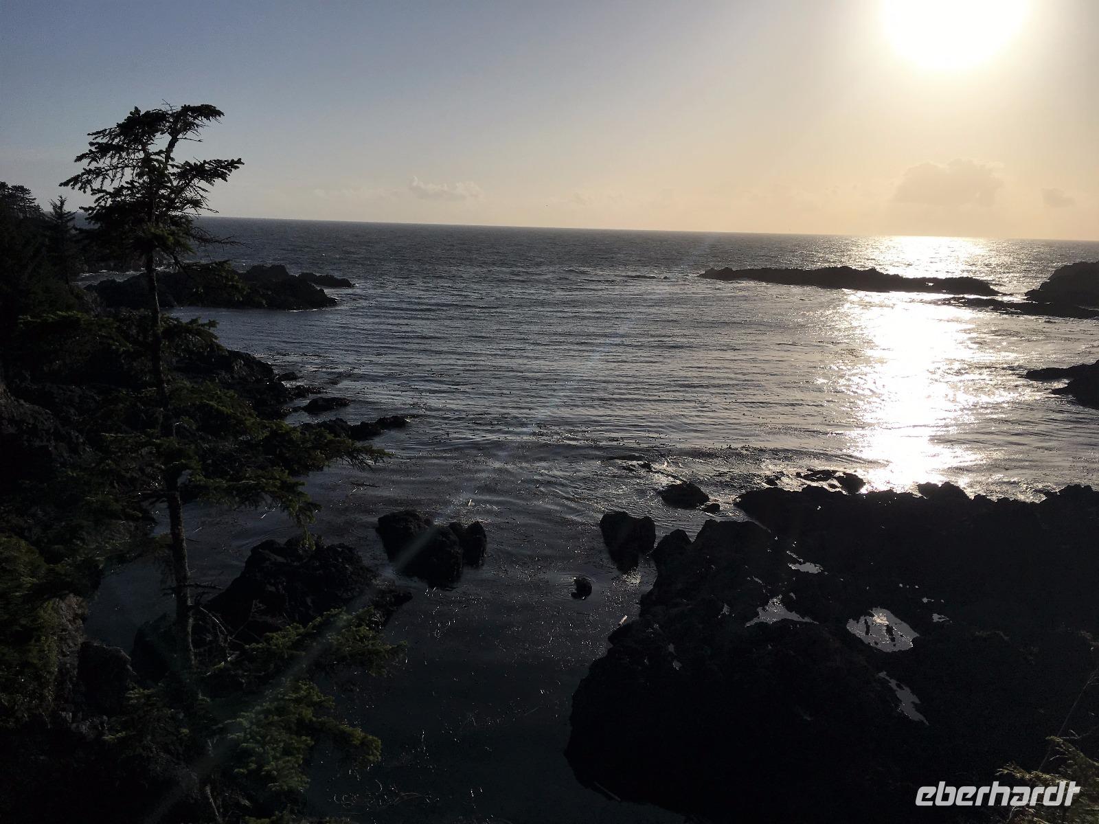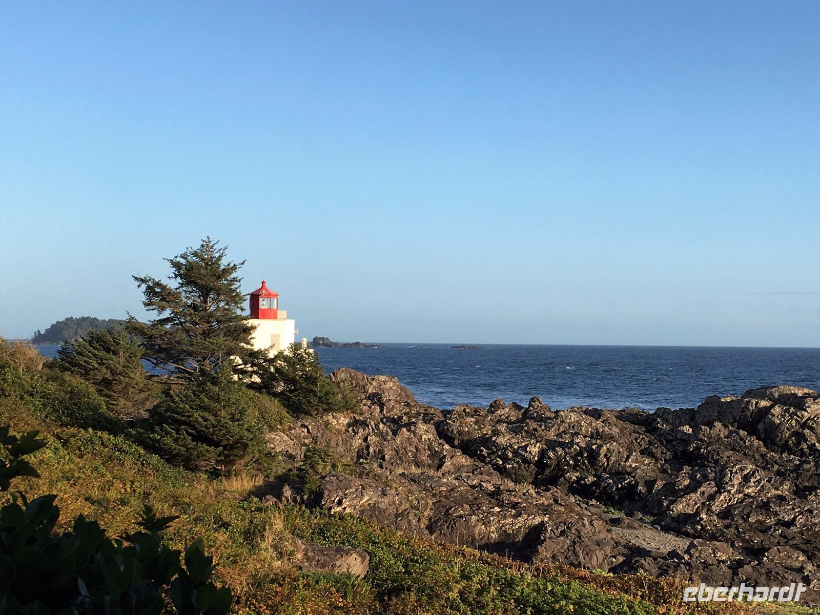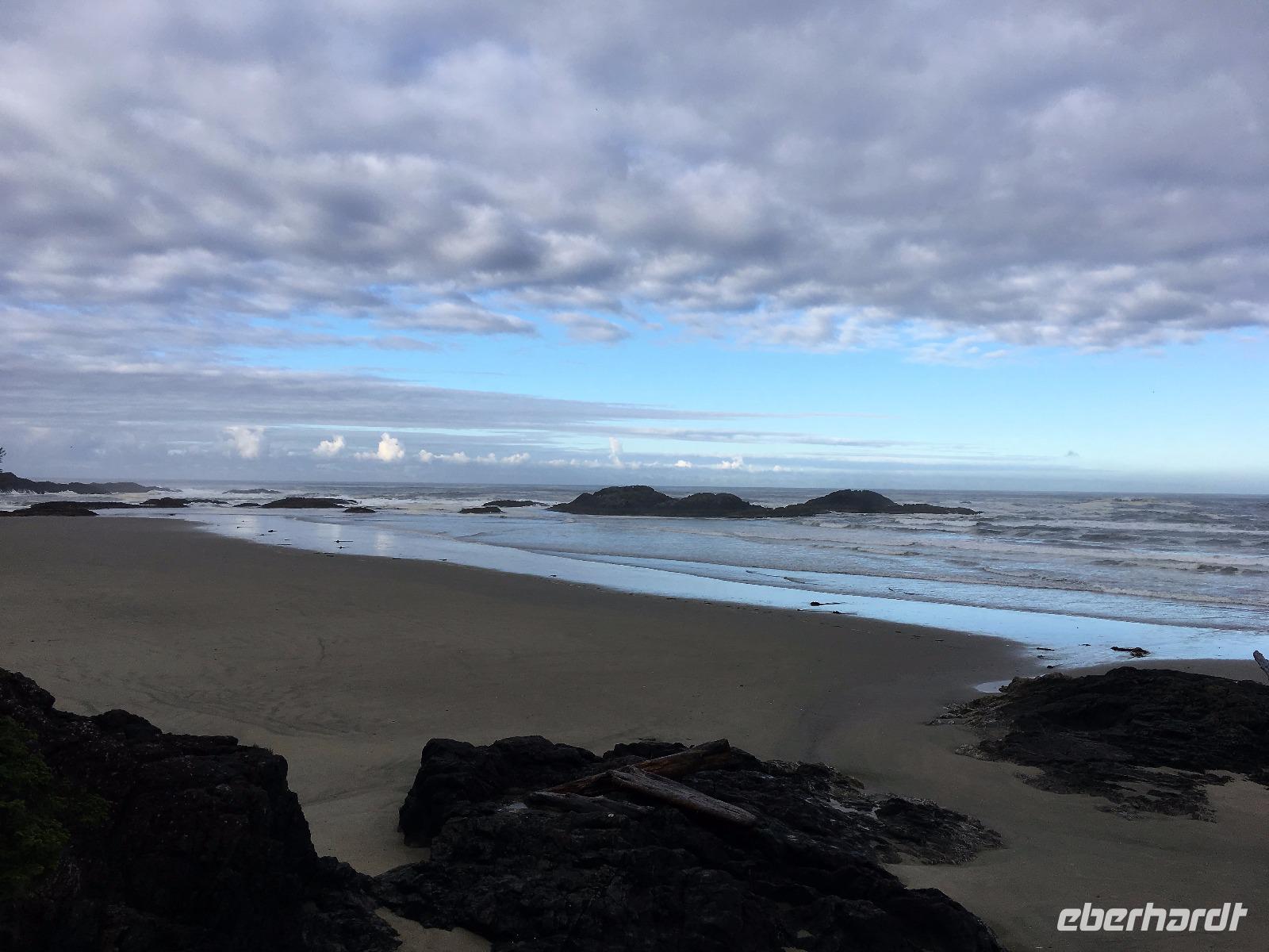Das Fruehstuek schmeckt bestens und ist auch sehr ueppig. Es regnet und so sind wir gar nicht so traurig dies lustige Whistler zu verlassen. Auf der Sea to Sky Highway fahren wir zuegig gen Vancouver. Ein Halt um ein Foto der Tantalus Berge zu schiessen und gleich weiter nach Horseshoe Bay wo die Faehre uns in 1 Stunde 35 Minuten auf die Insel von Vancouver bringen wird. Wir fahren gleich mit dem Bus auf die Faehre und steigen aus um dem Auslaufen beizuwohnen. In der Ferne sieht man die Hochhaeuser von Vancouver. Die Perle des Pazifiks werden wir jedoch erst in 4 Tagen besuchen ! Wir wollen heute nach Ucluelet das ist auf der Westkueste der Insel. Der Mittagsstopp beim Markt in Coombs ist unterhaltsam und die Ziegen stehen wohl auf dem Markthallendach, jedoch unter einem Daechlein da auch sie nicht nass werden wollen. Die Stunde vergeht sehr schnell, da es hier so viel anzuschauen gibt. Waeren die Koffer nicht schon so voll, haetten wir gerne so einen Riesenbudda fuer den lieben Nachbarn, ein Holzspielzeug fuer die Enkelchen oder einen handgefertigten Tontopf fuer den eigenen Garten mitgebracht. Leider, leider. Fuers T-shirt hats gerade noch gereicht. Bis wir wieder im Buss sind, scheint schon fast die Sonne. Ganz vertraeumt gehen wir kurz darauf in einem Urwald spazieren. Die Riesen schauen auf uns Zwerge hinunter und viele Baeume sind von Moos so umgeben, es schaut aus, als haetten die einen Pelzmantel an. Jetzt fahren wir aber weiter, denn die Strecke nach Ucuelet zieht sich immer in die Laenge. Dort angekommen, checken wir ein und fahren gleich an einen schoenen kleinen Strand wo unsere «Romantische Wanderung» startet. Wir wandern eine Stunde der Kueste entlang in einem Regenwald. Die Aussichten aufs Meer sind einfach atemberaubend, die Eindruecke haftend. Brendan holt uns beim Leuchtturm auch wieder ab und bringt uns wieder zurueck ins Dorf. Morgen haben wir auch wieder viel vor also ziehen wir uns auch bald zurueck. Ach ja, vielleicht auch bloss, weil es im Fischerdorf Ucuelet keine Clubs oder Bars gibt !