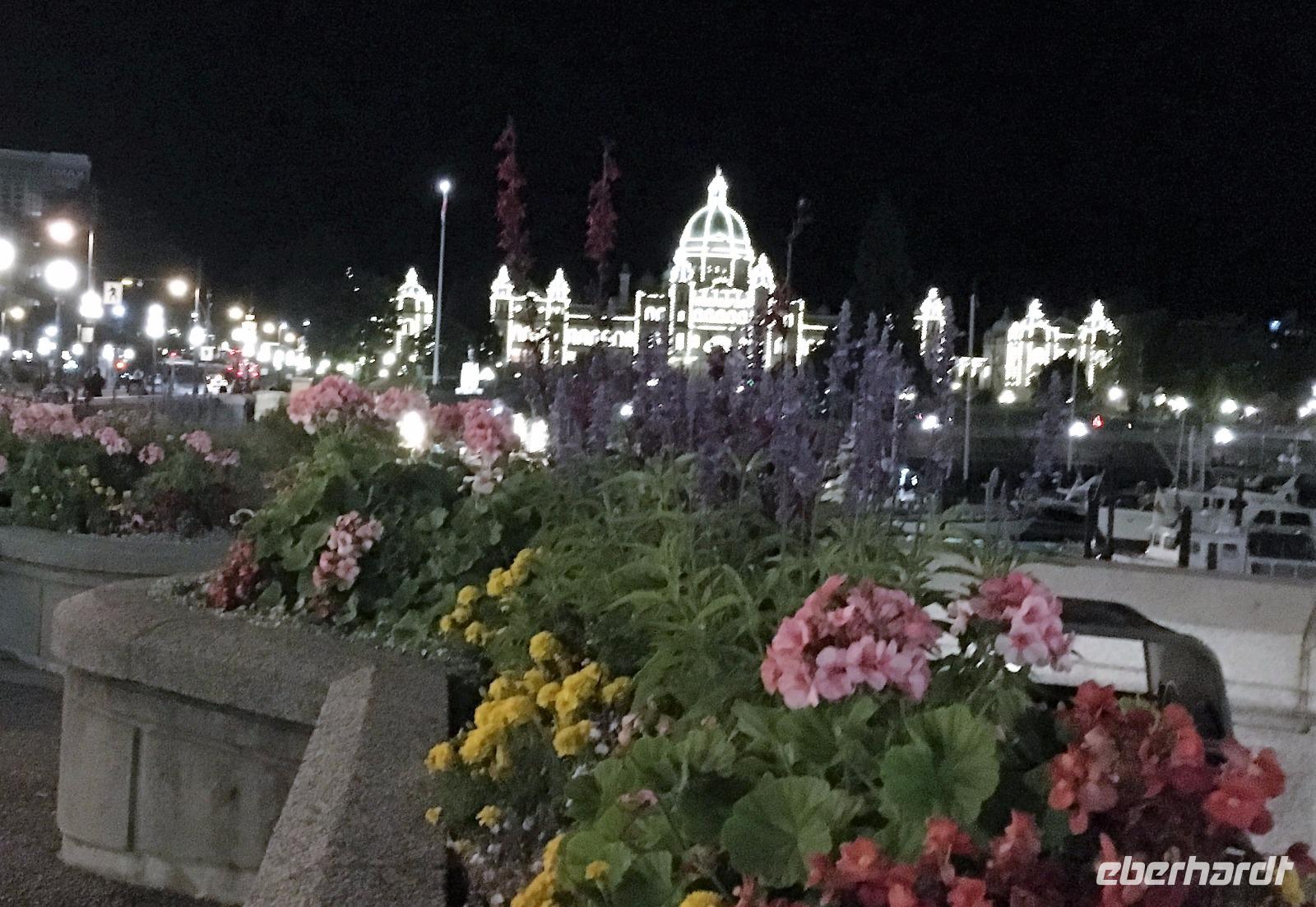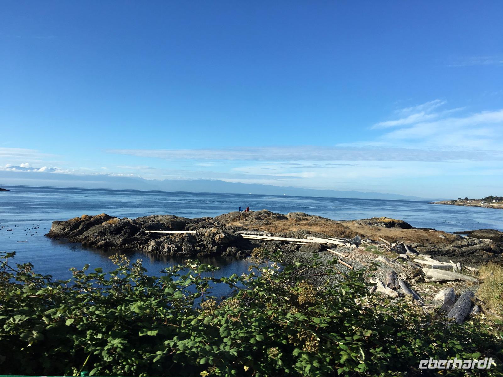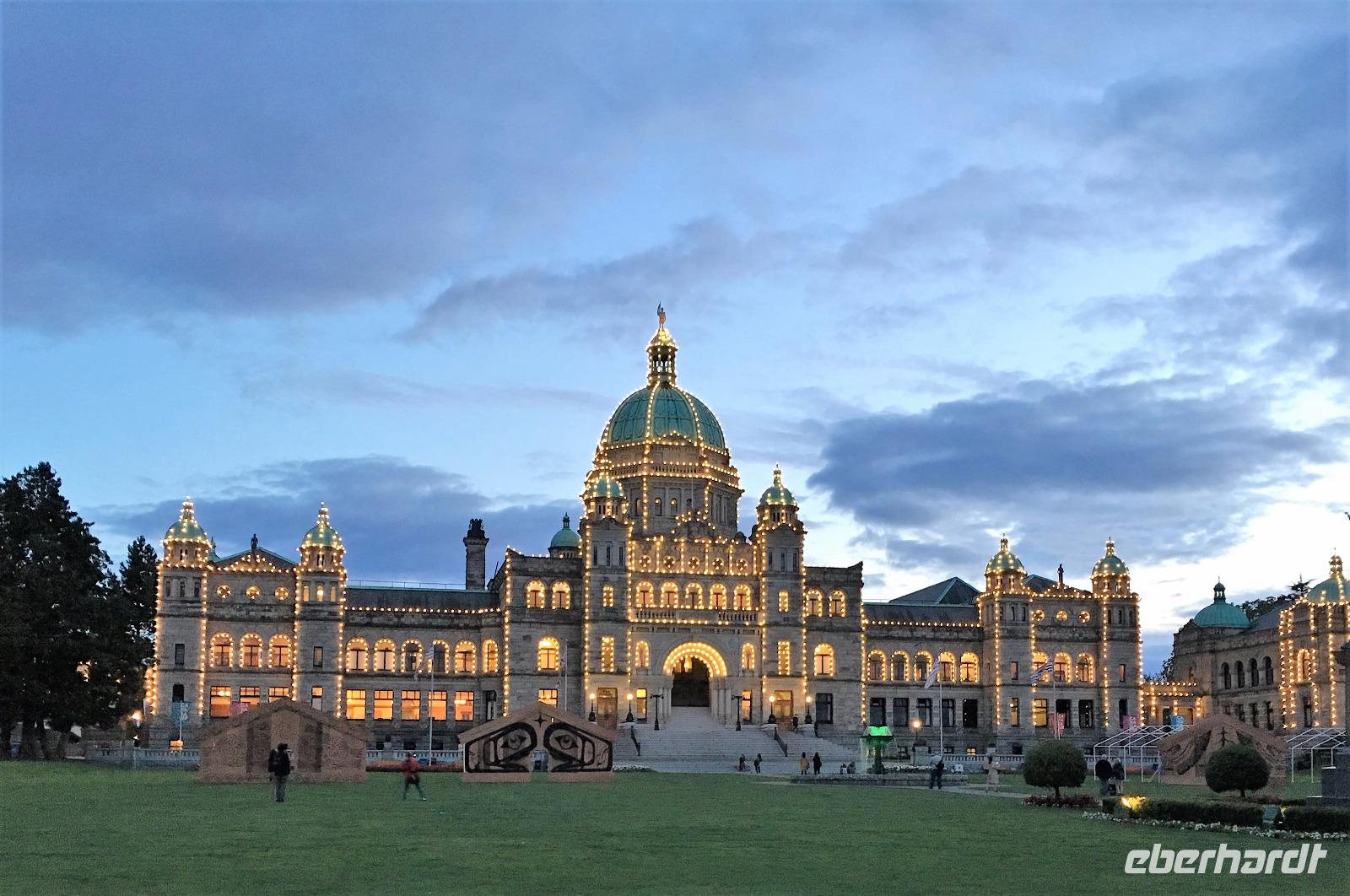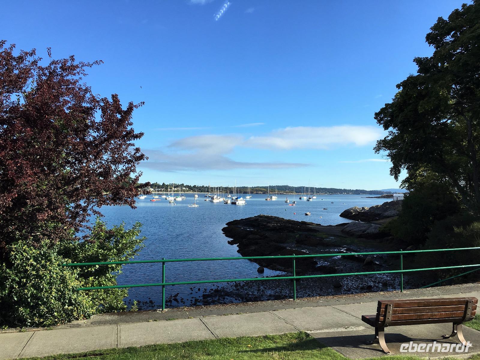 Gar nicht so schlecht, man erblickt blauen Himmel, das Zimmer ist angenehm temperiert und die Decken sind warm, wer will da schon aufstehen.....Aber eben. Das Fruehstueck ist wie gestern in dem kleinen Kaffeehaus und danach fahren wir gleich zum Strand, den wir gestern nicht besucht haben. So weit, so einladend zu einem Spaziergang, so bezaubernd und eindruecklich. Die kleinen Felsen am Strand lassen die Wellen hochsteigen, das Meer zieht sich in die Ebbe zurueck und hinterlaesst einen 100 Meter breiten hellen Sandstrand. Viele Holzstaemme liegen wie ein riesen-Mikadospiel am Ufer und die Kelp Pflanzen haben sich ineinandergewickelt, sodass sich richtige Kelp-Knoepfe vom Sand erheben. Mit einer Pflanze springen wir auch Seil, zwei halten die Enden und schwingen die Pflanze und wir springen wie die kleinen Maedchen damals auf dem Schulhof. Wir geniessen diesen Aufenthalt und bleiben auch eine ganze Weile. Die Rueckfahrt nach Nanaimo wird kurz mit einem Besuch bei einem legendaeren Tim Hortons unterbrochen, ansonsten doesen wir einfach vor uns hin. Der naechste Halt ist in einer Freilicht-Gallerie. In Chemainus sind naemlich viele Hauswaende mit historischen Gemaelden bemalt. Man kann von einem Bild zum anderen gehen und sich manchmal sogar in ein Gemaelde hineinfotografieren. Wir fahren weiter nach Victoria, unserem heutigen Ziel der Reise. Die Stadtfuehrung wird zu Fuss durchgefuehrt sodass wir auch alles richtig anschauen und knipsen koennen. Morgen haben wir am Nachmittag Freizeit, dann werden die Geschaefte durchstoebert und nochmals diese Stadtteile angeschaut, welche besonders gefallen haben. Der Hafen mit seinen vielen Atraktionen und Geschichten steht ganz oben auf der Victoria Lieblings-liste. Das Abendessen geniessen wir im einstmaligen Wachs-Museum mit herrlichem Blick ueber den Hafen und die Stadt.