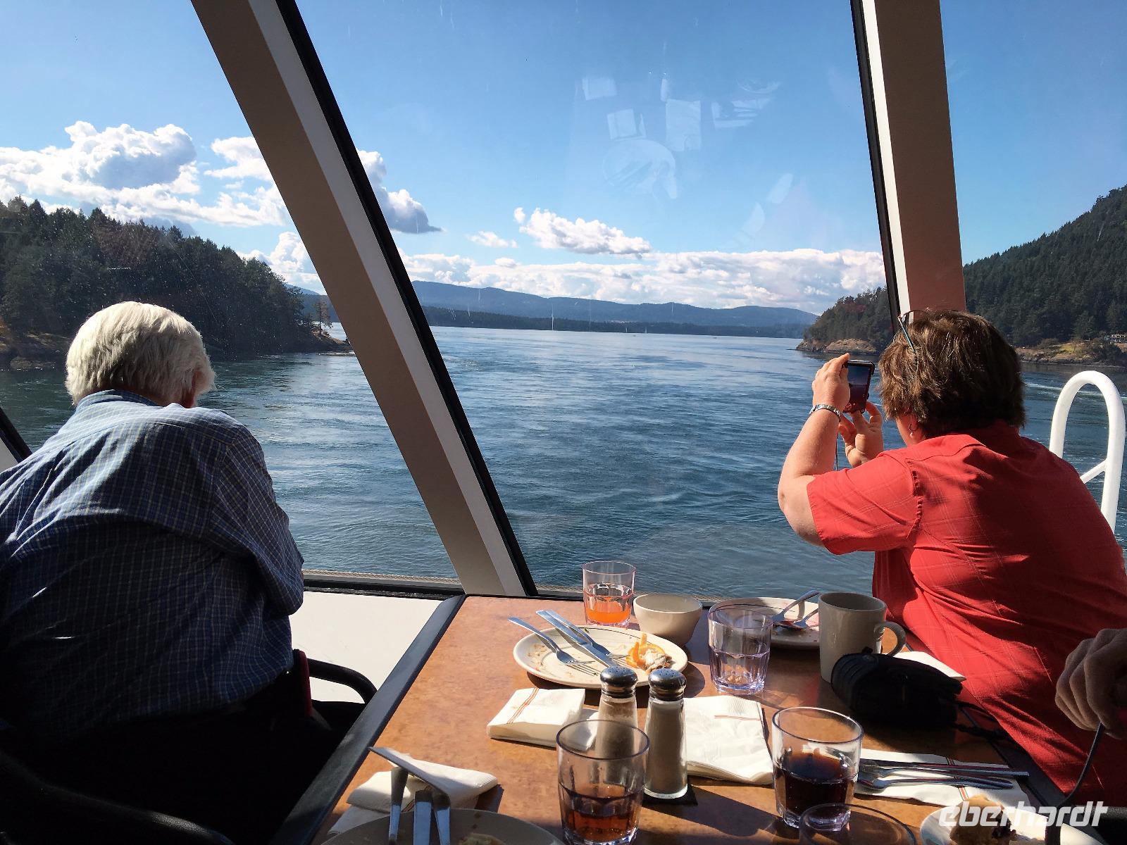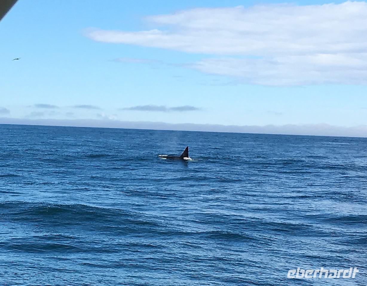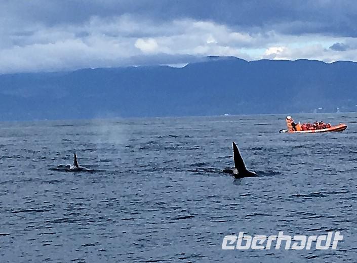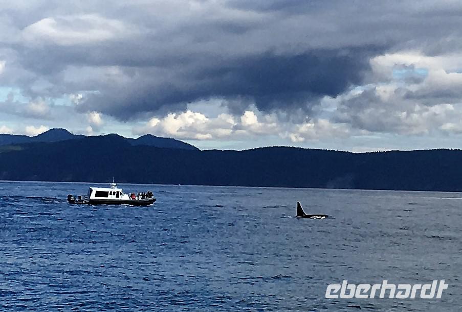 Es ist unser freier Tag in Victoria, aber wir haben ein ganz tolles Programm in der Frueh. Vorerst gehen wir in ein Lokal fruehstuecken welches gerade «in» ist. Unsere Gruppe nimmt fast das ganze Bistrot ein und wir fuehlen uns wie alt eingesessene Victorianer an einem Sonntag morgen. Gemuetlich ist es hier. Noch eine kurze Visite in unserem Hotel und schon sind wir unterwegs zum heutigen Highlight. Wir gehen naemlich auf Walbeobachtung. Die Orca Spirit wartet am Hafen schon auf uns , Ian, der Kapitaen winkt schon und das obere Deck dieses schoenen Schiffes wird von uns belegt. Mit Kaffee, Tee und heisser Schokolade kann man sich hier kostenlos bedienen. Es ist etwas kuehl aber die Sonne will unbedingt hinter den Wolken hervorkommen, sie kaempft und bis am Mittag, wird ihr der Sieg auch sicher sein. Die See, der Pazifische Ozean ist heute glatt, kein Wind blaest nur ein paar sehr lange Wellen erinnern an die stuermische See von gestern. Auf einmal springen die flotten Schweinswale aus dem Wasser und tummeln sich geradewegs neben unserem Schiff. Sie sind jedoch so schnell, dass unsere Kamera immer wieder bloss Wasseraufnahmen macht. Aber zugeschaut haben wir. Diese kleinen Delphine haben eine aehnliche Zeichnung wie die Orcas die wir ja eigentlich sehen wollen. Das ist wohl die Kostprobe. Und tatsaechlich, es war die Einfuehrung in das wunderbare Spektakel der zwei Killerwale auch Orca genannt die sich bald darauf zeigen. Immer wieder kommt die 54 jaehrige Mamma mit ihrem 30 jaehrigen Sohn bei uns vorbei. Hoffentlich wird das was mit den Fotos ! Zwei Mal sehen wir sogar den ganzen Kopf der Tiere, da sie geradezu auf unser Boot zuschwimmen und uns anstarren. Sie scheinen zu laecheln. Eine gute halbe Stunde verweilen wir hier um den beiden zu zuschauen. Es sind transiente Wale, was noch seltener ist, denn hier gibt es doch auch die beruehmten residenten Killerwale, aber die bewegen sich gerade in Richtung Vancouver.... wer weiss, vielleicht sehen wir die Morgen auf der Faehre nach Vancouver. Bei Race Rocks, das ist eine Schaere, steht ein Leuchtturm und um diese Konstruktion liegen hunderte von Seeloewen. Die besichtigen wir auch, das oink oink oink hoert man schon von weitem und der Geruch verraet das Versteck der Tiere. Diese Stellar- und Kalifornia-Seeloewen machen hier jeweils Station auf dem Weg nach Alaska oder hinunter nach Kalifornien. Wir sehen sie schwer, dick und riesig. Bereit um den Maedel in Kalifornien zu imponieren. Zurueck im Hafen geht nun jeder seinen Weg, da alle etwas vor haben. Die einen besuchen das BC Museum, andere das Parlament, einige machen Einkaeufe und einige gehen auf eine Stadtwanderung andere spannen einfach aus und setzen sich in ein Kaffeehaus oder ins Empress Hotel und geniessen diesen herrlichen sonnigen Nachmittag. Unser Abendessen ist mit Sicht auf das beleuchtete Parlament. Besser geht es nicht. Danke Eberhardt, dass Du das so schoen beleuchtet hast fuer uns.