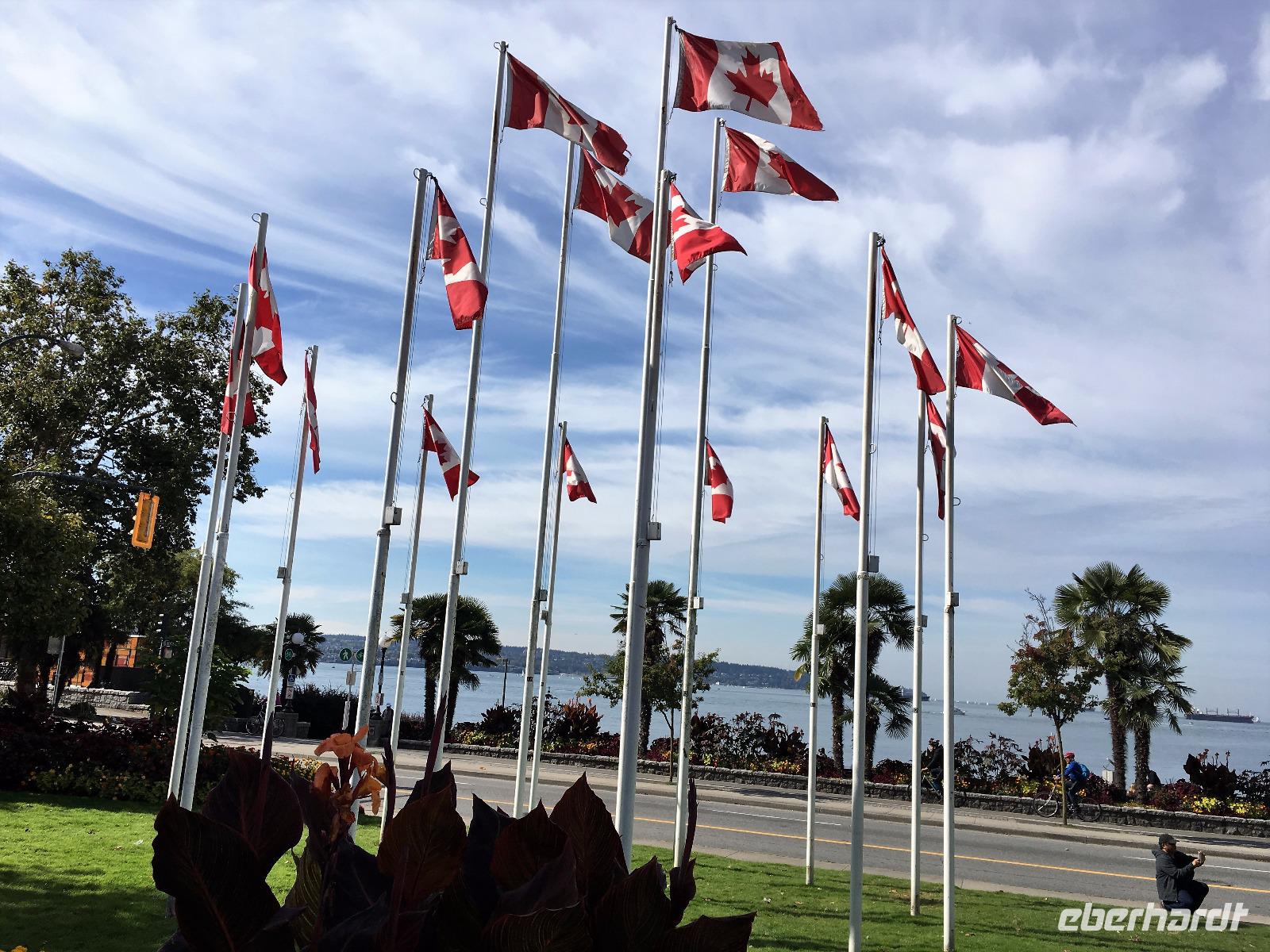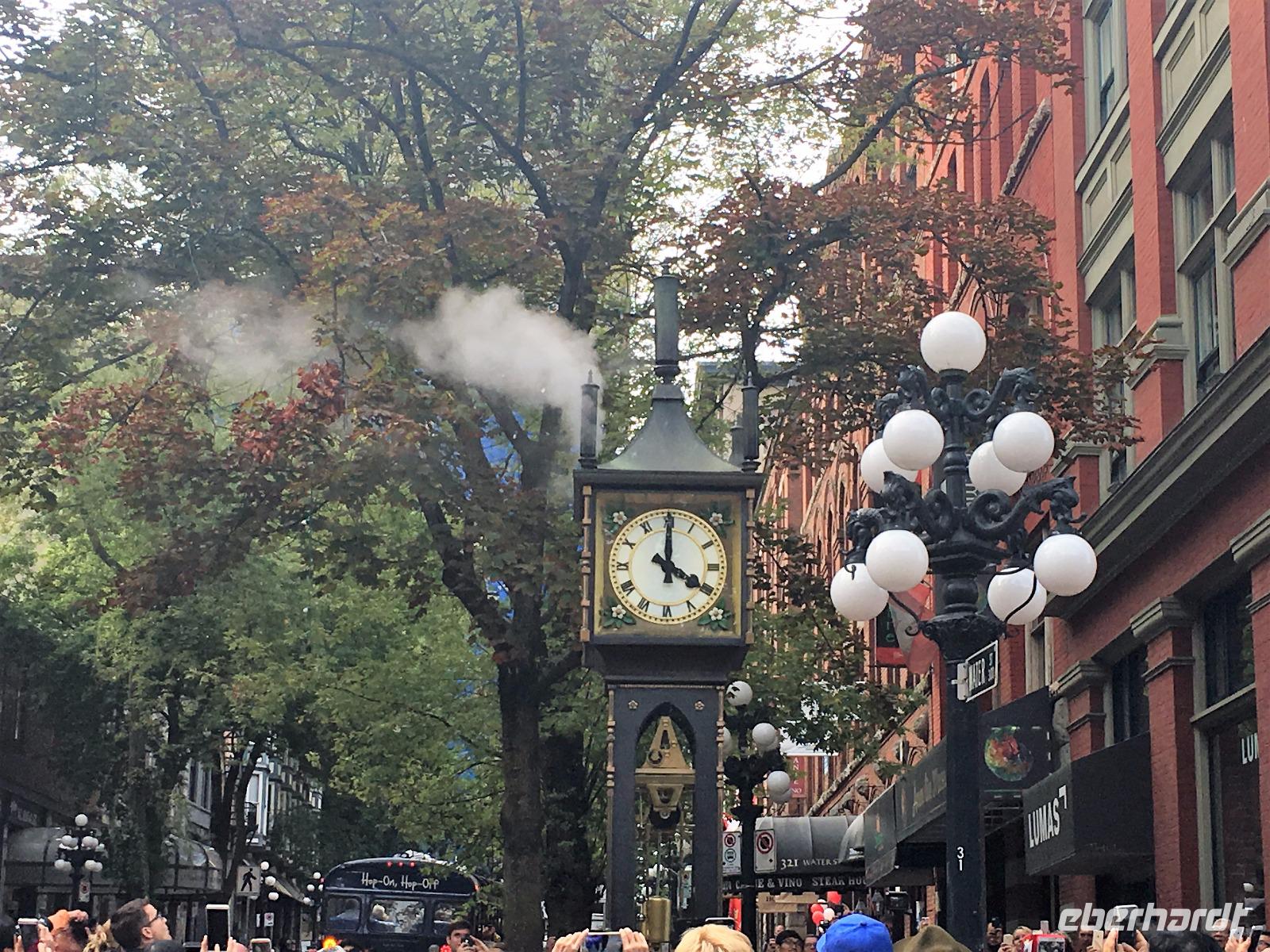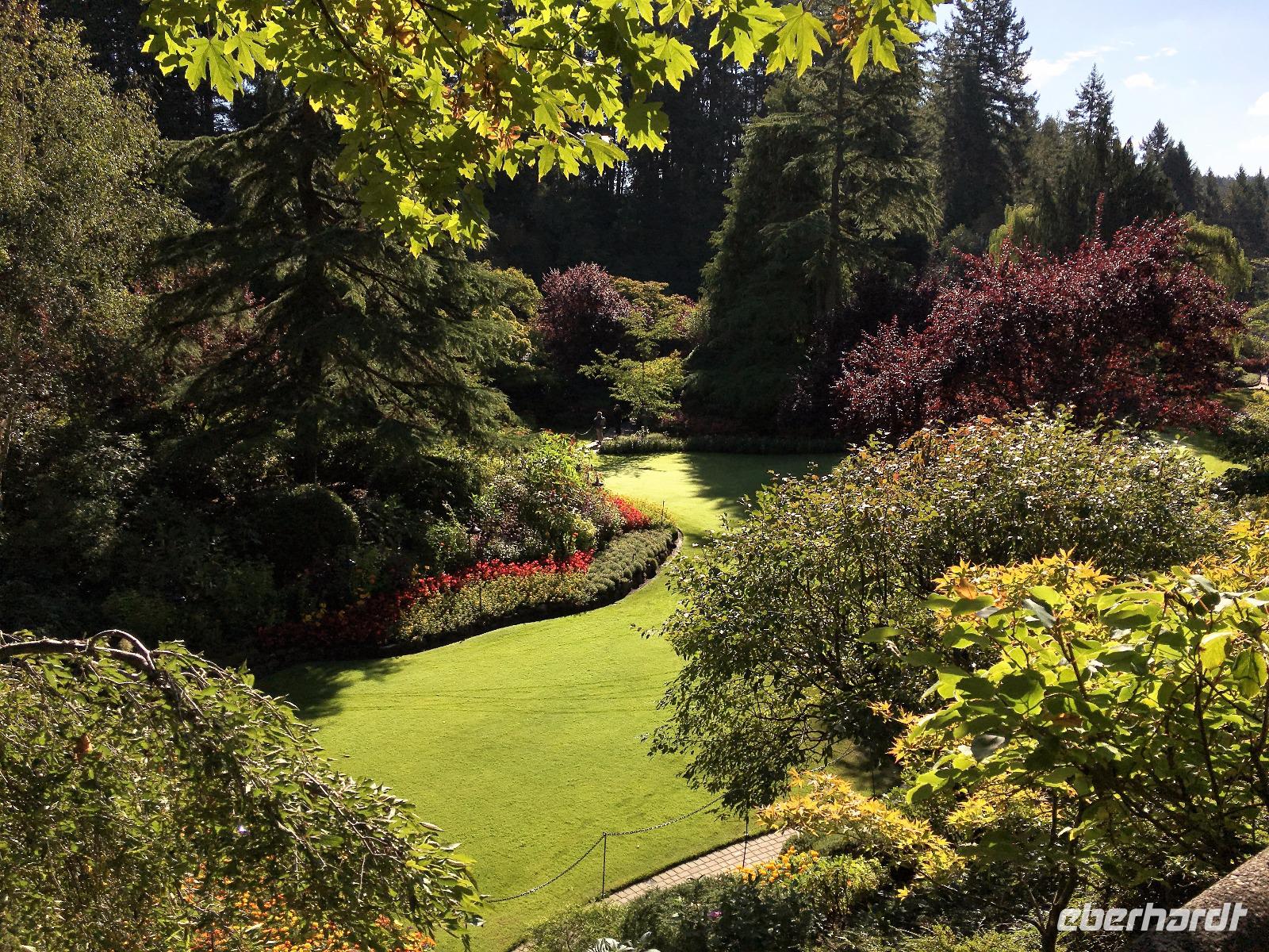 Abreise von Victoria steht heute auf dem Programm. Aber vorerst nochmals ins Bistrot zum Fruehstueck. Sobald die Koffer im Bus sind, fahren wir durch die vornehmen Wohnviertel dieser Stadt. Am Meer entlang fahrend haben wir eine herrliche Aussicht auf die Olympischen Berge von Washington State. Bald erreichen wir die Butchart Gardens. Eine riesengrosse Anlage mit verschiedenen Gaerten erwartet uns hier. Elisabeth darf uns hier leider nicht mehr begleiten, also bekommen wir die ganze Fuehrung im Bus, sodass wir uns hier nun wie in unserer Hosentasche auskennen. Vorerst der haengende Garten, dann den Wald-Garten, der versunkene Garten mit seiner Fontaene, den Rosengarten, den japanischen Garten, der franzoesische- und, zu guter Letzt, der italienische Garten. Bis wir wieder beim Kaffeehaus sind, sehen wir nur noch Blueten und Blumen vor unseren Augen. So beeindruckend sind diese Gaerten. Ueber eine Million Gaeste schauen sich jaehrlich diese Pracht an. Wir auch ! Mittags sind wir auf der Faehre und da essen wir auch in dem feinen Buffet im Restaurant. Aehnlich einem Kreuzschiff ist das Buffet sehr gediegen und besonders fein. Die 1 ½ Stunden sind sehr schnell vorbei. Bei Ankunft auf dem Festland fahren wir in Richtung Norden nach Vancouver. Wir lernen die Stadt auch gleich kennen, denn die Stadtfuehrung fuehrt uns vorerst ins Chinatown. Aber och neee, Brendan hat eine falsche Strasse genommen und wir kommen, anstelle ins Chinatown, in ein Stadtviertel wo sonst nie Touristen oder konventionel lebende Leute kommen. Fuer 200 Meter sehen wir so viele sozial Ausstenstehnde wie noch nie zuvor. Etwas benommen von den Bildern von East Hastings Street, fahren wir anschliessend doch durch Chinatown und anschliessend durch Gastown. Gastown ist der aeltesten Stadteil Vancouvers. Es ist nun genau 15:58 Uhr und wir stehen erwartungsvoll vor der Dampfuhr. Ploetzlich legt sie los, diese Dampfuhr. Die Stunde wird durch viel Dampf angezeigt und durchs Glass kann man das Getriebe anschauen. Ganz schoen einfallsreich der Lok-ingenieur ! Nun sehen wir noch viele Sehenswuerdigkeite der Perle des Pazifiks und halten wieder in Stanley Park bei den Totem Pfaehlen. Auch hier weiss Elisabeth noch Geschichten dazu. Die lustige Kinder-Trockenanlage beim Spielplatz ist sehr amuesant und die Loewenbruecke beeindruckend. Bald gelangen wir so zu unserem Hotel wo wir uns von Brendan mit einem dicken Umschlag und besten Wuenschen verabschieden. Heute Abend ist freies Abendbrot und so ziehen wir alle mit unseren Stadtkarten ausgeruestet durch die Strassen Vancouvers.