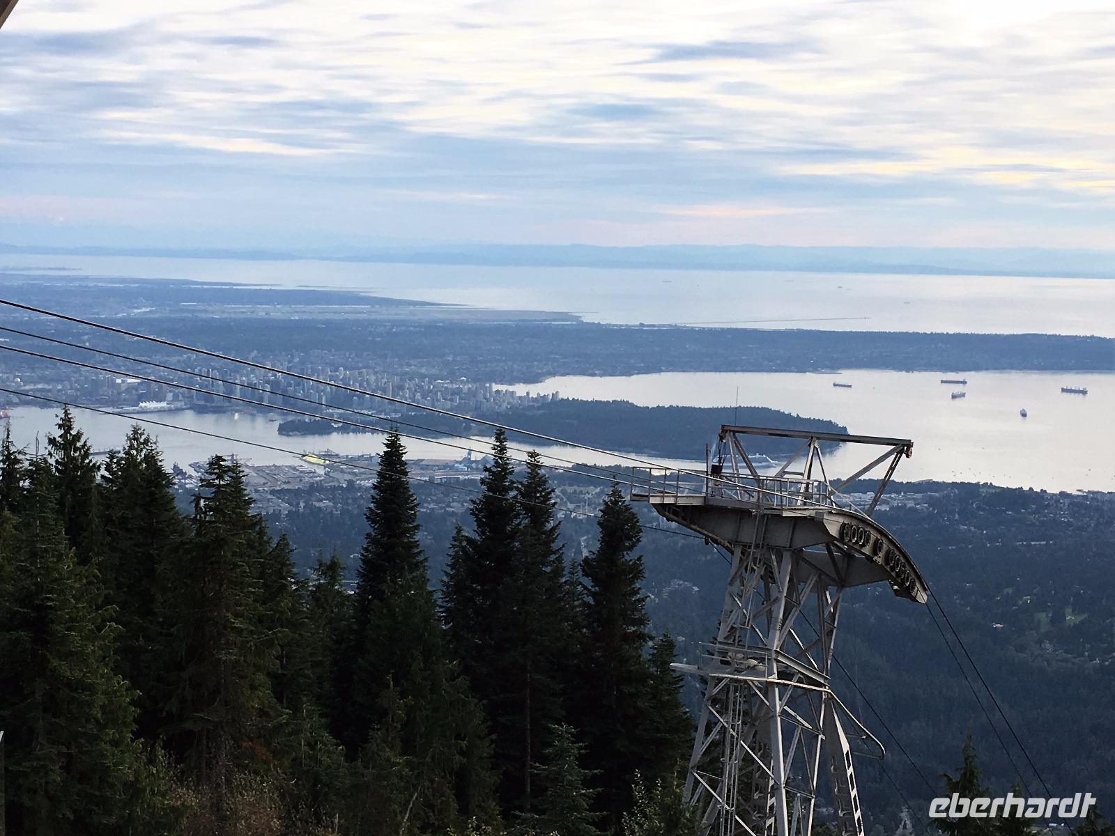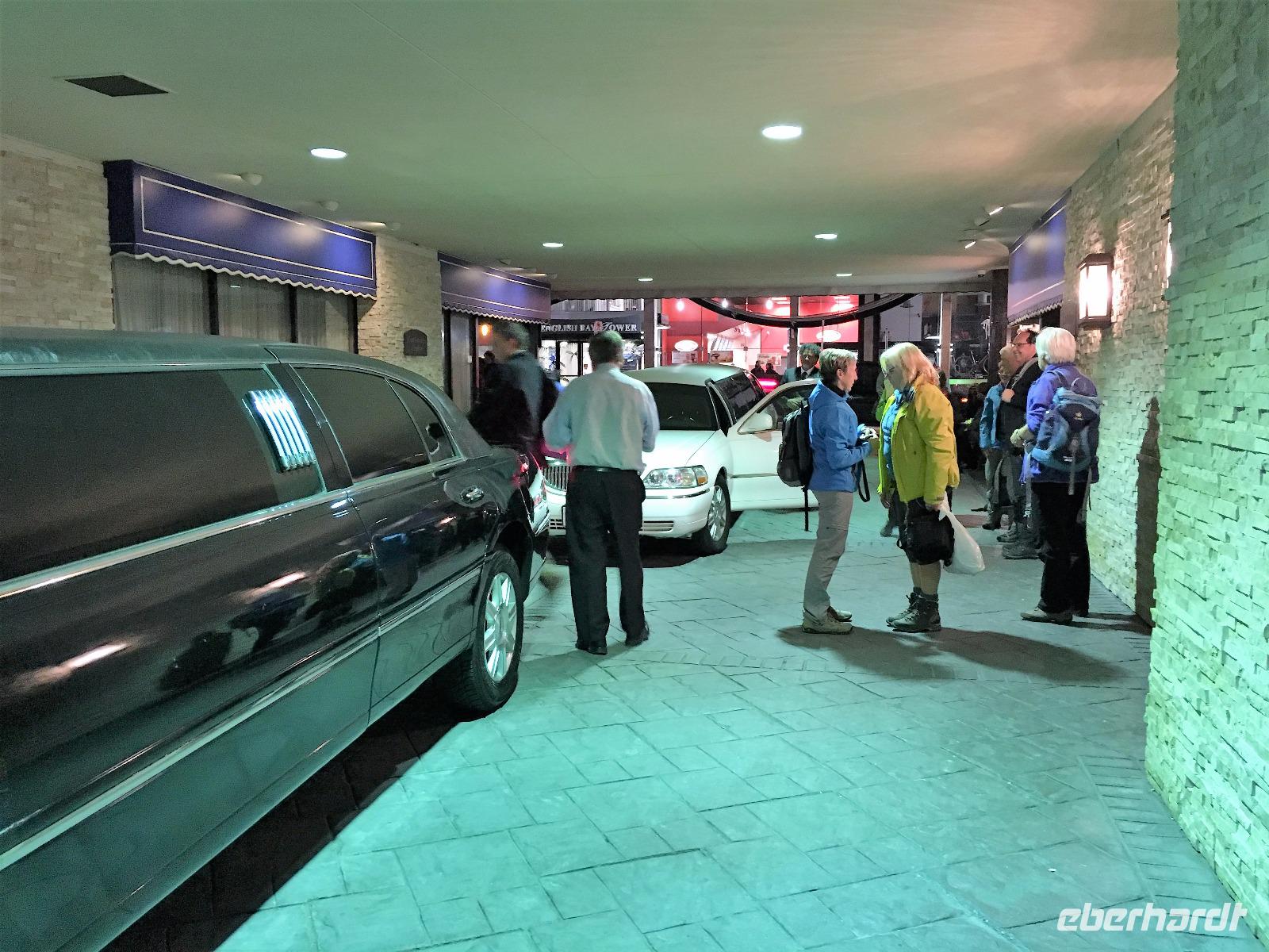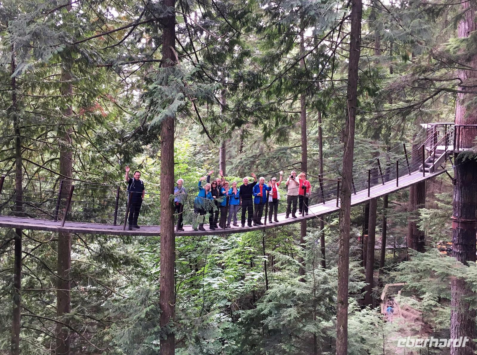 Nach dem Fruehstueck steht auch schon Victor unser neue Fahrer vor dem Hotel. Er faehrt uns nach West Vancouver und nimmt die Strasse dem Meer entlang. Oh diese schoenen Strand-Villen und die Aussichten welche die Einheimischen hier haben, atemberaubend. Bei Lighthouse Park startet unsere heutige Wanderung. Durch einen Urwald ueber Stock und Stein fuehrt der Wanderweg von einem Aussichtspunkt zum anderen. Der Leuchtturm ist die Kroenung. Schaut die Bilder dazu an. Mit dem Bus fahren wir anschliessend nach Nord Vancouver um die beruehmte Haengebruecke zu besichtigen und unseren Mut zu testen. Schon ganz schoen beeindruckend. Wir machen uns einen Spass daraus, indem wir alle ohne anzuhalten drueber gehen. Gar nicht einfach bei so einem Andrang von Personen auf der Bruecke, die kommen, gehen, stehen und fotografieren. Wir schaffen es alle und werden auch mit einem Zertifikat belohnt, welches wir zu Hause natuerlich rahmen und aufhaengen werden. Der naechste Halt ist bei der Fischaufzucht wo wir das Leben der Lachse nochmals miterleben ehe wir zu Grouse Mountain weiterfahren. Hinauf mit der riesen Gondel auf den 1250 Mt hohen Skiberg der Vancouveraner. Oben leben 2 Grizzly in einem grossen Gehege und beide zeigen sich heute von der besten Seite. Wir beobachten Grinder und Coola eine lange Weile und beenden die Show mit einem Abschiedsgruss von Eberhardt. Angefangen hat die Reise mit einem Whisky also wollen wir diesen wunderbaren Urlaub auch mit einem Whisky ausklingen lassen. Dies ist jedoch bloss die Vorkost von der Verabschiedung, denn wir nehmen unser Abendbrot hier oben in dem Luxusrestaurant ein und lassen uns so richtig verwoehnen. Bei der Talfahrt mit der Gondel faellt allen auf, dass 2 Stretchlimusienen bereit stehen, wohl fuer die Hochzeitsgesellschaft die neben unserem Restaurant gefeiert hatte. Unten angekommen oeffnen die Chauffeure ihre Limos und Elisabeth meint wir sollten doch mal einsteigen. WOW, was fuer eine Ueberraschung, denn in den 2 Limos fahren wir durch die Stadt zurueck zu unserem Hotel. WOW, WOW, WOW.