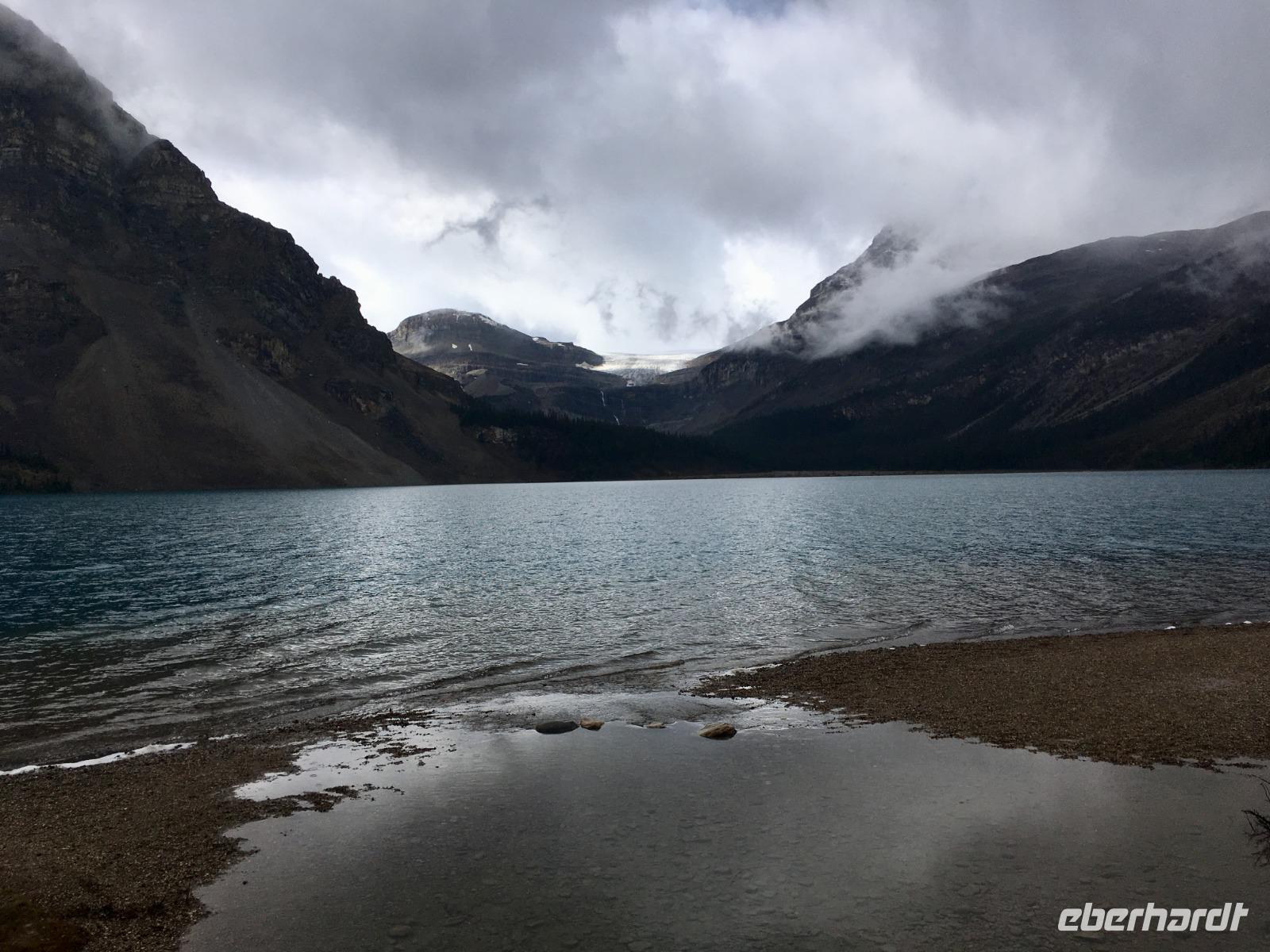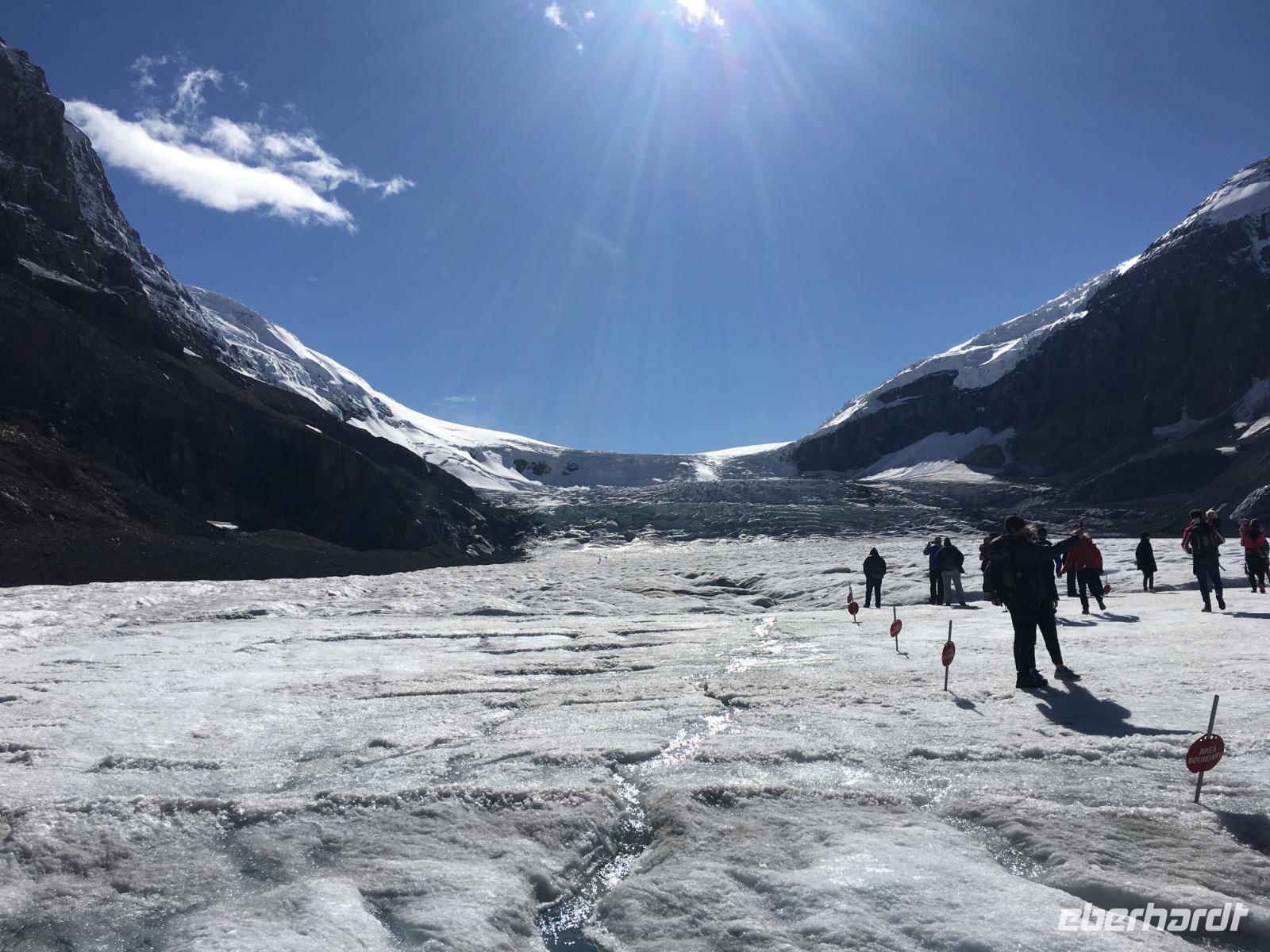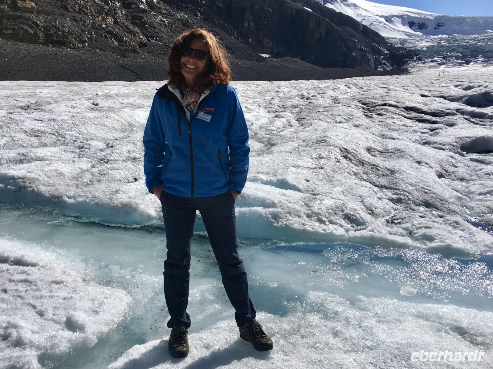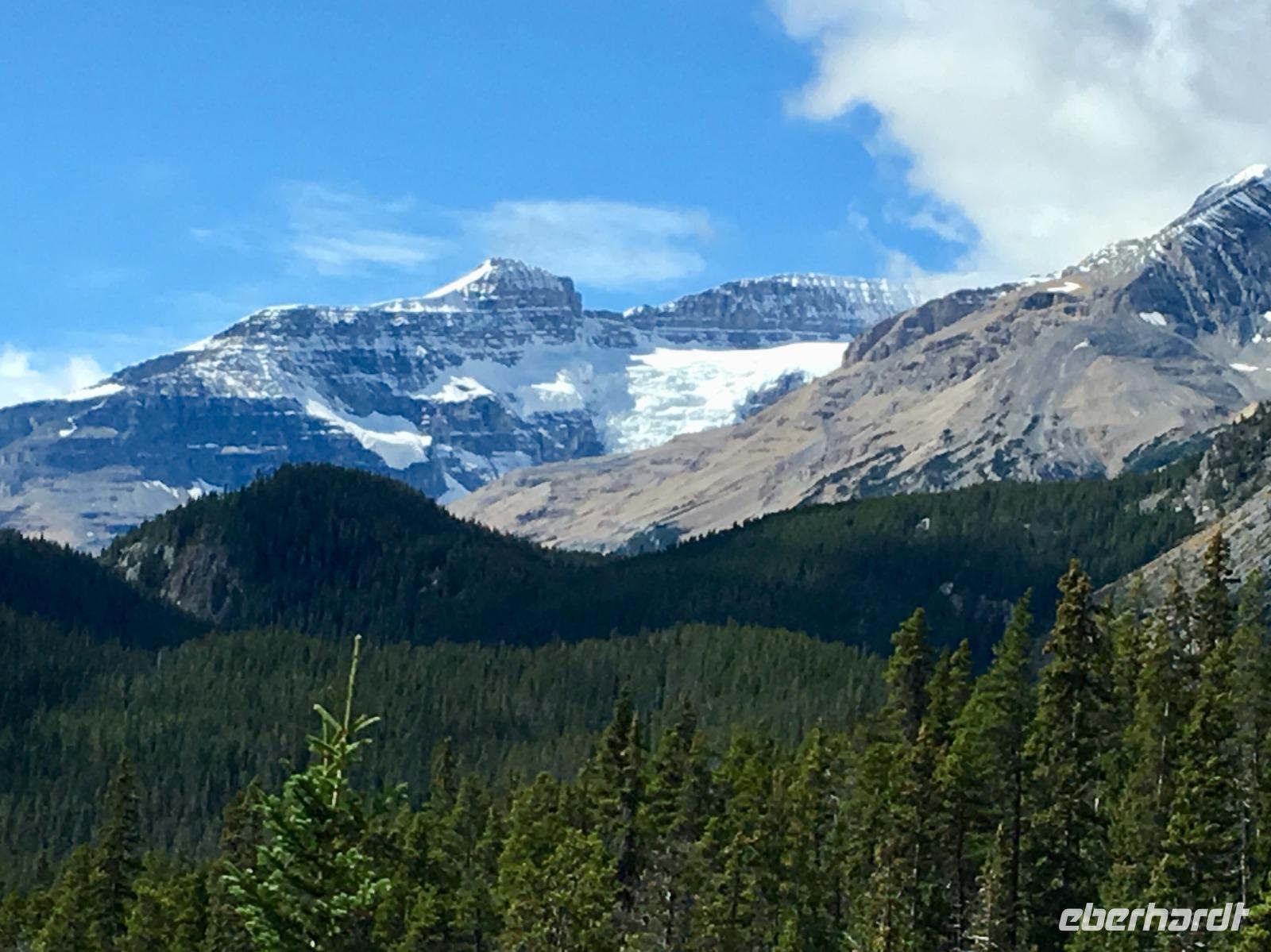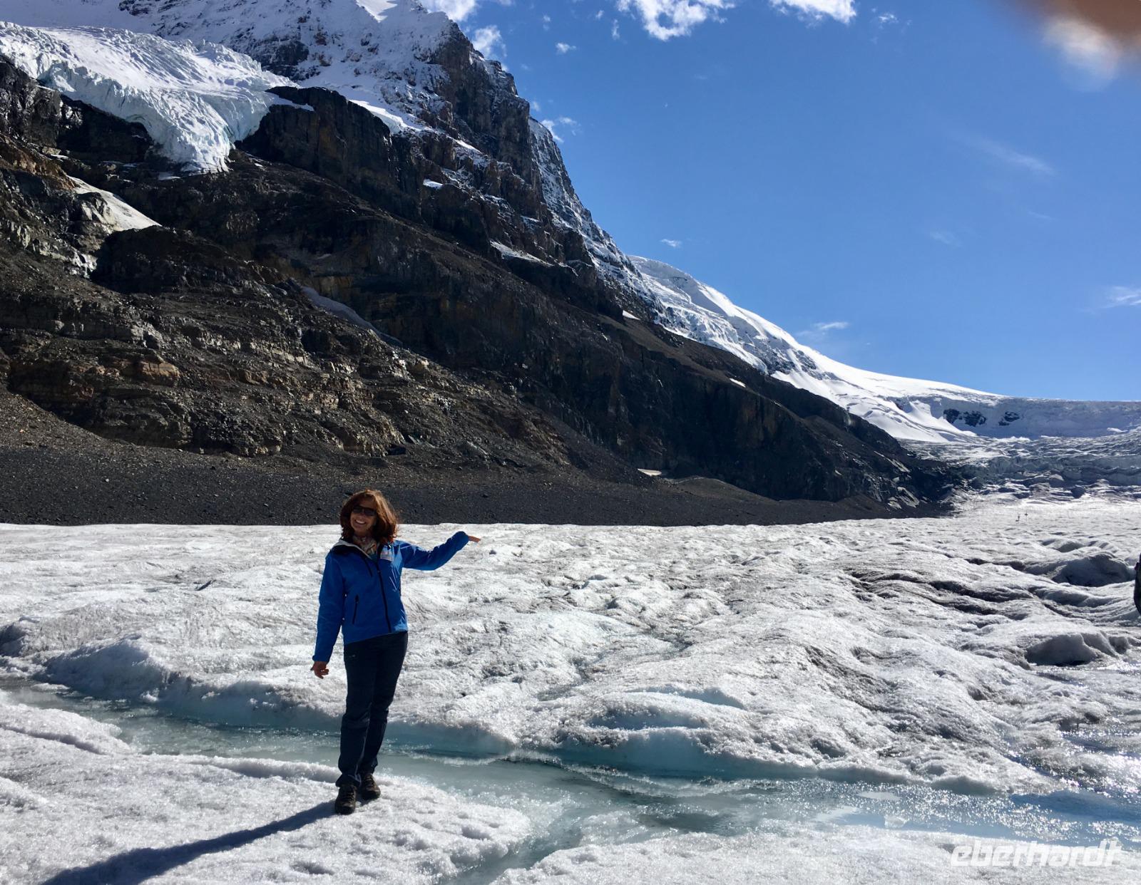 Anfangs schaut es heute so regnerisch aus, wir koennen es kaum fassen. Nach dem Fruehstueck aber passierts, ein Wunder, die Wolken sind wie weggefegt und ein Sonnentag lacht uns entgegen. Frohgemut beladen wir den Bauch unseres Busses und begeben uns auf Dickhornschafe-Suche. Wir haben einen neuen Bus, er ist riesengross, neu, bequem und hellblau. Beim Miniwanka See sollten die Tiere sein, aber heute nicht, dafuer werden wir mit einem Wapiti Hirschen belohnt. Er liegt zufrieden und ganz alleine auf einer Wiese. Eigentlich sehen wir bloss das riesen Geweih aber mit der tollen Kulisse im Hintergrund ist das ein wunderbares Bild. Der Two Jack Lake zeigt sich auch von der besten Seite mit seiner kleinen Insel vor der Kulisse des Mt. Rundel. Ein Kojote spaziert dem gegenueberliegenden Ufer entlang und wir fahren weiter Richtung Jasper. Das Wetter ist perfekt die Berge strahlen, die Gletscher glitzern, die Wasserfaelle schaeumen weiss und die Seen liegen ruhig in den endlosen Waeldern und einige warten geduldig auf Wasservoegel, die es hier nicht gibt ! Auf der Parkstrasse lugen die Gletscher von jedem Berg auf uns hinunter. Am Bow See und bei Peyto See halten wir an und staunen ueber die Perfektion und Schoenheit. Beim Saskatchewan River Crossing bleiben wir fuer unsere Mittagspause. Ach wie herrlich sind doch diese Rockies und ach wie sehr werden wir von Mutter Natur verwoehnt. Eigentlich haette es heute den ganzen Tag schuetten sollen, so prophezeite es das app, und hier erleben wir das beste Wetter. Auf dem Weg zu unserem Highlight heute erfahren wir, dass es in Kanada sogar Kurven auf der Strasse gibt. Mit unserer Hilfe schaffen wir auch alle 3 Kurven, sodass wir heil beim Columbia Icefield Center ankommen. Ach ne, so viele Toiletten, die sind im Guiness Book of Records vermerkt und werden natuerlich gleich ausprobiert. Einige entscheiden sich fuer eine Moraene-Wanderung am Fusse des Athabasca Gletschers aber die Mehrheit faehrt aufs Eis. Vorerst geht es mit einem normalen Bus auf eine Seitenmoraene und dann steigen wir in den Snowcoach um. Damit fahren wir auf den Athabasca Gletscher. Unsere Fahrer ist Brandon und echt nett. Eine Gruppe Vietnamesen sitzen mit uns in diesem riesen Unimog. Wir fahren auf der Gletscherstrasse hinauf und geniessen dieses Erlebnis. Oben angekommen haben wir nun 20 Minuten Zeit uns das Eis anzuschauen, darauf herumzu-rutschen und -turnen und von dem klaren Gletscherwasser ein Muster abzufuellen. Das rutschige Bild mit der herrlichen Kulisse wird sicher ein Hit. Bei der Rueckfahrt hoeren wir nun den Kommentar zu diesem Ausflug auf vietnamesisch....es wird sehr viel sehr schnell erzaehlt und toent wie ein lustiges genuschl. Unten angekommen, warten Alex und unsere Wanderfreunde schon auf uns. Es ist nicht weit zu unserem heutigen Nachtquartier. Unterwegs sehen wir noch viele Gletscher, Fluesse und Berge, nur die Tiere die vestecken sich gut. Wir wohnen nun 2 Naechte in echten Waldhaeuschen. Die Sunwapta Lodge ist wunderbar, ganz abseits von Jasper gelegen. Natur pur. Abendessen ist im Restaurant und beide Speisen, die zur Auswahl angeboten werden sind koestlich zubereitet. In unseren Waldhaeuschen gibts keine Telefone, aber wir wuerden doch morgen frueh geweckt....haben die einen Weckbaeren ?