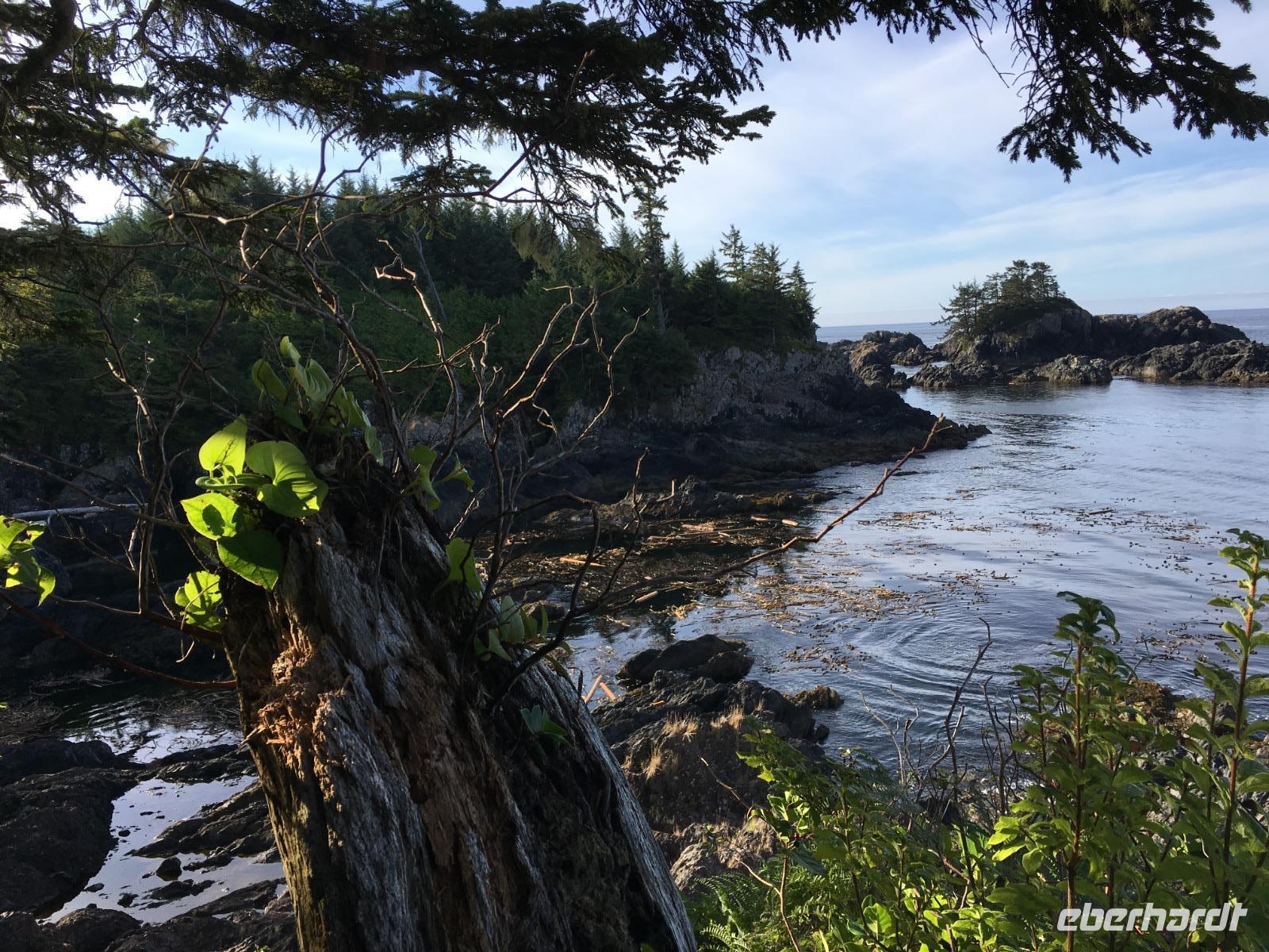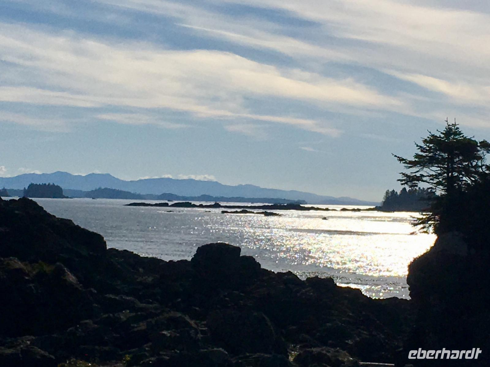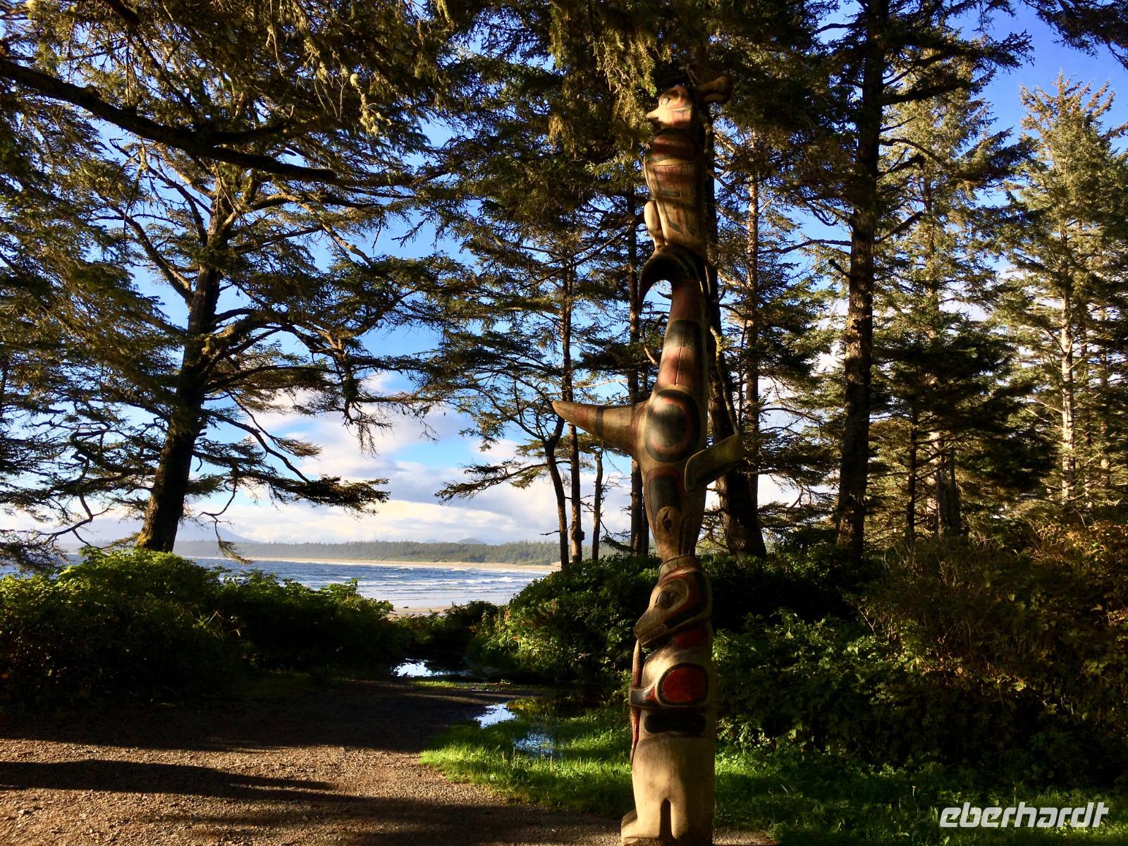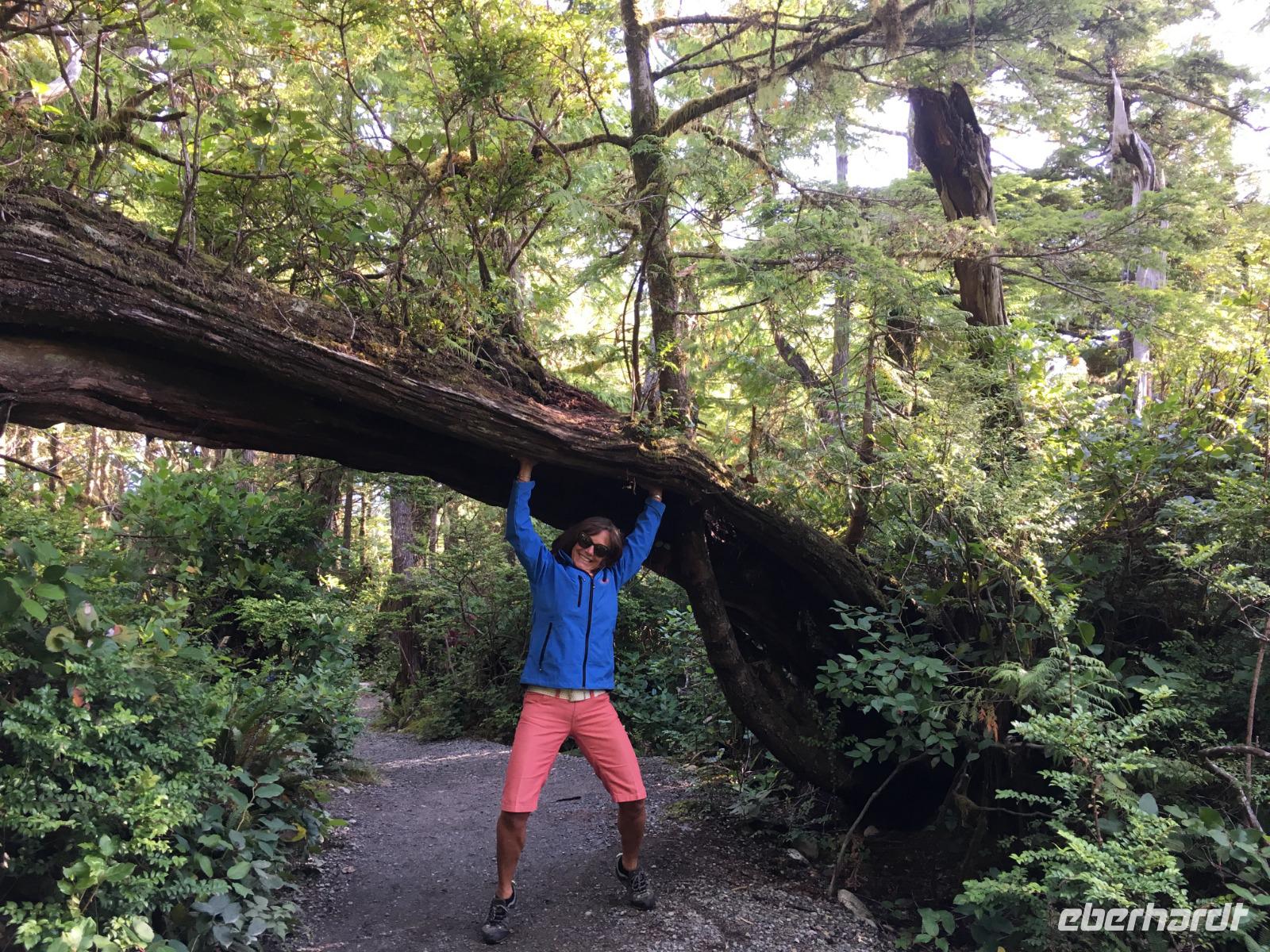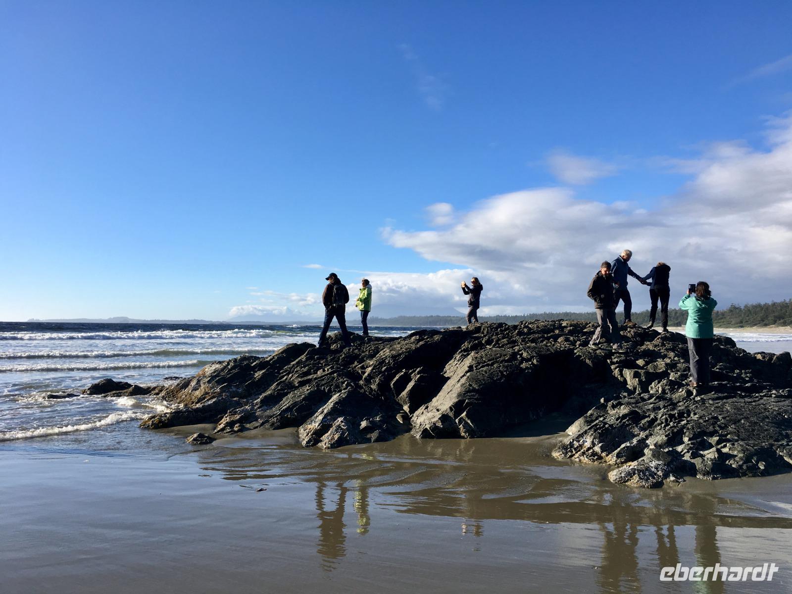 Gestern hat es genieselt, geregnet und geschneit, heute schuettet es so richtig und so sind wir gar nicht so traurig dies lustige Whistler zu verlassen. Auf der Sea to Sky Highway fahren wir zuegig in Richtung Vancouver. In Horseshoe Bay machen wir Halt, schauen uns das Dorf an ehe uns die Faehre in 1 Stunde 35 Minuten auf die Insel von Vancouver bringt. Wir fahren gleich mit dem Bus auf die Faehre und steigen aus um dem Auslaufen beizuwohnen. In der Ferne sieht man die Hochhaeuser von Vancouver. Die Perle des Pazifiks werden wir jedoch erst in 4 Tagen besuchen ! Wir wollen heute nach Tofino es liegt an der Westkueste der Insel. Der Mittagsstopp beim Markt in Coombs ist unterhaltsam und die Ziegen stehen wohl auf dem Markthallendach, jedoch unter einem Daechlein da auch sie nicht nass werden wollen. Die Stunde vergeht sehr schnell, da es hier so viel anzuschauen gibt. Waeren die Koffer nicht schon so voll, haetten wir gerne so einen Riesenbudda fuer den lieben Nachbarn, ein Holzspielzeug fuer die Enkelchen oder einen handgefertigten Tontopf fuer den eigenen Garten mitgebracht. Leider, leider. Fuers T-shirt hats gerade noch gereicht. Bis wir wieder im Buss sind, scheint schon fast die Sonne. Ganz vertraeumt gehen wir kurz darauf in einem Urwald spazieren. Die Riesen schauen auf uns Zwerge hinunter und viele Baeume sind von Moos so umgeben, es scheint sie haetten Pelzmaentel an. Jetzt fahren wir aber weiter, denn die Strecke nach Tofino zieht sich immer in die Laenge. Wir durchqueren die ganze Insel von Vancouver um andie Westkueste zu gelangen. Dort angekommen, gehen wir gleich mal an einen wilden Strand. Ahh die Luft, das Meer, die Muscheln, Kelp und Krebshuelsen, alles passt in dieses Bild. Die Sonne lacht, die Luft ist lau, es ist perfekt. . Die kleinen Felsen am Strand lassen die Wellen hochsteigen, das Meer zieht sich in die Ebbe zurueck und hinterlaesst einen 100 Meter breiten hellen Sandstrand. Viele Holzstaemme liegen wie ein riesen-Mikadospiel am Ufer und die Kelp Pflanzen haben sich ineinandergewickelt, sodass sich richtige Kelp-Knoepfe vom Sand erheben. Mit einer Pflanze springen wir auch Seil, zwei halten die Enden und schwingen die Pflanze und wir springen wie die kleinen Maedchen damals auf dem Schulhof. Wir geniessen diesen Aufenthalt und bleiben auch eine Weile. Nach diesem schoenen ersten Eindruck an der Westkueste fahren wir noch einige Kilometer und checken alsobald in unsere Regenwald Lodge ein. Ein leckeres Abendessen spaeter fallen wir muede ins Bett. Den morgigen Tag koennen wir kaum erwarten.