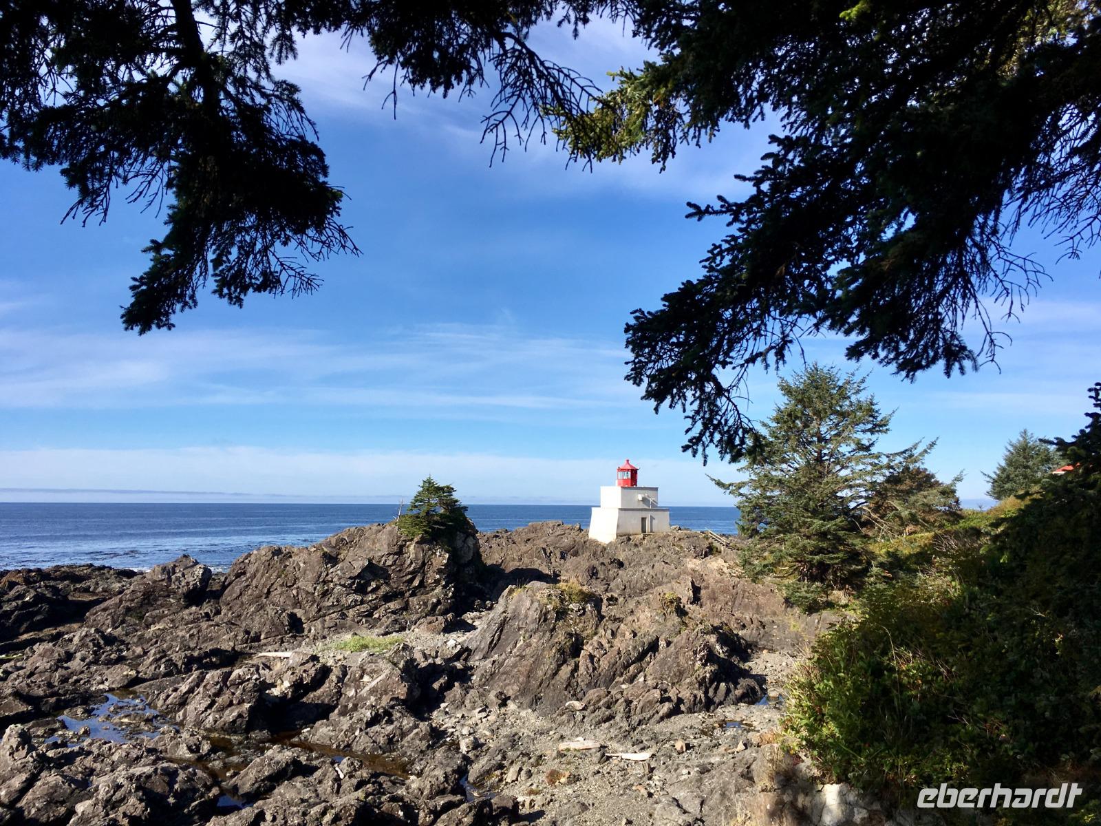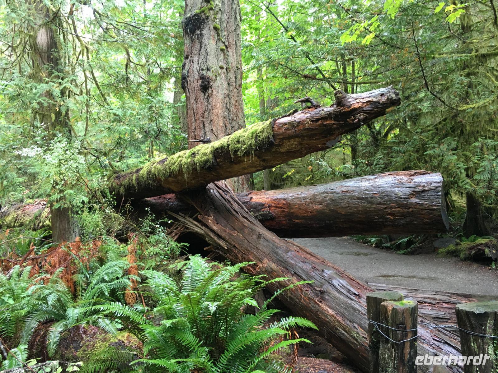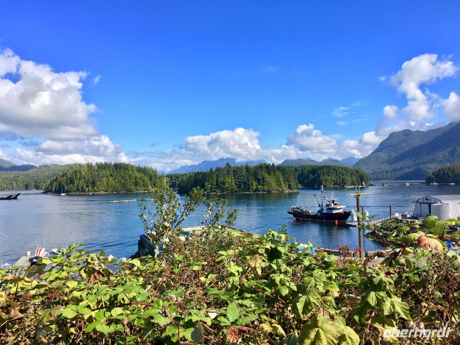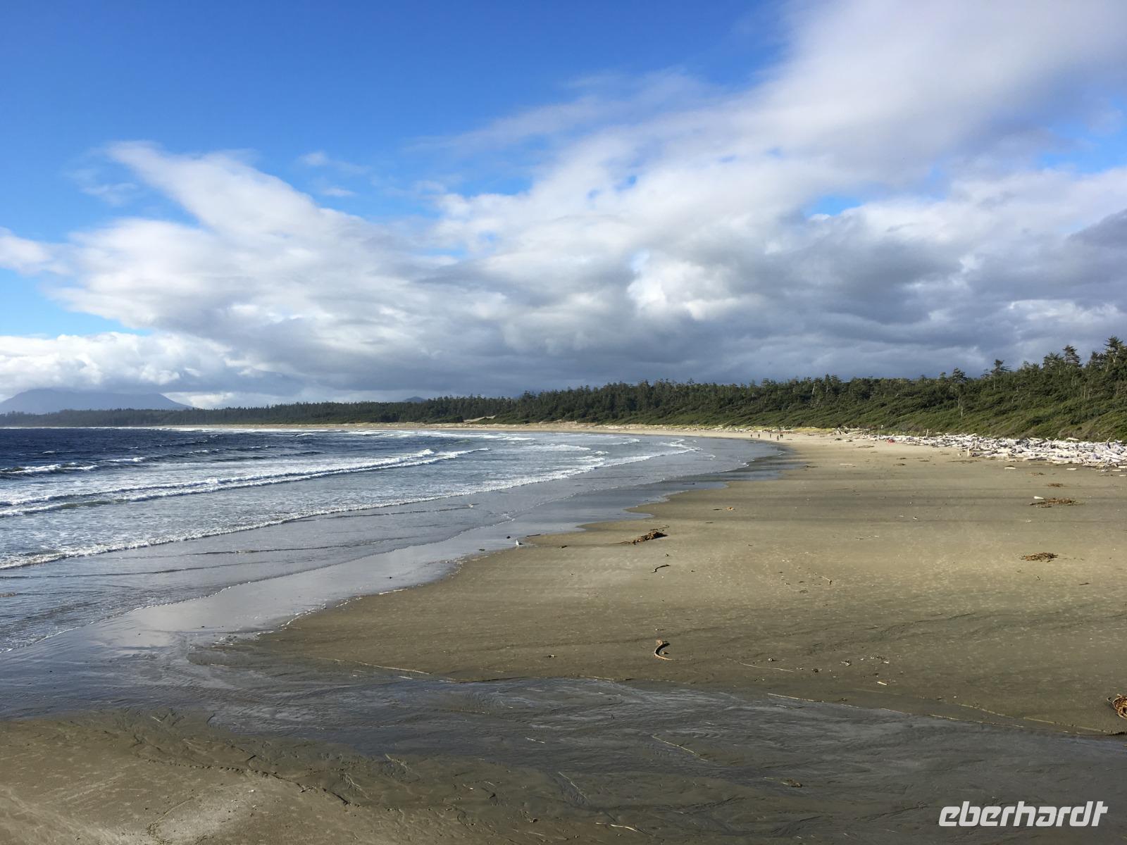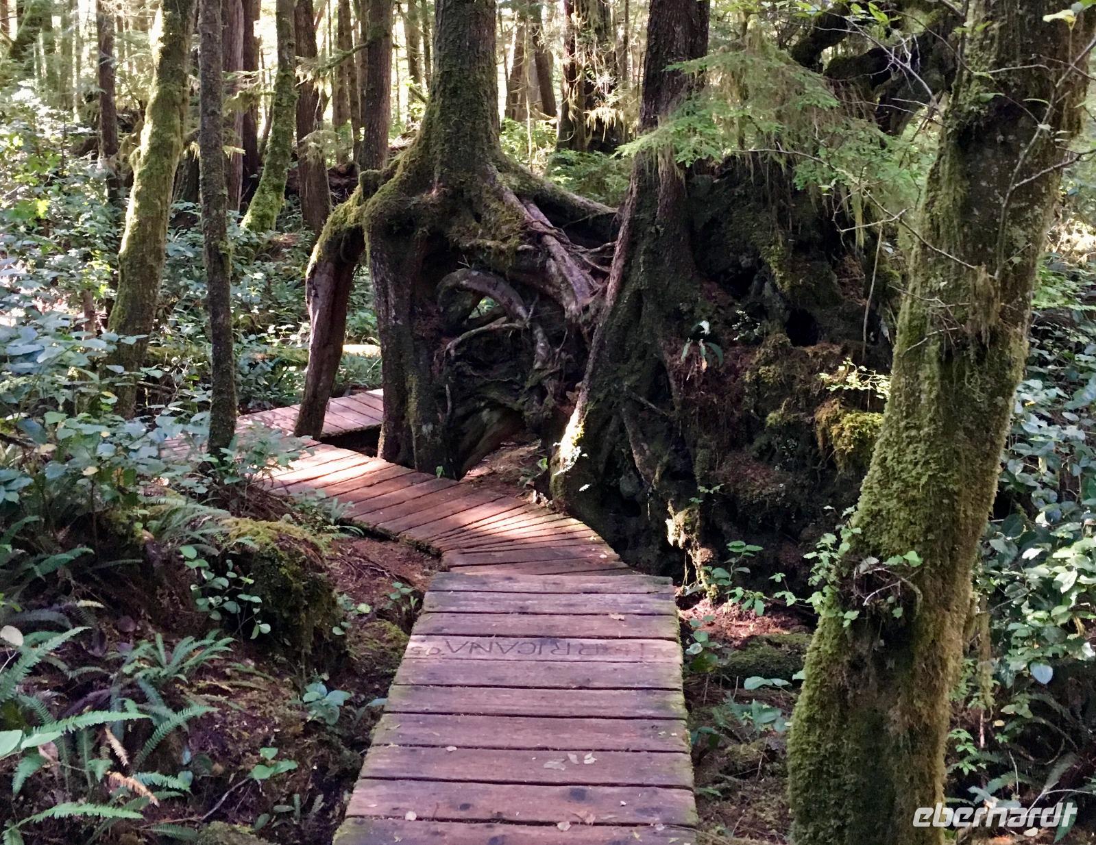 Gestern hat es genieselt, geregnet und geschneit, heute schuettet es so richtig und so sind wir gar nicht so traurig dies lustige Whistler zu verlassen. Auf der Sea to Sky Highway fahren wir zuegig in Richtung Vancouver. In Horseshoe Bay machen wir Halt, schauen uns das Dorf an ehe uns die Faehre in 1 Stunde 35 Minuten auf die Insel von Vancouver bringt. Wir fahren gleich mit dem Bus auf die Faehre und steigen aus um dem Auslaufen beizuwohnen. In der Ferne sieht man die Hochhaeuser von Vancouver. Die Perle des Pazifiks werden wir jedoch erst in 4 Tagen besuchen ! Wir wollen heute nach Tofino es liegt an der Westkueste der Insel. Der Mittagsstopp beim Markt in Coombs ist unterhaltsam und die Ziegen stehen wohl auf dem Markthallendach, jedoch unter einem Daechlein da auch sie nicht nass werden wollen. Die Stunde vergeht sehr schnell, da es hier so viel anzuschauen gibt. Waeren die Koffer nicht schon so voll, haetten wir gerne so einen Riesenbudda fuer den lieben Nachbarn, ein Holzspielzeug fuer die Enkelchen oder einen handgefertigten Tontopf fuer den eigenen Garten mitgebracht. Leider, leider. Fuers T-shirt hats gerade noch gereicht. Bis wir wieder im Buss sind, scheint schon fast die Sonne. Ganz vertraeumt gehen wir kurz darauf in einem Urwald spazieren. Die Riesen schauen auf uns Zwerge hinunter und viele Baeume sind von Moos so umgeben, es scheint sie haetten Pelzmaentel an. Jetzt fahren wir aber weiter, denn die Strecke nach Tofino zieht sich immer in die Laenge. Wir durchqueren die ganze Insel von Vancouver um andie Westkueste zu gelangen. Dort angekommen, gehen wir gleich mal an einen wilden Strand. Ahh die Luft, das Meer, die Muscheln, Kelp und Krebshuelsen, alles passt in dieses Bild. Die Sonne lacht, die Luft ist lau, es ist perfekt. . Die kleinen Felsen am Strand lassen die Wellen hochsteigen, das Meer zieht sich in die Ebbe zurueck und hinterlaesst einen 100 Meter breiten hellen Sandstrand. Viele Holzstaemme liegen wie ein riesen-Mikadospiel am Ufer und die Kelp Pflanzen haben sich ineinandergewickelt, sodass sich richtige Kelp-Knoepfe vom Sand erheben. Mit einer Pflanze springen wir auch Seil, zwei halten die Enden und schwingen die Pflanze und wir springen wie die kleinen Maedchen damals auf dem Schulhof. Wir geniessen diesen Aufenthalt und bleiben auch eine Weile. Nach diesem schoenen ersten Eindruck an der Westkueste fahren wir noch einige Kilometer und checken alsobald in unsere Regenwald Lodge ein. Ein leckeres Abendessen spaeter fallen wir muede ins Bett. Den morgigen Tag koennen wir kaum erwarten.