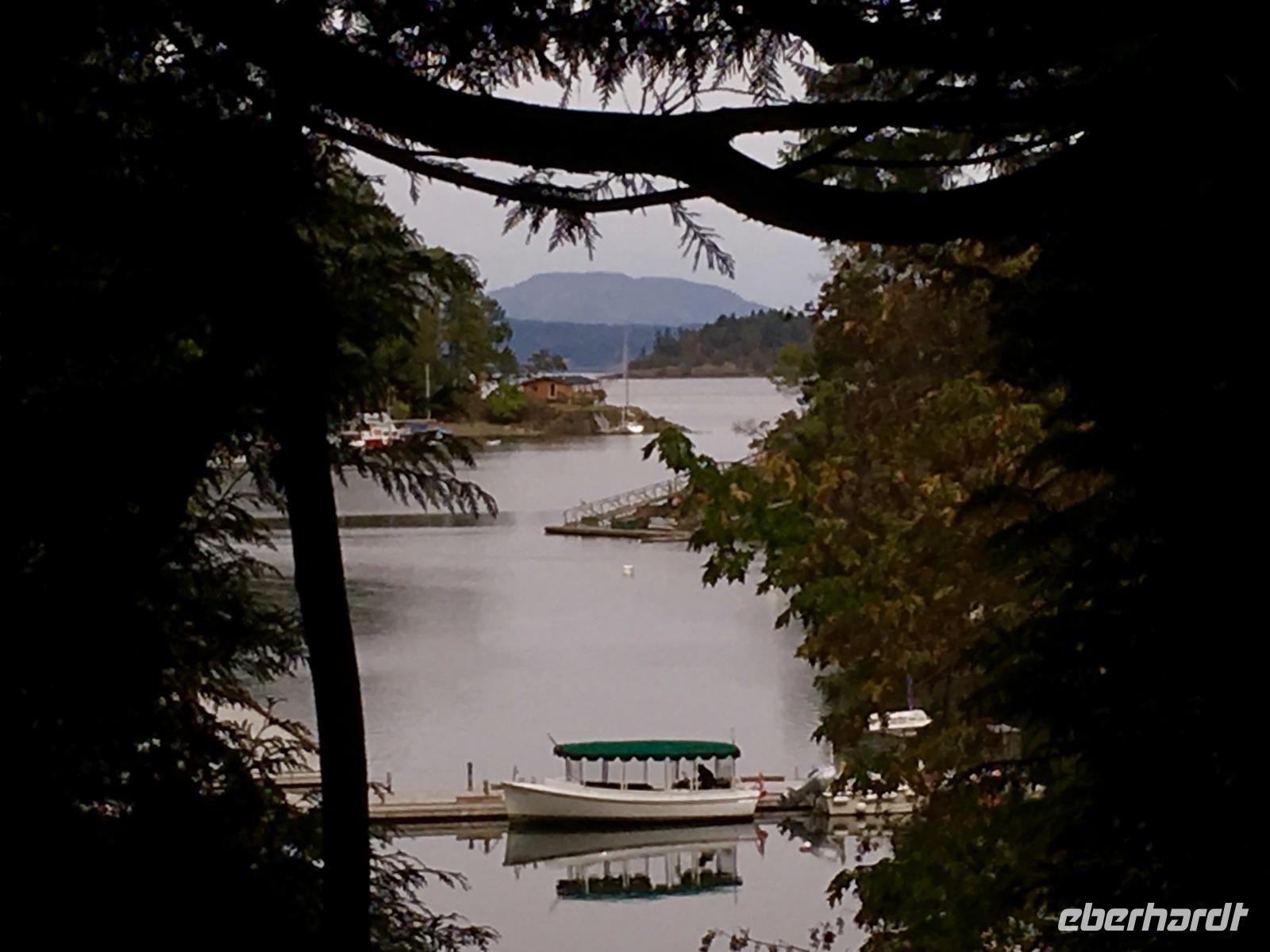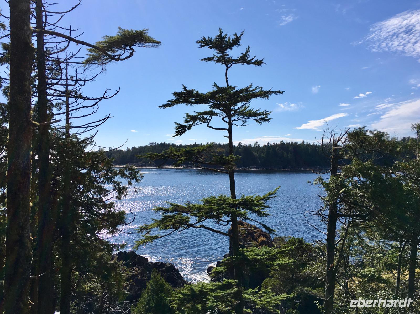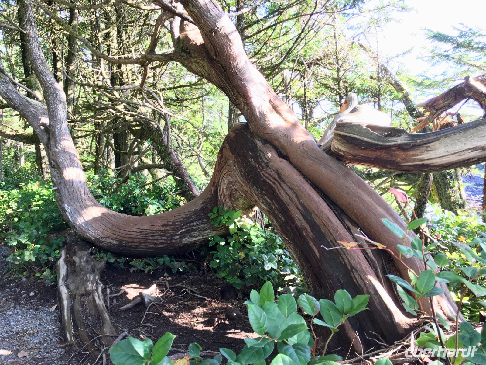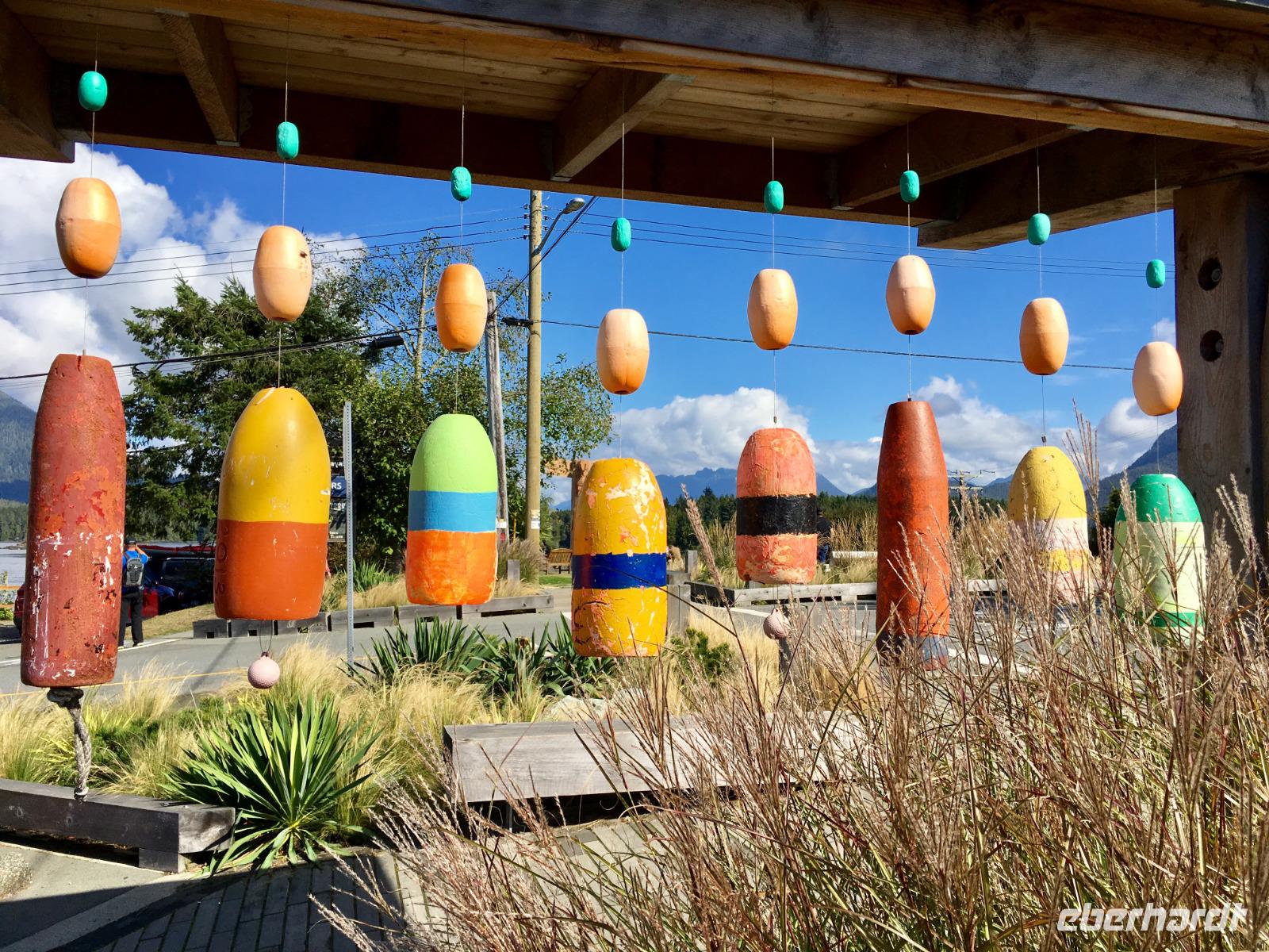 Gestern hat es genieselt, geregnet und geschneit, heute schuettet es so richtig und so sind wir gar nicht so traurig dies lustige Whistler zu verlassen. Auf der Sea to Sky Highway fahren wir zuegig in Richtung Vancouver. In Horseshoe Bay machen wir Halt, schauen uns das Dorf an ehe uns die Faehre in 1 Stunde 35 Minuten auf die Insel von Vancouver bringt. Wir fahren gleich mit dem Bus auf die Faehre und steigen aus um dem Auslaufen beizuwohnen. In der Ferne sieht man die Hochhaeuser von Vancouver. Die Perle des Pazifiks werden wir jedoch erst in 4 Tagen besuchen ! Wir wollen heute nach Tofino es liegt an der Westkueste der Insel. Der Mittagsstopp beim Markt in Coombs ist unterhaltsam und die Ziegen stehen wohl auf dem Markthallendach, jedoch unter einem Daechlein da auch sie nicht nass werden wollen. Die Stunde vergeht sehr schnell, da es hier so viel anzuschauen gibt. Waeren die Koffer nicht schon so voll, haetten wir gerne so einen Riesenbudda fuer den lieben Nachbarn, ein Holzspielzeug fuer die Enkelchen oder einen handgefertigten Tontopf fuer den eigenen Garten mitgebracht. Leider, leider. Fuers T-shirt hats gerade noch gereicht. Bis wir wieder im Buss sind, scheint schon fast die Sonne. Ganz vertraeumt gehen wir kurz darauf in einem Urwald spazieren. Die Riesen schauen auf uns Zwerge hinunter und viele Baeume sind von Moos so umgeben, es scheint sie haetten Pelzmaentel an. Jetzt fahren wir aber weiter, denn die Strecke nach Tofino zieht sich immer in die Laenge. Wir durchqueren die ganze Insel von Vancouver um andie Westkueste zu gelangen. Dort angekommen, gehen wir gleich mal an einen wilden Strand. Ahh die Luft, das Meer, die Muscheln, Kelp und Krebshuelsen, alles passt in dieses Bild. Die Sonne lacht, die Luft ist lau, es ist perfekt. . Die kleinen Felsen am Strand lassen die Wellen hochsteigen, das Meer zieht sich in die Ebbe zurueck und hinterlaesst einen 100 Meter breiten hellen Sandstrand. Viele Holzstaemme liegen wie ein riesen-Mikadospiel am Ufer und die Kelp Pflanzen haben sich ineinandergewickelt, sodass sich richtige Kelp-Knoepfe vom Sand erheben. Mit einer Pflanze springen wir auch Seil, zwei halten die Enden und schwingen die Pflanze und wir springen wie die kleinen Maedchen damals auf dem Schulhof. Wir geniessen diesen Aufenthalt und bleiben auch eine Weile. Nach diesem schoenen ersten Eindruck an der Westkueste fahren wir noch einige Kilometer und checken alsobald in unsere Regenwald Lodge ein. Ein leckeres Abendessen spaeter fallen wir muede ins Bett. Den morgigen Tag koennen wir kaum erwarten.