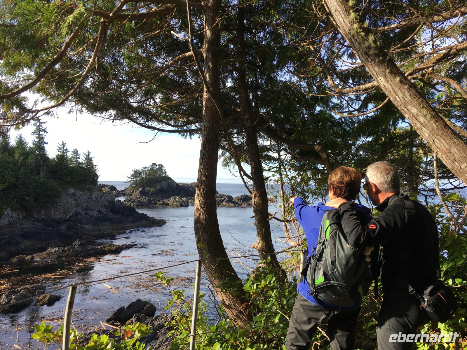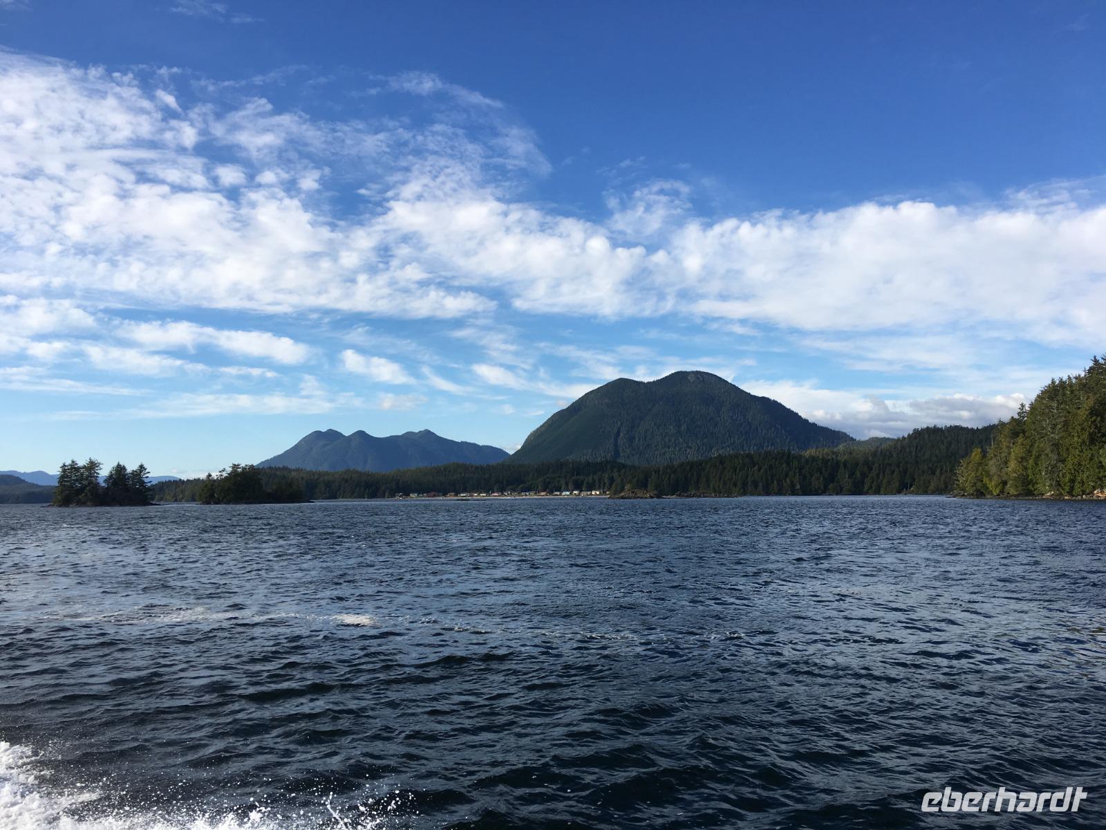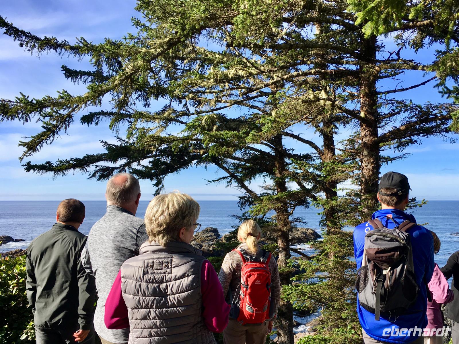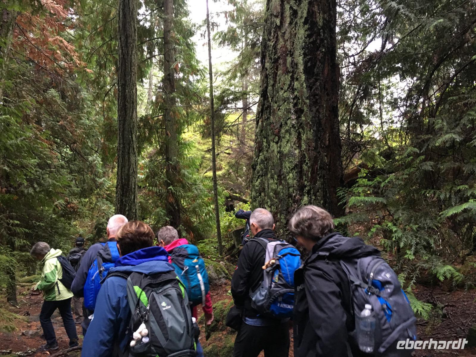 Es ist unser Westkuesten-Tag, der Regenwald-Tag, und es scheint die Sonne. Als erstes wollen wir gleich mal diese legendaeren Riesenbaeume des Pacific Rim Nazionalparks sehen und halten also auch gleich bei einem Rundwanderweg an. Auf einem Holzsteg gehend geniessen wir die Ueberschwenglichkeit der Vielfalt dieses Waldes. Es ist wirklich ein Urwald auf 3 Etagen und wir bewegen uns mal im Unterholz und mal im Mittelbereich. Die Krone des Waldes ist kaum sichtbar...so hoch oben... 80 Meter hoch werden diese Riesen. Der hoechste soll ueber 100 Meter hoch sein. In der Sonne, Fruehmorgends sind diese Waelder am schoensten, alles glitzert, die Farne leuchten und die Troepfchen des Morgendunstes schauen zierlich aus auf dem Moos und den Luftpflanzen. Da kommt uns ein Paeraerchen entgegen, sie sind beide kreidebleich und erklaeren, dass sie soeben, etwa 100 Meter entfernt einen Baeren auf dem Holzsteg begegnet seien. Wir sind eine muntere Gruppe und mit starkem Auftreten und lautem Rufen pirschen wir uns voran. Alle Baeren sind nun gewarnt und haben sich im Dickicht versteckt und die Jungen haben sie auf die Baeume gejagt. Wir gehen staunend weiter bis wir unseren blauen Bus wiedersehen. Auf der Tafel steht, dass dieser Rundgang 1.1 Km lang ist. Wir waren eine Stunde unterwegs und wir sind doch eine Wandergruppe ? Also holen wir die Zeit mit dem Bus wieder ein, fahren zurueck nach Tofino und gehen schon mal Picknick kaufen ehe wir bei der Bootsfirma einchecken. Heute habe wir ein ganz besonderes Erlebnes vor. Mit Schiff und Wasserflugzeug begeben wir uns auf Maquinna Island. Ashley ist unser Kapitaen, sie segelt uns in ihrem 600 PS gedeckten Schiff sicher an den vielen Inseln vorbei. Wir schlaengeln uns eigentlich durch ein Inselmeer. Alles glitzert die Sonne strahlt es ist unglaublich schoen. Kaum an Destination angekommen, landet auch schon das erste der 3 Wasserflugzeuge welche den Rest unserer Reisefamilie hierherbringt. Bis nicht alle hier auf Maquinna Island sind, nehmen wir schon mal das mitgebrachte Picknick ein und trinken ein feines kanadisches Bierchen dazu. Danke Eberhard ! Jetzt wollen wir aber zu den heissen Quellen und das ist eine 1 stuendige Wanderung durch den Wald. So schoen, so erholsam, so aufbauend. Bloss die Haelfte unter uns, trauen sich bei Ankunft in diese Quellen. Sie sind ganz natuerlich mitten in den Felsen und das Baden hat deswegen auch einen hohen Kletteranteil. Irgendwann muessen nun auch die Nixen und Neptune aus dem Wasser denn wir sollen um 4 Uhr wieder beim Steg sein. Bald kommen auch schon die Wasserflugzeuge und das Boot, um uns alle wieder sicher nach Tofino zu bringen. Was fuer ein tolles Erlebnis, schauts Euch die Bildergarerie an, denn Worte koennen es nicht so gut ausdruecken wie die Photos. Der Flug mit so einem Wasserflugzeug ist ein Abenteuer fuer sich alleine. Es ist toll ueber die Inselwelt zu schweben wie ein Vogel. Mancheiner unter uns haelt auch Ausschau, ob er den Baeren nicht doch noch sehen kann. In Tofino finden wir auch wieder Alex mit seinem blauen Riesenbus und bald fahren wir auch gleich zurueck zum Hotel, wo nun jeder seine eigene Quelle/Badewanne geniessen, oder mit zum grossen Strand gehen kann. Einige unter uns Strandgaenger stuerzen sich sogar in den Pazifischen Ozean, es ist gar nicht so kalt. Ein feines Abendessen in dem schmucken Restaurant rundet diesen ereignisreichen Tag ab. Das kanadische Bier schmeckt vorzueglich, der gute Schlaf ist gesichert.