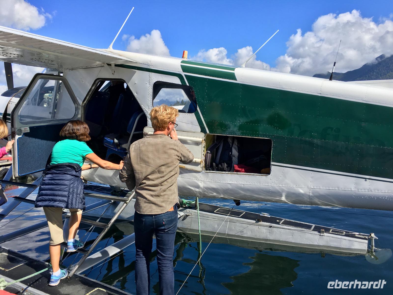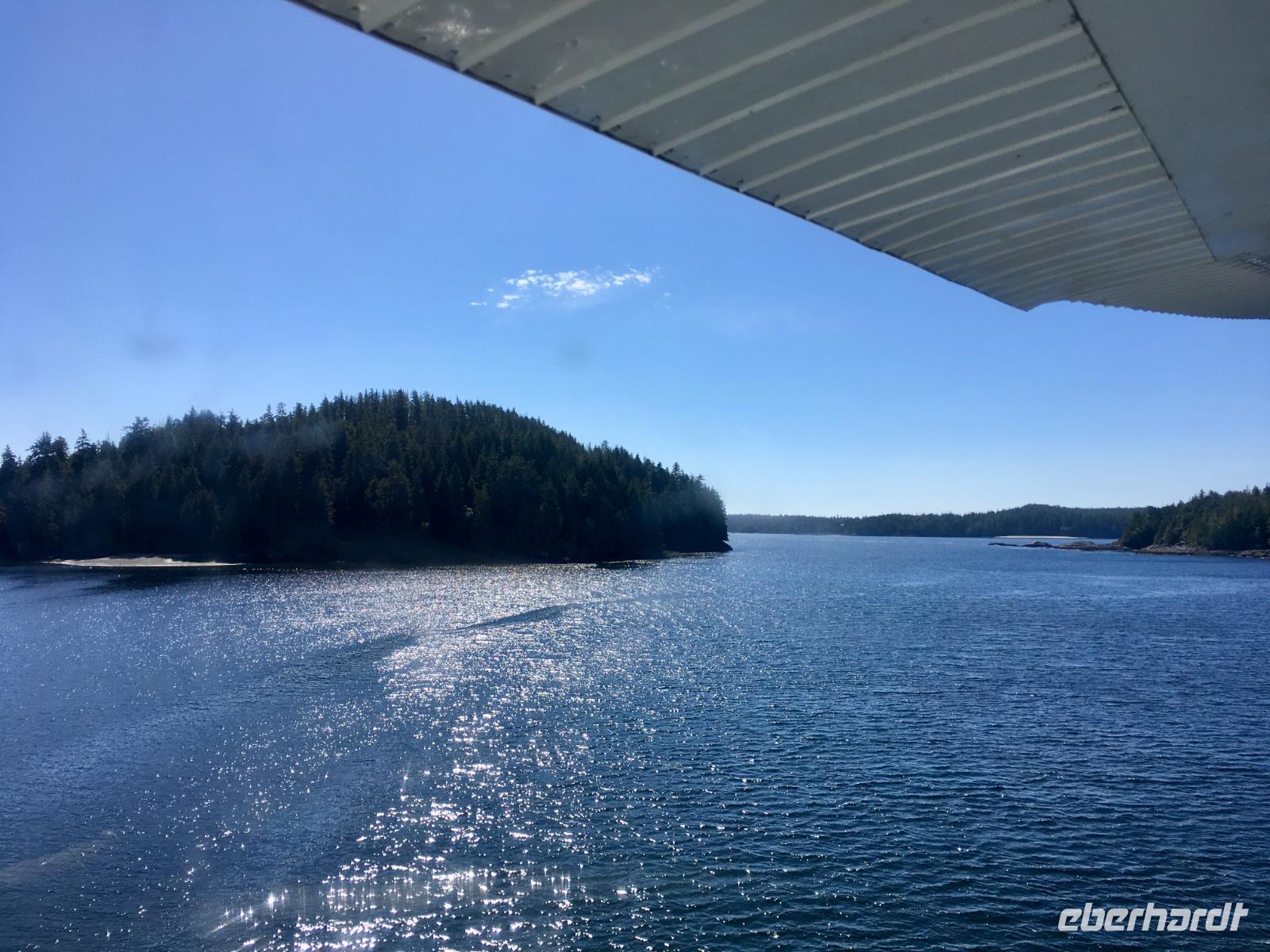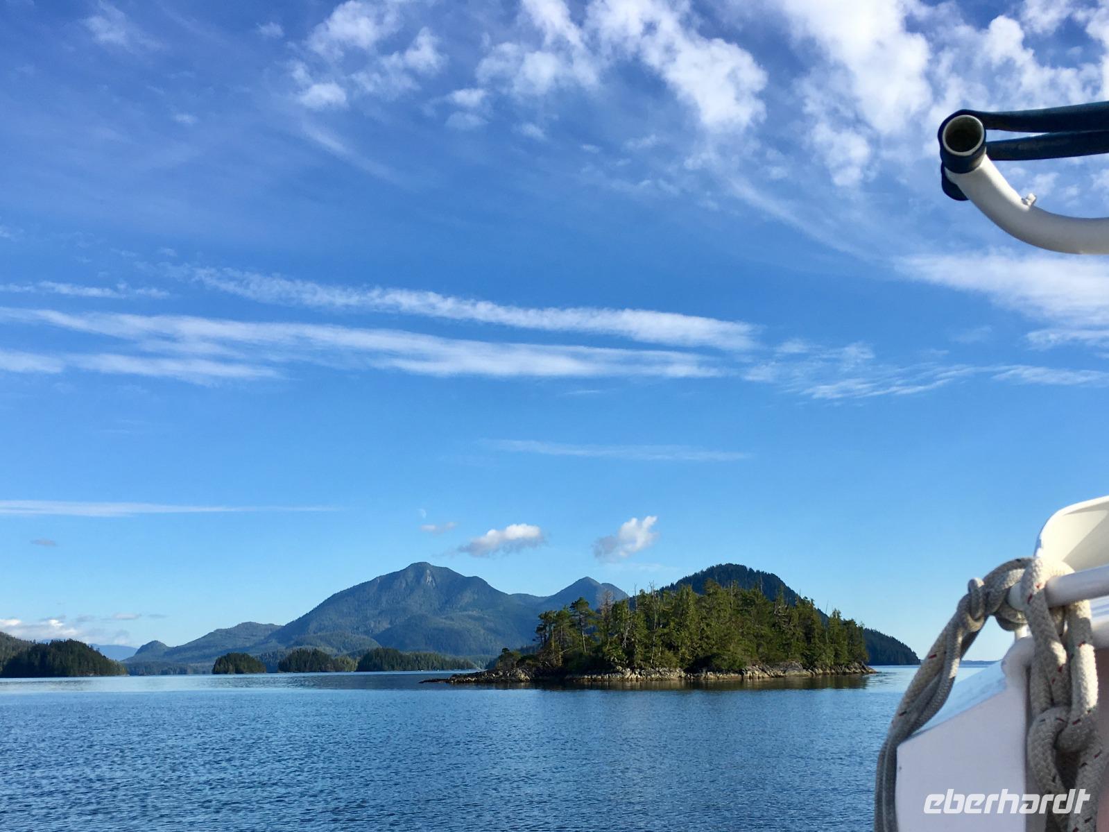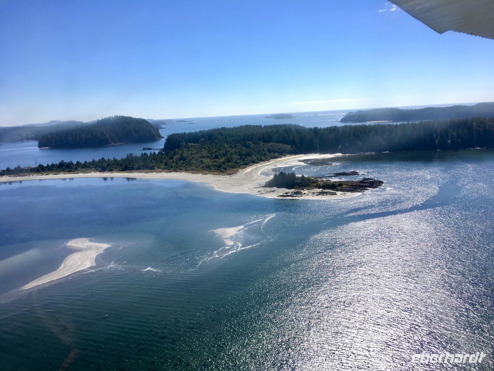 Es ist unser Westkuesten-Tag, der Regenwald-Tag, und es scheint die Sonne. Als erstes wollen wir gleich mal diese legendaeren Riesenbaeume des Pacific Rim Nazionalparks sehen und halten also auch gleich bei einem Rundwanderweg an. Auf einem Holzsteg gehend geniessen wir die Ueberschwenglichkeit der Vielfalt dieses Waldes. Es ist wirklich ein Urwald auf 3 Etagen und wir bewegen uns mal im Unterholz und mal im Mittelbereich. Die Krone des Waldes ist kaum sichtbar...so hoch oben... 80 Meter hoch werden diese Riesen. Der hoechste soll ueber 100 Meter hoch sein. In der Sonne, Fruehmorgends sind diese Waelder am schoensten, alles glitzert, die Farne leuchten und die Troepfchen des Morgendunstes schauen zierlich aus auf dem Moos und den Luftpflanzen. Da kommt uns ein Paeraerchen entgegen, sie sind beide kreidebleich und erklaeren, dass sie soeben, etwa 100 Meter entfernt einen Baeren auf dem Holzsteg begegnet seien. Wir sind eine muntere Gruppe und mit starkem Auftreten und lautem Rufen pirschen wir uns voran. Alle Baeren sind nun gewarnt und haben sich im Dickicht versteckt und die Jungen haben sie auf die Baeume gejagt. Wir gehen staunend weiter bis wir unseren blauen Bus wiedersehen. Auf der Tafel steht, dass dieser Rundgang 1.1 Km lang ist. Wir waren eine Stunde unterwegs und wir sind doch eine Wandergruppe ? Also holen wir die Zeit mit dem Bus wieder ein, fahren zurueck nach Tofino und gehen schon mal Picknick kaufen ehe wir bei der Bootsfirma einchecken. Heute habe wir ein ganz besonderes Erlebnes vor. Mit Schiff und Wasserflugzeug begeben wir uns auf Maquinna Island. Ashley ist unser Kapitaen, sie segelt uns in ihrem 600 PS gedeckten Schiff sicher an den vielen Inseln vorbei. Wir schlaengeln uns eigentlich durch ein Inselmeer. Alles glitzert die Sonne strahlt es ist unglaublich schoen. Kaum an Destination angekommen, landet auch schon das erste der 3 Wasserflugzeuge welche den Rest unserer Reisefamilie hierherbringt. Bis nicht alle hier auf Maquinna Island sind, nehmen wir schon mal das mitgebrachte Picknick ein und trinken ein feines kanadisches Bierchen dazu. Danke Eberhard ! Jetzt wollen wir aber zu den heissen Quellen und das ist eine 1 stuendige Wanderung durch den Wald. So schoen, so erholsam, so aufbauend. Bloss die Haelfte unter uns, trauen sich bei Ankunft in diese Quellen. Sie sind ganz natuerlich mitten in den Felsen und das Baden hat deswegen auch einen hohen Kletteranteil. Irgendwann muessen nun auch die Nixen und Neptune aus dem Wasser denn wir sollen um 4 Uhr wieder beim Steg sein. Bald kommen auch schon die Wasserflugzeuge und das Boot, um uns alle wieder sicher nach Tofino zu bringen. Was fuer ein tolles Erlebnis, schauts Euch die Bildergarerie an, denn Worte koennen es nicht so gut ausdruecken wie die Photos. Der Flug mit so einem Wasserflugzeug ist ein Abenteuer fuer sich alleine. Es ist toll ueber die Inselwelt zu schweben wie ein Vogel. Mancheiner unter uns haelt auch Ausschau, ob er den Baeren nicht doch noch sehen kann. In Tofino finden wir auch wieder Alex mit seinem blauen Riesenbus und bald fahren wir auch gleich zurueck zum Hotel, wo nun jeder seine eigene Quelle/Badewanne geniessen, oder mit zum grossen Strand gehen kann. Einige unter uns Strandgaenger stuerzen sich sogar in den Pazifischen Ozean, es ist gar nicht so kalt. Ein feines Abendessen in dem schmucken Restaurant rundet diesen ereignisreichen Tag ab. Das kanadische Bier schmeckt vorzueglich, der gute Schlaf ist gesichert.