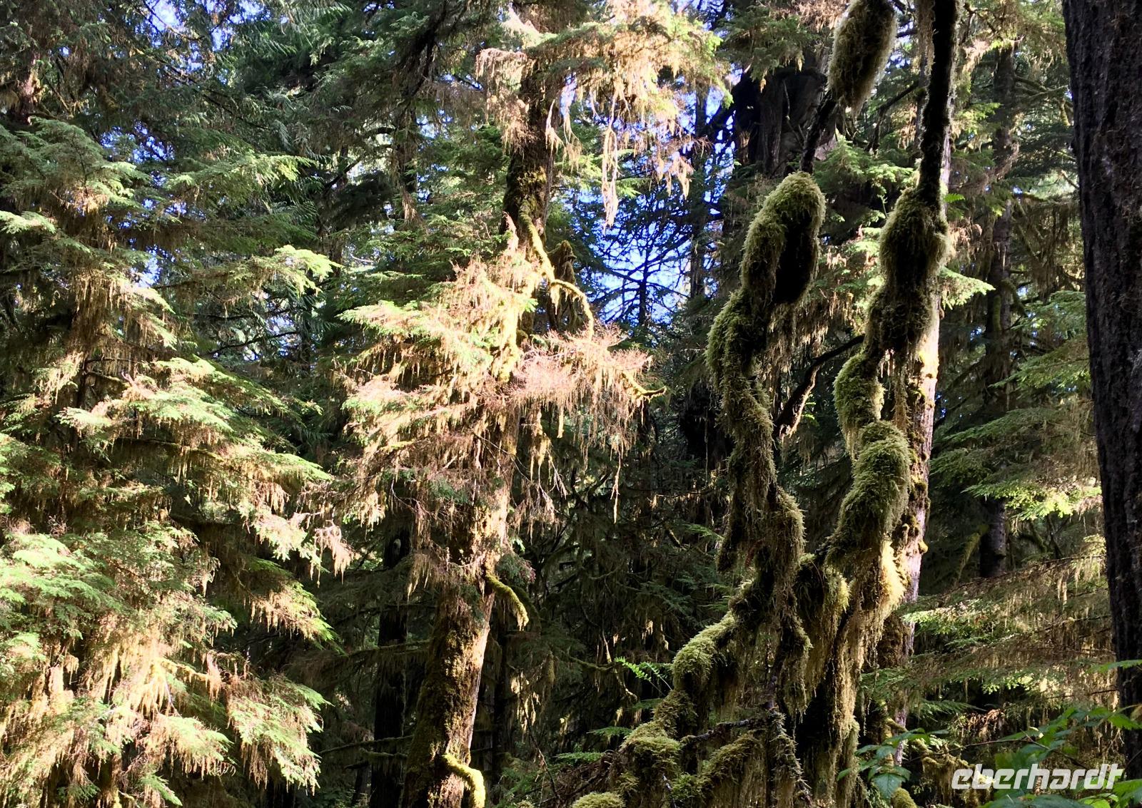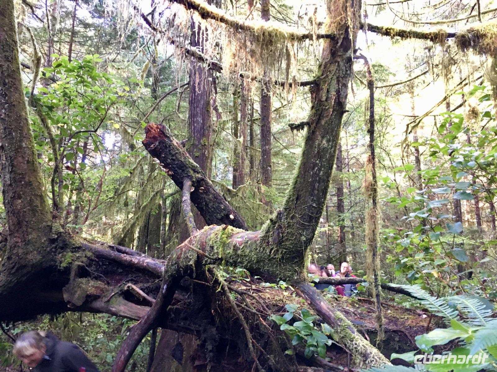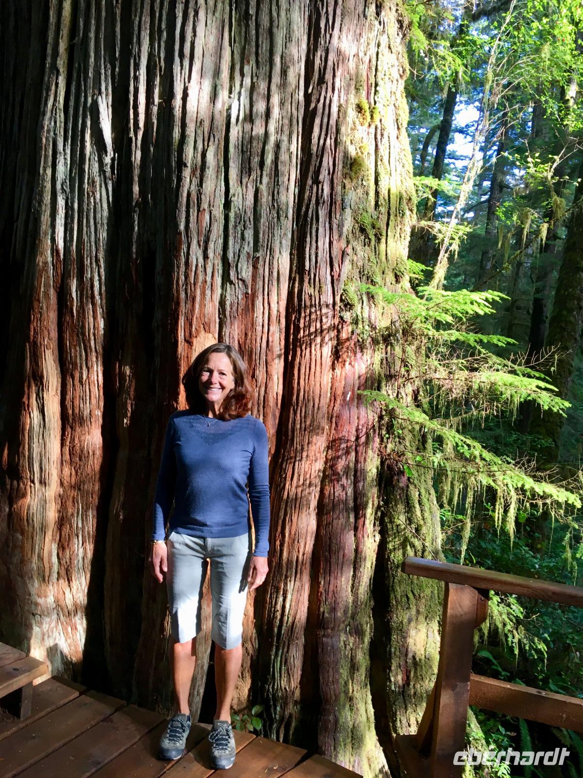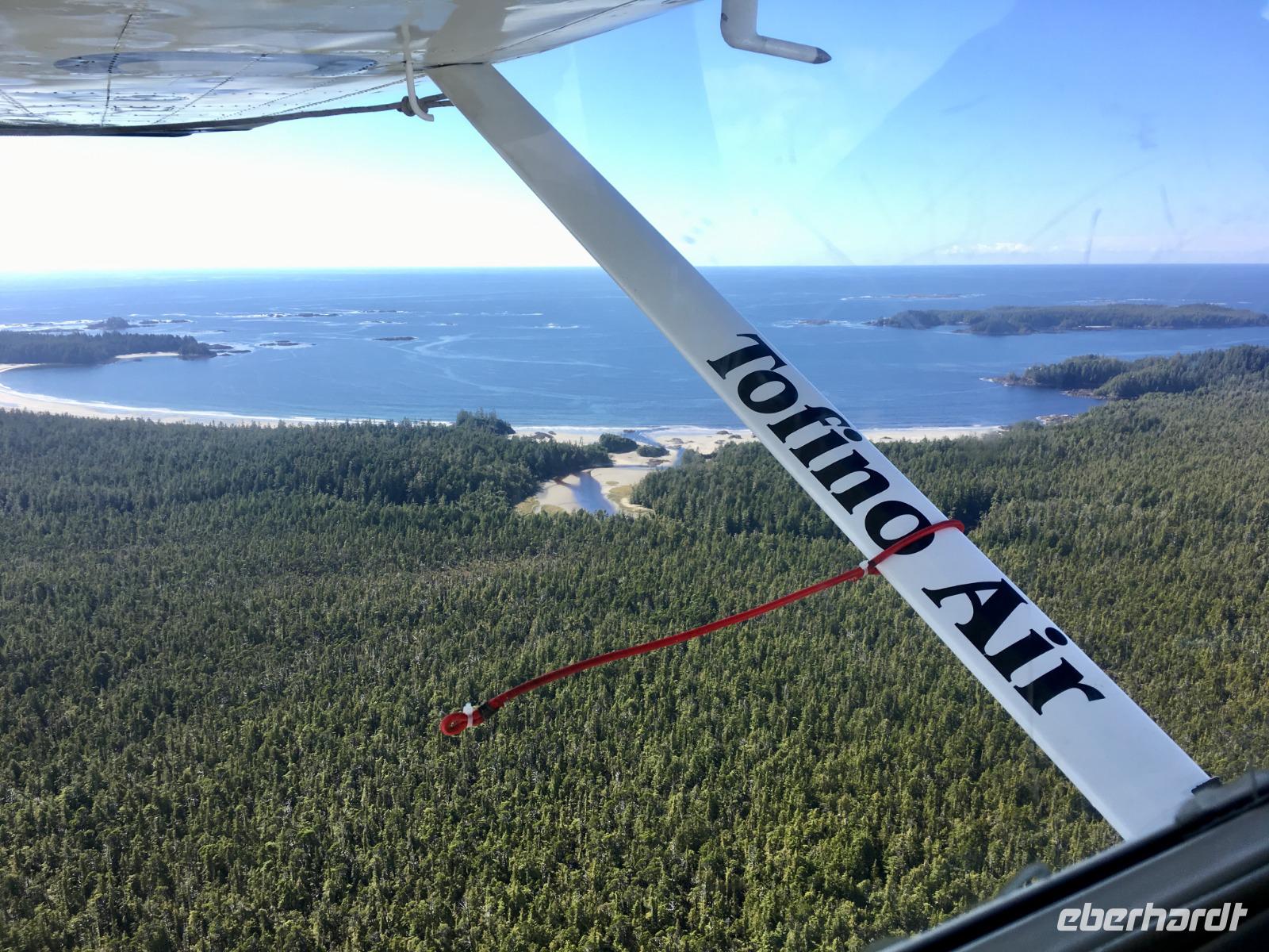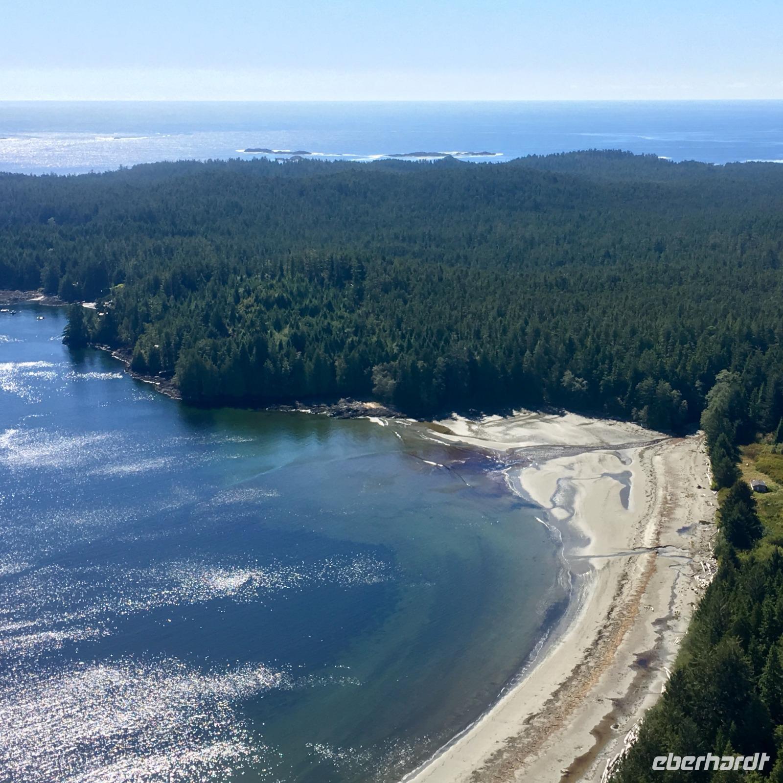 Es ist unser Westkuesten-Tag, der Regenwald-Tag, und es scheint die Sonne. Als erstes wollen wir gleich mal diese legendaeren Riesenbaeume des Pacific Rim Nazionalparks sehen und halten also auch gleich bei einem Rundwanderweg an. Auf einem Holzsteg gehend geniessen wir die Ueberschwenglichkeit der Vielfalt dieses Waldes. Es ist wirklich ein Urwald auf 3 Etagen und wir bewegen uns mal im Unterholz und mal im Mittelbereich. Die Krone des Waldes ist kaum sichtbar...so hoch oben... 80 Meter hoch werden diese Riesen. Der hoechste soll ueber 100 Meter hoch sein. In der Sonne, Fruehmorgends sind diese Waelder am schoensten, alles glitzert, die Farne leuchten und die Troepfchen des Morgendunstes schauen zierlich aus auf dem Moos und den Luftpflanzen. Da kommt uns ein Paeraerchen entgegen, sie sind beide kreidebleich und erklaeren, dass sie soeben, etwa 100 Meter entfernt einen Baeren auf dem Holzsteg begegnet seien. Wir sind eine muntere Gruppe und mit starkem Auftreten und lautem Rufen pirschen wir uns voran. Alle Baeren sind nun gewarnt und haben sich im Dickicht versteckt und die Jungen haben sie auf die Baeume gejagt. Wir gehen staunend weiter bis wir unseren blauen Bus wiedersehen. Auf der Tafel steht, dass dieser Rundgang 1.1 Km lang ist. Wir waren eine Stunde unterwegs und wir sind doch eine Wandergruppe ? Also holen wir die Zeit mit dem Bus wieder ein, fahren zurueck nach Tofino und gehen schon mal Picknick kaufen ehe wir bei der Bootsfirma einchecken. Heute habe wir ein ganz besonderes Erlebnes vor. Mit Schiff und Wasserflugzeug begeben wir uns auf Maquinna Island. Ashley ist unser Kapitaen, sie segelt uns in ihrem 600 PS gedeckten Schiff sicher an den vielen Inseln vorbei. Wir schlaengeln uns eigentlich durch ein Inselmeer. Alles glitzert die Sonne strahlt es ist unglaublich schoen. Kaum an Destination angekommen, landet auch schon das erste der 3 Wasserflugzeuge welche den Rest unserer Reisefamilie hierherbringt. Bis nicht alle hier auf Maquinna Island sind, nehmen wir schon mal das mitgebrachte Picknick ein und trinken ein feines kanadisches Bierchen dazu. Danke Eberhard ! Jetzt wollen wir aber zu den heissen Quellen und das ist eine 1 stuendige Wanderung durch den Wald. So schoen, so erholsam, so aufbauend. Bloss die Haelfte unter uns, trauen sich bei Ankunft in diese Quellen. Sie sind ganz natuerlich mitten in den Felsen und das Baden hat deswegen auch einen hohen Kletteranteil. Irgendwann muessen nun auch die Nixen und Neptune aus dem Wasser denn wir sollen um 4 Uhr wieder beim Steg sein. Bald kommen auch schon die Wasserflugzeuge und das Boot, um uns alle wieder sicher nach Tofino zu bringen. Was fuer ein tolles Erlebnis, schauts Euch die Bildergarerie an, denn Worte koennen es nicht so gut ausdruecken wie die Photos. Der Flug mit so einem Wasserflugzeug ist ein Abenteuer fuer sich alleine. Es ist toll ueber die Inselwelt zu schweben wie ein Vogel. Mancheiner unter uns haelt auch Ausschau, ob er den Baeren nicht doch noch sehen kann. In Tofino finden wir auch wieder Alex mit seinem blauen Riesenbus und bald fahren wir auch gleich zurueck zum Hotel, wo nun jeder seine eigene Quelle/Badewanne geniessen, oder mit zum grossen Strand gehen kann. Einige unter uns Strandgaenger stuerzen sich sogar in den Pazifischen Ozean, es ist gar nicht so kalt. Ein feines Abendessen in dem schmucken Restaurant rundet diesen ereignisreichen Tag ab. Das kanadische Bier schmeckt vorzueglich, der gute Schlaf ist gesichert.