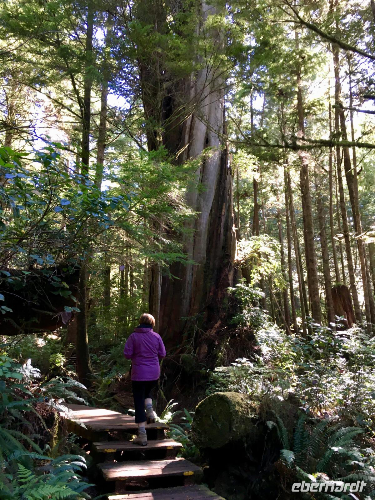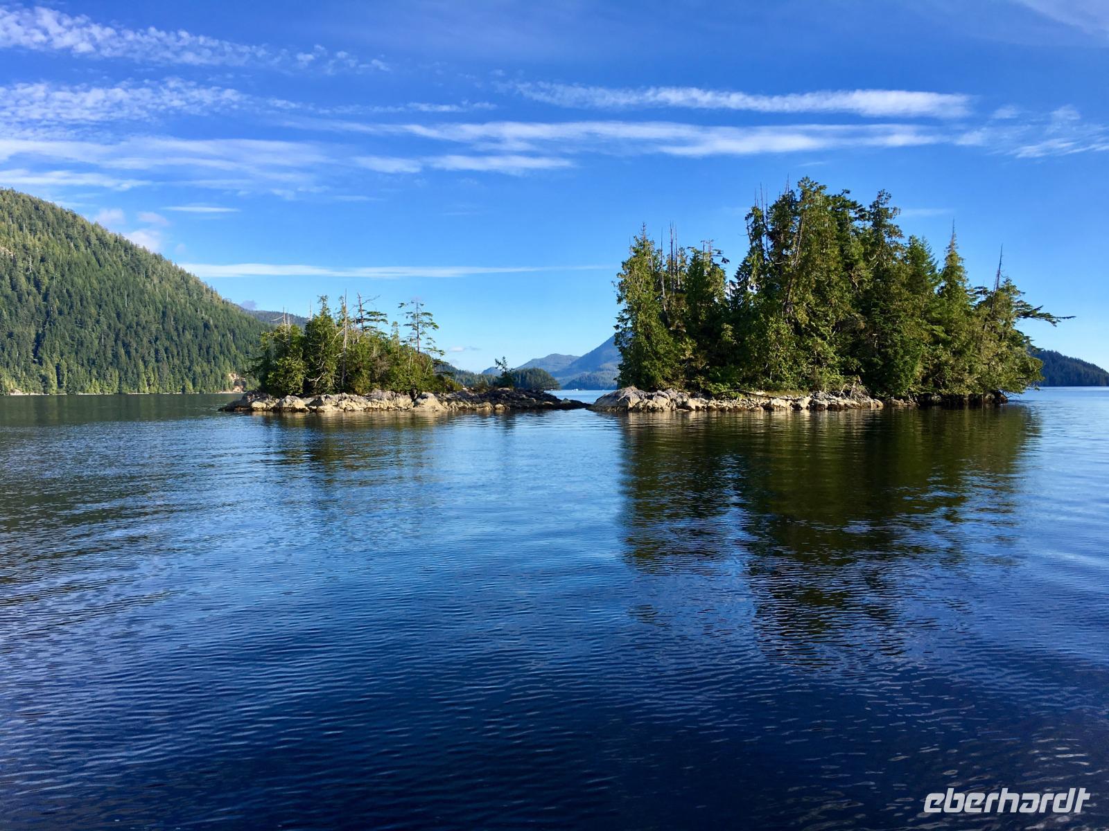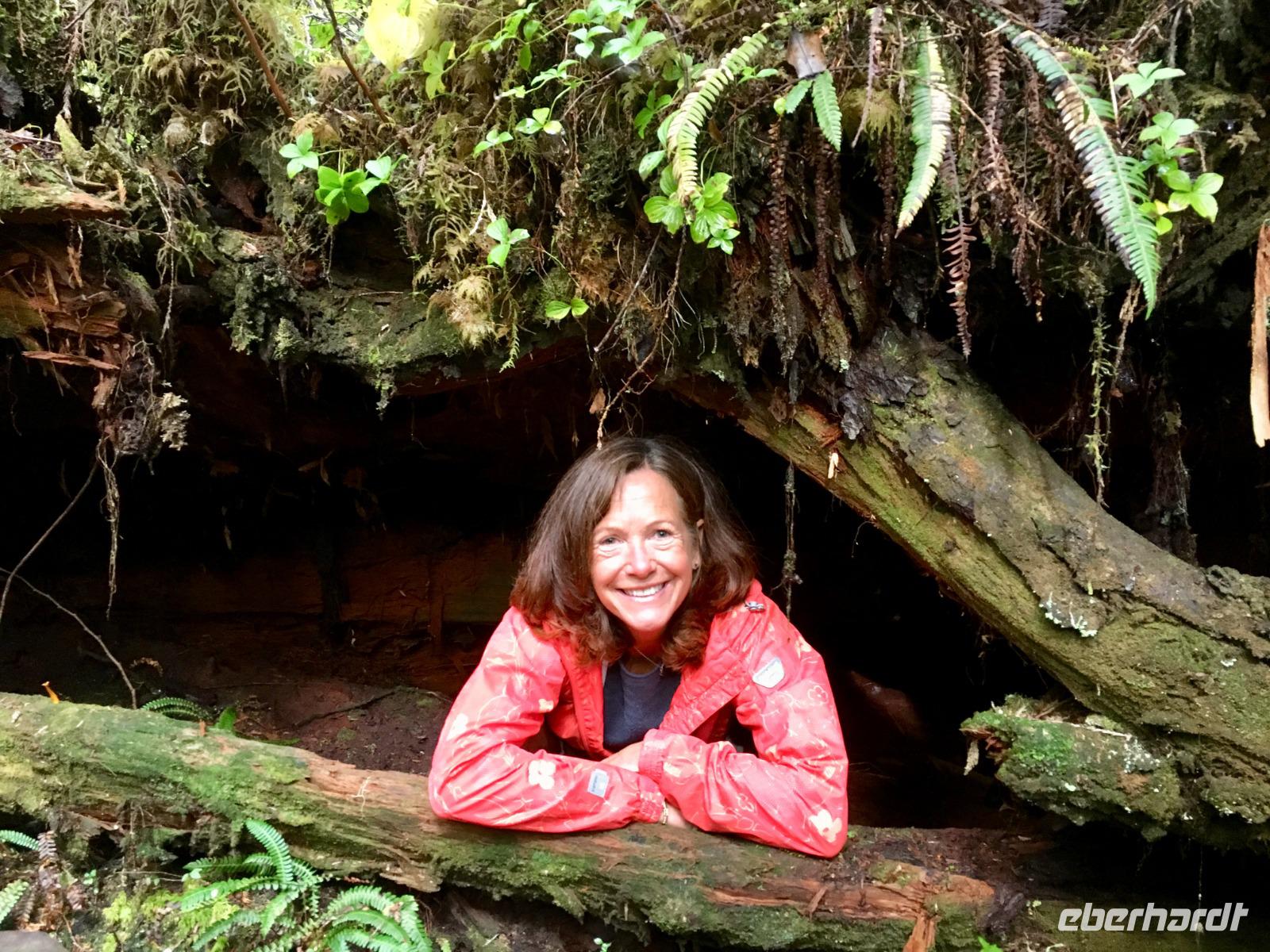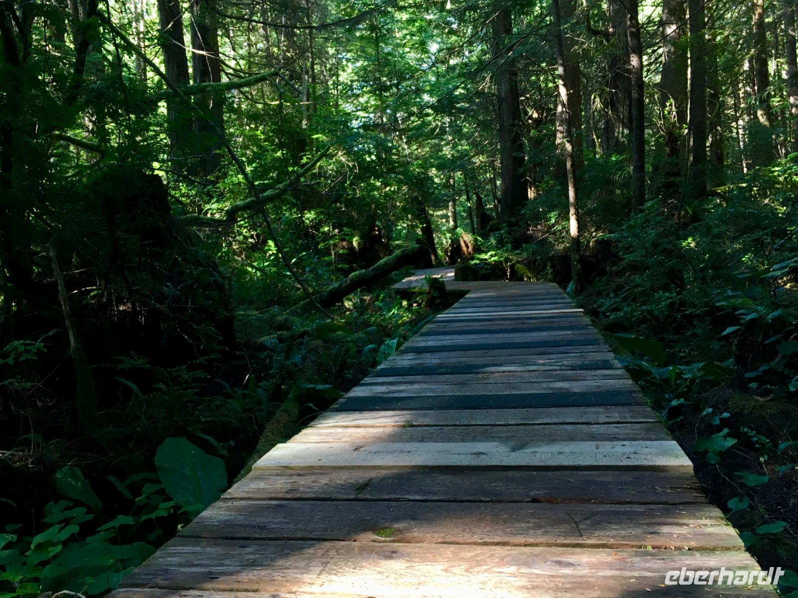 Es ist unser Westkuesten-Tag, der Regenwald-Tag, und es scheint die Sonne. Als erstes wollen wir gleich mal diese legendaeren Riesenbaeume des Pacific Rim Nazionalparks sehen und halten also auch gleich bei einem Rundwanderweg an. Auf einem Holzsteg gehend geniessen wir die Ueberschwenglichkeit der Vielfalt dieses Waldes. Es ist wirklich ein Urwald auf 3 Etagen und wir bewegen uns mal im Unterholz und mal im Mittelbereich. Die Krone des Waldes ist kaum sichtbar...so hoch oben... 80 Meter hoch werden diese Riesen. Der hoechste soll ueber 100 Meter hoch sein. In der Sonne, Fruehmorgends sind diese Waelder am schoensten, alles glitzert, die Farne leuchten und die Troepfchen des Morgendunstes schauen zierlich aus auf dem Moos und den Luftpflanzen. Da kommt uns ein Paeraerchen entgegen, sie sind beide kreidebleich und erklaeren, dass sie soeben, etwa 100 Meter entfernt einen Baeren auf dem Holzsteg begegnet seien. Wir sind eine muntere Gruppe und mit starkem Auftreten und lautem Rufen pirschen wir uns voran. Alle Baeren sind nun gewarnt und haben sich im Dickicht versteckt und die Jungen haben sie auf die Baeume gejagt. Wir gehen staunend weiter bis wir unseren blauen Bus wiedersehen. Auf der Tafel steht, dass dieser Rundgang 1.1 Km lang ist. Wir waren eine Stunde unterwegs und wir sind doch eine Wandergruppe ? Also holen wir die Zeit mit dem Bus wieder ein, fahren zurueck nach Tofino und gehen schon mal Picknick kaufen ehe wir bei der Bootsfirma einchecken. Heute habe wir ein ganz besonderes Erlebnes vor. Mit Schiff und Wasserflugzeug begeben wir uns auf Maquinna Island. Ashley ist unser Kapitaen, sie segelt uns in ihrem 600 PS gedeckten Schiff sicher an den vielen Inseln vorbei. Wir schlaengeln uns eigentlich durch ein Inselmeer. Alles glitzert die Sonne strahlt es ist unglaublich schoen. Kaum an Destination angekommen, landet auch schon das erste der 3 Wasserflugzeuge welche den Rest unserer Reisefamilie hierherbringt. Bis nicht alle hier auf Maquinna Island sind, nehmen wir schon mal das mitgebrachte Picknick ein und trinken ein feines kanadisches Bierchen dazu. Danke Eberhard ! Jetzt wollen wir aber zu den heissen Quellen und das ist eine 1 stuendige Wanderung durch den Wald. So schoen, so erholsam, so aufbauend. Bloss die Haelfte unter uns, trauen sich bei Ankunft in diese Quellen. Sie sind ganz natuerlich mitten in den Felsen und das Baden hat deswegen auch einen hohen Kletteranteil. Irgendwann muessen nun auch die Nixen und Neptune aus dem Wasser denn wir sollen um 4 Uhr wieder beim Steg sein. Bald kommen auch schon die Wasserflugzeuge und das Boot, um uns alle wieder sicher nach Tofino zu bringen. Was fuer ein tolles Erlebnis, schauts Euch die Bildergarerie an, denn Worte koennen es nicht so gut ausdruecken wie die Photos. Der Flug mit so einem Wasserflugzeug ist ein Abenteuer fuer sich alleine. Es ist toll ueber die Inselwelt zu schweben wie ein Vogel. Mancheiner unter uns haelt auch Ausschau, ob er den Baeren nicht doch noch sehen kann. In Tofino finden wir auch wieder Alex mit seinem blauen Riesenbus und bald fahren wir auch gleich zurueck zum Hotel, wo nun jeder seine eigene Quelle/Badewanne geniessen, oder mit zum grossen Strand gehen kann. Einige unter uns Strandgaenger stuerzen sich sogar in den Pazifischen Ozean, es ist gar nicht so kalt. Ein feines Abendessen in dem schmucken Restaurant rundet diesen ereignisreichen Tag ab. Das kanadische Bier schmeckt vorzueglich, der gute Schlaf ist gesichert.