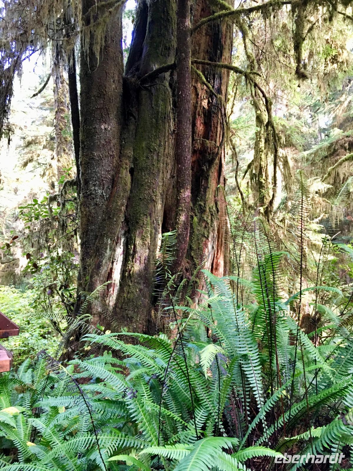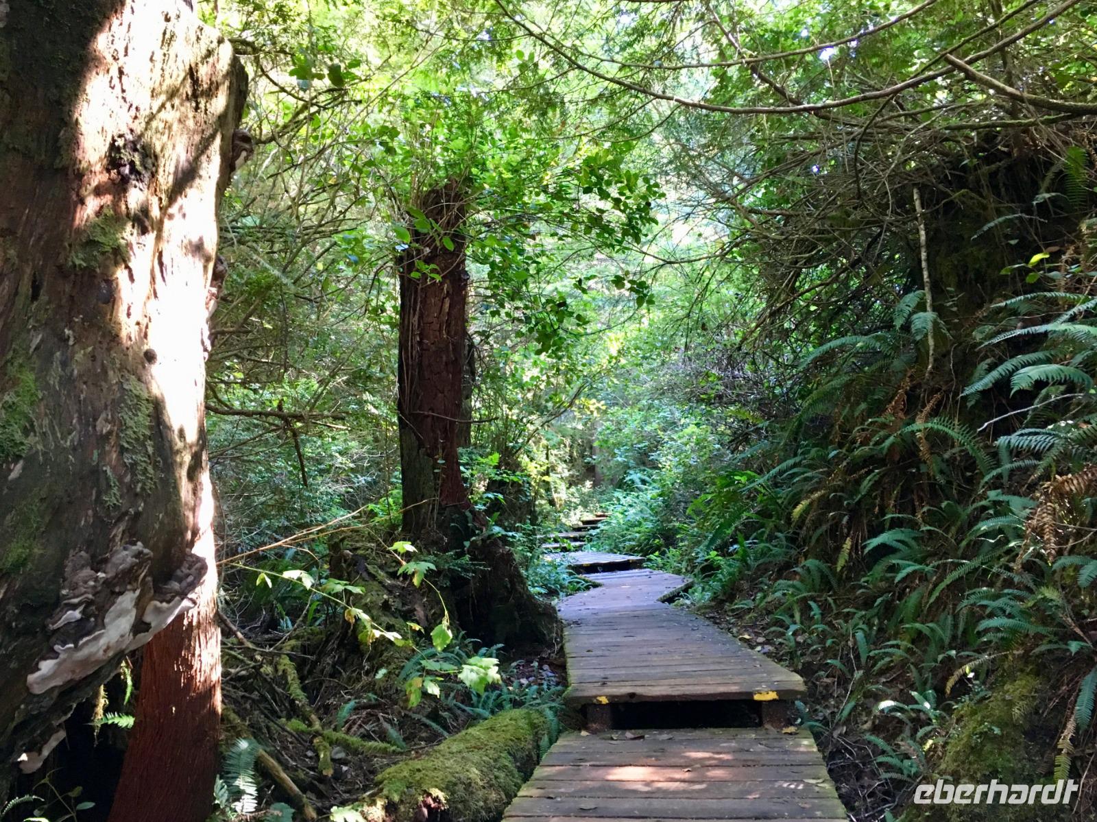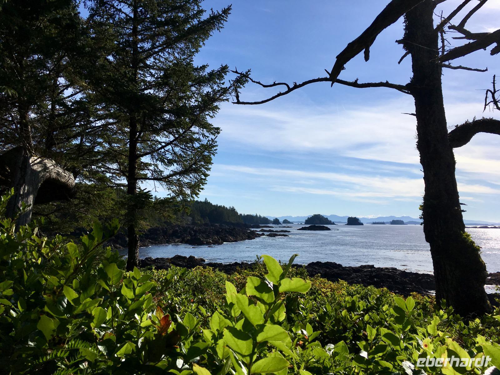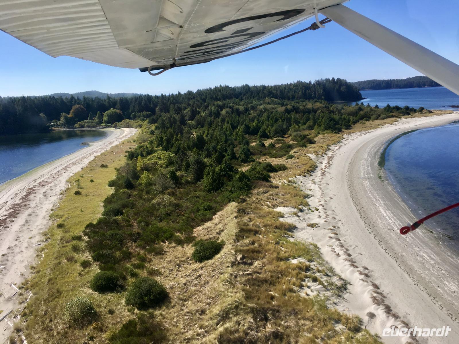 Es ist unser Westkuesten-Tag, der Regenwald-Tag, und es scheint die Sonne. Als erstes wollen wir gleich mal diese legendaeren Riesenbaeume des Pacific Rim Nazionalparks sehen und halten also auch gleich bei einem Rundwanderweg an. Auf einem Holzsteg gehend geniessen wir die Ueberschwenglichkeit der Vielfalt dieses Waldes. Es ist wirklich ein Urwald auf 3 Etagen und wir bewegen uns mal im Unterholz und mal im Mittelbereich. Die Krone des Waldes ist kaum sichtbar...so hoch oben... 80 Meter hoch werden diese Riesen. Der hoechste soll ueber 100 Meter hoch sein. In der Sonne, Fruehmorgends sind diese Waelder am schoensten, alles glitzert, die Farne leuchten und die Troepfchen des Morgendunstes schauen zierlich aus auf dem Moos und den Luftpflanzen. Da kommt uns ein Paeraerchen entgegen, sie sind beide kreidebleich und erklaeren, dass sie soeben, etwa 100 Meter entfernt einen Baeren auf dem Holzsteg begegnet seien. Wir sind eine muntere Gruppe und mit starkem Auftreten und lautem Rufen pirschen wir uns voran. Alle Baeren sind nun gewarnt und haben sich im Dickicht versteckt und die Jungen haben sie auf die Baeume gejagt. Wir gehen staunend weiter bis wir unseren blauen Bus wiedersehen. Auf der Tafel steht, dass dieser Rundgang 1.1 Km lang ist. Wir waren eine Stunde unterwegs und wir sind doch eine Wandergruppe ? Also holen wir die Zeit mit dem Bus wieder ein, fahren zurueck nach Tofino und gehen schon mal Picknick kaufen ehe wir bei der Bootsfirma einchecken. Heute habe wir ein ganz besonderes Erlebnes vor. Mit Schiff und Wasserflugzeug begeben wir uns auf Maquinna Island. Ashley ist unser Kapitaen, sie segelt uns in ihrem 600 PS gedeckten Schiff sicher an den vielen Inseln vorbei. Wir schlaengeln uns eigentlich durch ein Inselmeer. Alles glitzert die Sonne strahlt es ist unglaublich schoen. Kaum an Destination angekommen, landet auch schon das erste der 3 Wasserflugzeuge welche den Rest unserer Reisefamilie hierherbringt. Bis nicht alle hier auf Maquinna Island sind, nehmen wir schon mal das mitgebrachte Picknick ein und trinken ein feines kanadisches Bierchen dazu. Danke Eberhard ! Jetzt wollen wir aber zu den heissen Quellen und das ist eine 1 stuendige Wanderung durch den Wald. So schoen, so erholsam, so aufbauend. Bloss die Haelfte unter uns, trauen sich bei Ankunft in diese Quellen. Sie sind ganz natuerlich mitten in den Felsen und das Baden hat deswegen auch einen hohen Kletteranteil. Irgendwann muessen nun auch die Nixen und Neptune aus dem Wasser denn wir sollen um 4 Uhr wieder beim Steg sein. Bald kommen auch schon die Wasserflugzeuge und das Boot, um uns alle wieder sicher nach Tofino zu bringen. Was fuer ein tolles Erlebnis, schauts Euch die Bildergarerie an, denn Worte koennen es nicht so gut ausdruecken wie die Photos. Der Flug mit so einem Wasserflugzeug ist ein Abenteuer fuer sich alleine. Es ist toll ueber die Inselwelt zu schweben wie ein Vogel. Mancheiner unter uns haelt auch Ausschau, ob er den Baeren nicht doch noch sehen kann. In Tofino finden wir auch wieder Alex mit seinem blauen Riesenbus und bald fahren wir auch gleich zurueck zum Hotel, wo nun jeder seine eigene Quelle/Badewanne geniessen, oder mit zum grossen Strand gehen kann. Einige unter uns Strandgaenger stuerzen sich sogar in den Pazifischen Ozean, es ist gar nicht so kalt. Ein feines Abendessen in dem schmucken Restaurant rundet diesen ereignisreichen Tag ab. Das kanadische Bier schmeckt vorzueglich, der gute Schlaf ist gesichert.