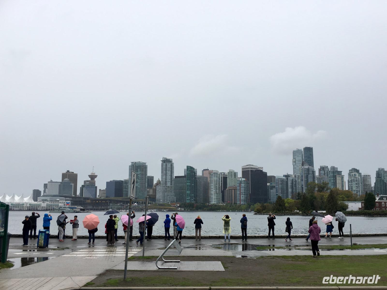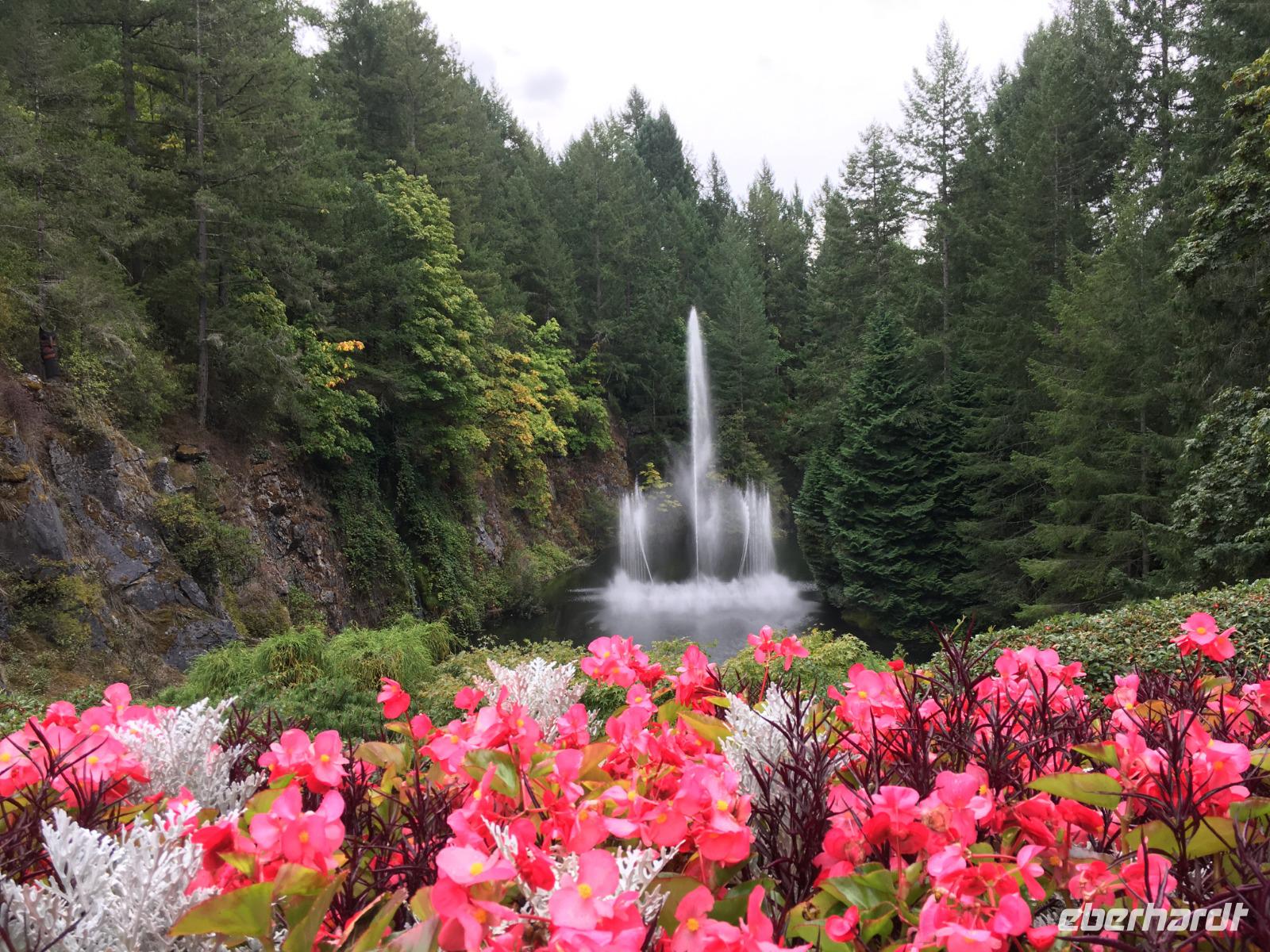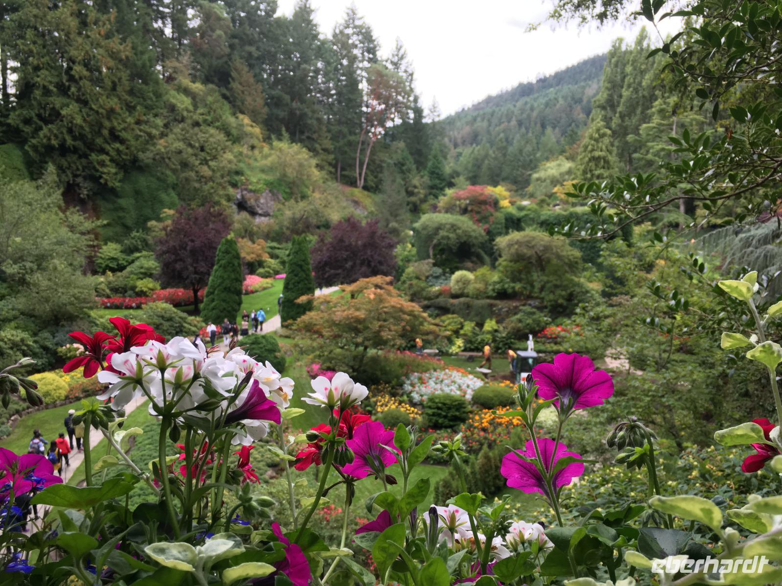 Abreise von Victoria steht heute auf dem Programm. Sobald die Koffer im Bus verstaut sind, fahren wir durch die vornehmen Wohnviertel dieser Stadt. Am Meer entlang fahrend haben wir eine herrliche Aussicht auf die Olympischen Berge von Washington State. Hier halten wir auch an, da wir einen Geburtstag zu feiern haben. Pop, Pop, Pop und die 3 Flaschen rosa Sekt fliessen in die Glaeser. Danach fahren wir weiter in die Butchart Gardens. Eine riesengrosse Anlage mit verschiedenen Gaerten erwartet uns hier. Elisabeth darf uns hier leider nicht mehr begleiten, also bekommen wir die ganze Fuehrung beim Eingang, sodass wir uns hier nun wie in unserer Hosentasche auskennen. Vorerst der haengende Garten, dann den Wald-Garten, der versunkene Garten mit seiner Fontaene, den Rosengarten, den japanischen Garten, der franzoesische- und, zu guter Letzt, der italienische Garten. Bis wir wieder beim Kaffeehaus sind, sehen wir nur noch Blueten und Blumen vor unseren Augen. So beeindruckend sind diese Gaerten. Ueber eine Million Gaeste schauen sich jaehrlich diese Pracht an. Wir auch ! Mittags sind wir auf der Faehre und da essen wir auch in dem feinen Buffet im Restaurant. Aehnlich einem Kreuzschiff ist das Buffet sehr gediegen und besonders fein. Die 1 ½ Stunden sind sehr schnell vorbei. Bei Ankunft auf dem Festland fahren wir in Richtung Norden nach Vancouver. Wir lernen die Stadt auch gleich kennen, denn die Stadtfuehrung fuehrt uns vorerst ins Chinatown. Hier steigen wir auch aus um Chinatown so richtig zu erleben. Danach gehts weiter nach Gastown. Es ist der aelteste Stadteil Vancouvers mit seiner interessanten Geschichte und seiner Dampfuhr die man auf jedem Vancouver Prospekt sieht. Und nun stehen wir erwartungsvoll vor der Dampfuhr. Ploetzlich legt sie los. Die Stunde wird durch viel Dampf im Big Ben Muster angezeigt und durchs Glass kann man das Getriebe anschauen. Ganz schoen einfallsreich der britische Lok-ingenieur ! Nun sehen wir noch viele Sehenswuerdigkeite der Perle des Pazifiks und halten wieder in Stanley Park bei den Totem Pfaehlen. Auch hier weiss Elisabeth noch Geschichten dazu. Die lustige Kinder-Trockenanlage beim Spielplatz ist sehr amuesant und die Loewenbruecke beeindruckend. Bald gelangen wir so zu unserem Hotel wo wir uns von Alex mit einem dicken Umschlag und besten Wuenschen verabschieden. Heute Abend ist freies Abendbrot und so ziehen wir alle mit unseren Stadtkarten ausgeruestet durch die Strassen Vancouvers.