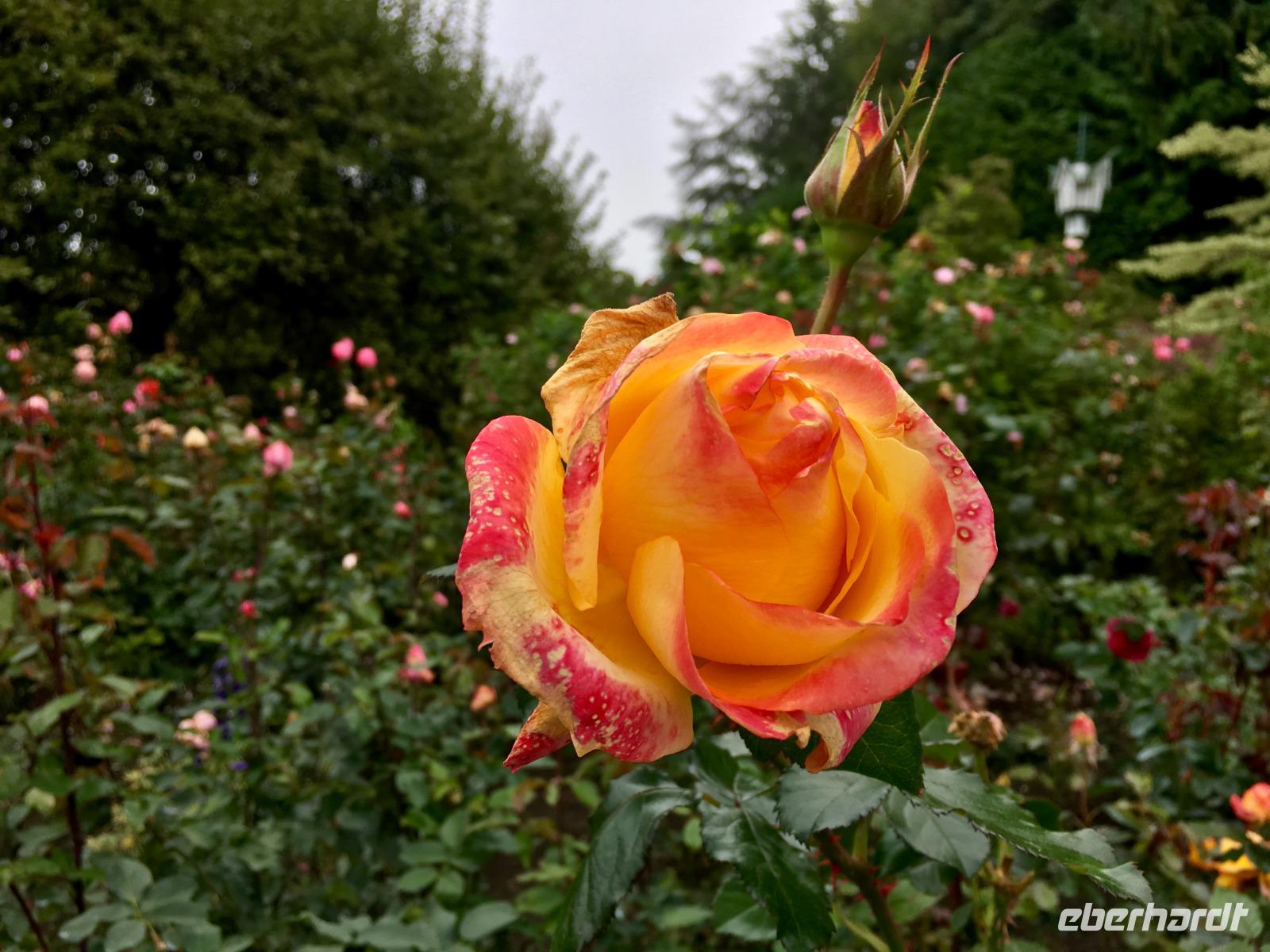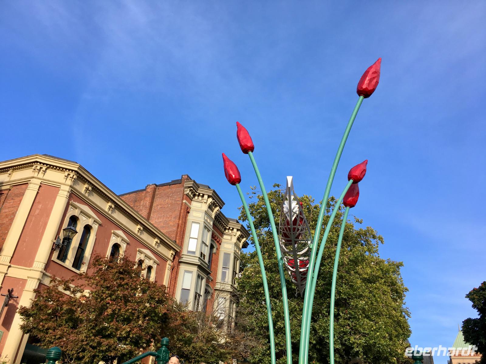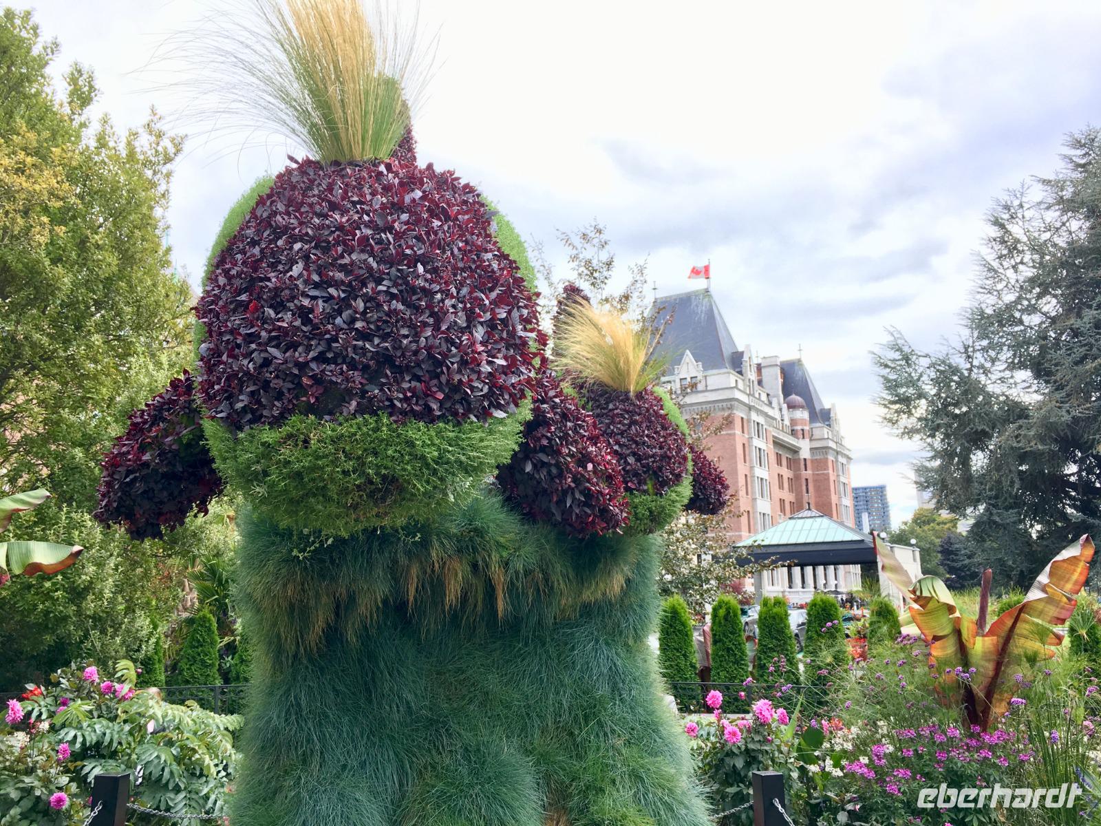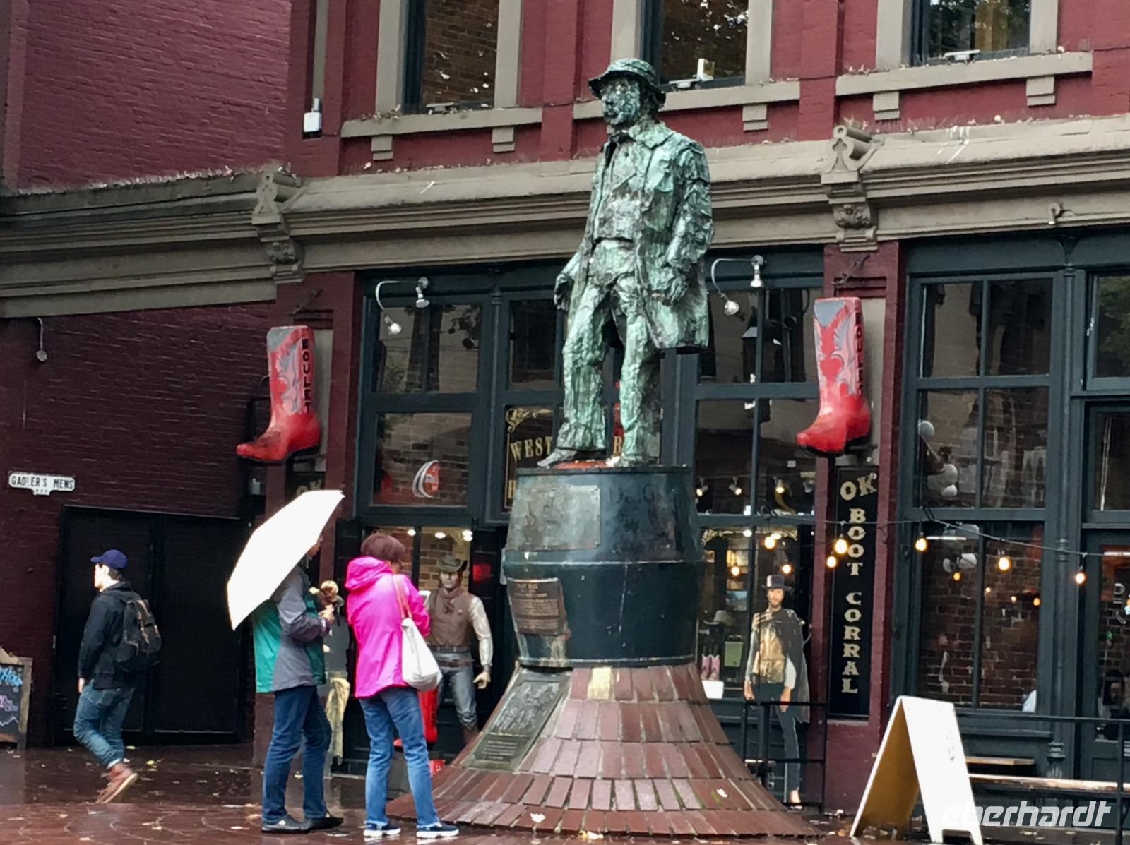 Abreise von Victoria steht heute auf dem Programm. Sobald die Koffer im Bus verstaut sind, fahren wir durch die vornehmen Wohnviertel dieser Stadt. Am Meer entlang fahrend haben wir eine herrliche Aussicht auf die Olympischen Berge von Washington State. Hier halten wir auch an, da wir einen Geburtstag zu feiern haben. Pop, Pop, Pop und die 3 Flaschen rosa Sekt fliessen in die Glaeser. Danach fahren wir weiter in die Butchart Gardens. Eine riesengrosse Anlage mit verschiedenen Gaerten erwartet uns hier. Elisabeth darf uns hier leider nicht mehr begleiten, also bekommen wir die ganze Fuehrung beim Eingang, sodass wir uns hier nun wie in unserer Hosentasche auskennen. Vorerst der haengende Garten, dann den Wald-Garten, der versunkene Garten mit seiner Fontaene, den Rosengarten, den japanischen Garten, der franzoesische- und, zu guter Letzt, der italienische Garten. Bis wir wieder beim Kaffeehaus sind, sehen wir nur noch Blueten und Blumen vor unseren Augen. So beeindruckend sind diese Gaerten. Ueber eine Million Gaeste schauen sich jaehrlich diese Pracht an. Wir auch ! Mittags sind wir auf der Faehre und da essen wir auch in dem feinen Buffet im Restaurant. Aehnlich einem Kreuzschiff ist das Buffet sehr gediegen und besonders fein. Die 1 ½ Stunden sind sehr schnell vorbei. Bei Ankunft auf dem Festland fahren wir in Richtung Norden nach Vancouver. Wir lernen die Stadt auch gleich kennen, denn die Stadtfuehrung fuehrt uns vorerst ins Chinatown. Hier steigen wir auch aus um Chinatown so richtig zu erleben. Danach gehts weiter nach Gastown. Es ist der aelteste Stadteil Vancouvers mit seiner interessanten Geschichte und seiner Dampfuhr die man auf jedem Vancouver Prospekt sieht. Und nun stehen wir erwartungsvoll vor der Dampfuhr. Ploetzlich legt sie los. Die Stunde wird durch viel Dampf im Big Ben Muster angezeigt und durchs Glass kann man das Getriebe anschauen. Ganz schoen einfallsreich der britische Lok-ingenieur ! Nun sehen wir noch viele Sehenswuerdigkeite der Perle des Pazifiks und halten wieder in Stanley Park bei den Totem Pfaehlen. Auch hier weiss Elisabeth noch Geschichten dazu. Die lustige Kinder-Trockenanlage beim Spielplatz ist sehr amuesant und die Loewenbruecke beeindruckend. Bald gelangen wir so zu unserem Hotel wo wir uns von Alex mit einem dicken Umschlag und besten Wuenschen verabschieden. Heute Abend ist freies Abendbrot und so ziehen wir alle mit unseren Stadtkarten ausgeruestet durch die Strassen Vancouvers.