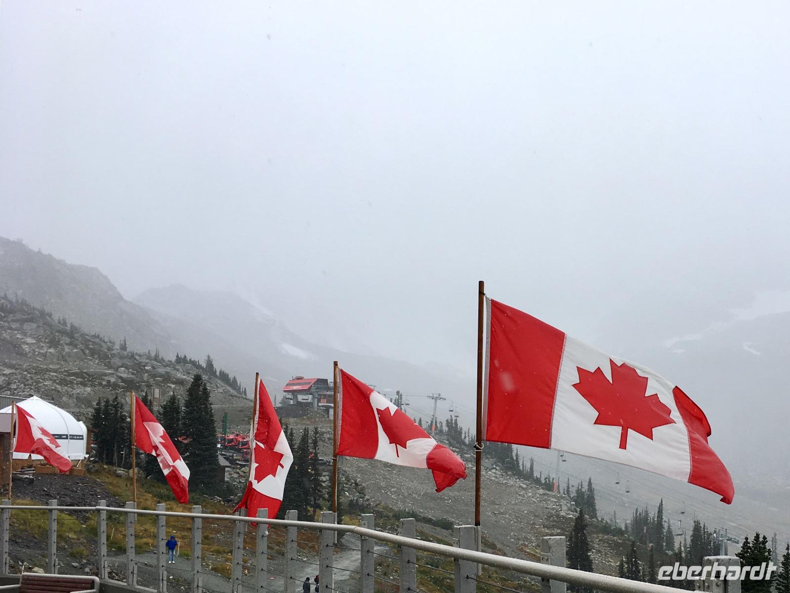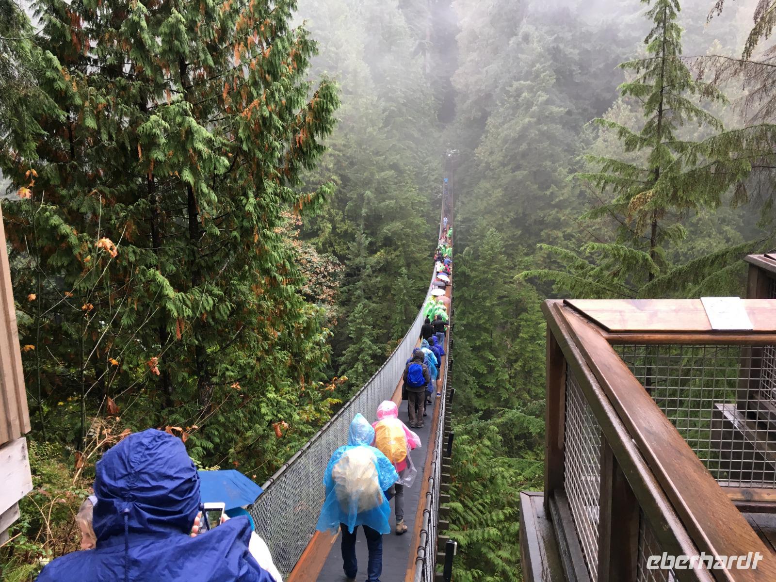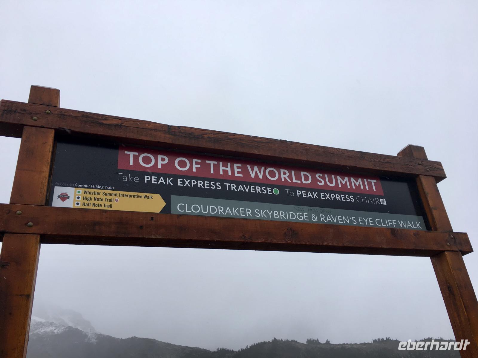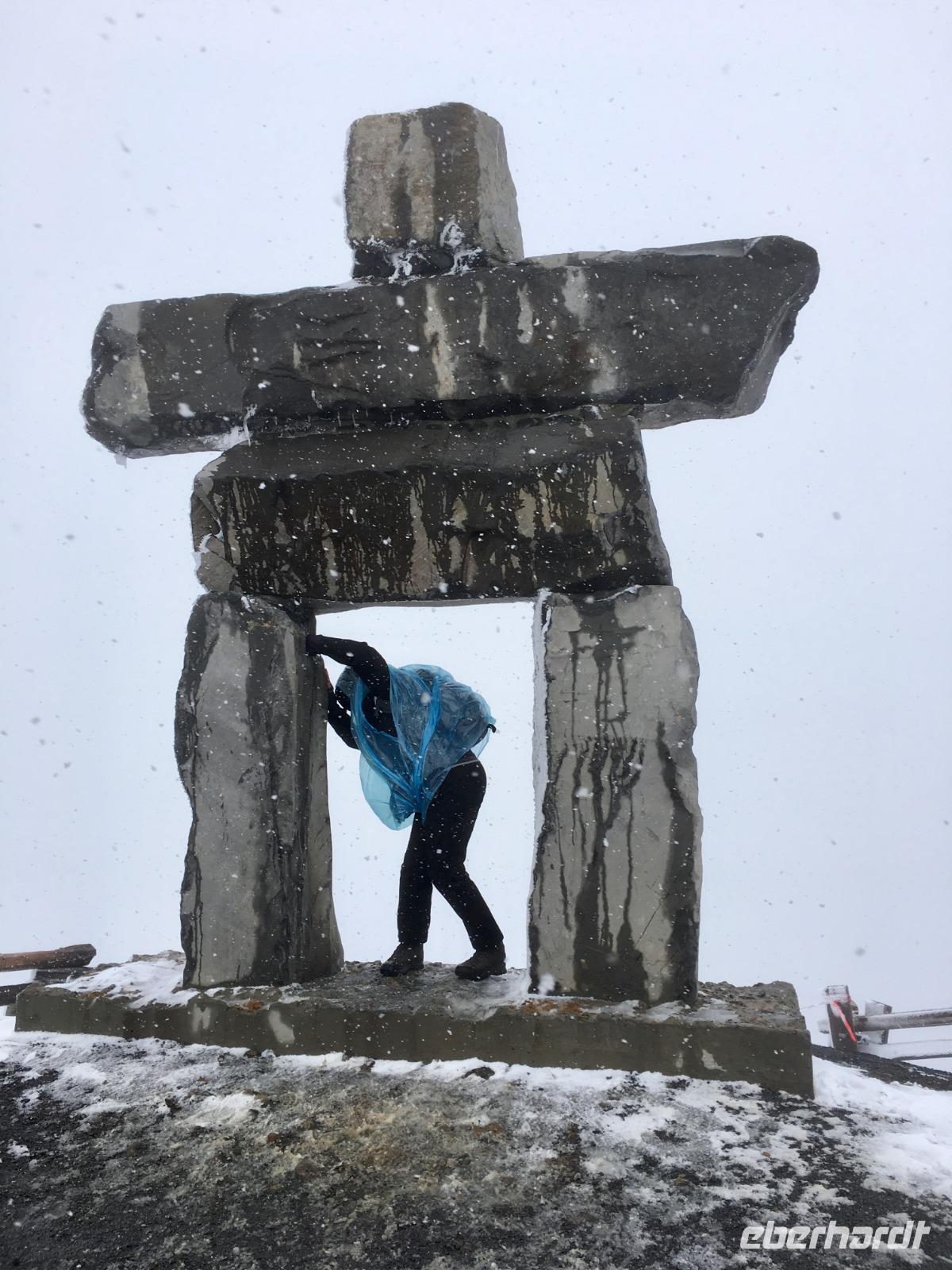 Guten Morgen in Whistler. Oh, es regnet ganz leicht also nehmen wir gleich schon mal den Shuttle Bus der uns ins Zentrum Whistlers faehrt. Mit Tageskarte in der Hand, an all den wilden Downhill Radfahrer vorbei, geht es mit der 6-er Gondeln auf Whistler Mountain. Da gibt es auch einen Zwischenhalt und wir wollen natuerlich gleich aussteigen, ahhh nein, Elisabeth hat doch gesagt, wir sollen sitzen bleiben bis wir ganz oben auf dem Berg sind. Bald sind wir oben, die Kanada- und die 2010 Olympia-Fahnen wehen im Schneegestoeber sodass wir gleich in das naechste Gebaeude fluechten. Dort wohnt die Peak 2 Peak Gondola. Diese schwebende Verbindung der zwei Berge hat die laengste Seilspanne der Welt und ist nicht nur ein Erlebnis sondern auch ein technisches Spitzenprodukt. Die ganze Gruppe passt in eine Gondel und bald schweben wir hoch ueber dem Fitzsimmons Tal. Auf Blackcomb Mountain angekommen regnet es wieder ganz leicht. Die Murmeltiere, wovon es hier so viele geben soll, sind alle versteckt. Trotz dem Nieselregen entschliessen wir uns eine kleine Wanderung zu unternehmen. Entlang des Berges gibt es einen schoenen Pfad ueber Stock und Stein. Den gehen wir fuer 1 Stunden und bloss die perfekten Bonsai-Tannen und Fichten begleiten uns. Der Pfad bringt uns wieder zurueck zur Gondel die uns wieder auf Whistler Mountain bringt. Dort machen wir erstmals Mittagspause ehe es einen Weg bergab geht, der uns zu einem Sessellift bringt. Peak Chair heisst er und wir sehen die Endstation kaum. Was fuer ein Erlebniss, hoch hinan bringt uns dieser Lift, vielleicht sogar ueber die Wolken. Unter uns sehen wir furchterregende Felsen und Gletscher. Anscheinend stuerzen sich hier die Skifahrer und Snowboarder im Winter hinunter, und die bezahlen dafuer sogar sehr viel Geld !! Oben angekommen, stuermt es wieder und wir stehen auf Schnee im Schnee. In der Ferne, 10 Meter entfernt....steht ein Inukshuk, der fuer die Olympiade 2010 aufgestellt wurde. Viele Photos spaeter haben wir alle ein Bild davon, von der Aussicht sehen wir leider gar nichts aber lustig ist es trotzdem. Eine furchterregende Haengebruecke wollen wir nun begehen. Ja, bei Schneegestoeber ist die gar nicht so furchterregend und jeder traut sich auf die andere Seite und wieder zurueck zu gehen. Nun gehts aber wieder zurueck, mit Sessellift, zu Fuss und mit der Gondel sind wir bald mal wieder in Whistler. Jetzt sind 2 Stunden Freizeit angesagt. Am spaeten Nachmittag in einem Irischen Pub faengt heute die Fete an, im Brauhaus geht sie lustig weiter bis wir nicht im Restaurant ein sehr amuesantes und leckeres Abendmahl geniessen. Wir lachen so viel, dass sogar einige Traenen fliessen und die Bauchmuskeln richtigen Muskelkater bekommen. Geschichten von dem Baeren, der 10 Meter neben einem von uns vorbeirannte und viele Anekdoten spaeter fallen wir todmuede in die Betten.