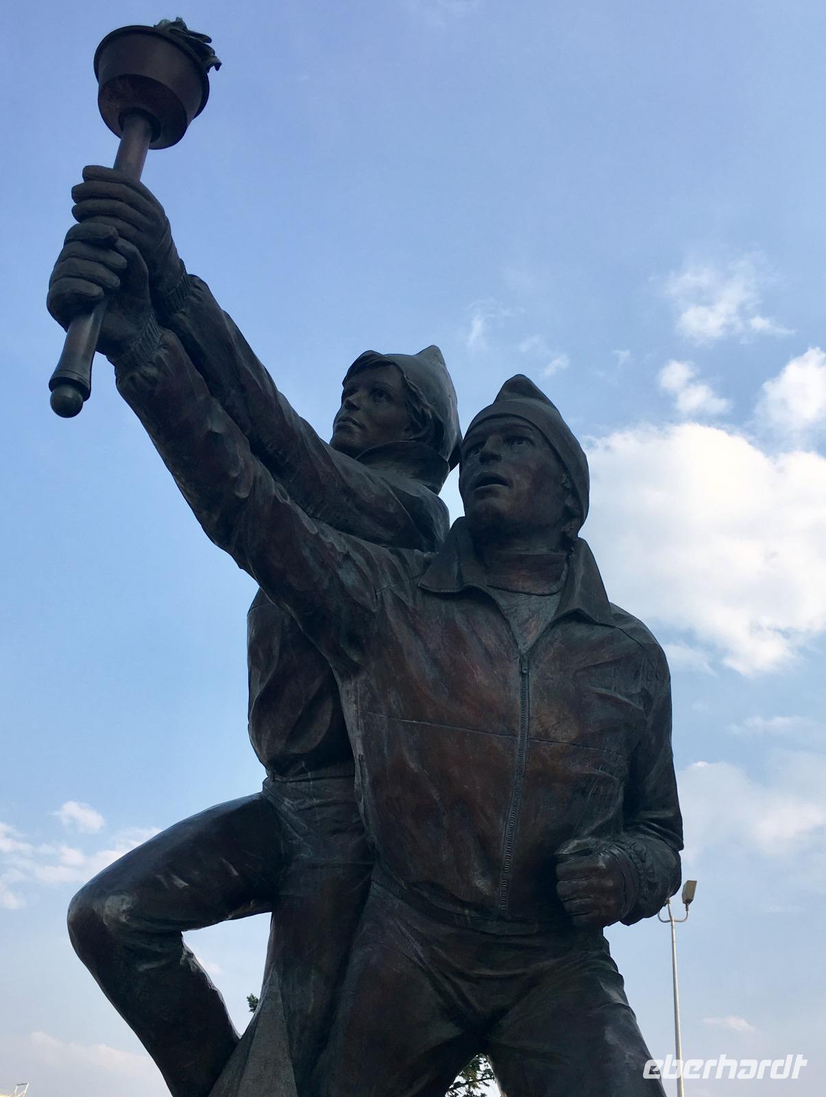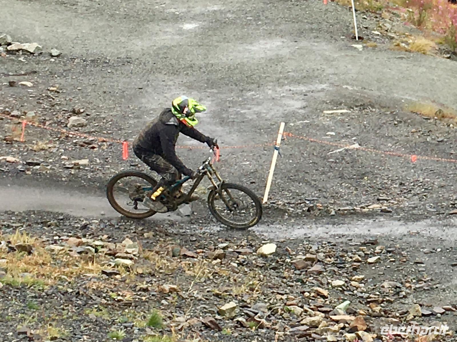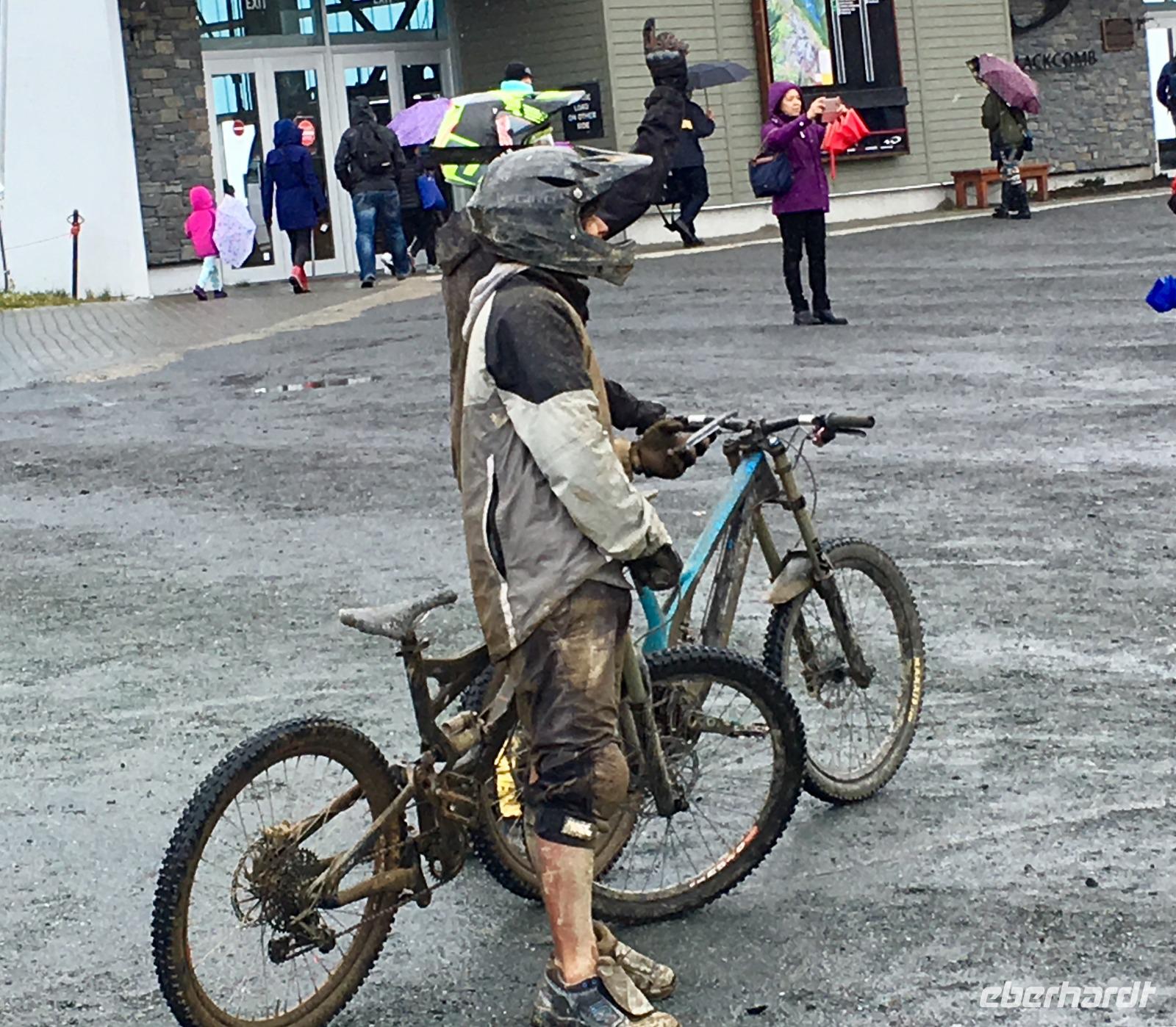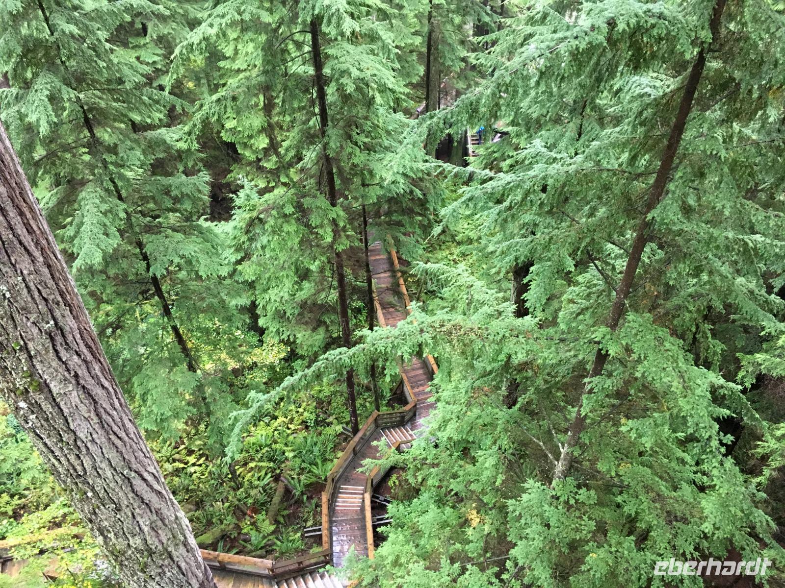 Guten Morgen in Whistler. Oh, es regnet ganz leicht also nehmen wir gleich schon mal den Shuttle Bus der uns ins Zentrum Whistlers faehrt. Mit Tageskarte in der Hand, an all den wilden Downhill Radfahrer vorbei, geht es mit der 6-er Gondeln auf Whistler Mountain. Da gibt es auch einen Zwischenhalt und wir wollen natuerlich gleich aussteigen, ahhh nein, Elisabeth hat doch gesagt, wir sollen sitzen bleiben bis wir ganz oben auf dem Berg sind. Bald sind wir oben, die Kanada- und die 2010 Olympia-Fahnen wehen im Schneegestoeber sodass wir gleich in das naechste Gebaeude fluechten. Dort wohnt die Peak 2 Peak Gondola. Diese schwebende Verbindung der zwei Berge hat die laengste Seilspanne der Welt und ist nicht nur ein Erlebnis sondern auch ein technisches Spitzenprodukt. Die ganze Gruppe passt in eine Gondel und bald schweben wir hoch ueber dem Fitzsimmons Tal. Auf Blackcomb Mountain angekommen regnet es wieder ganz leicht. Die Murmeltiere, wovon es hier so viele geben soll, sind alle versteckt. Trotz dem Nieselregen entschliessen wir uns eine kleine Wanderung zu unternehmen. Entlang des Berges gibt es einen schoenen Pfad ueber Stock und Stein. Den gehen wir fuer 1 Stunden und bloss die perfekten Bonsai-Tannen und Fichten begleiten uns. Der Pfad bringt uns wieder zurueck zur Gondel die uns wieder auf Whistler Mountain bringt. Dort machen wir erstmals Mittagspause ehe es einen Weg bergab geht, der uns zu einem Sessellift bringt. Peak Chair heisst er und wir sehen die Endstation kaum. Was fuer ein Erlebniss, hoch hinan bringt uns dieser Lift, vielleicht sogar ueber die Wolken. Unter uns sehen wir furchterregende Felsen und Gletscher. Anscheinend stuerzen sich hier die Skifahrer und Snowboarder im Winter hinunter, und die bezahlen dafuer sogar sehr viel Geld !! Oben angekommen, stuermt es wieder und wir stehen auf Schnee im Schnee. In der Ferne, 10 Meter entfernt....steht ein Inukshuk, der fuer die Olympiade 2010 aufgestellt wurde. Viele Photos spaeter haben wir alle ein Bild davon, von der Aussicht sehen wir leider gar nichts aber lustig ist es trotzdem. Eine furchterregende Haengebruecke wollen wir nun begehen. Ja, bei Schneegestoeber ist die gar nicht so furchterregend und jeder traut sich auf die andere Seite und wieder zurueck zu gehen. Nun gehts aber wieder zurueck, mit Sessellift, zu Fuss und mit der Gondel sind wir bald mal wieder in Whistler. Jetzt sind 2 Stunden Freizeit angesagt. Am spaeten Nachmittag in einem Irischen Pub faengt heute die Fete an, im Brauhaus geht sie lustig weiter bis wir nicht im Restaurant ein sehr amuesantes und leckeres Abendmahl geniessen. Wir lachen so viel, dass sogar einige Traenen fliessen und die Bauchmuskeln richtigen Muskelkater bekommen. Geschichten von dem Baeren, der 10 Meter neben einem von uns vorbeirannte und viele Anekdoten spaeter fallen wir todmuede in die Betten.
