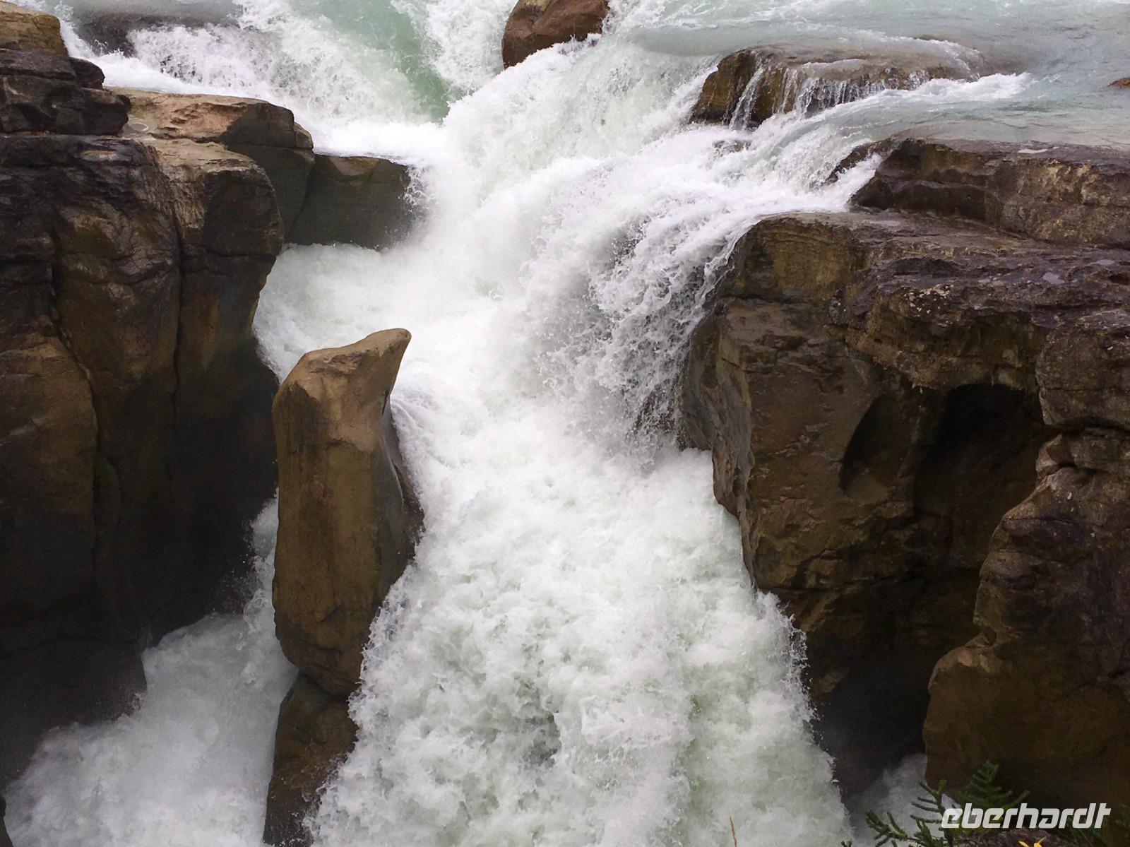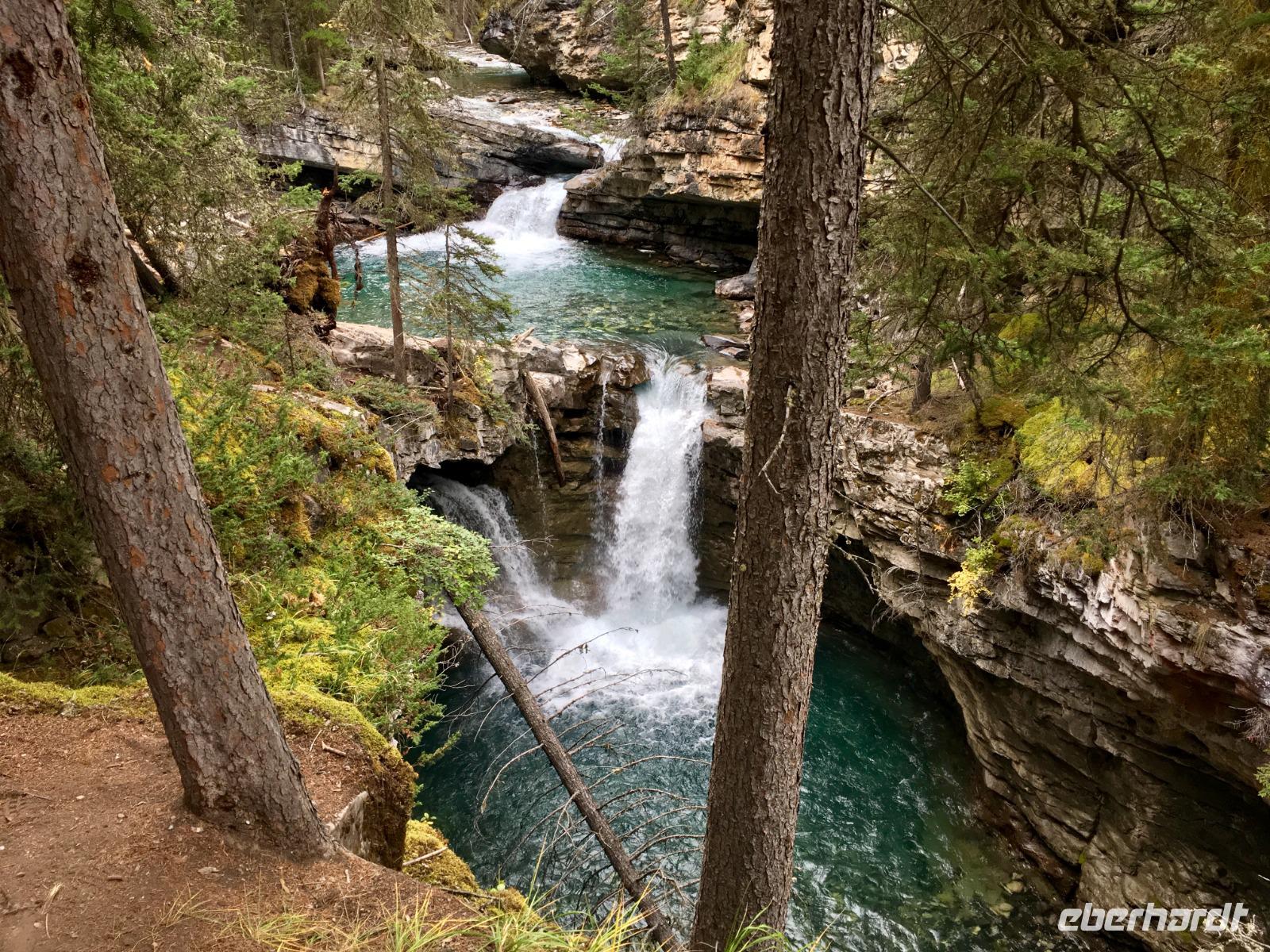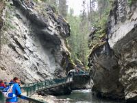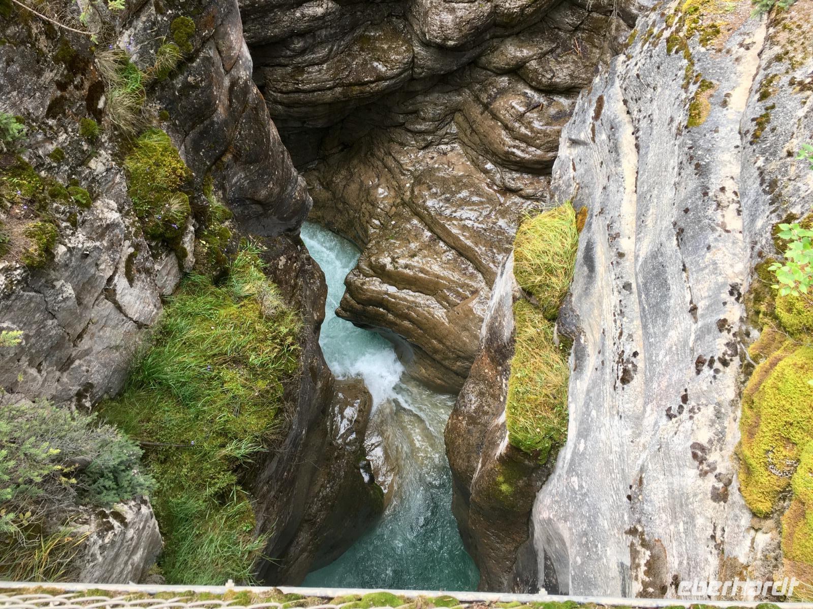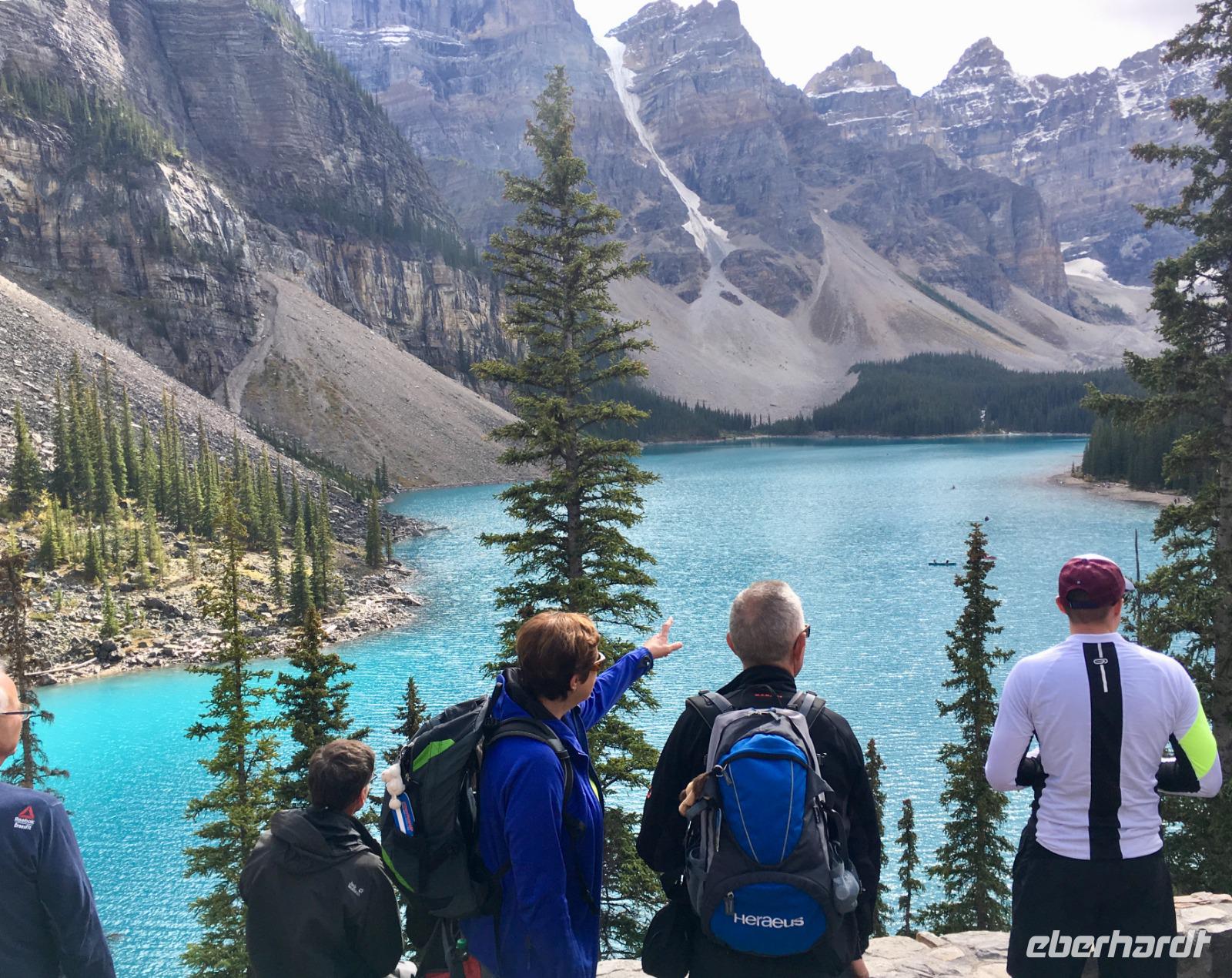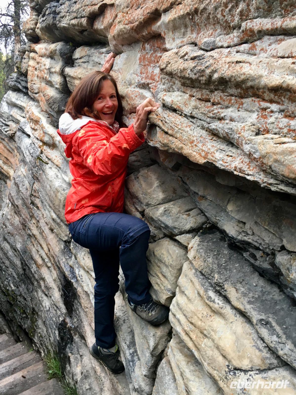 Ein herrlicher Tag bricht an. Im Sonnenschein und gut gelaunt geht es auf die Fahrt nach Lake Louise. Wir halten beim Lieblingsberg, Castle Mountain an, damit das obligate Bild «Schatzilein und ich in den Rockies» geknipst werden kann. Es ist Samstag also viel Verkehr auf der Hwy no 1 und noch mehr um Lake Louise herum. Ruhe gibt es bloss in dem maechtigen Luxushotel Chateau Lake Louise. Viele Fotos und Eindruecke spaeter gehts nun auf die Wanderung zum Teehaus bei Agnes Lake. Die Hearte dieser Wanderung erkennt man an den verschwitzten T-Shirts und den ausgetrunkenen Wasserflaschen. Es geht naemlich ganz schoen steil hinauf bis zu Mirror Lake, da machen wir Pause. Pikas, Chipmonks und Eichhoernchen schauen gespannt zu. Aber kein Muesli wird ausgepackt.....unsere T-Shirts trocknen wieder und die zweite Wasserflasche kommt nun zum Zuge. Erfolglos rennen die kleinen Waldbewohner weg, wenn es fuer uns wieder weiter geht. Es ist nicht mehr weit zu Agnes Lake bloss noch 20 Minuten, Treppen inklusive ! Es ist wahrlich eine wunderbare Wanderung mit einer gebuehrenden Belohnung fuer die Strapazen. Der schimmernde See inmitten hochragender Berge. Hier am Seeufer setzen wir uns auch und essen das Mitgebrachte. Vor dieser herrlichen Kulisse entscheiden wir, uns das Du-Wort anzubieten. Mit 20 neuen Namen im Kopf wandern wir munter runter zu unserem Bus. Wir fahren heute noch nach Lake Moraine weiter. Lake Moraine ist so beruehmt und atemberaubend, dass die alte 20 Dollar Note dieses Motiv aufgedruckt hatte. Einfach herrlich dieses tuerkisblau des Sees und das tiefblau des Himmels. Solche praechtigen Farben kann man kaum beschreiben. Sehen um zu glauben. Am Abend besuchen wir ein Steakhouse. Die Salatbar sowie der Prime Rib schmecken lecker und geben uns fuer morgen die noetige Energie. Denn Morgen gehts zur Schluchtwanderung.