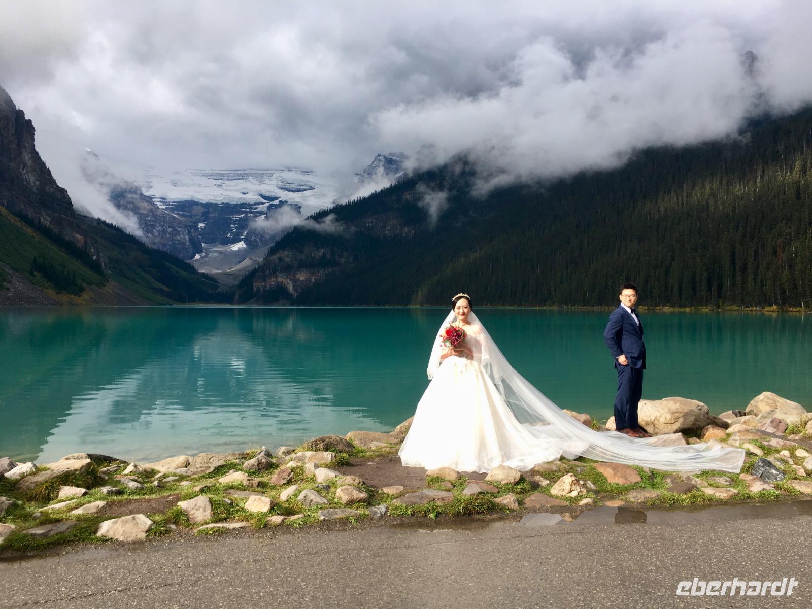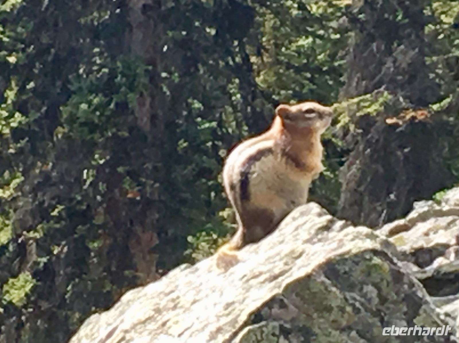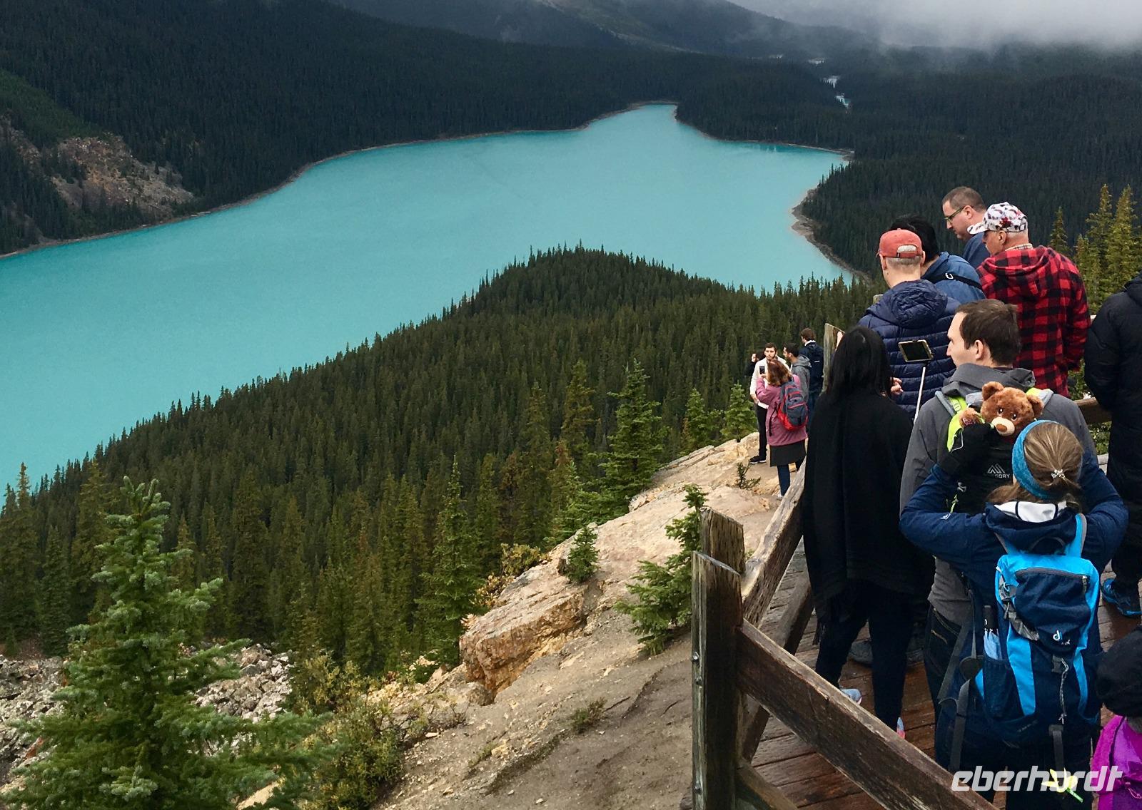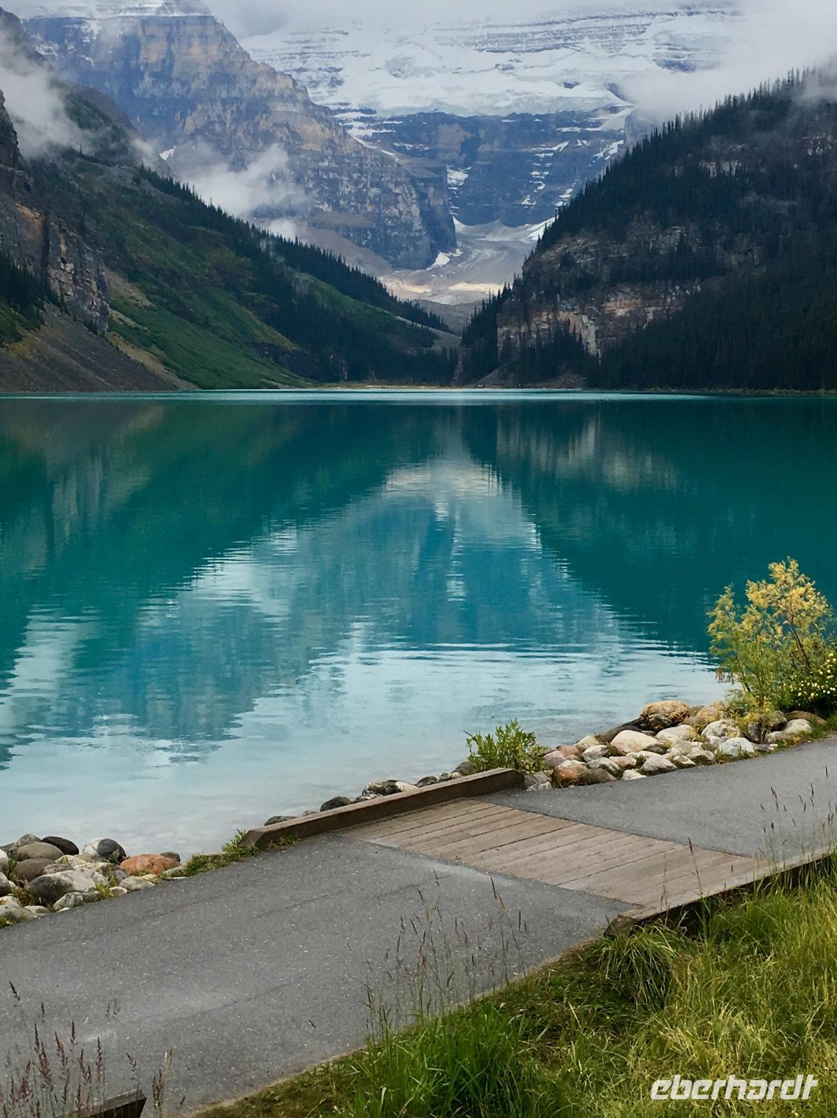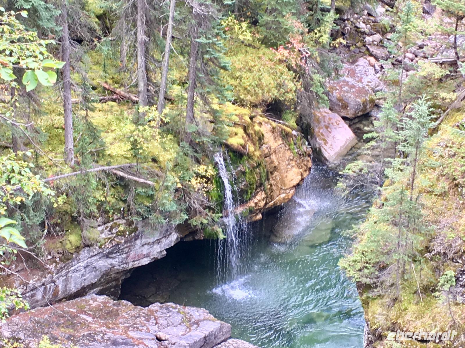 Ein herrlicher Tag bricht an. Im Sonnenschein und gut gelaunt geht es auf die Fahrt nach Lake Louise. Wir halten beim Lieblingsberg, Castle Mountain an, damit das obligate Bild «Schatzilein und ich in den Rockies» geknipst werden kann. Es ist Samstag also viel Verkehr auf der Hwy no 1 und noch mehr um Lake Louise herum. Ruhe gibt es bloss in dem maechtigen Luxushotel Chateau Lake Louise. Viele Fotos und Eindruecke spaeter gehts nun auf die Wanderung zum Teehaus bei Agnes Lake. Die Hearte dieser Wanderung erkennt man an den verschwitzten T-Shirts und den ausgetrunkenen Wasserflaschen. Es geht naemlich ganz schoen steil hinauf bis zu Mirror Lake, da machen wir Pause. Pikas, Chipmonks und Eichhoernchen schauen gespannt zu. Aber kein Muesli wird ausgepackt.....unsere T-Shirts trocknen wieder und die zweite Wasserflasche kommt nun zum Zuge. Erfolglos rennen die kleinen Waldbewohner weg, wenn es fuer uns wieder weiter geht. Es ist nicht mehr weit zu Agnes Lake bloss noch 20 Minuten, Treppen inklusive ! Es ist wahrlich eine wunderbare Wanderung mit einer gebuehrenden Belohnung fuer die Strapazen. Der schimmernde See inmitten hochragender Berge. Hier am Seeufer setzen wir uns auch und essen das Mitgebrachte. Vor dieser herrlichen Kulisse entscheiden wir, uns das Du-Wort anzubieten. Mit 20 neuen Namen im Kopf wandern wir munter runter zu unserem Bus. Wir fahren heute noch nach Lake Moraine weiter. Lake Moraine ist so beruehmt und atemberaubend, dass die alte 20 Dollar Note dieses Motiv aufgedruckt hatte. Einfach herrlich dieses tuerkisblau des Sees und das tiefblau des Himmels. Solche praechtigen Farben kann man kaum beschreiben. Sehen um zu glauben. Am Abend besuchen wir ein Steakhouse. Die Salatbar sowie der Prime Rib schmecken lecker und geben uns fuer morgen die noetige Energie. Denn Morgen gehts zur Schluchtwanderung.
