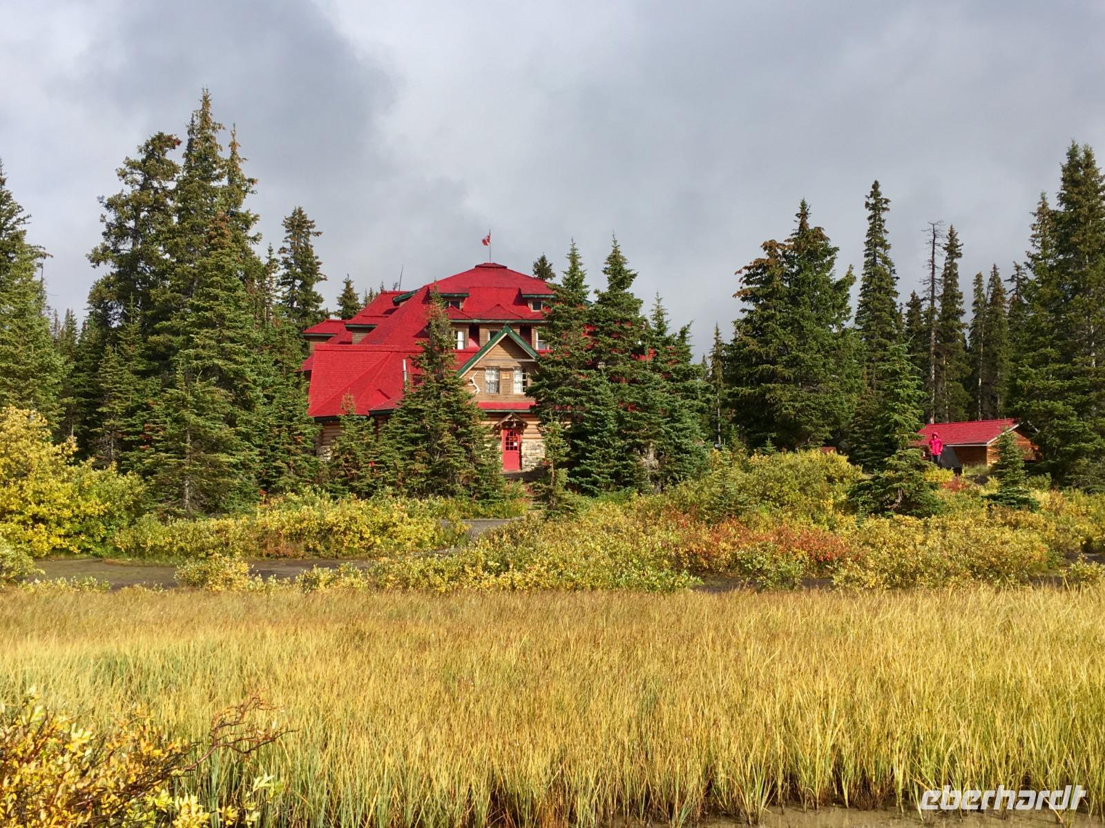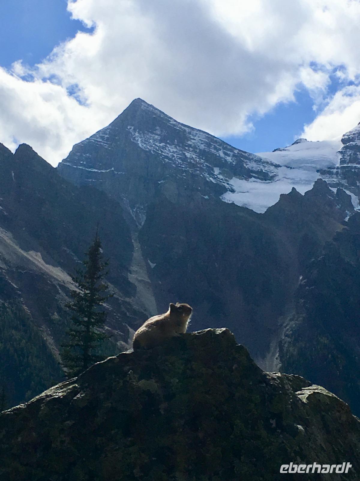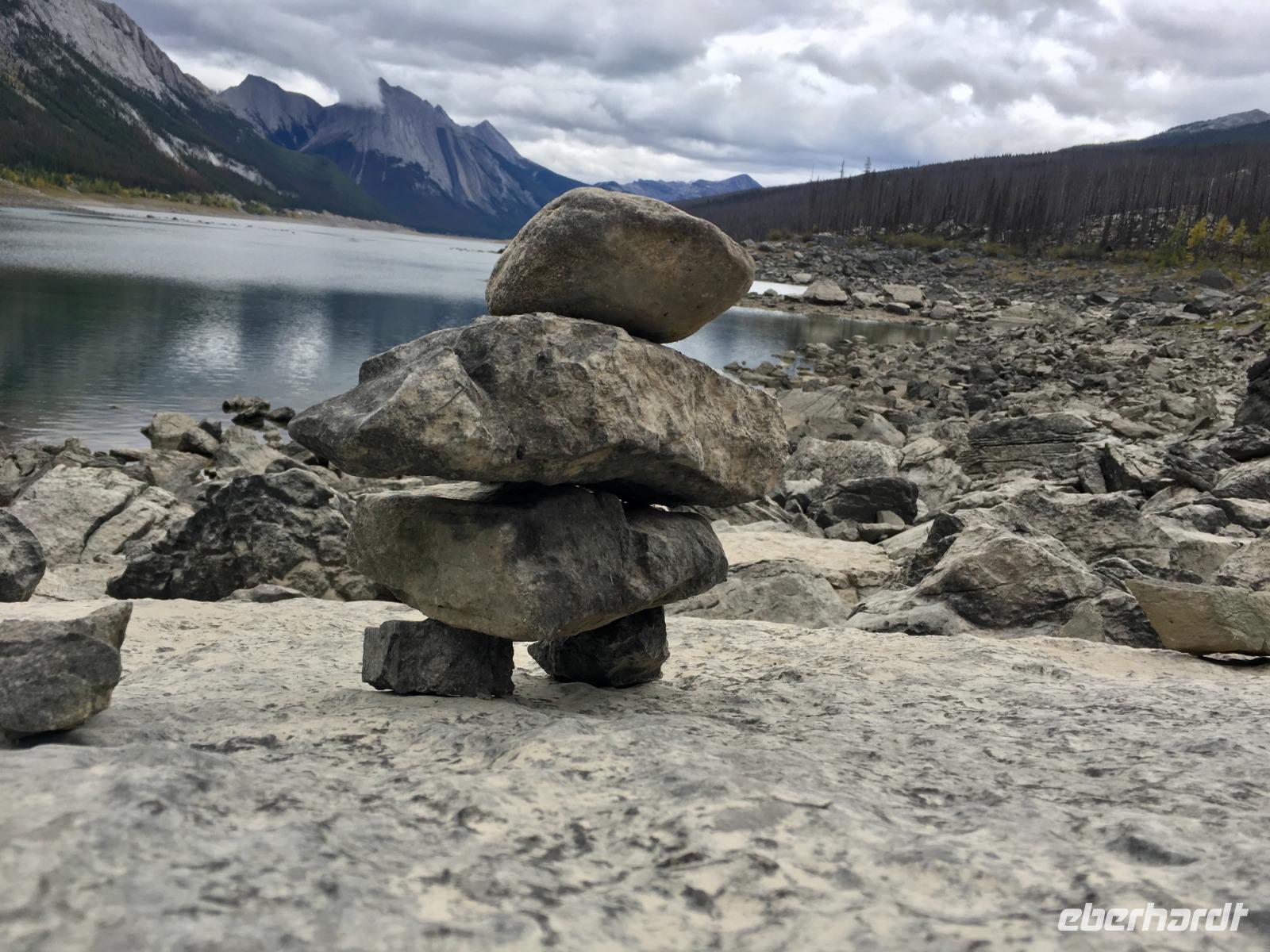 Ein Baer, ein Baer... oder was klopft an die Tuer meines Waldhaeuschens ? hi hi, es ist der Nachtportier in seinem Weckdienst Kostuem. Beim tollen Fruehstueck werden wir munter und begeben uns gleich nach Jasper. Dort gibt es einen ein-stuendigen Aufenthalt um sich dieses schmucke Bergdort anzuschauen und in den Geschaeften herumzustoebern. Danach gehts weiter in das Maligne Tal. Das Wetter ist perfekt. Ein paar Woelkchen zieren den Himmel und sorgen fuer beste Perspektieve. Bald halten wir, denn nun gehts auf eine schoene und interessante Wanderung entlang dieses malerischen Flusses. Vor dem «Weisser Ton» - Wasserfall bleiben wir auch stehen und geniessen diesen Urton und die Perfektion dieses kleinen Wasserfalles. Sowas wollten wir auch in unseren Gaerten zu Hause ! In dieser Maligne Schlucht sehen wir viele Wasserfaelle, wir reden ueber die hier heimischen Fische, Flora und Fauna. Immer wieder staunen wir ueber die Kraft des Wassers und wie Wasser durch unterirdische Fluesse in und aus dem Maligne Fluss zu- und abfliesst. Auf der Weiterfahrt zum Maligne See halten wir bei Medicine Lake auch er hat unterirdische Fluesse und ploetzlich sehen wir in der Ferne ein Moose wie es ueber den See schwimmt. Nun nuetzen wir die Zeit den Inukshuk 101 Kurs abzuschliessen, sodass dies eine Studienreise wird und wir die Auslagen von der Steuer absetzen koennen ?. Jeden Tag lernen wir etwas neues. Das Mittagessen anschliessend, bei Maligne See ist fein und wir haben gemuetlich Zeit bis wir zum Steg gehen koennen fuer unsere Bootsfahrt. Die Bootsfahrt ist toll, das Wetter hat sich nochmehr verbessert und wir freuen uns ungemein, dass diese Bootstour auch stattfinden kann. Spirit Island ist das heutige Fotomotiv und manch einer knipst sicher auch ein Kodak-Foto. Beim Rueckweg nach Jasper stehen auf einmal viele Autos auf der Strasse und blockieren den Weg. Zwei Elch-Jungtiere spazieren gemaechlich dem Strassenrand entlang. Von Mami keine Spur so bewegen sie sich etwas tolpatschig einer auf der einen Strassenseite und der andere auf der anderen. Sie versuchen alle Straeucher abzuknabbern was ihnen nicht immer gelingt. Ab und zu schauen auch beide auf und versichern sich, dass alle 30 Autos noch dastehen mit den lustigen Tieren drinnen die alle kleine Knipsschachtel um den Hals haengen haben. Auch wir schauen und staunen. Wieder zurueck in unserer Lodge, erleben wir ein herrliches BBQ Essen und danach unterhaelt uns Heidi mit ihrem Vortrag ueber Baeren, Wapiti, Krummhornschafe, Waldbestand und sonstigem. Sie ist sehr amuesant wir lachen viel und gehen auch schmunzelnd in unsere Zimmer. Wird der Baer uns morgen frueh wieder wecken, oder doch der Fuchs ?