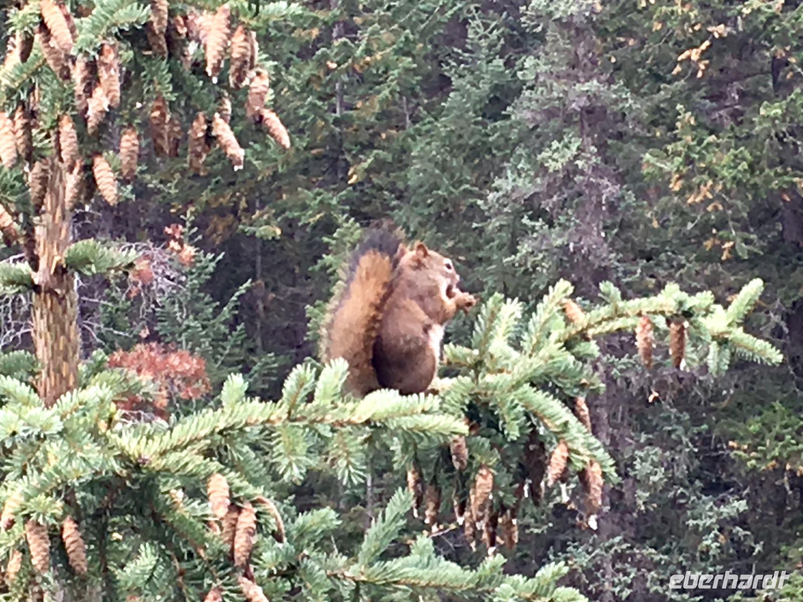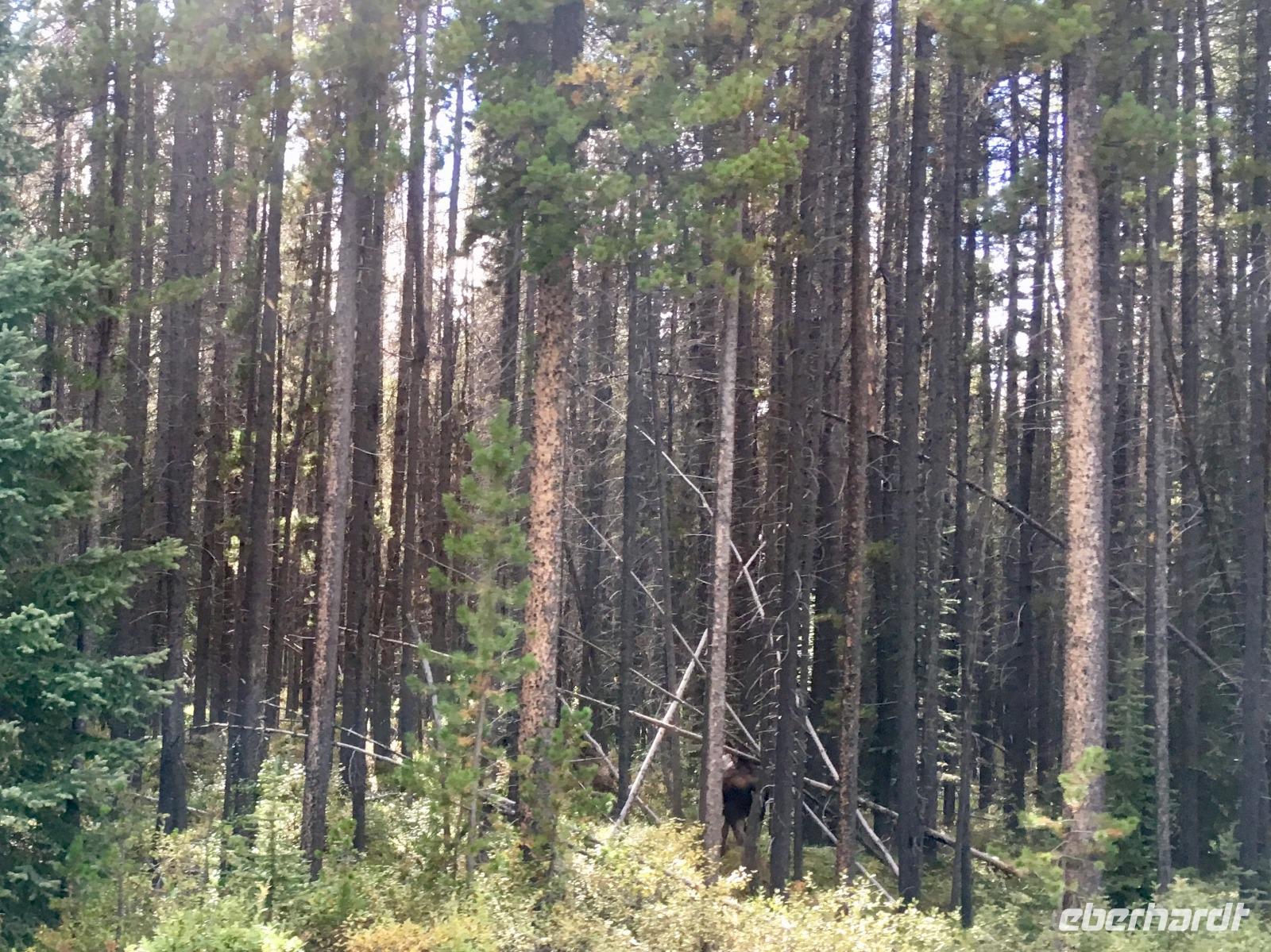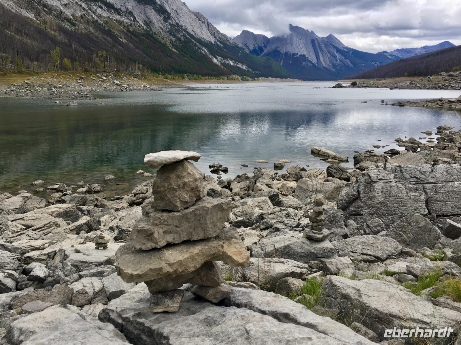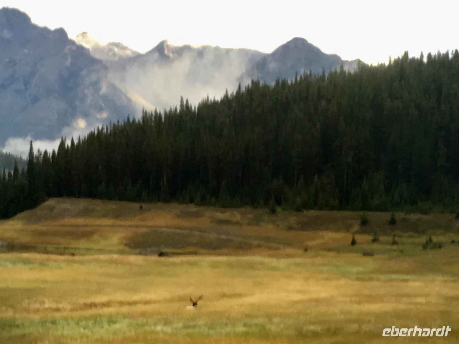 Ein Baer, ein Baer... oder was klopft an die Tuer meines Waldhaeuschens ? hi hi, es ist der Nachtportier in seinem Weckdienst Kostuem. Beim tollen Fruehstueck werden wir munter und begeben uns gleich nach Jasper. Dort gibt es einen ein-stuendigen Aufenthalt um sich dieses schmucke Bergdort anzuschauen und in den Geschaeften herumzustoebern. Danach gehts weiter in das Maligne Tal. Das Wetter ist perfekt. Ein paar Woelkchen zieren den Himmel und sorgen fuer beste Perspektieve. Bald halten wir, denn nun gehts auf eine schoene und interessante Wanderung entlang dieses malerischen Flusses. Vor dem «Weisser Ton» - Wasserfall bleiben wir auch stehen und geniessen diesen Urton und die Perfektion dieses kleinen Wasserfalles. Sowas wollten wir auch in unseren Gaerten zu Hause ! In dieser Maligne Schlucht sehen wir viele Wasserfaelle, wir reden ueber die hier heimischen Fische, Flora und Fauna. Immer wieder staunen wir ueber die Kraft des Wassers und wie Wasser durch unterirdische Fluesse in und aus dem Maligne Fluss zu- und abfliesst. Auf der Weiterfahrt zum Maligne See halten wir bei Medicine Lake auch er hat unterirdische Fluesse und ploetzlich sehen wir in der Ferne ein Moose wie es ueber den See schwimmt. Nun nuetzen wir die Zeit den Inukshuk 101 Kurs abzuschliessen, sodass dies eine Studienreise wird und wir die Auslagen von der Steuer absetzen koennen ?. Jeden Tag lernen wir etwas neues. Das Mittagessen anschliessend, bei Maligne See ist fein und wir haben gemuetlich Zeit bis wir zum Steg gehen koennen fuer unsere Bootsfahrt. Die Bootsfahrt ist toll, das Wetter hat sich nochmehr verbessert und wir freuen uns ungemein, dass diese Bootstour auch stattfinden kann. Spirit Island ist das heutige Fotomotiv und manch einer knipst sicher auch ein Kodak-Foto. Beim Rueckweg nach Jasper stehen auf einmal viele Autos auf der Strasse und blockieren den Weg. Zwei Elch-Jungtiere spazieren gemaechlich dem Strassenrand entlang. Von Mami keine Spur so bewegen sie sich etwas tolpatschig einer auf der einen Strassenseite und der andere auf der anderen. Sie versuchen alle Straeucher abzuknabbern was ihnen nicht immer gelingt. Ab und zu schauen auch beide auf und versichern sich, dass alle 30 Autos noch dastehen mit den lustigen Tieren drinnen die alle kleine Knipsschachtel um den Hals haengen haben. Auch wir schauen und staunen. Wieder zurueck in unserer Lodge, erleben wir ein herrliches BBQ Essen und danach unterhaelt uns Heidi mit ihrem Vortrag ueber Baeren, Wapiti, Krummhornschafe, Waldbestand und sonstigem. Sie ist sehr amuesant wir lachen viel und gehen auch schmunzelnd in unsere Zimmer. Wird der Baer uns morgen frueh wieder wecken, oder doch der Fuchs ?