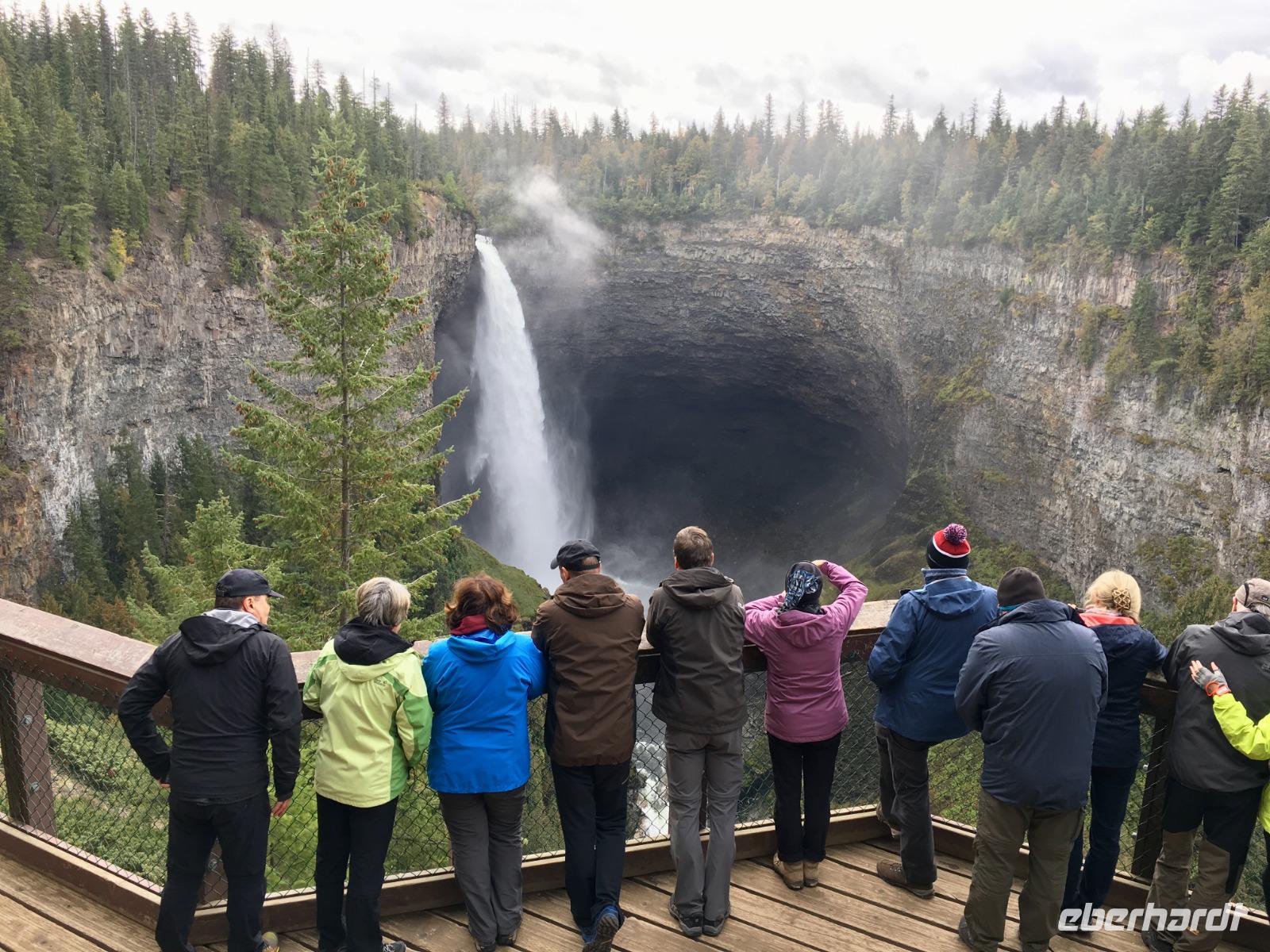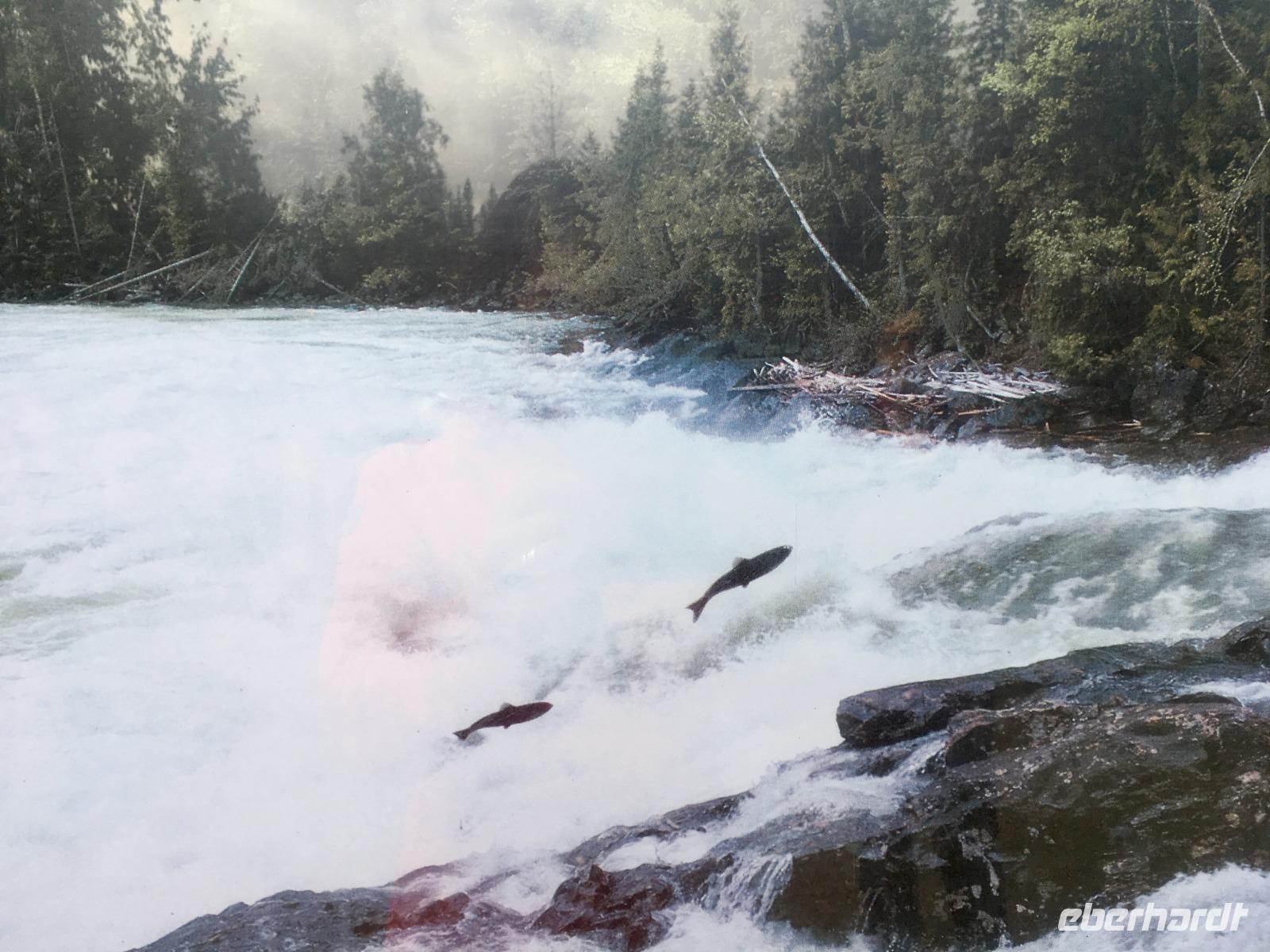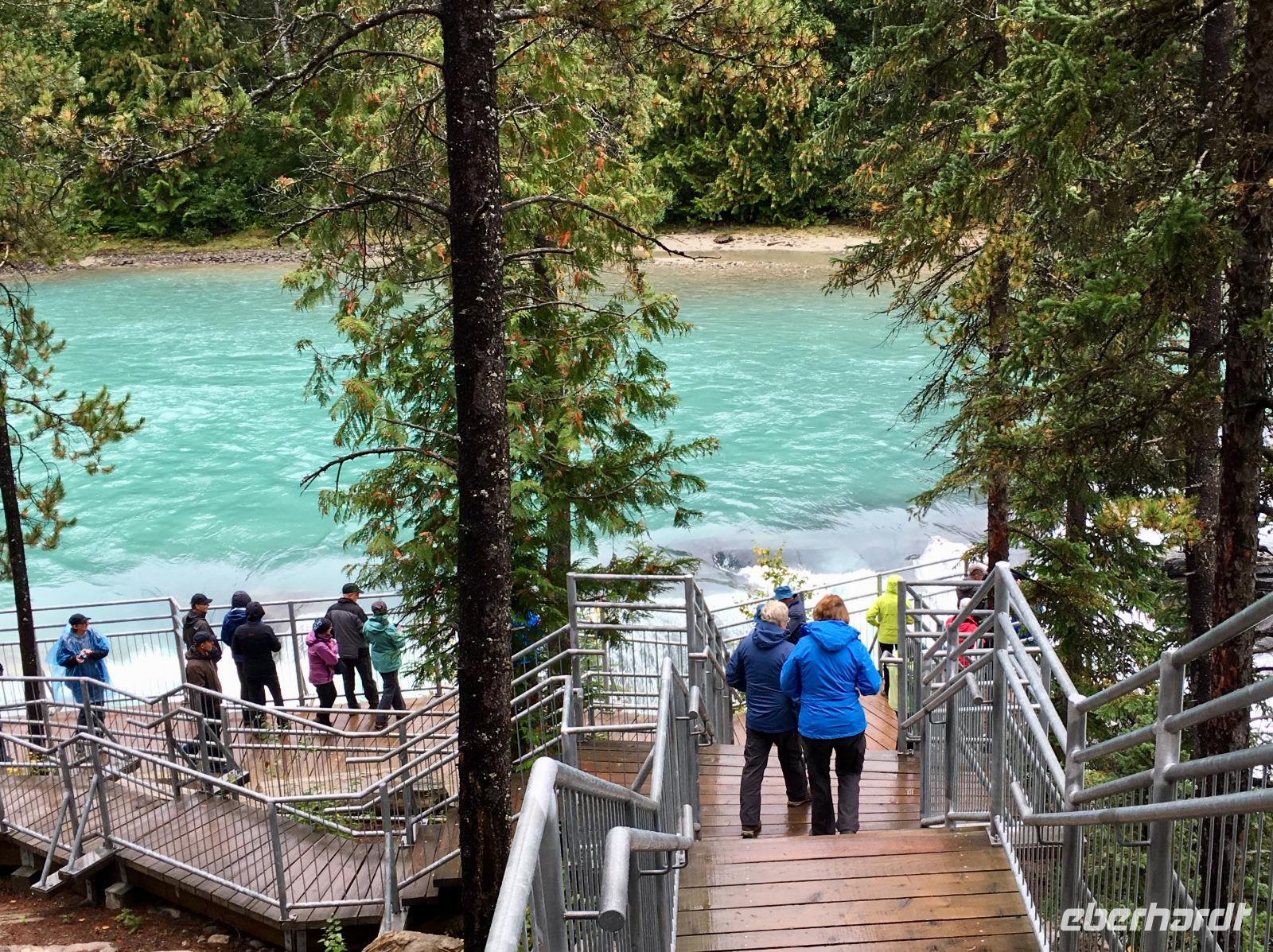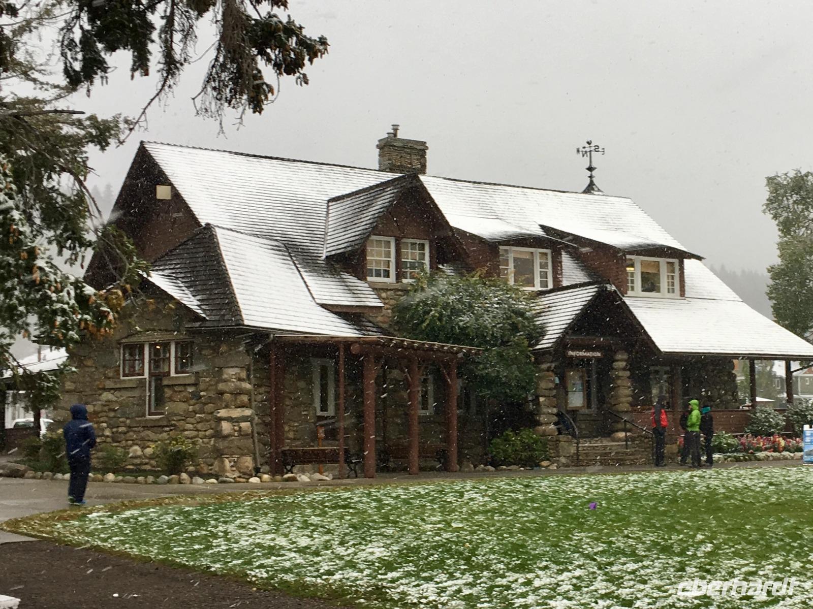 Nach dem Klopfen an meiner Tuere strecke ich auch gleich meinen Kopf erwartungsvoll zum Fenster hinaus und meine Nase wird nicht nass, also regnet es nicht und schneien schon gar nicht wie vom app vorhergesagt. Das ist ein gutes app, es wird immer schoener als geplant. Schnell alle Fenster wieder zu, denn es ist draussen doch sehr kalt. Mein Waldhaeuschen ist jedoch angenhem warm. Nun heisst es wieder alle 7 Sachen zusammenpacken und Alex verstaut alles wieder im Bus. Als erstes schauen wir uns die Athabascafaelle zwischen den vielen Touristen an. Manchmal sieht man mehr auf dem Display der anderen als in Natura. Das ist ein sehr beliebter Ort, da er auch spektakulaer ist. Wir wandern auch ganz hinunter in den Canyon wo die Masse nicht hingeht. Bald fahren wir weiter und machen noch einen Halt in Jasper da es nun schneit und wir dies auch bildlich festhalten moechten. Nun ist es aber wirklich Zeit diese schoene Gegen zu verlassen, denn Britisch Kolumbien erwartet uns schon. Ueber der grossen Wasserscheide treffen wir auf den Fraser Fluss der erste Fluss der in den Pazifischen Ozean fliesst. Wir wandern auch eine Stunde diesem Fluss entlang, durch dichtgruenes Dickicht mit schoenen Aussichten auf den reissenden Fluss und die Berge. Waermer ist die Luft hier, auch feuchter, aber es schneit nicht mehr sondern nieselt nur ganz leicht. Es ist auch frueher am Vormittag, da wir eine Stunde gewonnen haben, wir gluecklichen. Nach einem angenehmen Mittagessen schuettet es nun wie aus Kuebel gegossen. Von Mount Robson sehen wir nur Umrisse und machen Photos der Plakate dieses Berges. Die laengere Wanderung lassen wir ausfallen und besuchen dafuer den letzten Wasserfall, den die Lachse hier bewaeltigen muessen ehe sie laichen und verwesen. Auf der Fahrt nach Clearwater sprechen wir ueber die Lachse, Imigration, die Steuern, Mieten, Gesundheitswesen, Schulsystem, und vieles anderes. Das bringt uns nach Avola, wo wir in ein urchiges Pub verschwinden. Larry, der Pub Inhaber ist ein Harly Fan und sein Pub ist legendaer in der Gegend. Nun sind es bloss noch ¾ Stunde zu unserem Hotel in Clearwater. Ahh, das Abendessen bei Kale, so fein, so koestlich. Dieser Tag der mit Regen durchzogen war, endet nun doch in strahlendem Sonnen-und Mondschein.