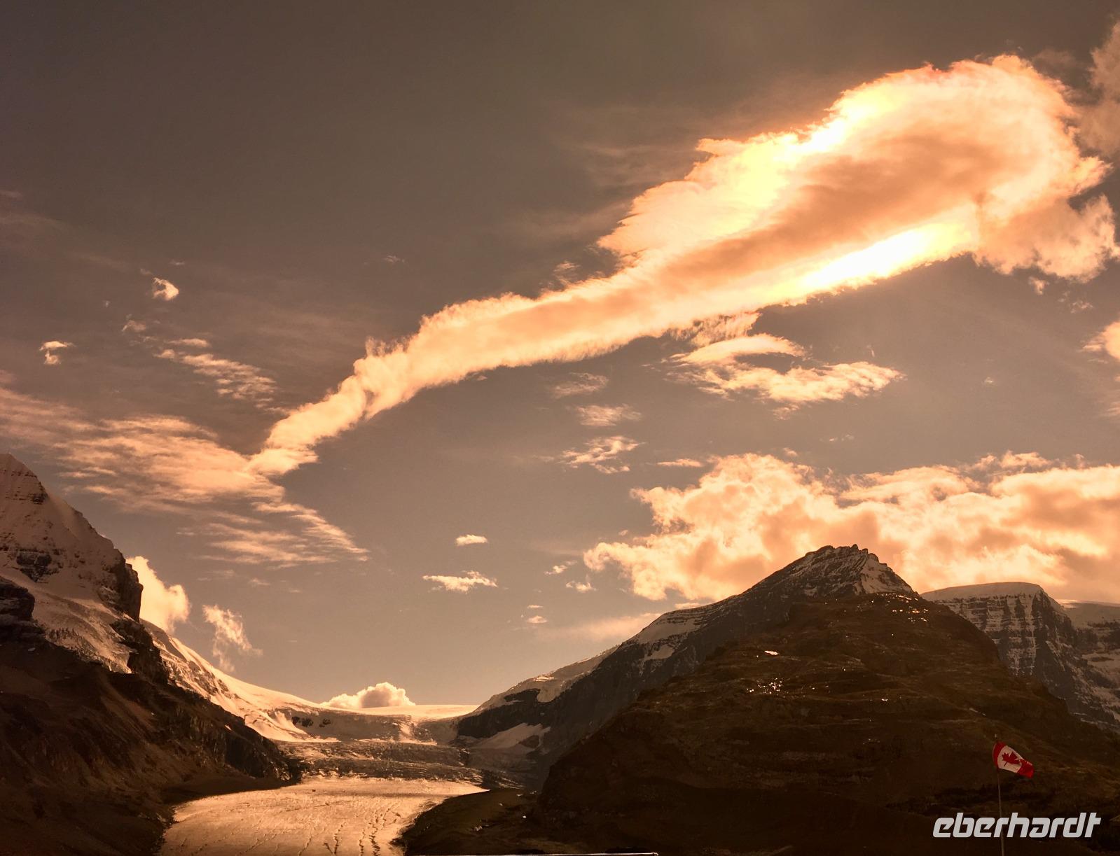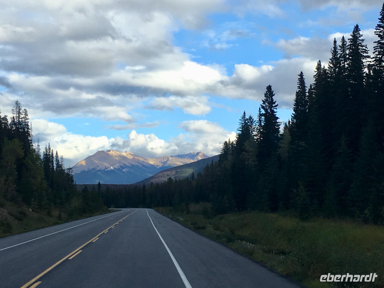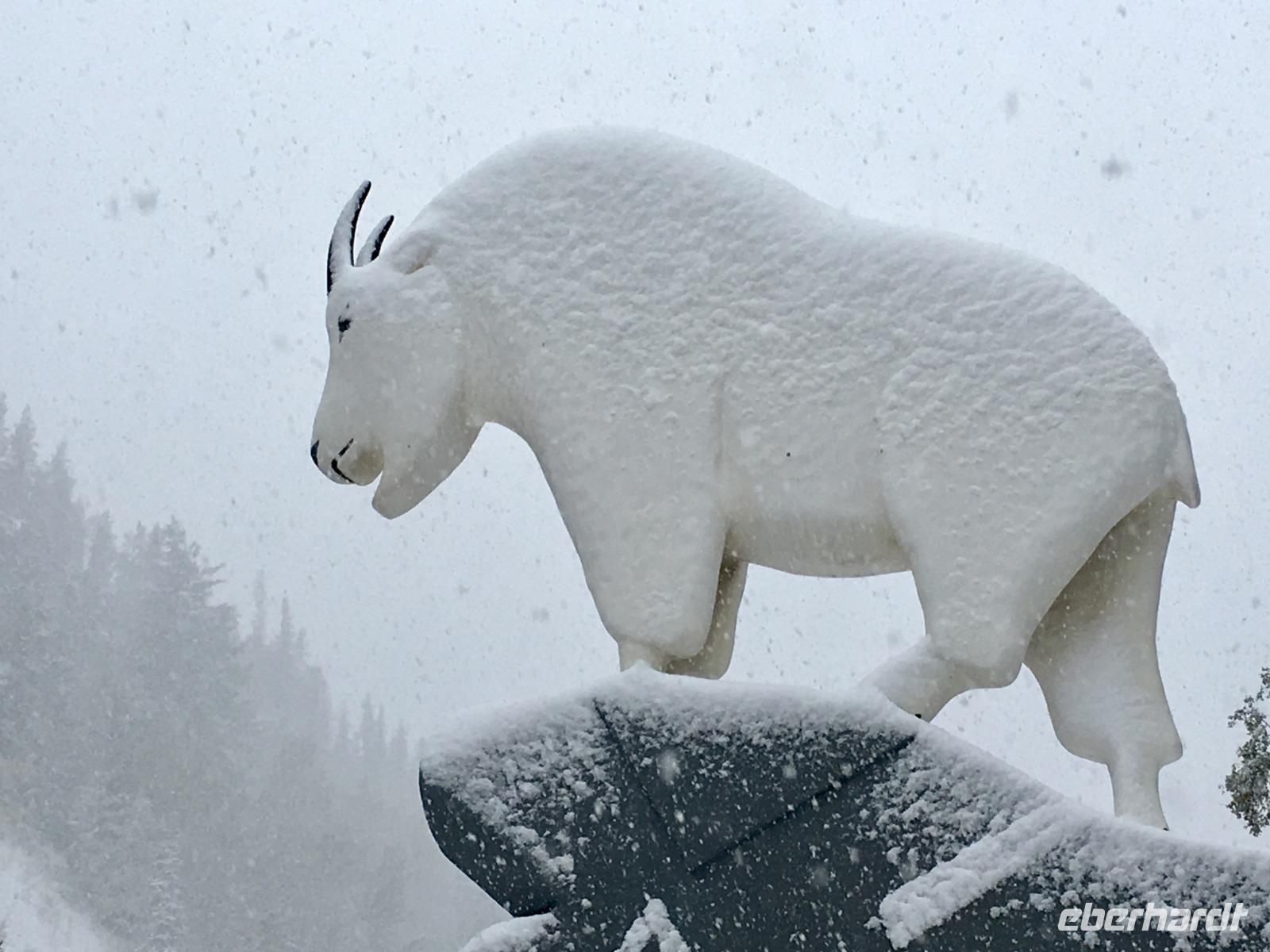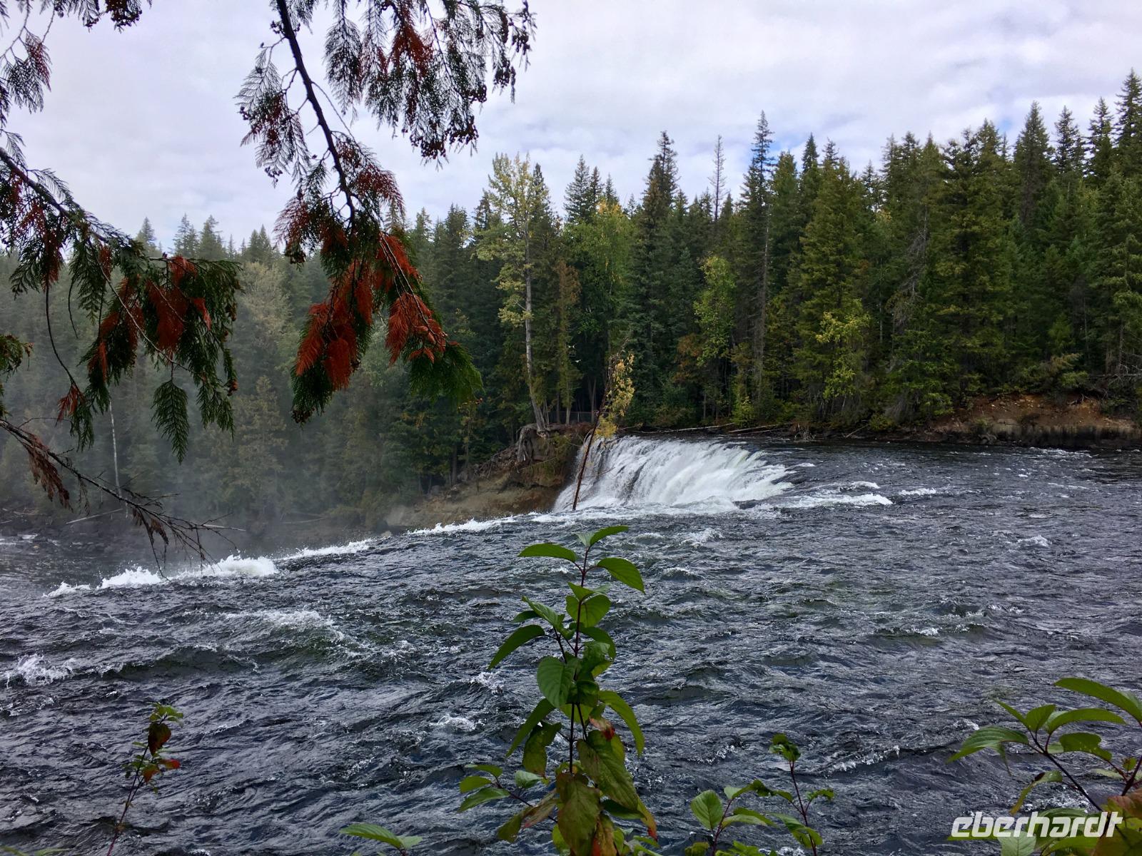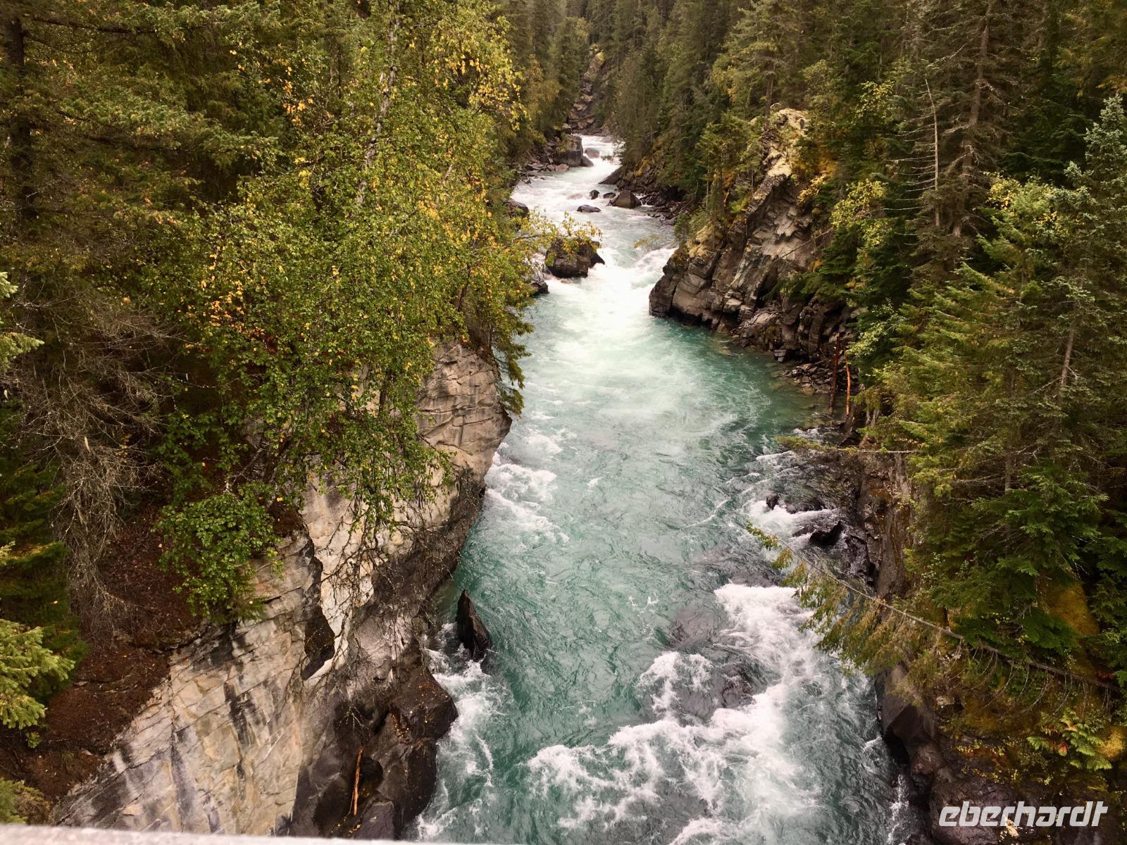 Nach dem Klopfen an meiner Tuere strecke ich auch gleich meinen Kopf erwartungsvoll zum Fenster hinaus und meine Nase wird nicht nass, also regnet es nicht und schneien schon gar nicht wie vom app vorhergesagt. Das ist ein gutes app, es wird immer schoener als geplant. Schnell alle Fenster wieder zu, denn es ist draussen doch sehr kalt. Mein Waldhaeuschen ist jedoch angenhem warm. Nun heisst es wieder alle 7 Sachen zusammenpacken und Alex verstaut alles wieder im Bus. Als erstes schauen wir uns die Athabascafaelle zwischen den vielen Touristen an. Manchmal sieht man mehr auf dem Display der anderen als in Natura. Das ist ein sehr beliebter Ort, da er auch spektakulaer ist. Wir wandern auch ganz hinunter in den Canyon wo die Masse nicht hingeht. Bald fahren wir weiter und machen noch einen Halt in Jasper da es nun schneit und wir dies auch bildlich festhalten moechten. Nun ist es aber wirklich Zeit diese schoene Gegen zu verlassen, denn Britisch Kolumbien erwartet uns schon. Ueber der grossen Wasserscheide treffen wir auf den Fraser Fluss der erste Fluss der in den Pazifischen Ozean fliesst. Wir wandern auch eine Stunde diesem Fluss entlang, durch dichtgruenes Dickicht mit schoenen Aussichten auf den reissenden Fluss und die Berge. Waermer ist die Luft hier, auch feuchter, aber es schneit nicht mehr sondern nieselt nur ganz leicht. Es ist auch frueher am Vormittag, da wir eine Stunde gewonnen haben, wir gluecklichen. Nach einem angenehmen Mittagessen schuettet es nun wie aus Kuebel gegossen. Von Mount Robson sehen wir nur Umrisse und machen Photos der Plakate dieses Berges. Die laengere Wanderung lassen wir ausfallen und besuchen dafuer den letzten Wasserfall, den die Lachse hier bewaeltigen muessen ehe sie laichen und verwesen. Auf der Fahrt nach Clearwater sprechen wir ueber die Lachse, Imigration, die Steuern, Mieten, Gesundheitswesen, Schulsystem, und vieles anderes. Das bringt uns nach Avola, wo wir in ein urchiges Pub verschwinden. Larry, der Pub Inhaber ist ein Harly Fan und sein Pub ist legendaer in der Gegend. Nun sind es bloss noch ¾ Stunde zu unserem Hotel in Clearwater. Ahh, das Abendessen bei Kale, so fein, so koestlich. Dieser Tag der mit Regen durchzogen war, endet nun doch in strahlendem Sonnen-und Mondschein.