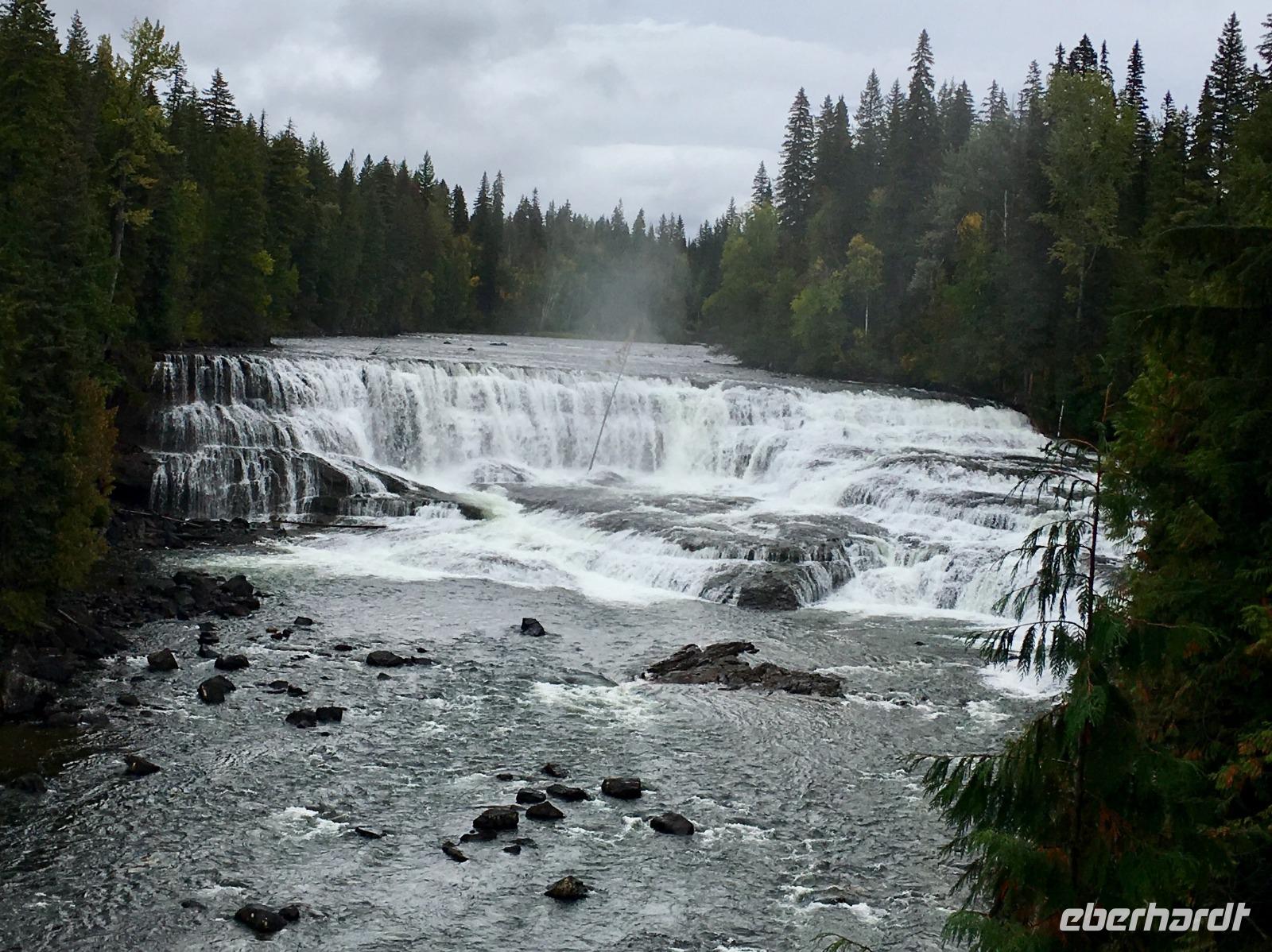 Ruhig und gut haben wir hier geschlafen und beim oeffenen der Balkontuere sehen wir eine Wolkendecke die den Himmel einhuellt. Nach dem wahrlich koeniglichen Fruehstueckbuffet welches nur fuer uns bereitet wurde, starten wir den Tag mit den Spahat Faellen. Diese 18 Meter hohen Wasserfaelle sind eines von drei ganz besonders schoenen Wasserfaellen hier in diesem Park. In Grey Wells Park gibt es frund 300 Wasserfaelle und in den ersten 20 km auch Farmen und eine davon gehoert Daniel und Elvira. Mike, der wilde Oesterreicher, stellt uns nun die beiden Paddelmeister Danny und Kevin vor und bald sind wir schon unterwegs zu diesem Abenteuer. Das Wetter ist auf dem Weg der Besserung was uns natuerlich sehr freut. Die Dawson Faelle, welche wir als erste besichtigen sind aehnlich den Niagara Faellen bloss nicht so hoch und weit, jedoch ohne Hochhaeuser dahinter. Nach einem Spaziergang durch den Wald und einer Weiterfahrt kommen wir bei den Baileys Chutes vorbei. Kaum da, sehen wir auch schon einen Lachs wie er diese Faelle bewaeltigt. Wir stehen und starren noch 10 Minuten auf das viele Wasser und fahren danach weiter zu den Helmecken Faellen da die anderen Lachse wohl nicht springen wollen. Diese Faelle sind die 3. hoechsten Kanadas und einfach spektakulaer. Das Wasser stuerzt in ein steiles Lavatal und graebt sich immer weiter hinein. Der Himmel ist unterdessen schon fast leergefegt von den Wolken und strahlt in seinem schoenen blau. Gegen Mittag sind wir beim See und unser BBQ Hotdog Picknick ist bereits fuer uns vorbereitet. Danny der Franzose hat es hergerichtet. Gleich danach faengt unser heutiges Highlight an. Wir werden von Kevin dem einstmaligen Rodeosieger eingewiesen wie man so ein Kanu fuehrt, wer vorne und wer hinten sitzt, wer Richtung und wer Tempo angibt und wie man geradeaus faehrt. Wir lernen auch Kurven fahren, was wir jedoch bloss einigermassen verstehen. Denn im zig zag Muster paddeln wir froehlich nicht allzuweit bis zu einem schoenen Strand. Einige unter uns fahren erst einige Runden im Kreis bis auch sie das zig zag Muster meistern ? Die Sonne lacht und der Wind hat uns geholfen hierher zu paddeln. Nun gibt es Smores. Ein Feuer wird gemacht, Marshmellows werden aufgespiesst und gebraten ehe sie auf einem Bisquit landen. Noch ein Stueck mitgebrachte schweizer Schokolade und ein Kekschen obendrauf und schon ist ein Smores bereit. MMMMMh. Gestaerkt paddeln wir wieder fleissig auf dem grossen See Richtung Steg so etwa 1 Stunde. Keine Wellen, keine Motore nur unsere Glueckseeligkeit im Sonnenschein auf diesem abgelegenen glizernden See. Das ist Urlaub. Der Abschluss dieses Tages gestaltet sich auch sehr angenehm denn auf der Ranch wird fuer uns ein herrliches BBQ vorbereitet und an der Theke gibts ein gutes Bierchen dazu. Besonders lustig ist das neu-eingestellte Servierpersonal vom Yukon, welche unseren Nachtisch servieren, sie sind beide sehr huebsch und SEHR amuesant. Jedenfalls lachen wir alle viel und laut ! Es war ein herrlicher Tag, mit bloss 5.5 Km Wanderung jedoch, so scheint uns, mindestens 20 Km im Kanu paddelnd !! Sagen die Oberarme !!