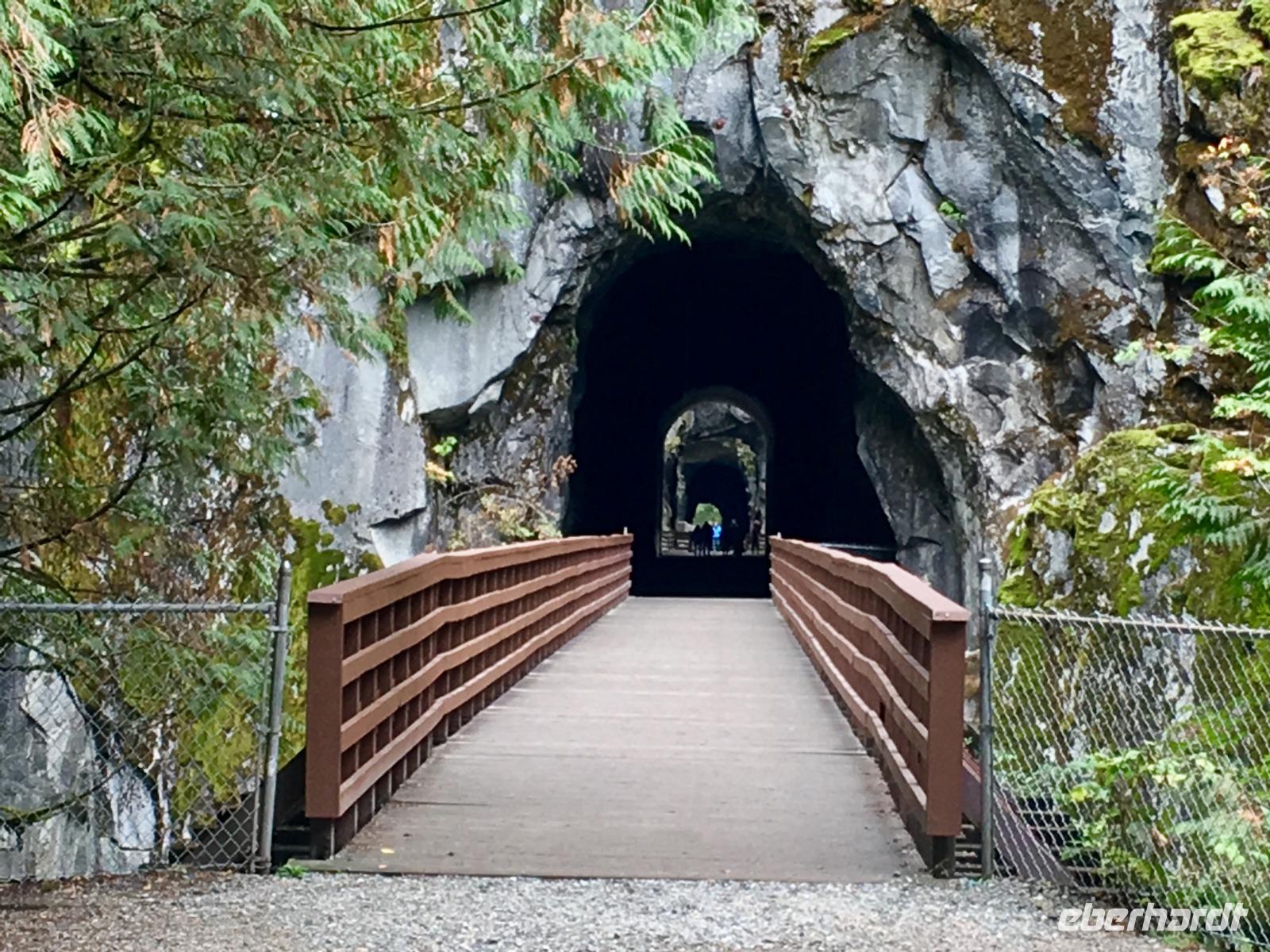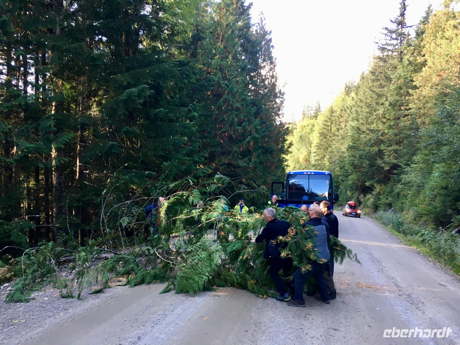Es ist offiziell. Die Strasse die wir heute fahren wollen ist bis auf weiteres verschuettet durch eine Mure. Die Umfahrung ist leider schon seit 3 Jahren nicht mehr mit dem Bus befahrbar und so nehmen wir die Kamloops-Merrit-Hope-Vancouver-Whistler Route. Das Fruehstueck war wieder sehr fein und beim Einsteigen sehen wir auch, wie grosse Kartone mit Picknick Sachen in des Busses Bauch geladen werden. In Kamloops machen wir einen technischen Halt am Thompson River und bekommen deshalb auch gleich eine kurze Stadtbesichtigung. Nun gehts aber weiter auf die HWY no 5 in den Sueden. Die huegelige Landschaft ist sehr bewaldet und gehoert zu riesen grossen Farmen. Der glitzernde Thompson River begleitet uns eine Weile und wird bei Merrit vom Coldwater River abgeloest. Die Landschaft wird schroffer mit noch mehr Wald und hoeheren Bergen. Wir sind auf der Nordseite der Kuestenberge die ja auch Cordillera genannt werden. Nun fuehrt uns die Route auf den Coquihalla Highway. Die Passtrasse bringt uns zu Mittag in die Naehe von Hope wo auch unser naechster Stopp ist. Bei den Othello Tunnels halten wir und nun werden die Kartons aus des Busses Bauch befreit. Mmmh ein herrliches Picknick kommt zum Vorschein mit feinen Salate, Sandwich, frischer Apfeltasche und Obst. Dazu passen die 2 verschiedenen Rotweine die uns Eberhardt schenkt besonders gut. Danke schoen. Die Tunnels und Bruecken die wir nun besuchen sind auch sehr interessant da sie zur Bahnlinie der damaligen Kettel Valley Railway gehoeren. Im 1913-16 gebaut, wurde sie im Jahre 1960 wieder stillgelegt und bald vergessen. Am Nachmittag muessen wir aber wieder weiter, denn wir haben noch 3 Stunden Fahrt vor uns. Vorerst durch das Fraser Tal welches mit seinen Blaubeeren, Mais und Cranberry Farmen sich hervorhebt und dann an Vancouver vorbei und auf die Hwy 99. Nun gehts nur noch 1 Stunde bis Whistler. Ja, heute werden rund 700 Kilometer zurueckgelegt, aber wir sehen und erfahren auch unendlich viel. Insgeheim, wuenschten wir uns jedoch, dass Kanada etwas schrumpfen moege. Im Hotel in Whistler angekommen beziehen wir gleich unsere Zimmer. Einige ruhen sich nun mal aus, andere fahren gleich ins Dorf hinunter und schauen sich um. So viele Geschaefte in der Fuzo, so viele Fahrradfahrer mit ihren Mountain Bikes und so viele junge Leute es ist ein bewegtes Bergdorf, ein echter Spielplatz fuer Erwachsene. Jeder findet auch «sein» Restaurant und so ist auch dieses Abenteur auch gelungen.
