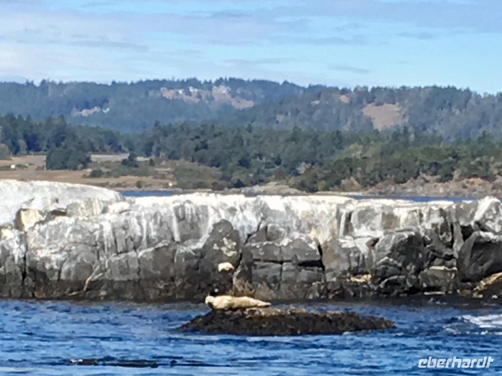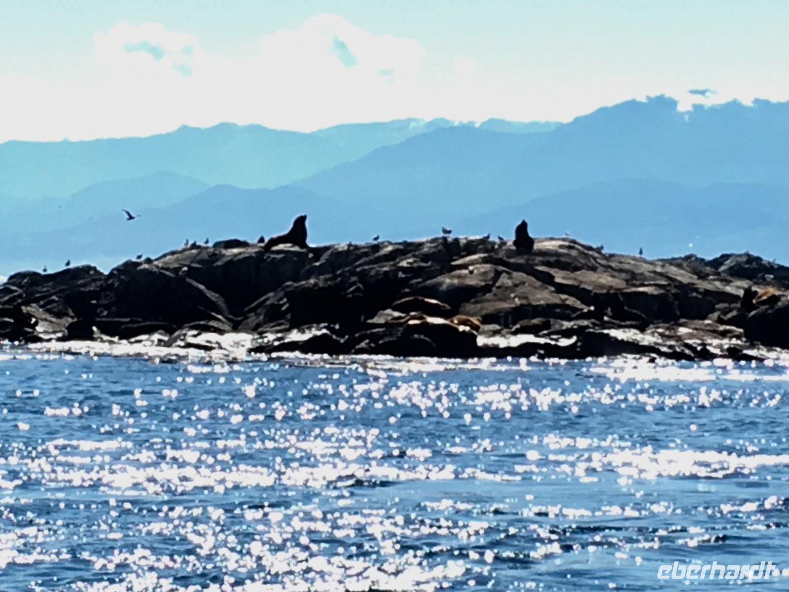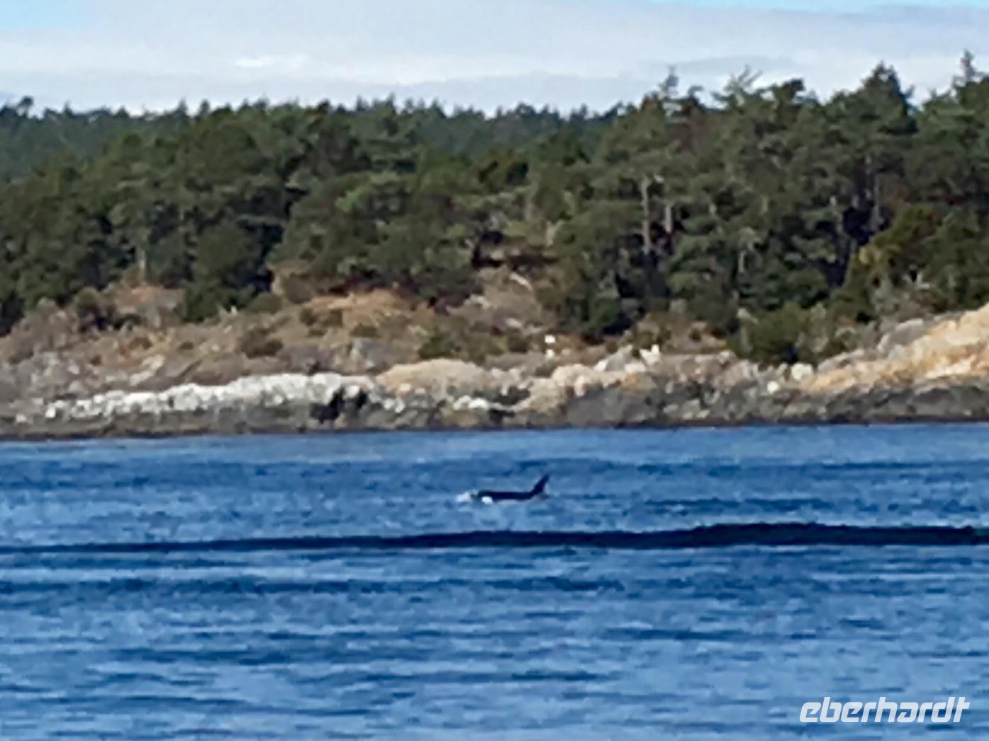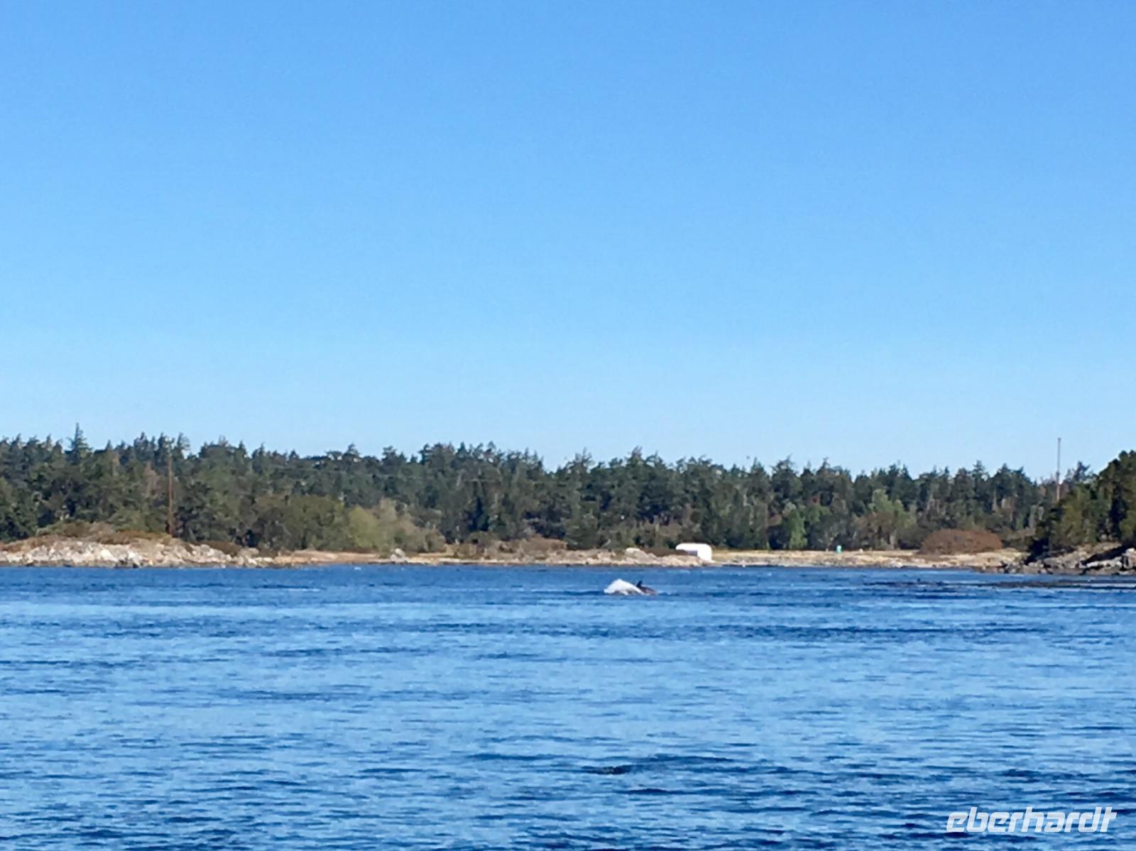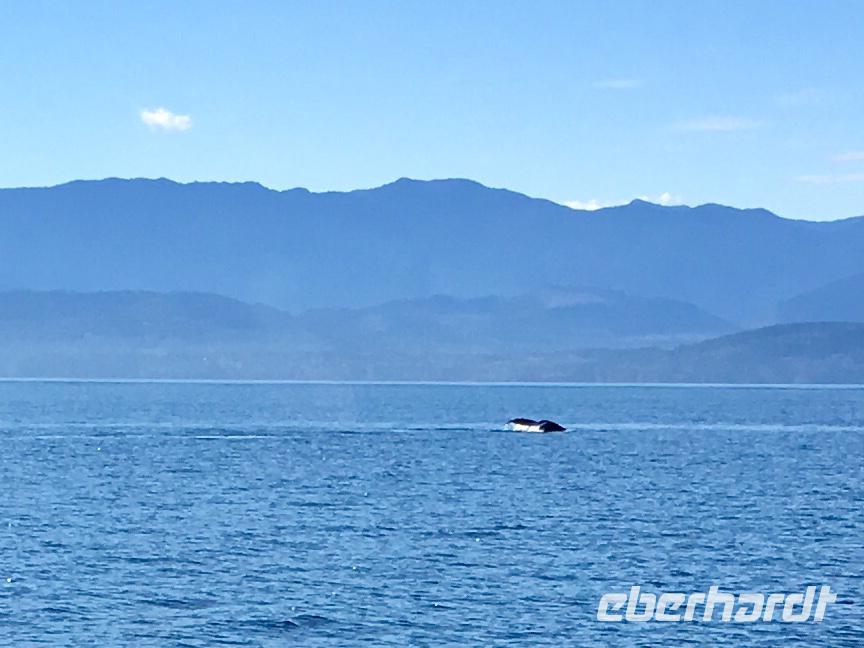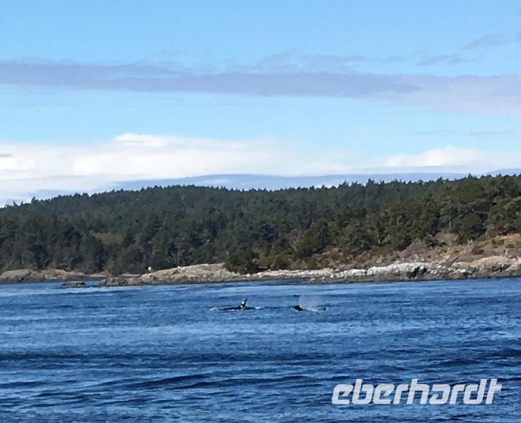 Es ist unser freier Tag in Victoria, aber wir haben ein ganz tolles Programm in der Frueh. Stahlblauer Himmel begleitet uns und schon sind wir unterwegs zum heutigen Highlight. Wir gehen naemlich auf Walbeobachtung. Das Boot wartet am Hafen schon auf uns. Scott, der Kapitaen winkt und Joanne begleitet noch andere Gaeste auf dieses grosse Boot. An Kaffee, Tee und heisser Schokolade kann man sich hier kostenlos bedienen. Es ist etwas kuehl aber die Sonne will uns aufwaermen. Das Meer, ist heute spiegelglatt, kein Wind blaest und lange weiche Wellen halten das Meer in leichter Bewegung. Auf einmal sehen wir eine Fontaene aus dem Wasser spritzen, nichts wie hin....es ist ein Buckelwal, nein zwei, eine Mutter ist mit ihrem Kind unterwegs in den Sueden. Immer wieder sieht man die grosse Fontaene der Mutter und ein klein wenig spaeter die kleine Fontaene des jungen Wals. Fast 15 Minuten spielen die beiden im Wasser bis sich auf einmal der ganze Koerper der Mutter kruemmt und sie abtaucht und wir wie wild mit den Kameras knipsen, die Schwanzflosse wollen wir alle haben. Der Kleine zeigt seine Schwanzflosse nicht und taucht neben seiner Mama ab. Was fuer ein tolles Erlebniss. Nun gehts weiter denn eigentlich wollten wir Killerwale/Orcas sehen. Und tatsaechlich, die Buckelwale waren die Einfuehrung in das wunderbare Spektakel der 5 Killerwale die sich bald darauf zeigen. Sie schwimmen alle in der Gruppe und wir sehen sogar wie sie gemeinsam auf die Jagd gehen. Eine gute halbe Stunde verweilen wir hier um ihnen zu zuzuschauen. Es sind transiente Wale, seltener sieht man diese, denn hier gibt es doch die beruehmten residenten Killerwale, aber die bewegen sich gerade in Richtung Vancouver.... wer weiss, vielleicht sehen wir die Morgen auf der Faehre nach Vancouver. Bei Race Rocks, das ist eine Schaere, steht ein Leuchtturm und um diese Konstruktion liegen hunderte von Seeloewen. Die besichtigen wir auch, das oink oink oink hoert man schon von weitem und der Geruch verraet das Versteck der Tiere. Diese Stellar- und Kalifornia-Seeloewen machen hier jeweils Station auf dem Weg nach Alaska oder hinunter nach Kalifornien. Wir sehen sie schwer, dick und riesig. Bereit um den Maedel in Kalifornien zu imponieren. Zurueck im Hafen geht nun jeder seinen Weg, da alle etwas vor haben. Die einen besuchen das BC Museum, andere das Parlament, einige machen Einkaeufe und einige gehen auf eine Stadtwanderung andere spannen einfach aus und setzen sich in ein Kaffeehaus oder ins Empress Hotel und geniessen diesen herrlichen sonnigen Nachmittag. Unser Abendessen ist mit Sicht auf den Inneren Hafen von Victoria. Besser und schoener geht es nicht.