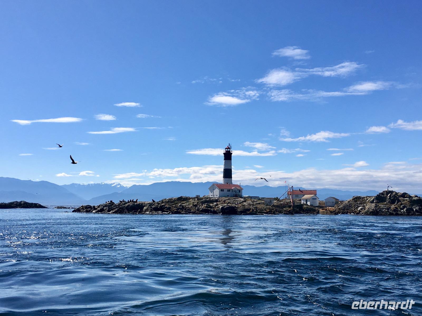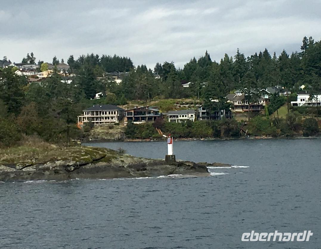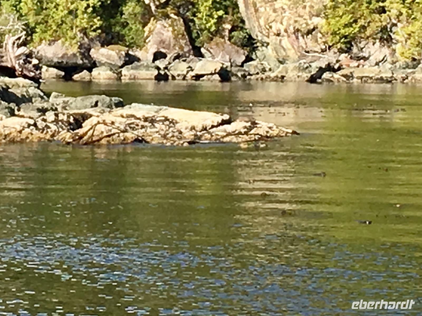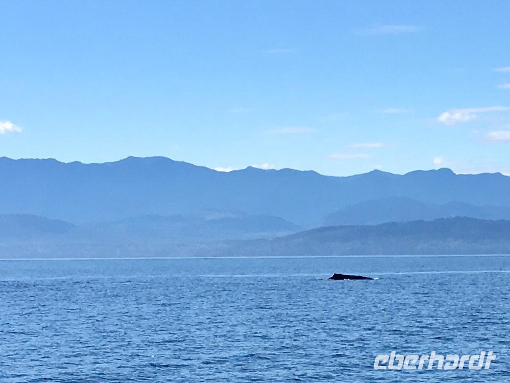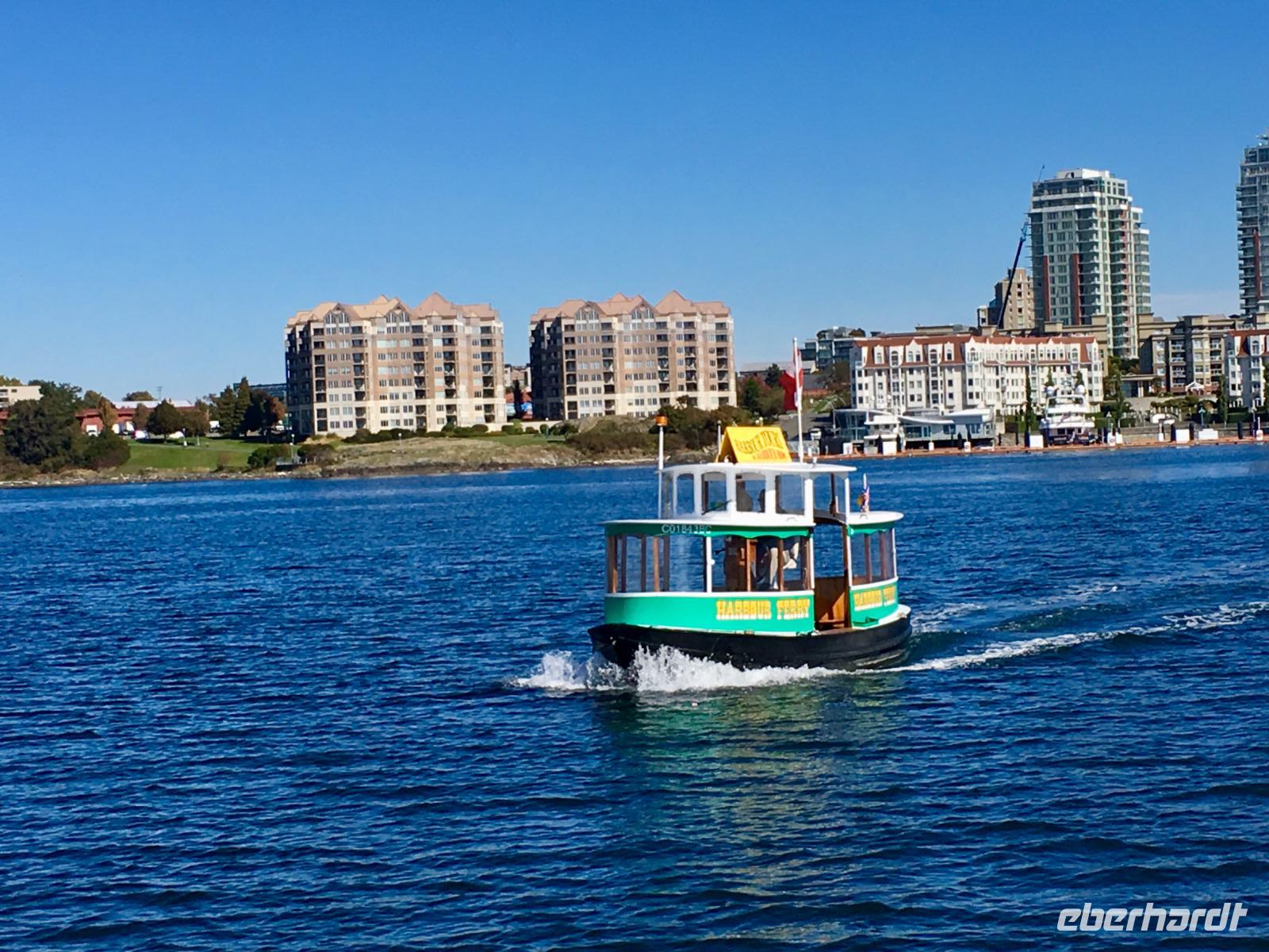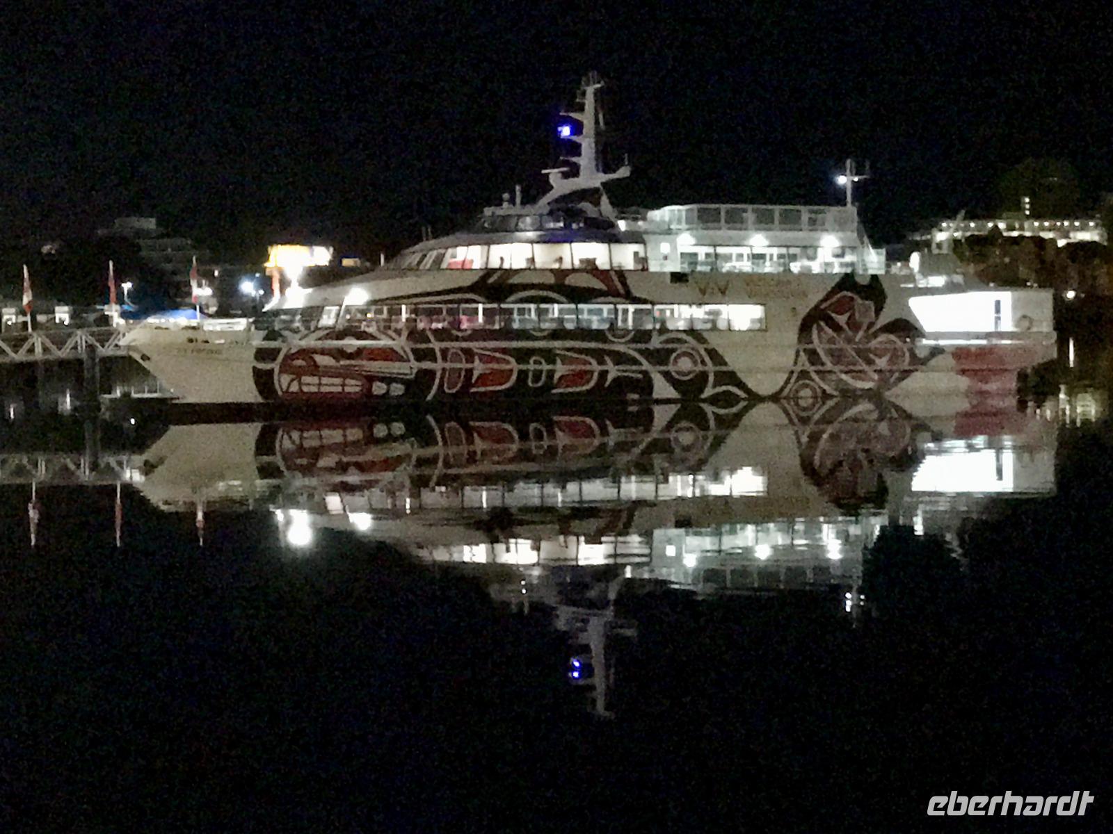 Es ist unser freier Tag in Victoria, aber wir haben ein ganz tolles Programm in der Frueh. Stahlblauer Himmel begleitet uns und schon sind wir unterwegs zum heutigen Highlight. Wir gehen naemlich auf Walbeobachtung. Das Boot wartet am Hafen schon auf uns. Scott, der Kapitaen winkt und Joanne begleitet noch andere Gaeste auf dieses grosse Boot. An Kaffee, Tee und heisser Schokolade kann man sich hier kostenlos bedienen. Es ist etwas kuehl aber die Sonne will uns aufwaermen. Das Meer, ist heute spiegelglatt, kein Wind blaest und lange weiche Wellen halten das Meer in leichter Bewegung. Auf einmal sehen wir eine Fontaene aus dem Wasser spritzen, nichts wie hin....es ist ein Buckelwal, nein zwei, eine Mutter ist mit ihrem Kind unterwegs in den Sueden. Immer wieder sieht man die grosse Fontaene der Mutter und ein klein wenig spaeter die kleine Fontaene des jungen Wals. Fast 15 Minuten spielen die beiden im Wasser bis sich auf einmal der ganze Koerper der Mutter kruemmt und sie abtaucht und wir wie wild mit den Kameras knipsen, die Schwanzflosse wollen wir alle haben. Der Kleine zeigt seine Schwanzflosse nicht und taucht neben seiner Mama ab. Was fuer ein tolles Erlebniss. Nun gehts weiter denn eigentlich wollten wir Killerwale/Orcas sehen. Und tatsaechlich, die Buckelwale waren die Einfuehrung in das wunderbare Spektakel der 5 Killerwale die sich bald darauf zeigen. Sie schwimmen alle in der Gruppe und wir sehen sogar wie sie gemeinsam auf die Jagd gehen. Eine gute halbe Stunde verweilen wir hier um ihnen zu zuzuschauen. Es sind transiente Wale, seltener sieht man diese, denn hier gibt es doch die beruehmten residenten Killerwale, aber die bewegen sich gerade in Richtung Vancouver.... wer weiss, vielleicht sehen wir die Morgen auf der Faehre nach Vancouver. Bei Race Rocks, das ist eine Schaere, steht ein Leuchtturm und um diese Konstruktion liegen hunderte von Seeloewen. Die besichtigen wir auch, das oink oink oink hoert man schon von weitem und der Geruch verraet das Versteck der Tiere. Diese Stellar- und Kalifornia-Seeloewen machen hier jeweils Station auf dem Weg nach Alaska oder hinunter nach Kalifornien. Wir sehen sie schwer, dick und riesig. Bereit um den Maedel in Kalifornien zu imponieren. Zurueck im Hafen geht nun jeder seinen Weg, da alle etwas vor haben. Die einen besuchen das BC Museum, andere das Parlament, einige machen Einkaeufe und einige gehen auf eine Stadtwanderung andere spannen einfach aus und setzen sich in ein Kaffeehaus oder ins Empress Hotel und geniessen diesen herrlichen sonnigen Nachmittag. Unser Abendessen ist mit Sicht auf den Inneren Hafen von Victoria. Besser und schoener geht es nicht.