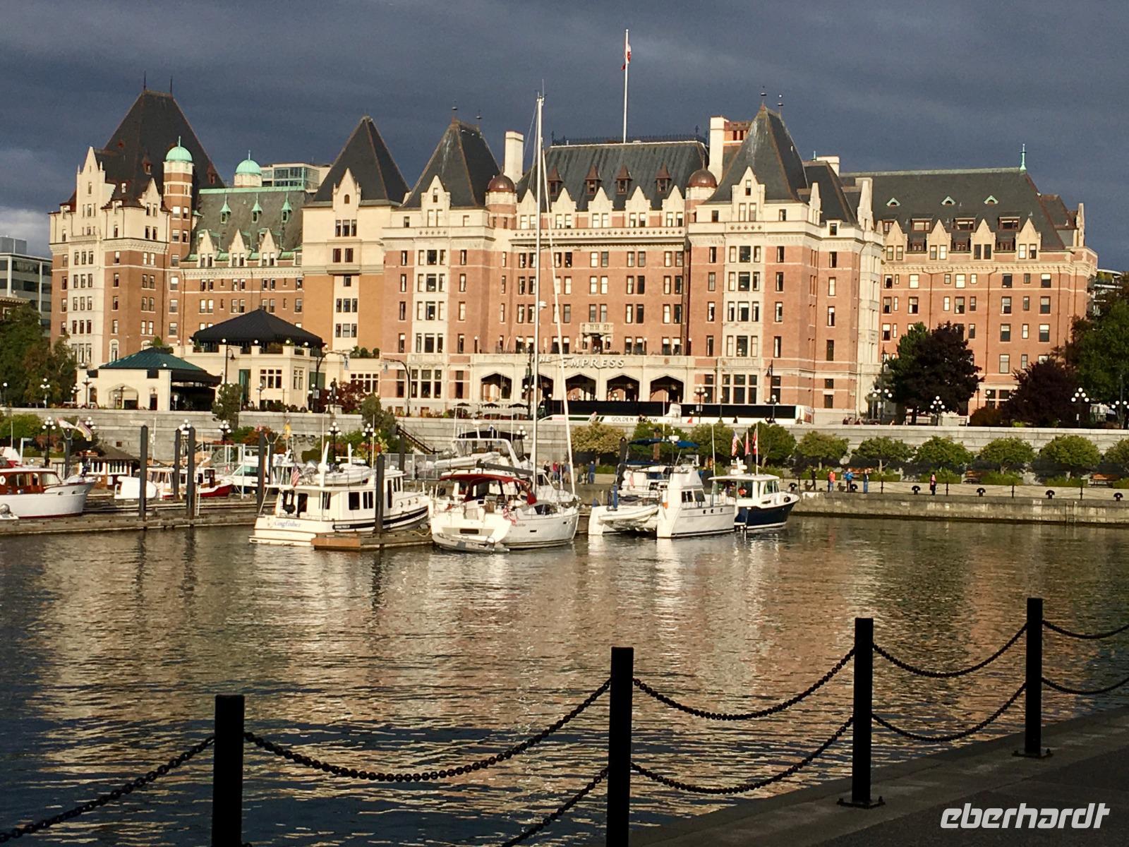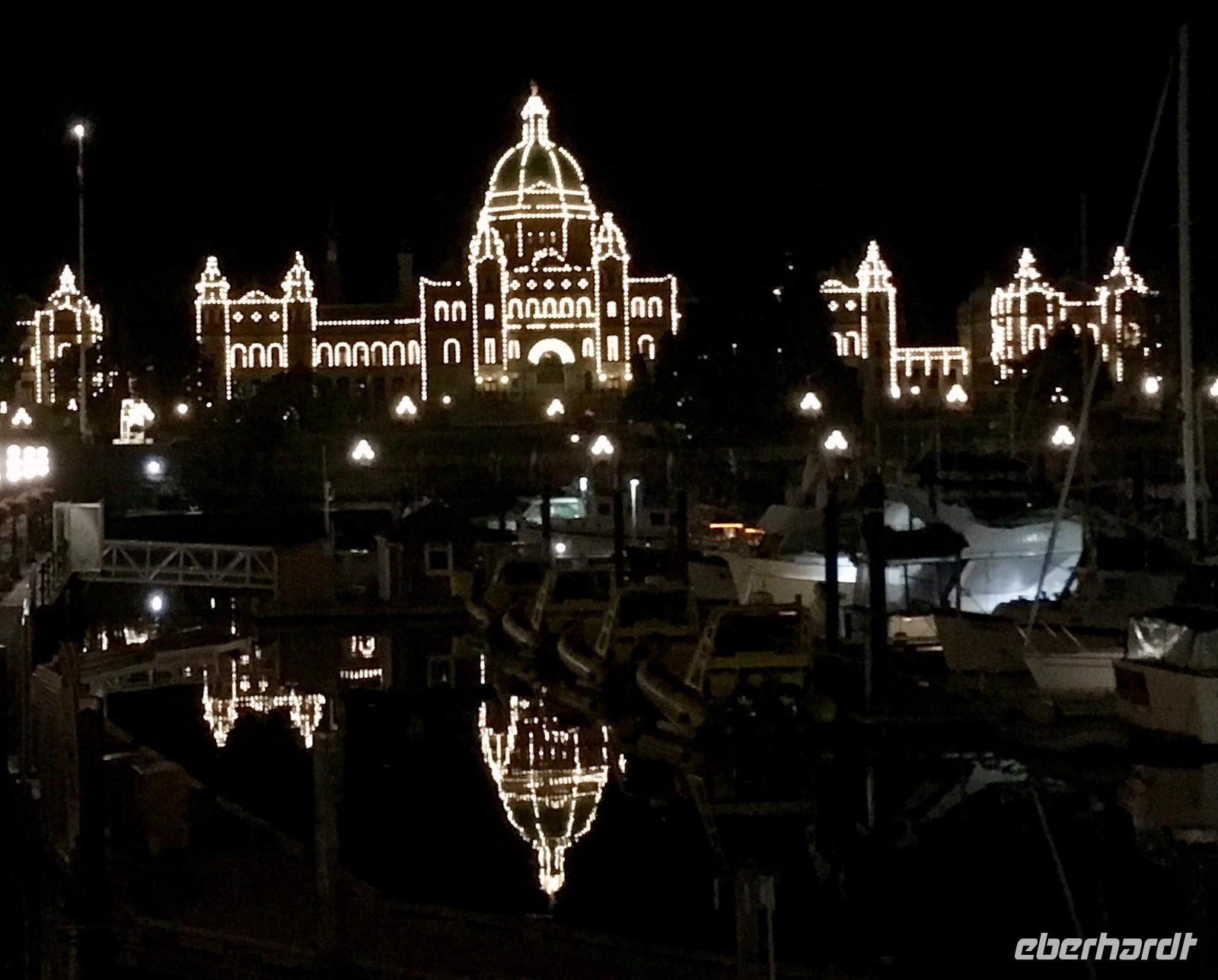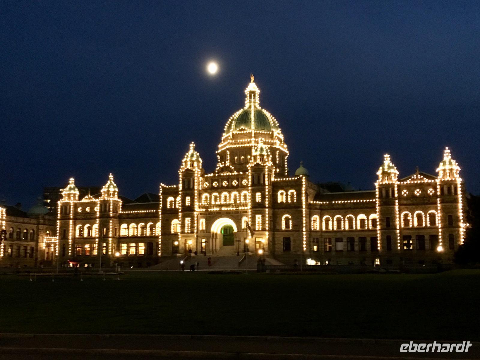 Oh wie herrlich, man erblickt blauen Himmel, das Zimmer ist sehr gross und angenehm temperiert und die Decken sind warm, wer will da schon aufstehen.....Aber eben. Nach dem Fruehstueck fahren wir gleich an einen schoenen kleinen Strand wo unsere «Romantische Wanderung» startet. Wir wandern eine Stunde der Kueste entlang in einem Regenwald. Die Aussichten aufs Meer sind einfach atemberaubend, die Eindruecke haftend. Die Rueckfahrt nach Nanaimo wird kurz mit einem Besuch bei einem legendaeren Tim Hortons unterbrochen, ansonsten doesen wir einfach vor uns hin. Der naechste Halt ist in einer Freilicht-Gallerie. In Chemainus sind naemlich viele Hauswaende mit historischen Gemaelden bemalt. Man kann von einem Bild zum anderen gehen und sich manchmal sogar in ein Gemaelde hineinfotografieren. Daraufhin fahren wir weiter nach Victoria, unser heutiges Ziel der Reise. Die Stadtfuehrung wird zu Fuss durchgefuehrt, sodass wir auch alles richtig anschauen und abknipsen koennen. Morgen haben wir am Nachmittag Freizeit, dann werden die Geschaefte durchstoebert und nochmals diese Stadtteile angeschaut, welche besonders gefallen haben. Der Hafen mit seinen vielen Atraktionen und Geschichten steht ganz oben auf der Victoria Lieblings-liste. Das Abendessen geniessen wir am Hafen mit herrlichem Blick auf das beleuchete Parlament. Danke Eberhardt, dass Du das so schoen beleuchtet hast fuer uns.