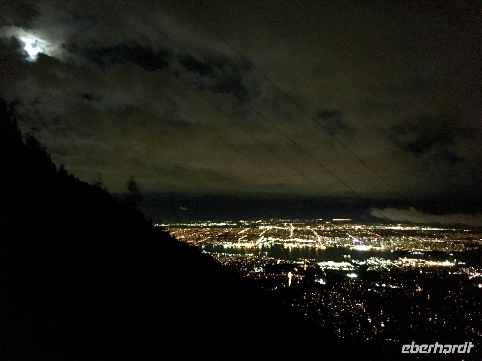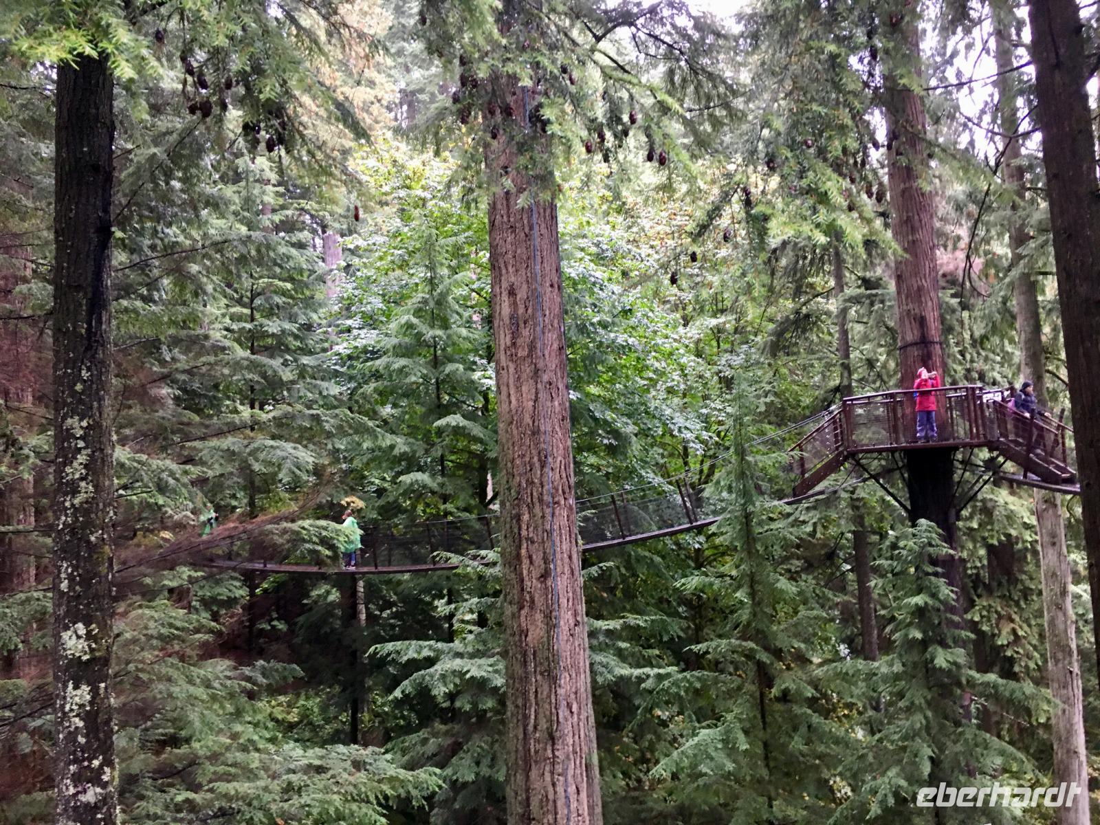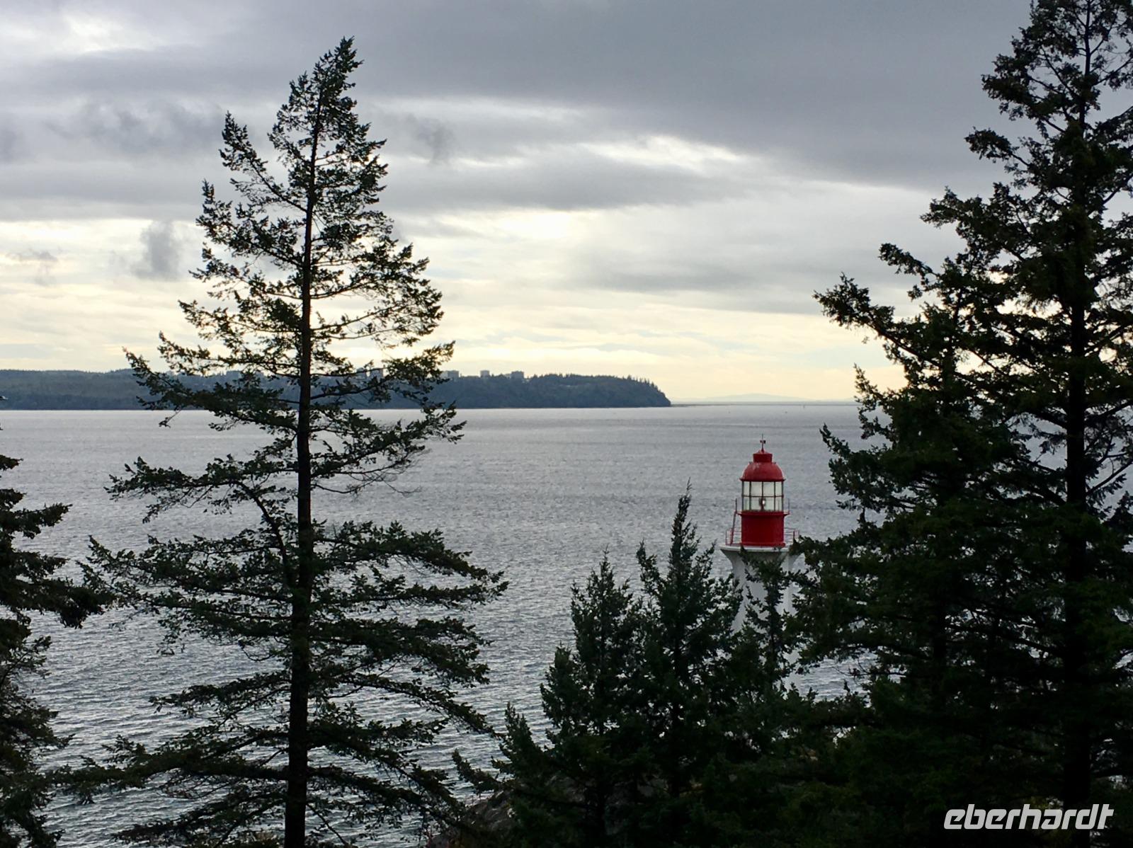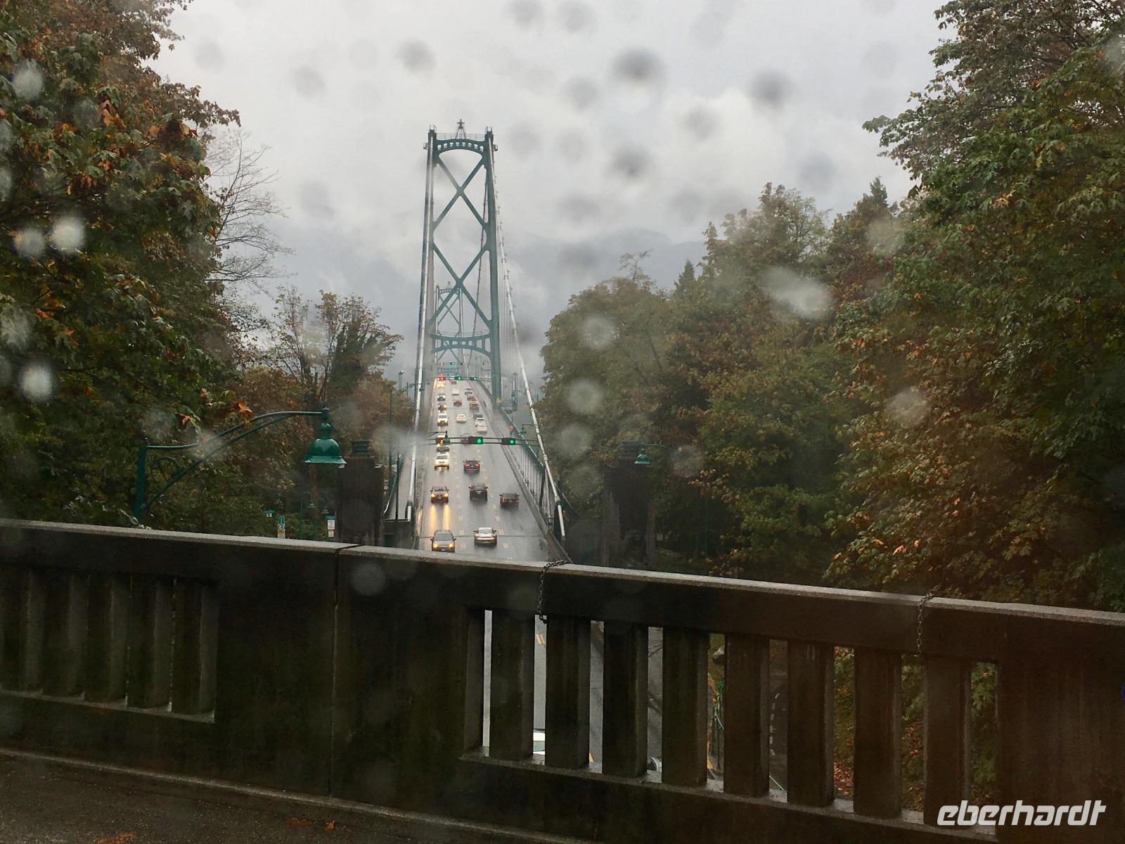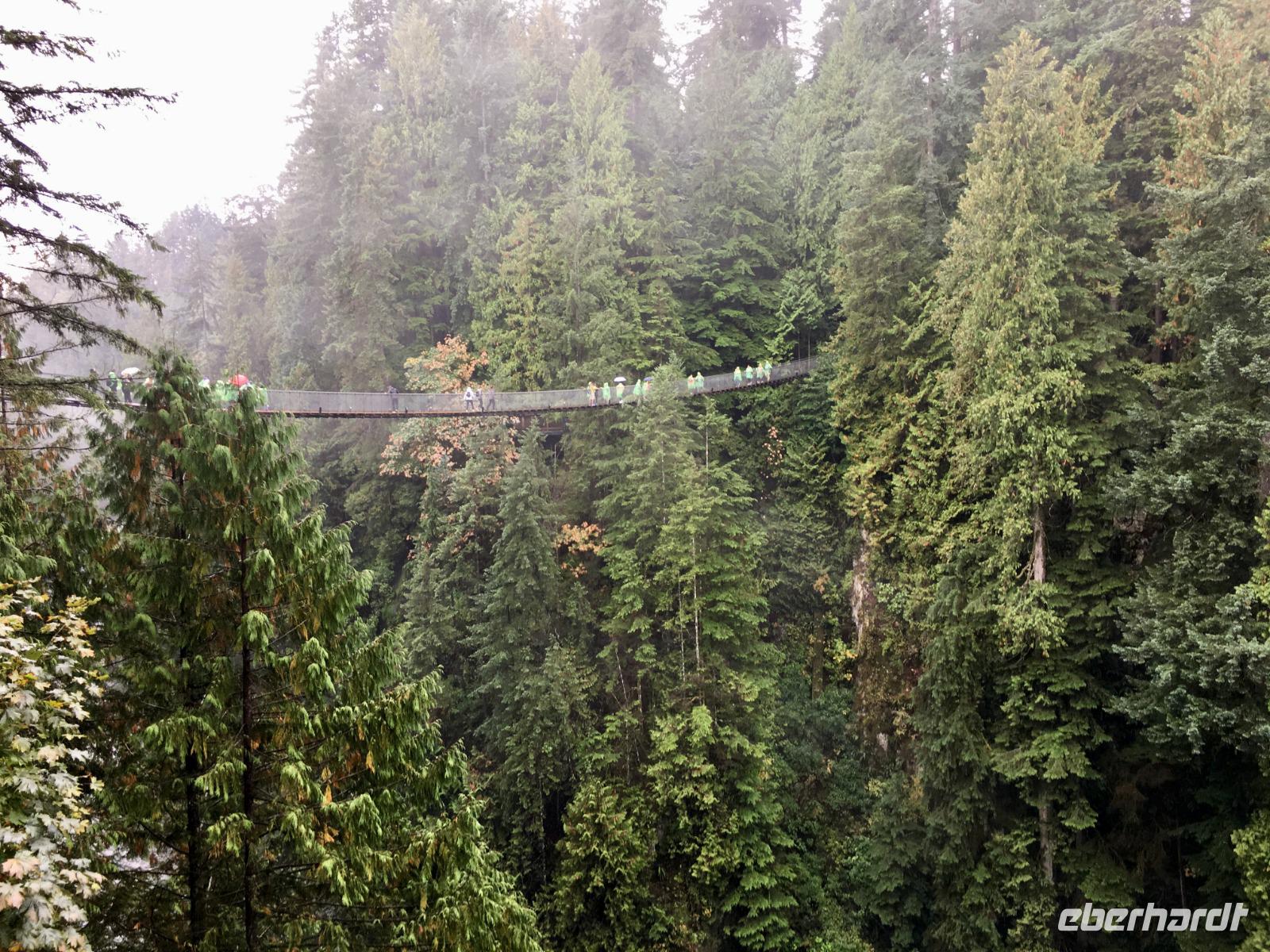 Nach dem Fruehstueck steht auch schon Keith, unser neuer Fahrer vor dem Hotel. Er faehrt uns nach West Vancouver und nimmt die Strasse dem Meer entlang. Oh diese schoenen Strand-Villen und die Aussichten welche die Einheimischen hier haben, atemberaubend. Bei Lighthouse Park startet unsere heutige Wanderung. Durch einen Urwald ueber Stock und Stein fuehrt der Wanderweg von einem Aussichtspunkt zum anderen. Der Leuchtturm ist die Kroenung. Schaut die Bilder dazu an. Mit dem Bus fahren wir anschliessend nach Nord Vancouver um die beruehmte Haengebruecke zu besichtigen und unseren Mut zu testen. Schon ganz schoen beeindruckend. Wir machen uns einen Spass daraus, indem wir alle ohne anzuhalten drueber gehen. Gar nicht einfach bei so einem Andrang von Personen auf der Bruecke, die kommen, gehen, stehen und fotografieren. Wir schaffen es alle und werden auch mit einem Zertifikat belohnt, welches wir zu Hause natuerlich rahmen und aufhaengen werden. Der naechste Halt ist bei der Fischaufzucht wo wir das Leben der Lachse nochmals miterleben ehe wir zu Grouse Mountain weiterfahren. Hinauf mit der riesen Gondel auf den 1250 Mt hohen Skiberg der Vancouveraner. Oben leben 2 Grizzly in einem grossen Gehege und beide zeigen sich heute von der besten Seite. Es ist bereits Herbst und die Fuetterung wird in ihrem offenen Winterbau serviert. So gewoehnen sie sich wieder daran. Wir beobachten Grinder und Coola eine lange Weile ehe wir zur Lodge zurueckkehren, denn es regnet nun wieder und der Nebel wird immer dichter. Bald werden wir zum Dinner geladen. Unser Abschiedsessen nehmen wir hier oben in dem Luxusrestaurant ein und lassen uns verwoehnen. Angefangen hat die Reise mit einem Whisky also wollen wir diesen wunderbaren Urlaub auch mit einem Whisky ausklingen lassen. Bei der Talfahrt mit der Gondel wird der Wind auf einmal staerker, sodass wir zur Station zurueckgefahren werden und 20 Minuten warten muessen bis der Wind wieder faellt. Unten angekommen, ist unser Bus nicht da..........wir stehen etwas verdattert da und schauen wer wohl in die 3 Stretchlimusienen die da bereit stehen, einsteigen werden. WIR ! Ja, wir sollen doch einfach einsteigen, sagt Elisabeth. Die schwarz gekleideten Chauffeure oeffnen die Tueren, sodass wir in unseren Wanderkleider bequem Platz finden in den herrlich beleuchteten Limos. Das gibt es doch nicht, WOW, was fuer eine Ueberraschung, in den 3 Limos fahren wir durch die Stadt zurueck zu unserem Hotel. WOW, WOW, WOW.