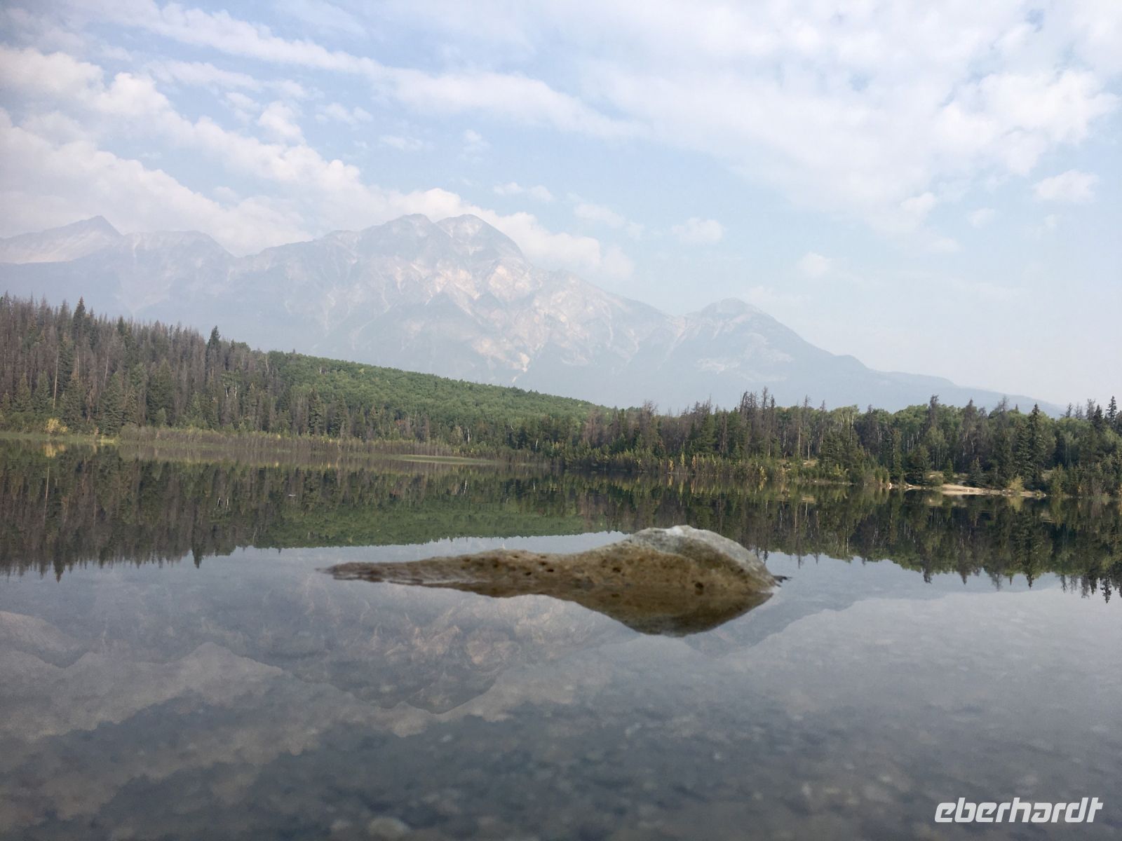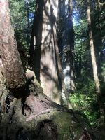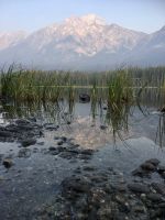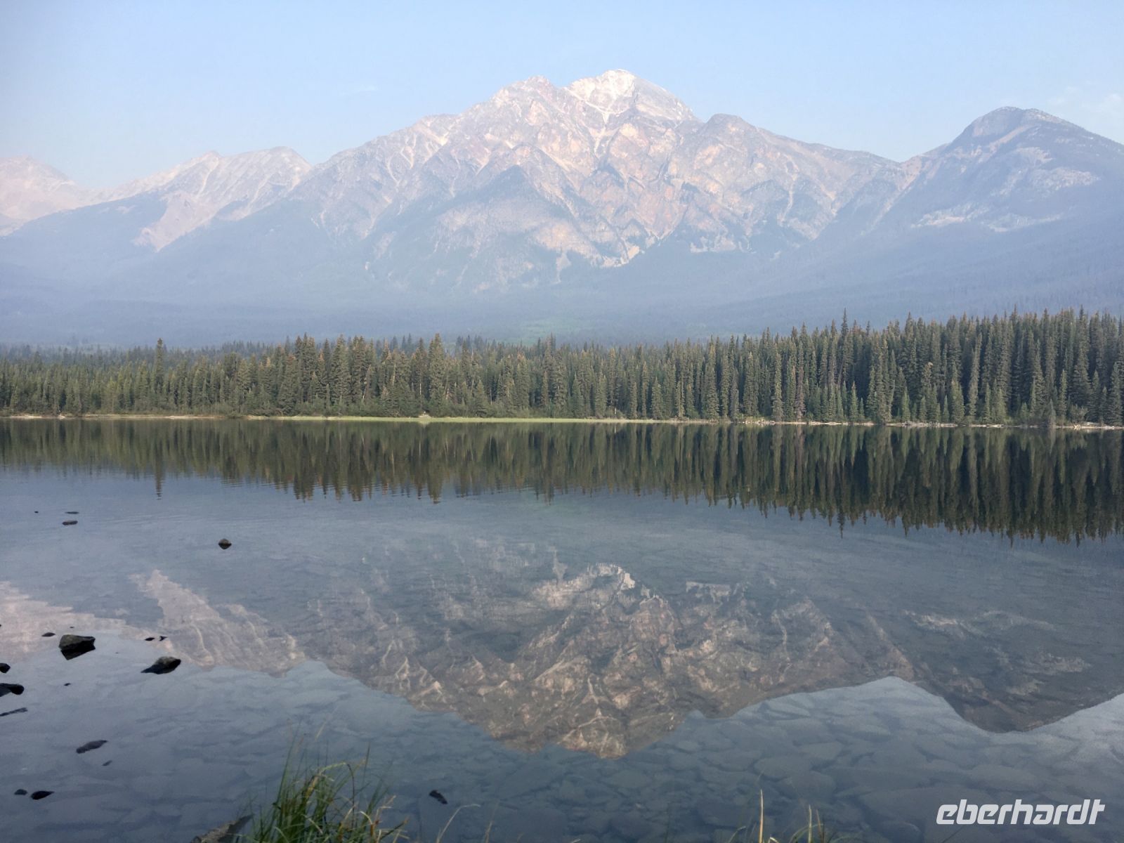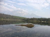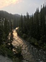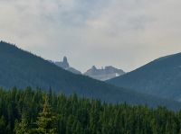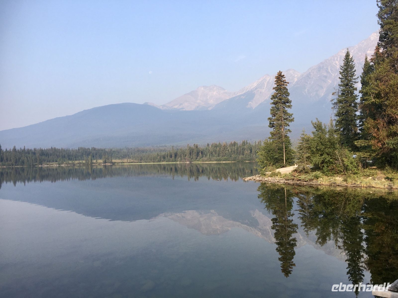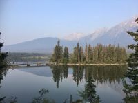 Nach dem Weckruf strecke ich auch gleich meinen Kopf erwartungsvoll zum Fenster hinaus und meine Nase wird nicht nass, also regnet es nicht. Ich habe ein sehr feines app, denn es wird immer noch schoener als geplant. Schnell alle Fenster wieder zu, denn es ist draussen doch sehr kalt. Mein Zimmer ist jedoch angenehm warm. Nun heisst es wieder alle 7 Sachen zusammenpacken und Eugene verstaut alles wieder im Bus. Die Sonne schaut schon hinter den Wolken und Rauchschwaden hervor. In Jasper fahren wir vorerst den Anhang hinter Jasper hinauf um dort zwei Seen zu besichtigen. Bei Pyramid Lake halten wir fuer einen kleinen Spaziergang auf der Insel. Auch hier bieten sich viele tolle Motive und unsere Kameras und Handy werden gut genutzt. Der gute Pyramid Lake liegt spiegelglatt und Pyramid Mountain spiegelt sich sanft darin. Sanft, da der Rauch doch die Sicht etwas beeintraechtigt. Hier, bei der tollen Riesen-Wurzel, machen wir auch das Gruppenbild, welches bloss fuer uns privat bleiben wird. Auf der Rueckfahrt halten wir nun bei Patricia Lake an, denn wir wollen erstens die Spiegelung aufnehmen und natuerlich kontrollieren, ob die Geschichte der Eisschiff-Werft auch stimmt. Alles gut, das Foto der Werft steht auch noch da. Nach einem kurzen technischen Halt in Jasper ist es aber wirklich Zeit diese schoene Gegen zu verlassen, denn British Columbia auch liebevoll BC genannt erwartet uns schon. Ueber der grossen Wasserscheide treffen wir auf den Fraser Fluss der erste Fluss der in den Pazifischen Ozean fliesst. Wir wandern auch eine Stunde diesem Fluss entlang. Schoen ist es, durch saftig gruenes Dickicht mit schoenen Aussichten auf den reissenden Fluss und die umliegenden Berge, zu wandern. Da wir bereits die Uhren eine Stunde zurueckstellen konnten ist es auch wieder frueher am Vormittag, es ist frisch und wir freuen uns um die Extrastunde Spielzeit heute. Wir lernen auch gleich schon die drei wichtigsten Bäume von BC kennen. Duglasien, Hemlock Tannen und Westliche Rote Zedern wachsen hier in diesem Hosentaschen-Regenwald. An der Kueste werden wir noch viele solche Baeume sehen aber dann als Riesen, wird uns versprochen. Nun sind wir eingelaufen und wollen nach der Mittagspause auch gleich die zweite Wanderung zum Kinney See unternehmen. Hmmm, der Park-Waechter hat alle Wanderwege um den guten Mount Robson bis auf weiteres gesperrt. Wohl wegen des Rauches und der Feuergefahr. So nutzen wir die Zeit und schauen uns vorerst die Reargard Wasserfaelle an. Es sind die letzten Wasserfaelle, die von den Chinook Lachsen vor ihrer Laichstelle bewaeltigt werden muessen. Alle Chinook sind bereits hochgeklettert, das muss sehr schwierig gewesen sein, denn diese Faelle des Frasers River sind rund 1200 Km von der Kueste entfernt ! So reden wir natuerlich viel ueber die Lachse, ueber ihren Lebensweg und ihre Laichgruende. Britisch Kolumbien ist durchzogen von Fluessen die Lachse fuehren, hoffentlich erwischen wir eine Schule bei Clearwater morgen. Nun geht unsere Reise mit dem Bus weiter und wir halten nochmals fuer eine laengere Wanderung in der Naehe von Valemount. Wir koennen es kaum glauben, wir machen eine Duenen-Wanderung und gehen auf Sand wie an einem Strand, Es ist hier sehr trocken, der Sand ist teilweise mit Moose und kleinen Graesern und Gestruep bewachsen, es ist, als waeren wir in einem anderen Land. Ueber 6 Km spaeter, sind wir wieder beim Bus. Nun machen wir endlich Siesta im Bus. Die Reise dauert 2 Stunden bis wir in Clearwater ankommen, wir sprechen ueber Waelder, Lachse, Studenten usw so vergeht die Zeit schnell. Wir kommen etwas spaeter als geplant in Clearwater an, da unser Minibus bloss 70 KmH fahren kann, ohne dass der Motor ueberhitzt. Wir muessen uns bloss noch einen Tag gedulden, dann bekommen wir einen neuen, grossen Bus. Ahh, das Abendessen bei Kaiden, so fein, so koestlich. Dieser abwechslungsreiche Wander- und Reise-Tag endet in strahlendem Sonnen-und Mondschein die noch immer etwas rauchig riechen.