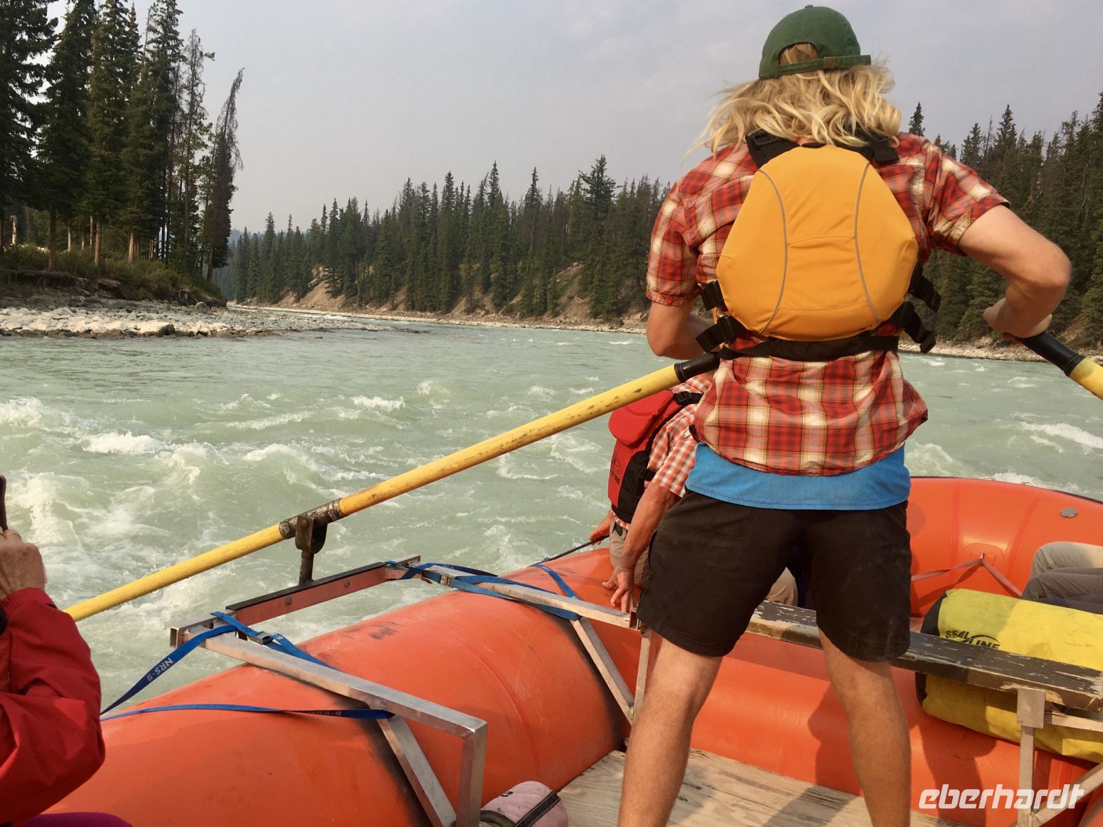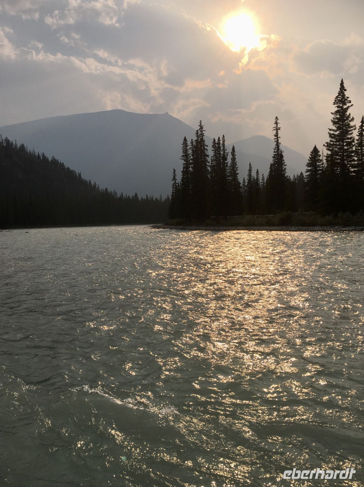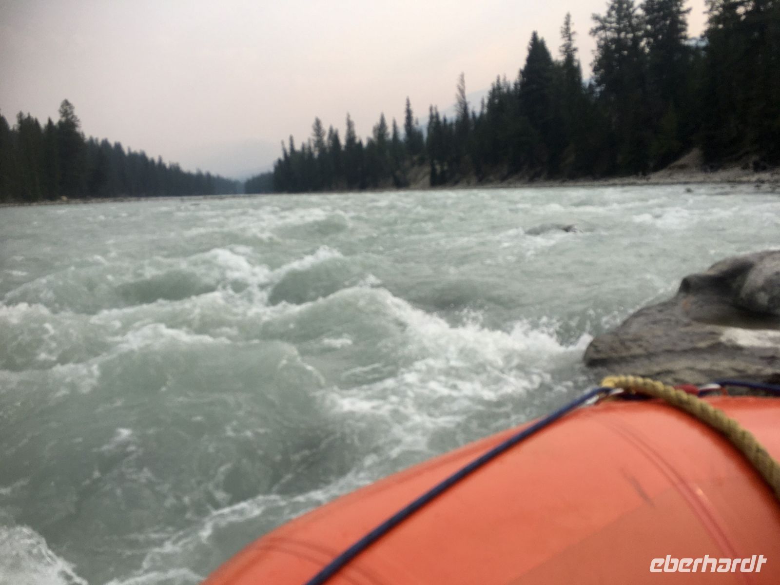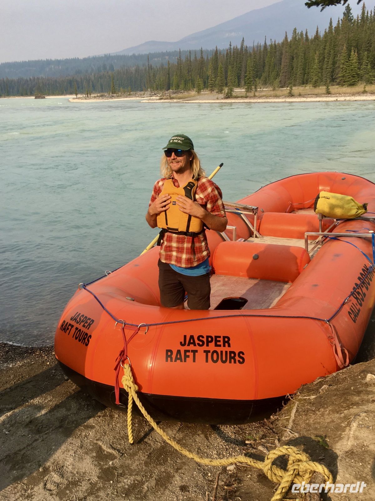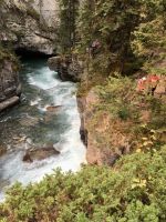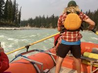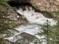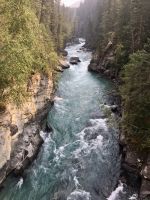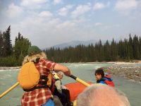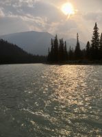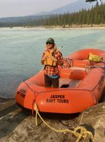 Nach dem schoenen Fruehstueck freuen wir uns nun auf das Maligne Tal und Jasper. Das Wetter ist auch heute wieder schoen. Ein paar Woelkchen zieren den Himmel und sorgen fuer beste Perspektieve. Leider liegt der Rauch des Waldbrandes noch immer in der Luft und beeintraechtigt natuerlich auch die Sicht. Wir fahren nicht lange und halten bald wieder an, denn nun gehts auf eine schoene und interessante Wanderung entlang des malerischen Maligne Flusses. Vor dem «Weisser Ton» - Wasserfall bleiben wir auch stehen und geniessen diesen Urton und die Perfektion dieses kleinen Wasserfalles. Sowas wollten wir auch in unseren Gaerten zu Hause ! In dieser Maligne Schlucht sehen wir viele Wasserfaelle, wir reden ueber die hier heimischen Fische, Flora und Fauna. Immer wieder staunen wir ueber die Kraft des Wassers und wie Wasser durch unterirdische Fluesse in und aus dem Maligne Fluss zu- und abfliesst. Nach dieser Wanderung gibts nun mal Pause im Bus. Wir fahren bei Medicine Lake vorbei, reden ueber die Goldgraeber und die Ueberlaender, wie die Quebecer auch liebevoll genannt wurden. Spaeter, im Restaurant des Maligne Sees nehmen wir unser Mittagessen ein und haben etwas Zeit bis unsere Bootsfahrt losgeht. Die Fahrt ist einfach toll, Spirit Island ist das heutige Fotomotiv und manch einer knipst sicher auch ein gewinnbringendes Kodak-Foto. Die Berge leuchten romantisch, es ist eine Augenweide. Bitte schaut Euch die Fotogalerie an. Ehe wir bei der Anlegestelle ankommen, verlangsamt sich unser Schiff und Jason der Kapitaen wendet das Schiff dem Ufer zu. Sam, der Naturalist an Bord sieht ein Moose am Ufer. So fahren wir so nahe wie moeglich und sehen tasaechlich ein Moose. Es zeigt sich von hinten und will sich nicht umdrehen. Es ist wohl viel zu vertieft in der Nahrungssuche. Schoen, dass wir dies erleben durften, denn mit Tiersichtungen sind wir ja nicht gerade verwoehnt auf dieser Reise. Ein paar Rehe und Hirsche haben wir gesehen und viele Streifen- und Eichhoernchen. Nun fahren wir weiter bei Jasper vorbei, da es hier noch immer sehr rauchig riecht. Also fahren gleich weiter fuers Rafting auf dem Athabasca Fluss. Eugene faehrt die Leute die das Rating nicht mitmachen wollten zurueck zum Hotel. Rafting in dem knallroten Gummiboot ist echt Klasse. Gemuetlich geht es auf dem etwa 3 Meter hohen und 6 Km schnellen Athabasca Fluss hinunter. Ed ist unser Guide und er leitet mit seinen beiden grossen Paddel das Boot gekonnt durch Schnellen und auch durch das sehr angenehme ruhige Wasser. Es ist sehr erholsam und Ed spricht viel ueber die hiesigen Tiere, den Fluss und sein Leben als Koch, Kletterer, Raftingguide, Alpiner Snowboarder etc etc ! So kommen wir etwa 1 1/2 Stunden spaeter in Jasper an wo unser gute Eugene bereits auf uns wartet. Es war ein schoenes Erlebniss sich auf diesem Fluss in dem grossen roten Boot runter treiben zu lassen. Das Abendessen ist heute ein schoenes BBQ. Wir haben wieder so viel erlebt und unternommen, dass wir fuer nichts mehr Energie aufbringen koennen. Also fluechtet jeder in sein Waldhaeuschen und......Gute Nacht......