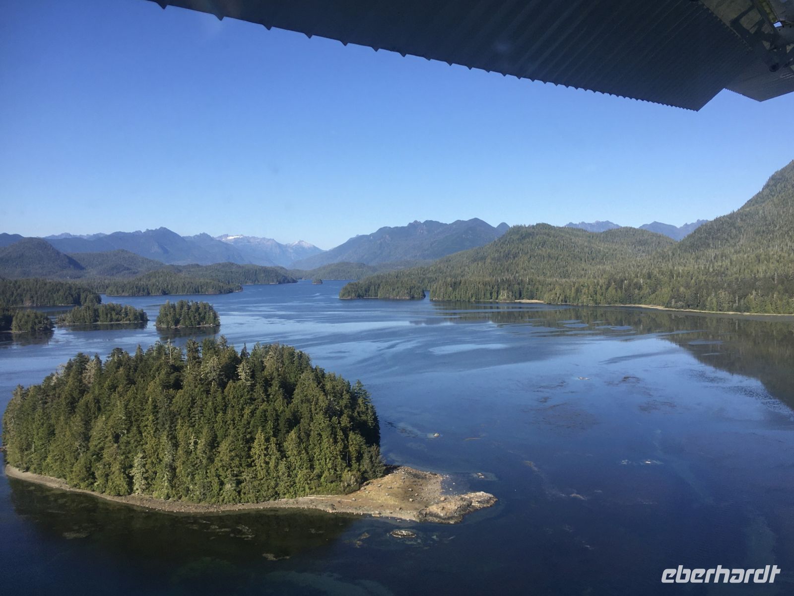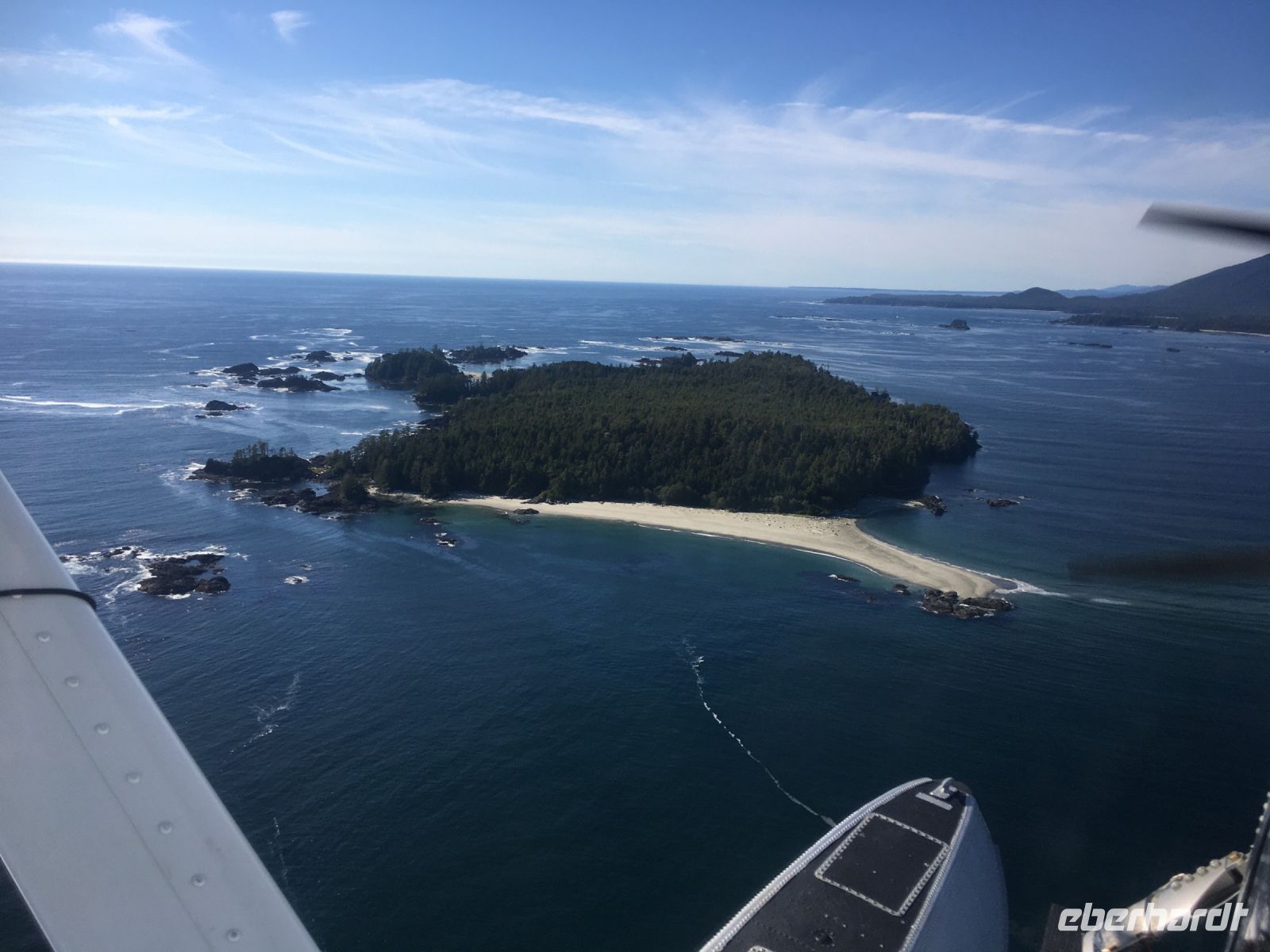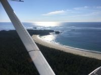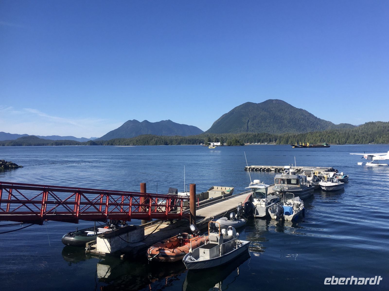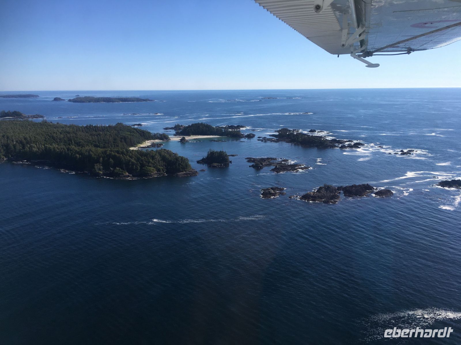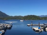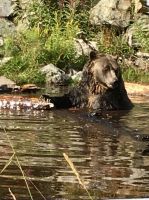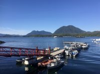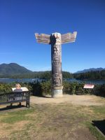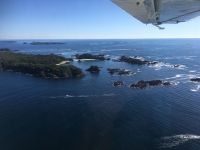 Es ist unser Westkuesten-Tag, der Regenwald-Tag, und es regnet ueberhaupt nicht, es ist wunderschoen. Kein Wind, kein Nebel, einfach bloss blauer praechtiger Himmel. So wachen wir auf, einige gehen gleich im Ozean baden und dann Fruehstueck wann man will. Mmmmm Urlaub. Nach dem schoenen Fruehstuecksbuffet, wollen wir gleich mal diese legendaeren Riesenbaeume des Pacific Rim Nationalparks sehen und halten also auch gleich bei einem Rundwanderweg an. Auf einem Holzsteg gehend, geniessen wir die Ueberschwenglichkeit und Vielfalt dieses Waldes. Es ist wirklich ein Urwald auf 3 Etagen und wir bewegen uns mal im Unterholz und mal im Mittelbereich. Die Krone des Waldes ist kaum sichtbar...so hoch oben... 80 Meter hoch werden diese Riesen. Der hoechste soll ueber 100 Meter hoch sein. Fruehmorgends sind diese Waelder am schoensten, alles wacht gerade aus, die Farne leuchten aber da es schon so lange nicht geregnet hat, ist sogar der Regenwald eher trocken. Ja, es gibt natuerlich nach wie vor die Moose und die Luftpflanzen. Auch bei einem schoenen Tag schaut es hier aus wie in einem echten Ur-Regenwald. Baeren soll es hier viele geben, doch wir sind eine muntere Gruppe und somit sind alle Baeren gewarnt und verstecken sich im Dickicht. Ihre Jungen haben sie sicher auch bereits auf die Baeume gejagt, also war kein Baer fuer uns sichtbar. Wir gehen staunend weiter knipsen viele Bilder bleiben immer wieder stehen, reden und lachen viel. Ein vielsprachiger Kolkrabe begleitet uns eine Weile. Er fliegt von Baum zu Baum immer mit uns mit und kraechzt, piepst und gluckst fröhlich vor sich hin. Ploetzlich sind wir wieder bei der Strasse. Hier ist auch die Tafel. Da steht, dass dieser Rundgang 1.01 Km lang ist. Wir waren eine geschlangene Stunde unterwegs und wir sind doch eine Wandergruppe ? So fahren wir zurueck Richtung Tofino. Bei Long Beach gibt es noch einen Halt denn heute, an dem sonnigen Sonntag wollen wir auch den Surfern zuschauen. Wellenreiten ist hier der Sport der Jugend und jung gebliebenen. In ihren schwarzen Combis schauen die Surfer eher wie Taucher aus und wenn sie denn noch das Wollmuetzchen tragen und das lange Brett unter dem Arm geklemmt haben, ist alles klar…. Hier surfen ist eine kalte Angelegenheit. Wir schauen eine Weile zu, geniessen die Sonne und den endlosen Strand und fahren auch bald wieder weiter. Bereit fuer unser naechstes Abenteuer. Nach dem kurzen Picknick gehts nun auf die Bootsfahrt, eine Baerenbeobachtung wird hier geboten. In den naechsten 2 1/2 Stunden fahren wir in die Inselwelt um Tofino. Das Boot fasst jeweils 12 Personen und wir haben ein, eigen fuer uns gechartetes Boot. Wir segeln auf dem flachen Wasser dahin, an vielen Inseln und Straenden vorbei. Andere Boote sind auch unterwegs und die Suche nach Baeren, die sich an den Straenden bei Ebbe von Krebschen und Muscheln ernaehren, geht los. Wir sehen 2 Baeren, wie sie gerade am Meeresufer sind, um die Muscheln die es hier angeschwemmt hat, zu knacken. Eine Leibspeise der Baeren. Wir sehen aber auch Seeloewen und eine ganze Insel von Alaska Seeotter. Ach wie suess sie doch auf ihrem Ruecken schwimmen….oder schlafen die sogar. Sie sind so nahe beinander, dass es echt wie eine Insel ausschaut. Was fuer ein tolles Erlebnis, kommts mit auf diese Reise, selbst erleben ist noch schoener. Zurueck in Tofino gehts nun weiter mit einem Wasserflugzeug Ausflug. Bei diesem fantastischem Wetter ist das natuerlich die Krone des Tages. Wir schweben ueber Inseln, dieser wilden Westkueste des Pacific Rim National Parks entlang und sehen sogar…..einen Walfisch von oben. Es ist „Picture perfect“. Gluecklich finden wir auch wieder Bernie mit seinem weissen Bus .Er faehrt uns auch gleich zurueck zu unserem Hotel und dem schoenen Strand. Einige unter uns Strandgaenger stuerzen sich sogar in den Pazifischen Ozean, es ist schon kalt, aber eben, einmal hier baden gehen ist auch ein Erlebniss. Ein feines Abendessen in dem schmucken Restaurant mit Sicht aufs Meer und die vorgelagerten Inseln rundet diesen wunderschoenen, ereignisreichen Tag ab. Der kanadische Wein oder das Bierchen schmecken vorzueglich, der gute Schlaf ist gesichert.