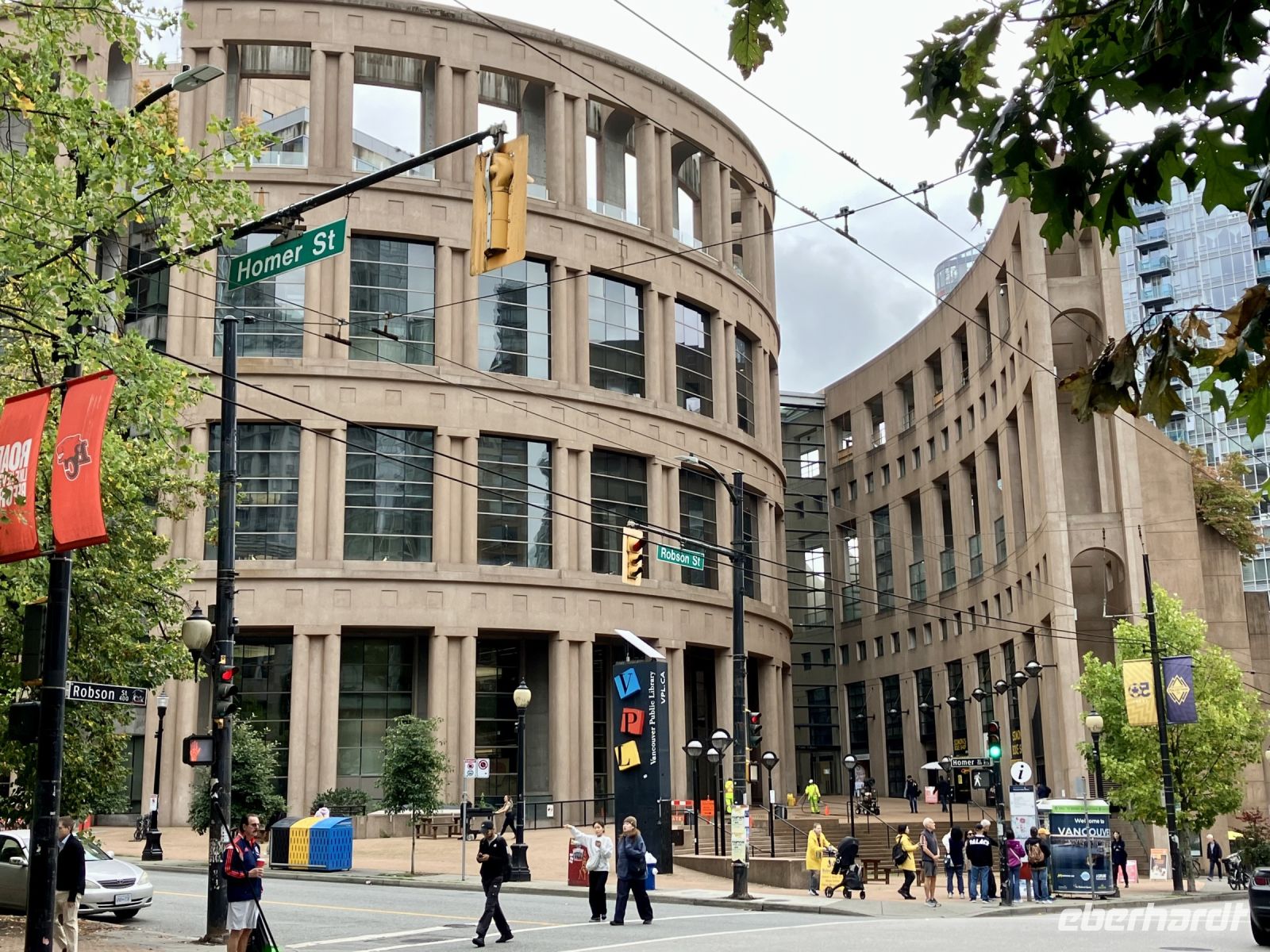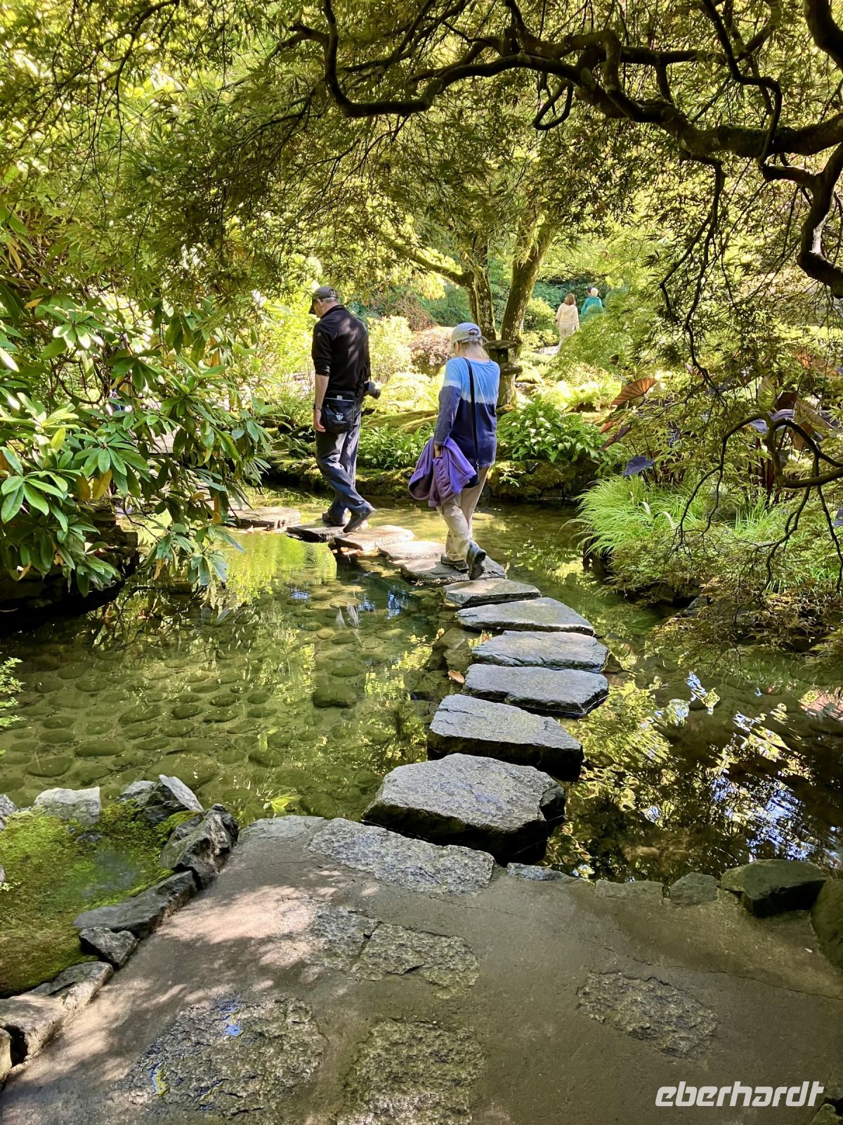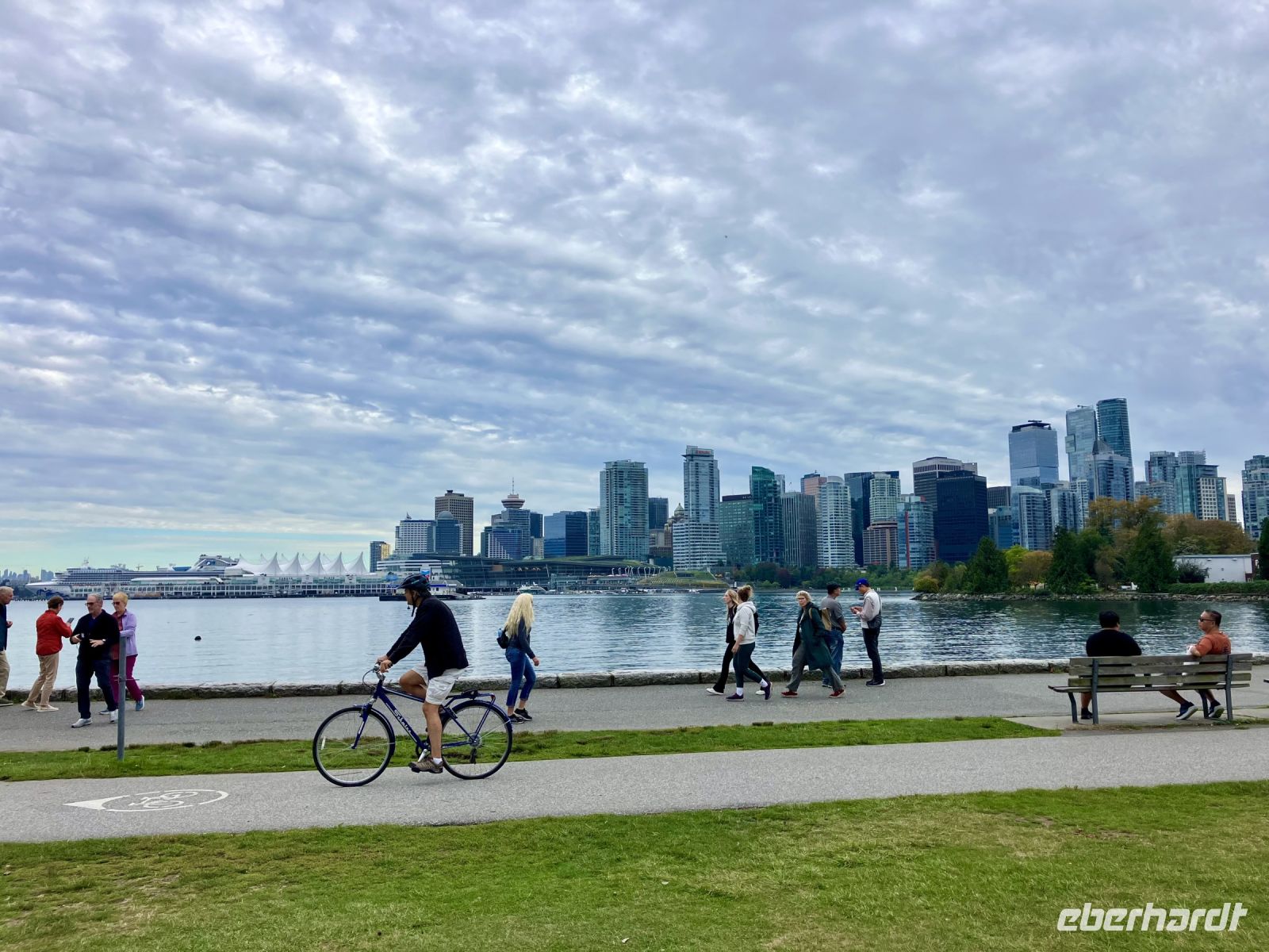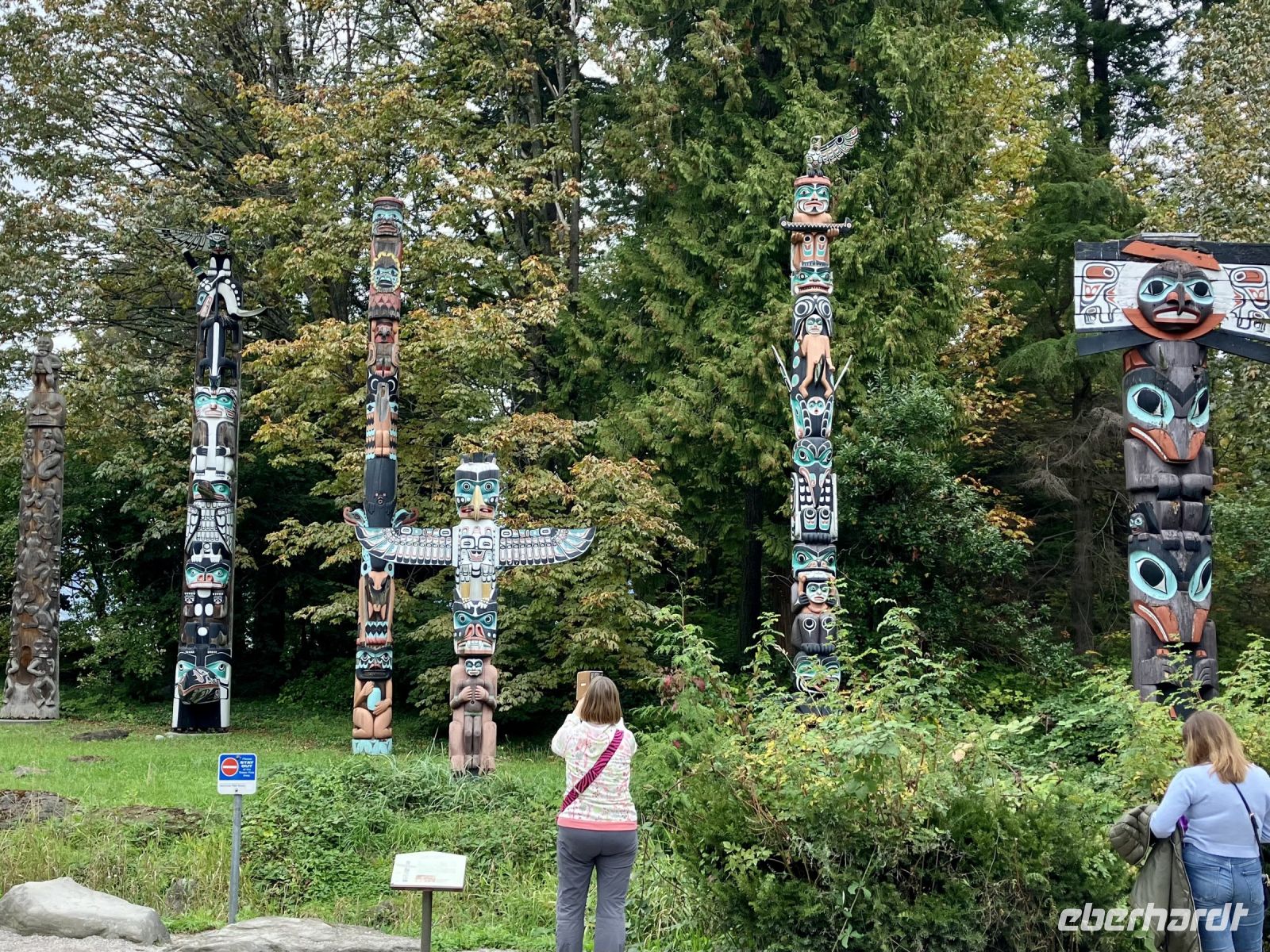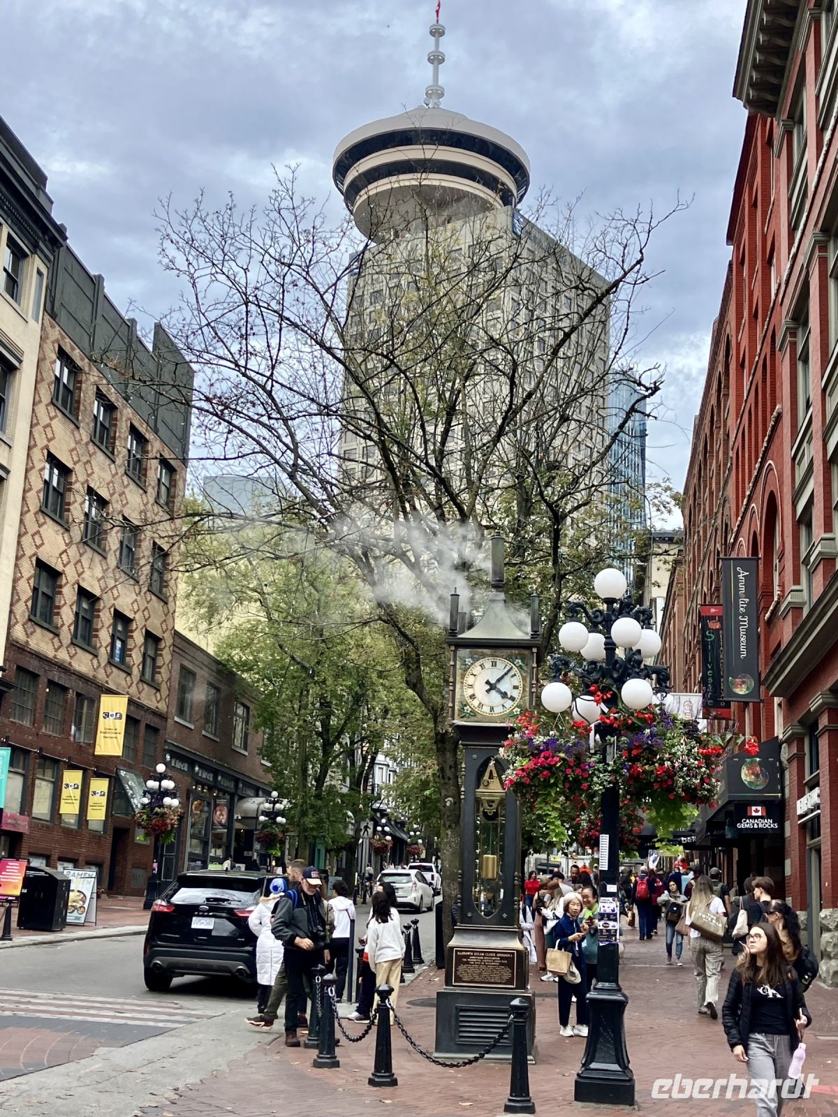 Wir lernen die Stadt auch gleich kennen, denn die Stadtfuehrung fuehrt uns vorerst vorbei dem Flugplatz, ueber den Fraser River, bei Elizabeth Park vorbei. Uii die riesen Sequoia sind bereits so gross, dass man hier in Vancouver sicher bald die Strasse durch den Baumstamm leiten muss. Ueber Cambie Bruecke kommen wir nach Chinatown. Anschliessend gehts nach Gastown. Es ist der aelteste Stadteil Vancouvers mit seiner interessanten Geschichte und seiner Dampfuhr die man auf jedem Vancouver Prospekt auch sehen kann. Hier gehen wir auch zu Fuss durch die Strasse und stehen bald schon vor der Dampfuhr. Die Stunde wird durch viel Dampf im Big Ben Muster angezeigt und durchs Glass kann man das Getriebe anschauen. Ganz schoen einfallsreich der britische Lok-Ingenieur ! Nun sehen wir noch viele Sehenswuerdigkeite der Perle des Pazifiks und halten wieder in Stanley Park bei den Totem Pfaehlen. Auch hier weiss Elisabeth noch Geschichten dazu. Die lustige Kinder-Trockenanlage beim Spielplatz ist sehr amuesant und die Loewenbruecke ist beeindruckend. Bald gelangen wir so zu unserem Hotel wo wir uns von Chris mit einem dicken Umschlag und besten Wuenschen verabschieden. Wir werden ihn vermissen, er hat uns sicher und gut gefahren. Heute Abend ist freies Abendbrot und so ziehen wir alle, mit unseren Stadtplaene ausgeruestet, durch die Strassen Vancouvers. Wichtig ist jedoch das Rendez-vous am englischen Strand zum Sonnenuntergang.