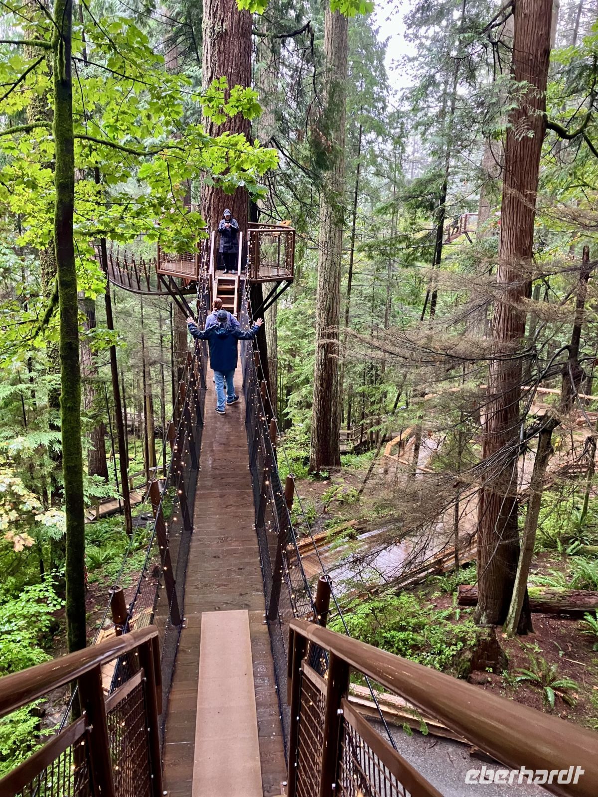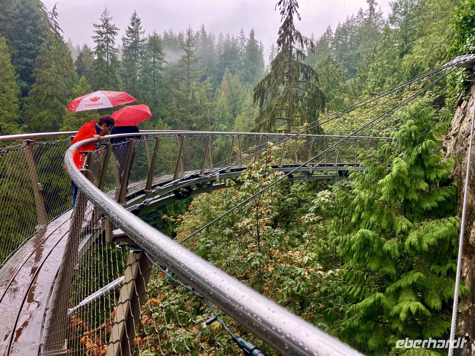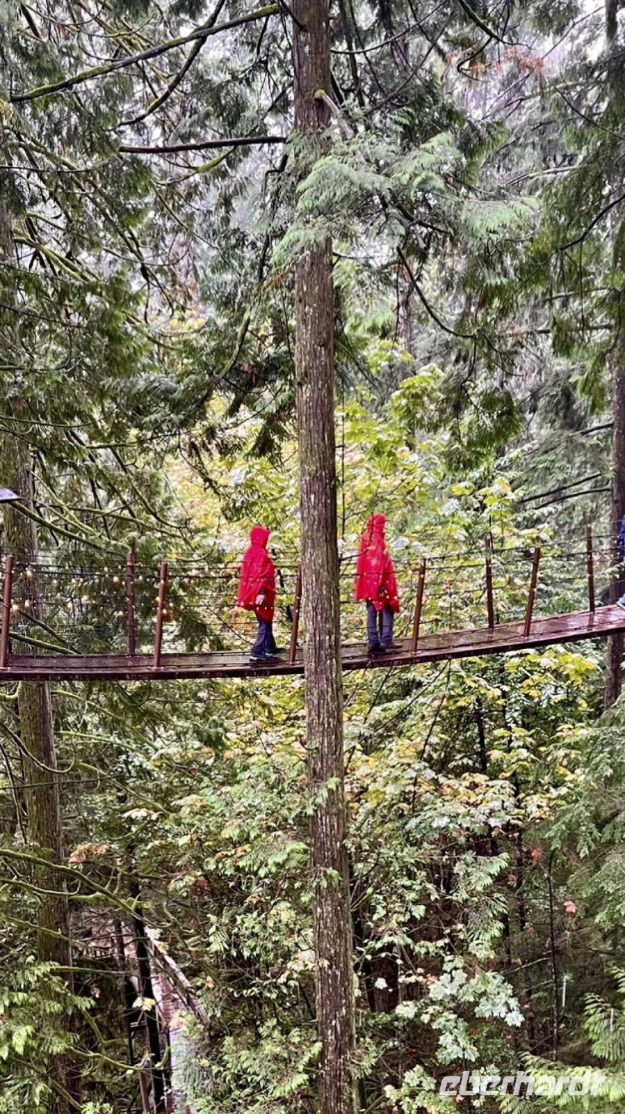 Es ist nun bereits 11:30 und John kommt um uns zu der beruehmten Haengebruecke zu bringen. In Capilano Suspension Bridge Park wird nun unser Mut getesten. Schon ganz schoen beeindruckend. Wir machen uns einen Spass daraus, indem wir versuchen ohne uns am Gelaender der Haengebruecke anzuhalten ueber die wackelige, hohe und lange Bruecke zu gehen. Gar nicht einfach. Gott Sei Dank, sind wir fast die einzigen heute. Wieso bloss !! Es schuettet wie aus Kuebeln. Wir schaffen es fast alle und haben promoviert den Baumwipfelweg zu unternehmen. Das ist nun wirklich imposant. Um zur Mittagspause zu gelangen, muessen wir nun wieder ueber die verrueckte Haengebruecke, der Magen knurrt jedoch so wild, dass wir uns dem Schicksal einfach hingeben, wir sind ja nun geuebt. Gleich nach der Mittagspause beginnt das naechste Abenteuer. Der neueste Felssteig in diesem Park wartet bereits auf uns. Wir sind gut, wir koennen das und werden deshalb auch mit einem Zertifikat belohnt, welches wir zu Hause natuerlich rahmen und aufhaengen werden. OK, bloss im Gaesteklo !
