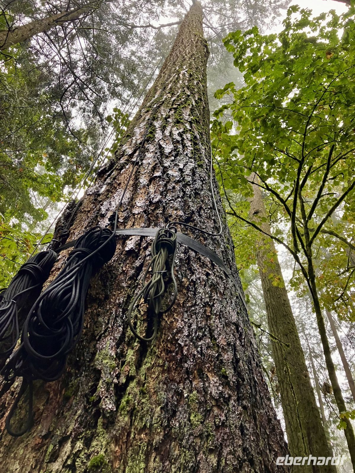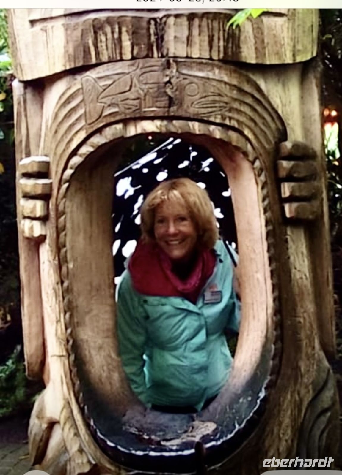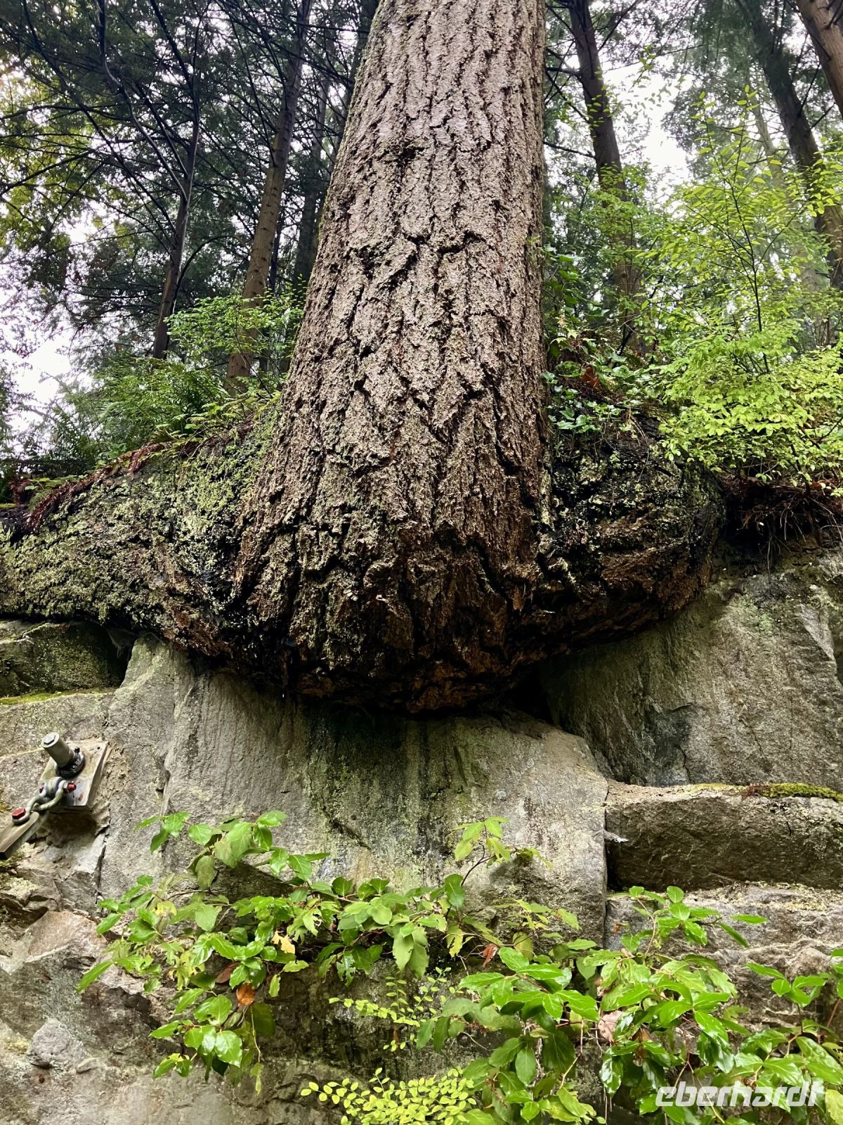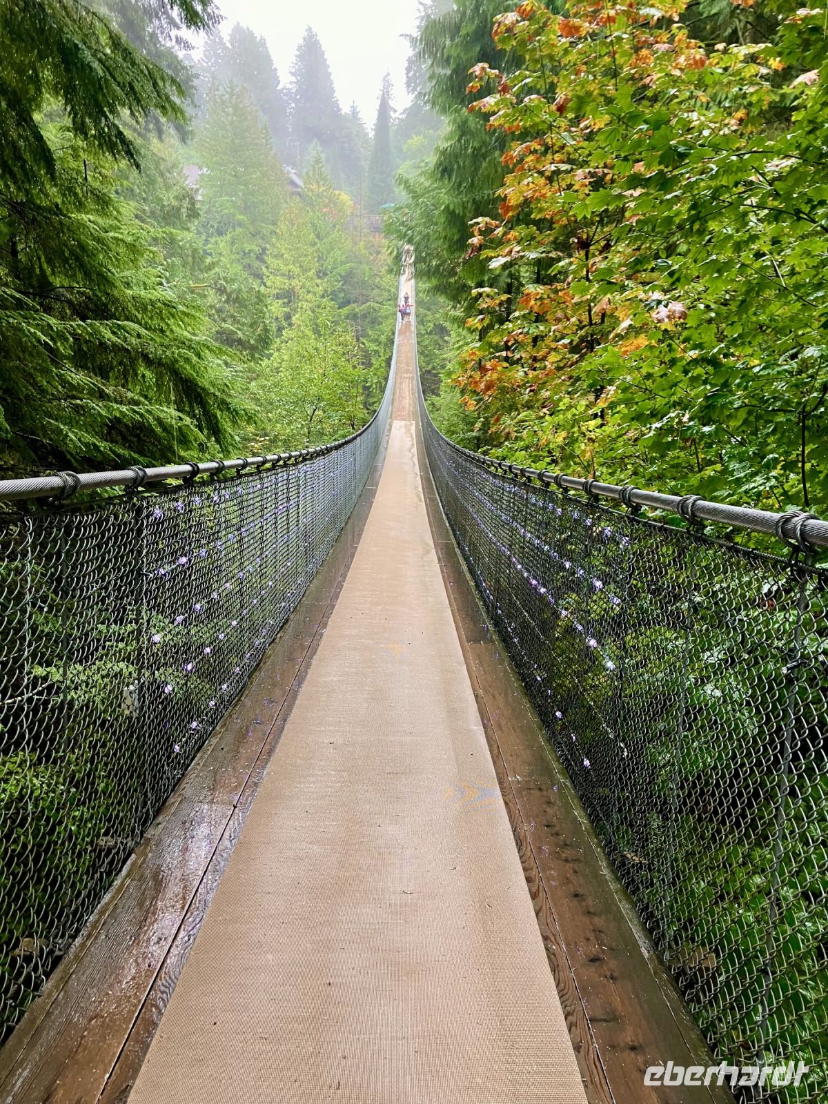 Es ist nun bereits 11:30 und John kommt um uns zu der beruehmten Haengebruecke zu bringen. In Capilano Suspension Bridge Park wird nun unser Mut getesten. Schon ganz schoen beeindruckend. Wir machen uns einen Spass daraus, indem wir versuchen ohne uns am Gelaender der Haengebruecke anzuhalten ueber die wackelige, hohe und lange Bruecke zu gehen. Gar nicht einfach. Gott Sei Dank, sind wir fast die einzigen heute. Wieso bloss !! Es schuettet wie aus Kuebeln. Wir schaffen es fast alle und haben promoviert den Baumwipfelweg zu unternehmen. Das ist nun wirklich imposant. Um zur Mittagspause zu gelangen, muessen wir nun wieder ueber die verrueckte Haengebruecke, der Magen knurrt jedoch so wild, dass wir uns dem Schicksal einfach hingeben, wir sind ja nun geuebt. Gleich nach der Mittagspause beginnt das naechste Abenteuer. Der neueste Felssteig in diesem Park wartet bereits auf uns. Wir sind gut, wir koennen das und werden deshalb auch mit einem Zertifikat belohnt, welches wir zu Hause natuerlich rahmen und aufhaengen werden. OK, bloss im Gaesteklo !
