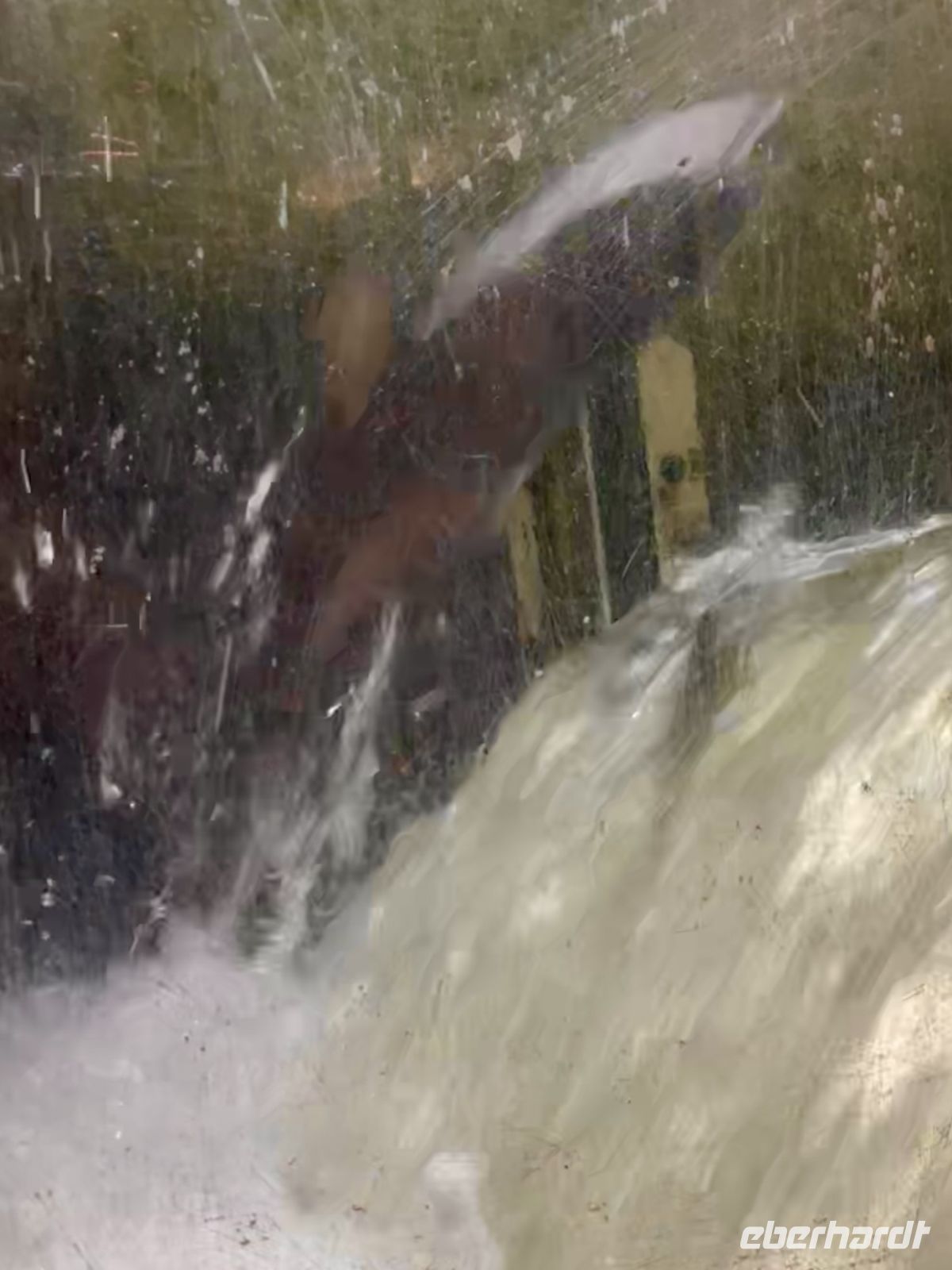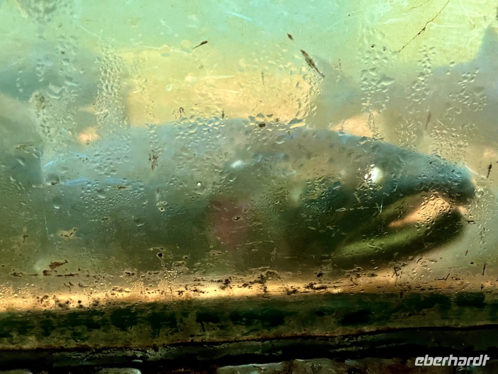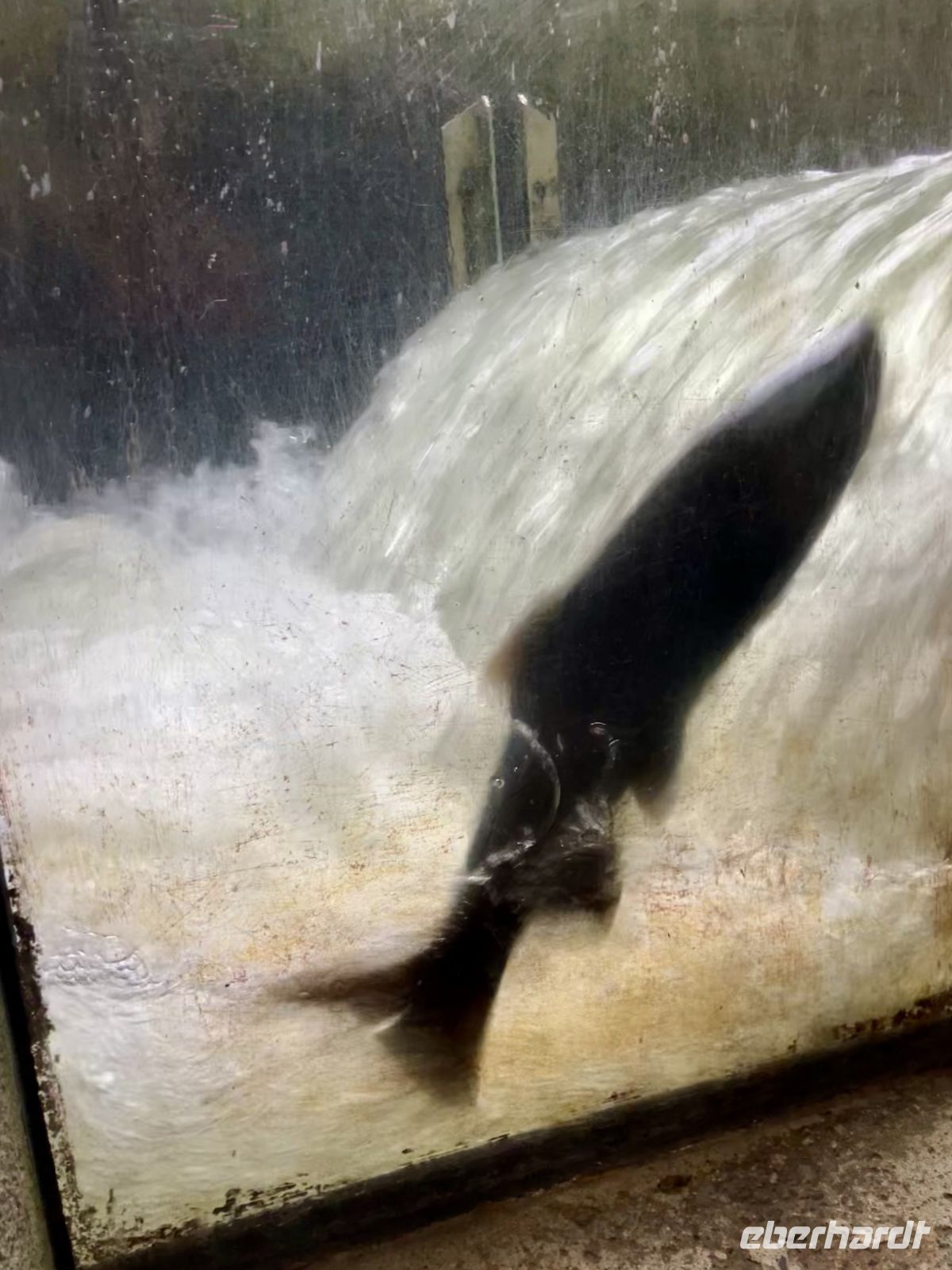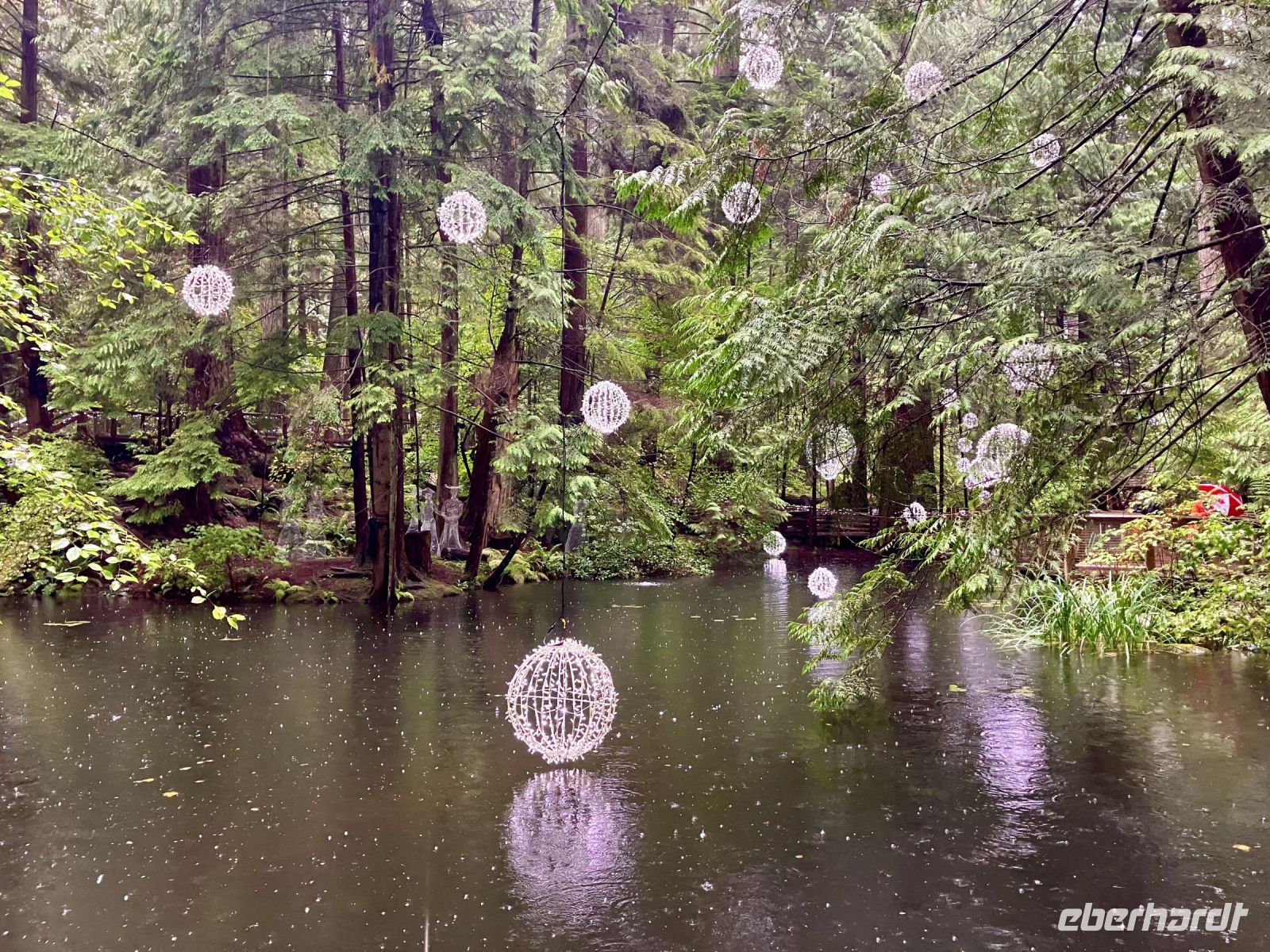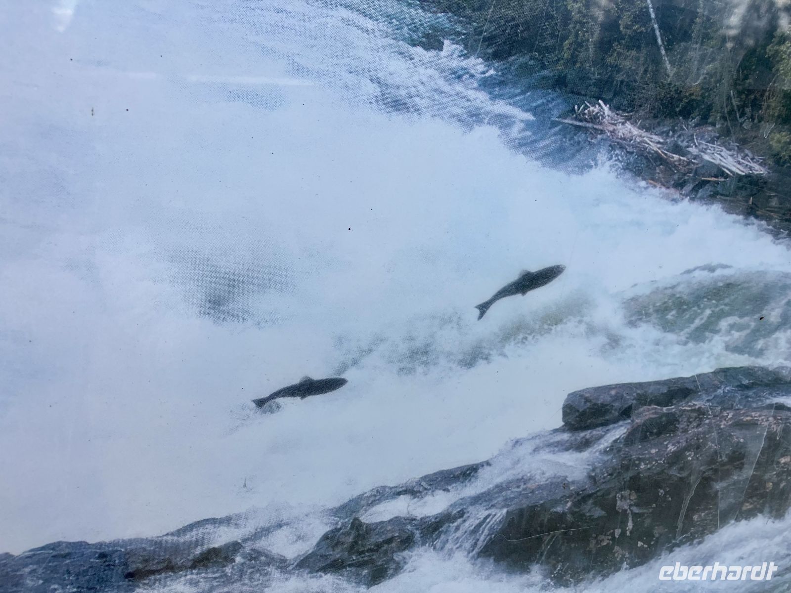 Unterdessen ist John vorgefahren mit seinem aelteren Bus. John ist Koreaner und lebt seit 30 Jahren in Vancouver. Er faehrt uns ueber die Lions Gate Bruecke nach North Vancouver und gleich hinauf zum Cleaveland Damm. Man sieht von dem grossen Stausee kaum was, da die Wolken so niedrig haengen. Wir sind alle ausgeruestet mit wasserdichter Bekleidung und Schirm. Da kommen uns doch tatsaechlich Leute entgegen die lachend mit kurzen Hosen und Pulli gekleidet ihre Hunde gassi gassi spazieren. Pudelnass die Hunde und ihre Herrchen und Damchen auch. So starten wir unsere Regenwald-wanderung. Wir gehen Wald-baden, im wahrsten Sinn der Worte. Vorerst ueber den Damm und dann in den Wald hinein. Ueber Stock und Stein fuehrt uns der Wanderweg durch einen wunderschoenen Wald mit altem Baumbestand, hinunter bis zu der Lachs-Aufzucht Station. Sie ist so interessant, hier springen die Lachse und Lachs-forellen die Stufen der Lachsleiter hinauf bis sie in einem Bassin landen wo die kuenstliche Befruchtung stattfindet. Wir machen natuerlich 100 Bilder der springenden Lachse, aber bloss ganz wenige Fotos haben dann tatsaechlich einen springenden Lachs im Bild !