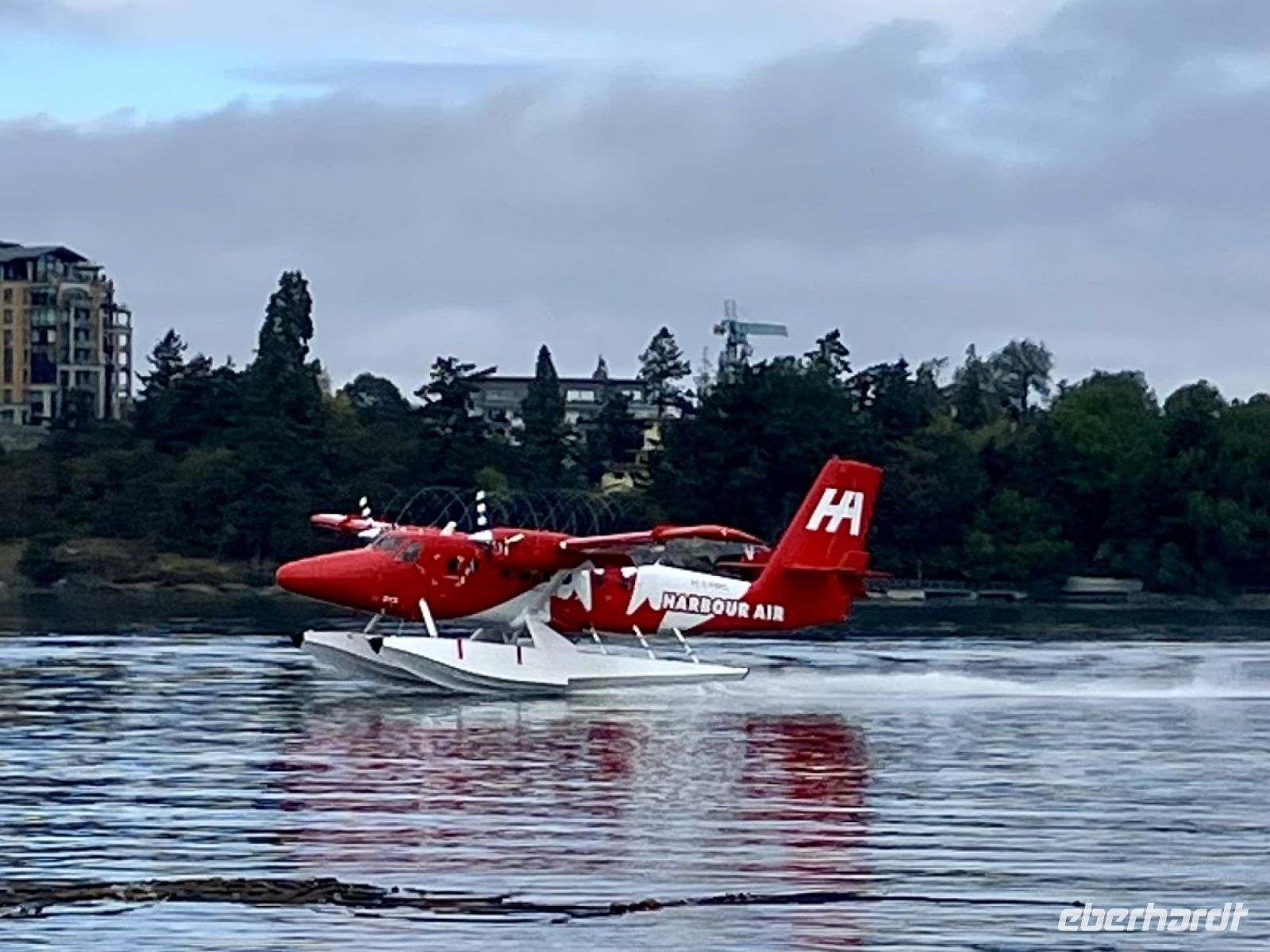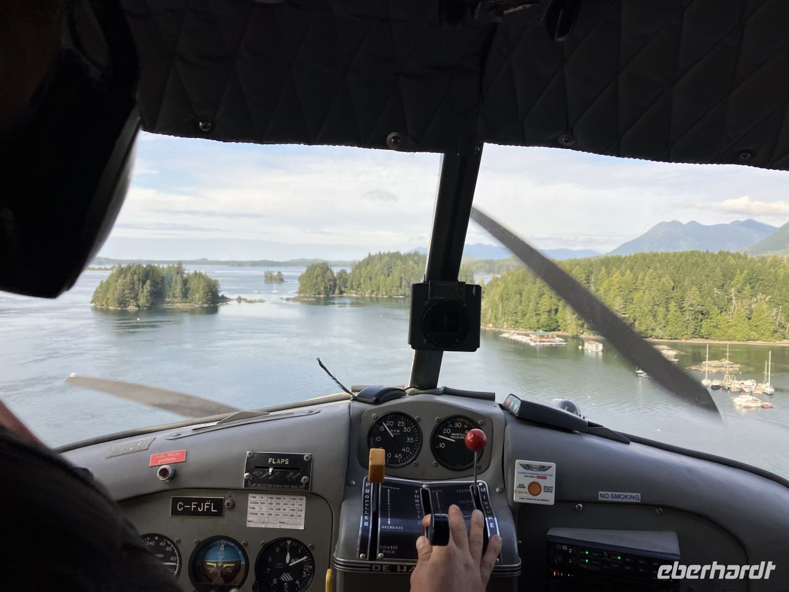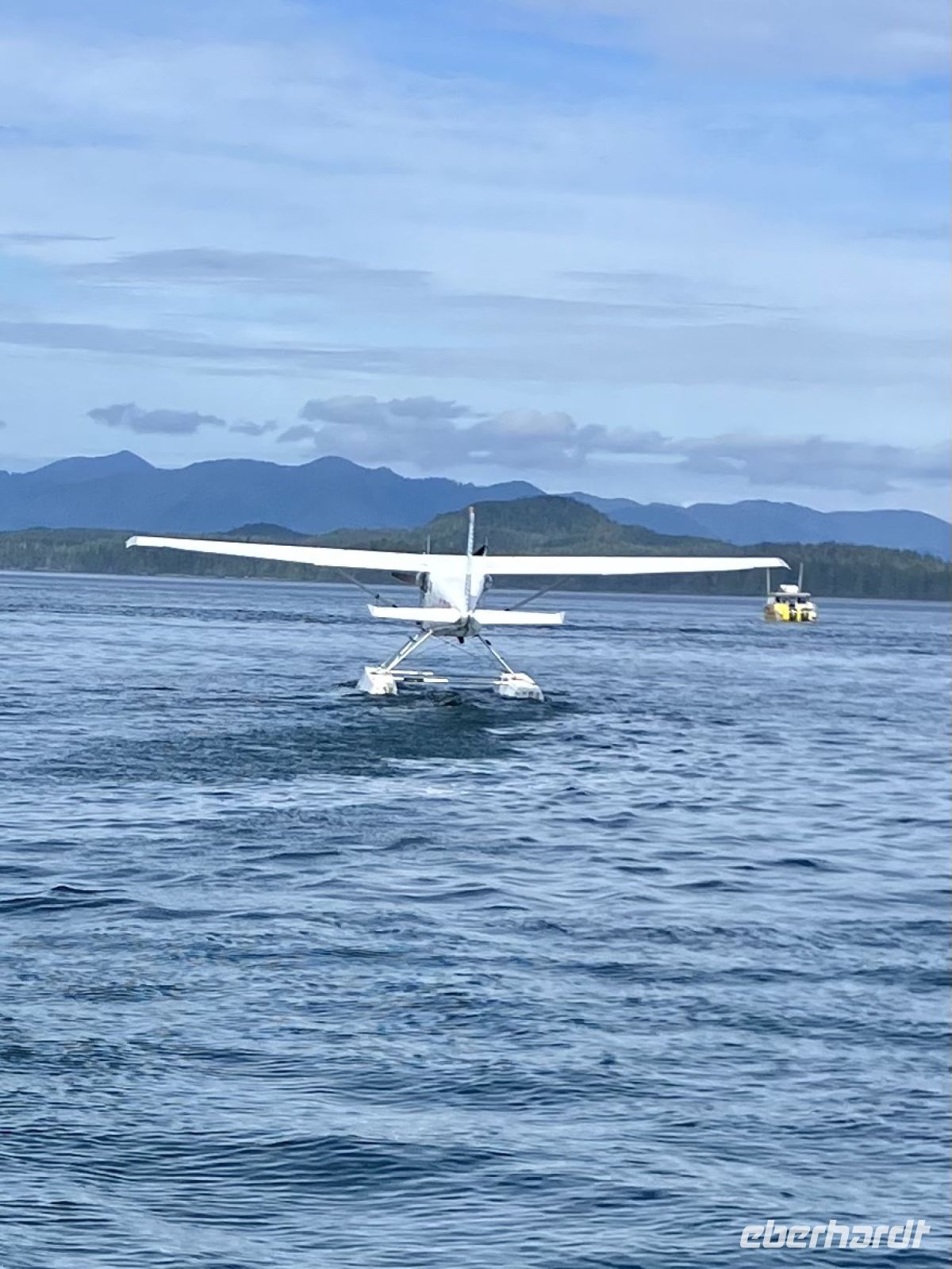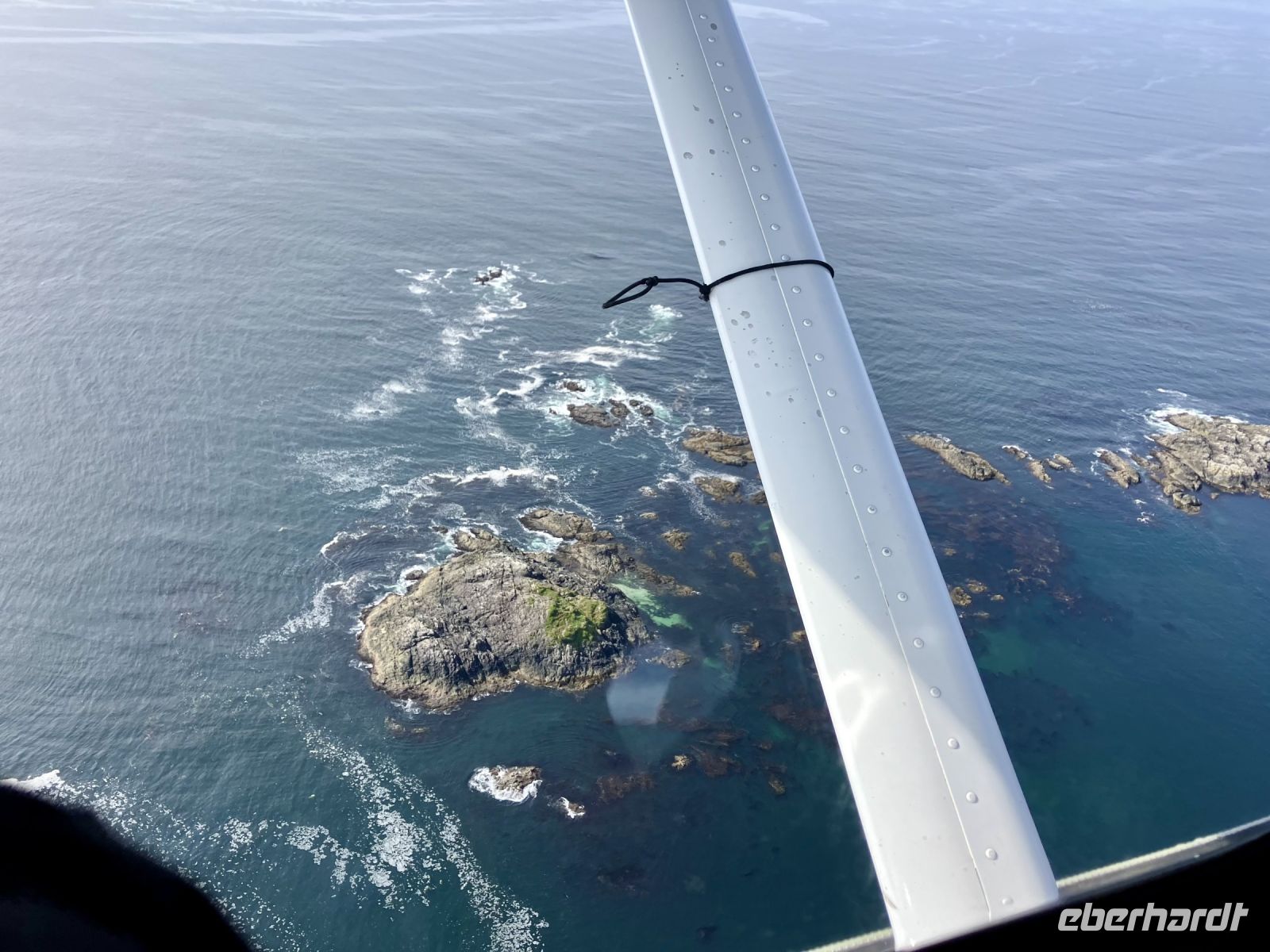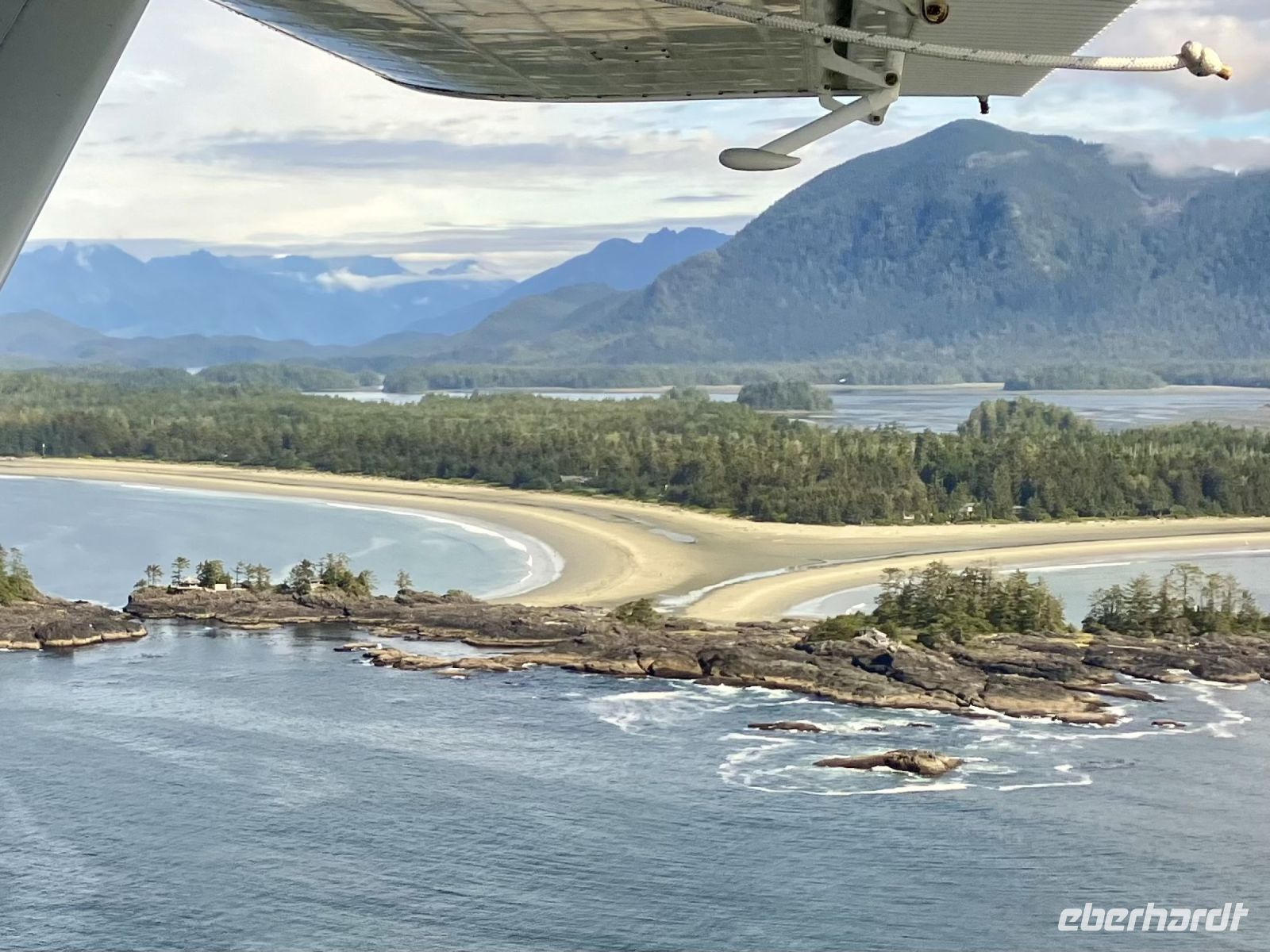 Mit 2 gecharteten Wasserflugzeuge, ein Beaver und einer Cessna, fliegen wir alsobald 30 Minuten lang ueber die tolle Inselwelt von Tofino und den Urwald. Wir schauen und staunen und ploetzlich sehen wir auch Wale. Gleich 3 Buckelwale tummeln sich unter uns im Wasser. Von oben gesehen sind sie ganz hell und noch immer riesengross. Was fuer ein Glueck. Der Abflug und die Landung erfolgen natuerlich auf dem Meer gleich im Hafen von Tofino. Es war ein tolles Erlebnis. Nun aber gleich weiter zum Abenteuer no 3 heute.