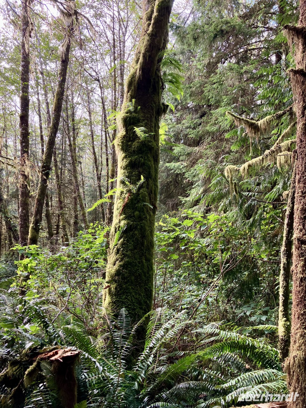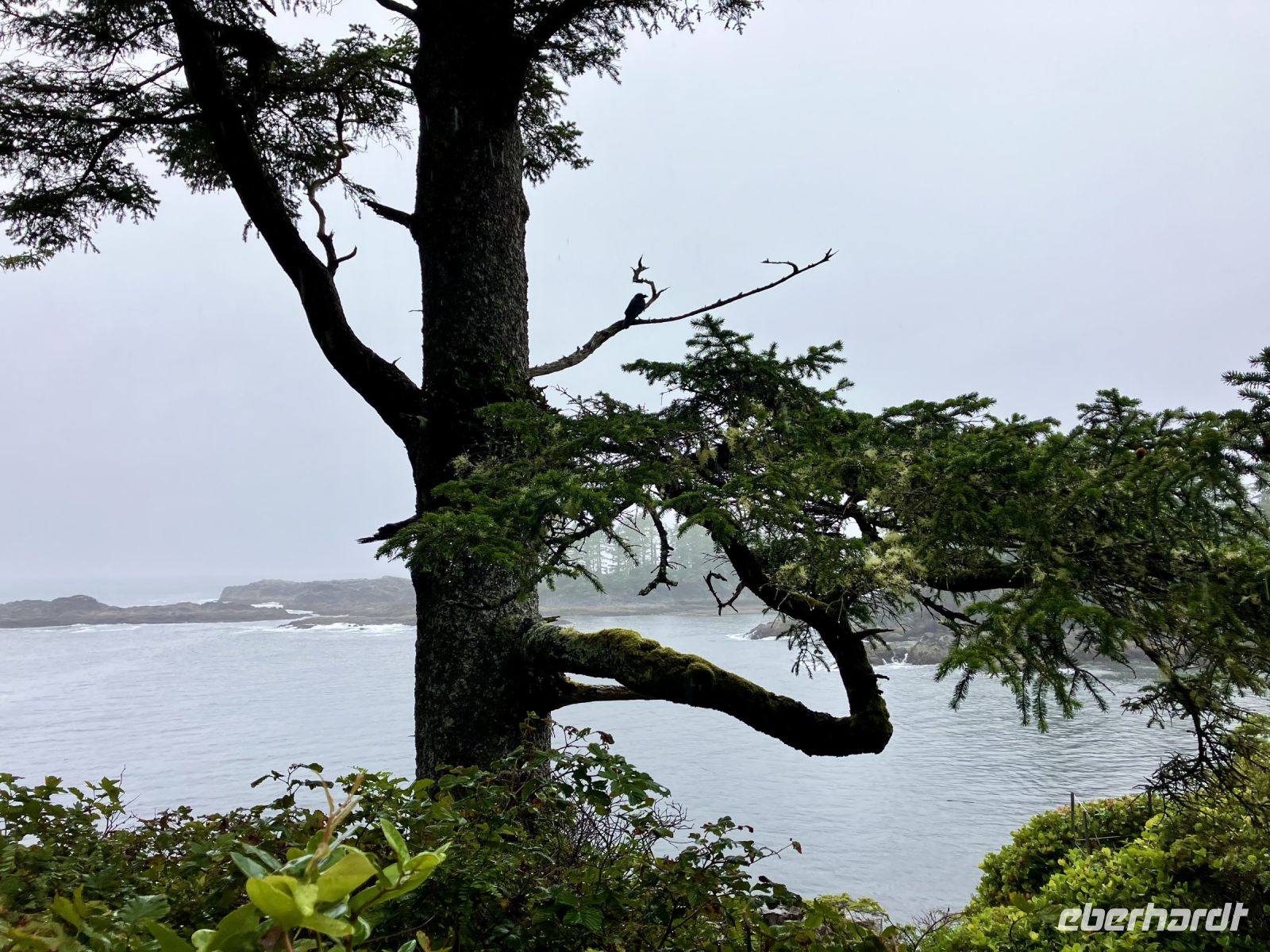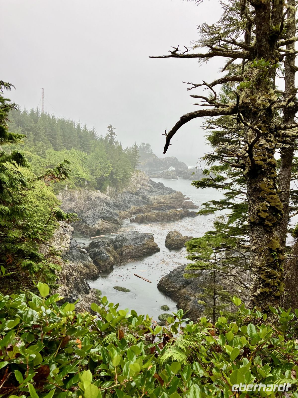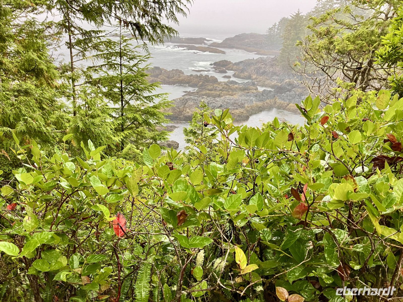 In Ucluelet beginnt sie, unsere «Romantische Wanderung». Da das Nieseln nun leichter Regen ist, wandern wir anstelle von einer Stunde, bloss 3/4 Stunde der Kueste entlang wieder in einem bezaubernden Regenwald. Die Moose an den Riesen, die Wurzeln, die Farne im Unterholz und die Aussichten aufs Meer lassen uns staunen , die Eindruecke sind haftend. Der Wanderweg ist relativ trocken da neu angelegt also gut zum gehen und stehen. Beim Leuchtturm biegen wir zum Parkplatz ab.