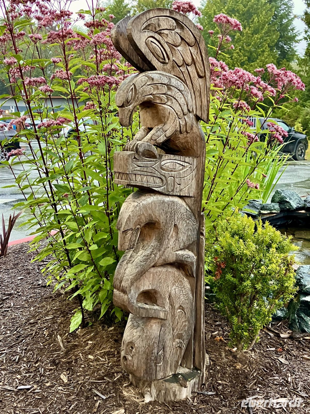 Abreise von Victoria steht heute auf dem Programm. Sobald die Koffer im Bus verstaut sind, fahren wir vorerst zur Meile 0 der Trans Canada Highway. Das Hotel war in der Sonne aber hier, etwa 1 Km entfernt stehen wir in einem tiefen dichten Nebel. Weiter geht die Fahrt durch die vornehmen Wohnviertel dieser Stadt. Am Meer entlang fahrend vermissen wir die herrliche Aussicht auf die olympischen Berge von Washington State aber wir hatte dies ja gestern auf der Walbeobachtung bereits gesehen. Die herrschaftlichen Haeuser hier in Victoria haben alle eine tolle Aussicht wir koennten da glatt einziehen. In den Uplands, geht es dann etwas zu steiff zu und her, bloss die Englaender durften hier wohnen und die Villen hier sind enorm gross wenn auch sehr schoen.