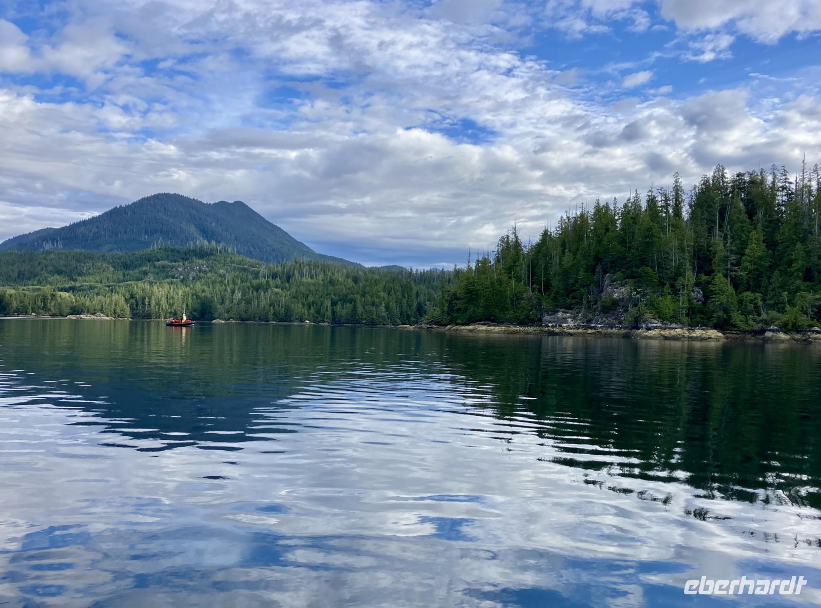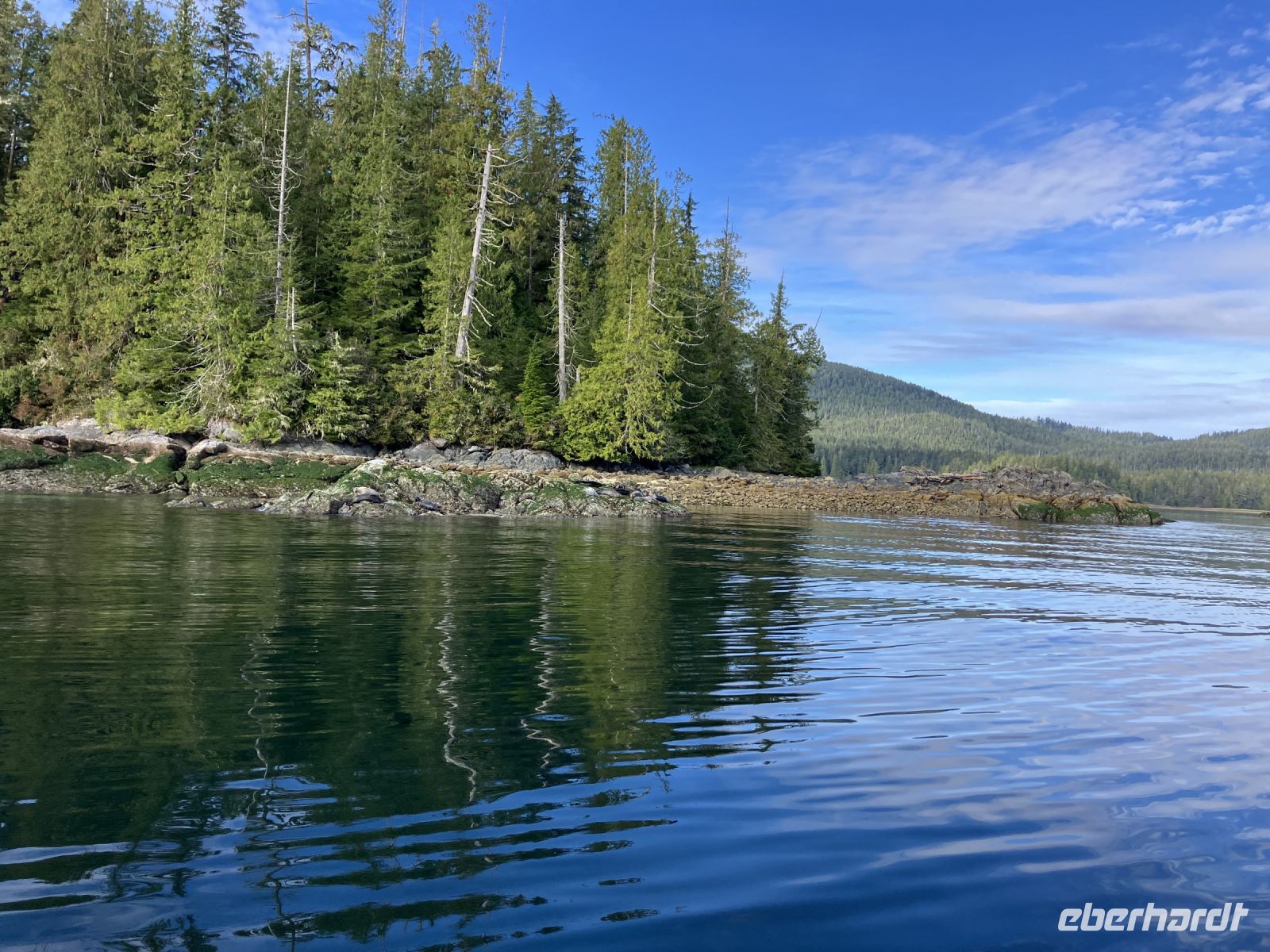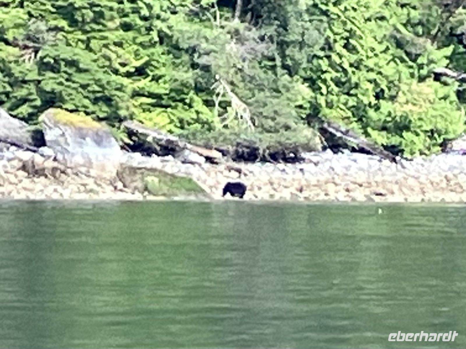 Puenktlich um 8 Uhr frueh gehts fuer die anderen bereits los. Bei der Marine Firma werden wir nun in rote Mars-maennchen verwandelt denn so schauen wir aus in diesen riesen Anzuegen. Noch schnell aufs Klo und ab gehts auf einen grossen weissen Zodiak. Wir haben das ganze Boot fuer uns. Rasant fahren wir ueber die glatte Meeresbucht an vielen Straenden, Berge, 1 Dorf und viel, viel Wald vorbei bis hinter einen riesen Berg. Maers Island heisst diese Insel. Tatsaechlich gehts abrupt langsamer und da sehen wir sie auch. Wirklich, eine grosse schoene schwarze Mama Baer mit 2 Zoeglingen. Sie dreht fast jeden Stein um, um da nachzuschauen, ob sich nicht darunter Krebschen verstecken, oder Muscheln sich angehaftet haben. Das sind alles Lieblingsspeisen von Mama Baer. Die jungen tummeln sich derweilen. Die rasante Fahrt mit unserem riesen Schlauchboot geht nun weiter zu einem anderen Strand wo sich anscheinend ein grosser maennlicher Baer aufhaelt. Auch er besorgt sich gerade das heutige Fruehstueck. So toll, so einmalig, wir werden das niemals vergessen. Auf dem Rueckweg zum Hafen sehen wir noch Felsen mit vielen Seehunden die sich, wie die Wuerstchen auf dem BBQ an der Sonne aufwaermen. Wieder an Land gehen wir schleunigst weiter zum Abenteuer no 2 heute.