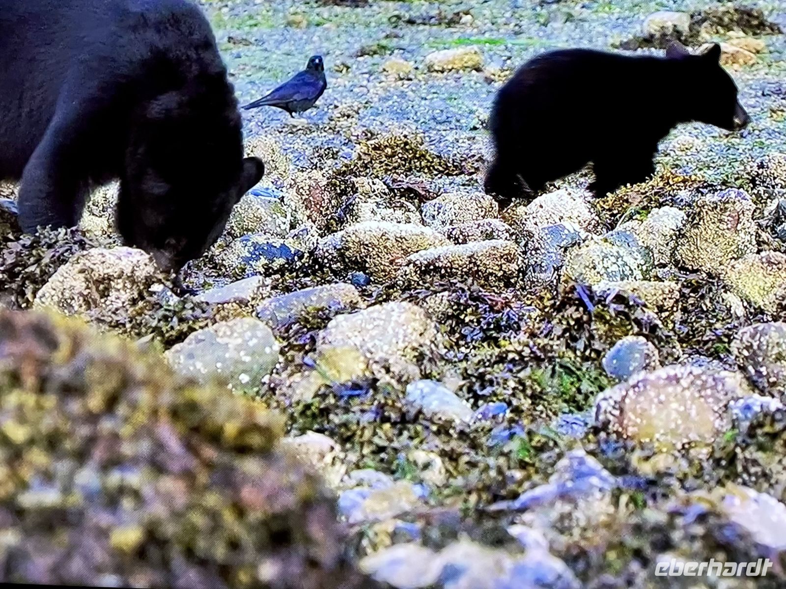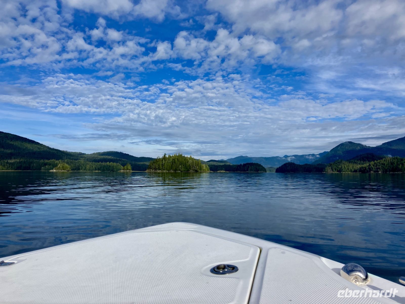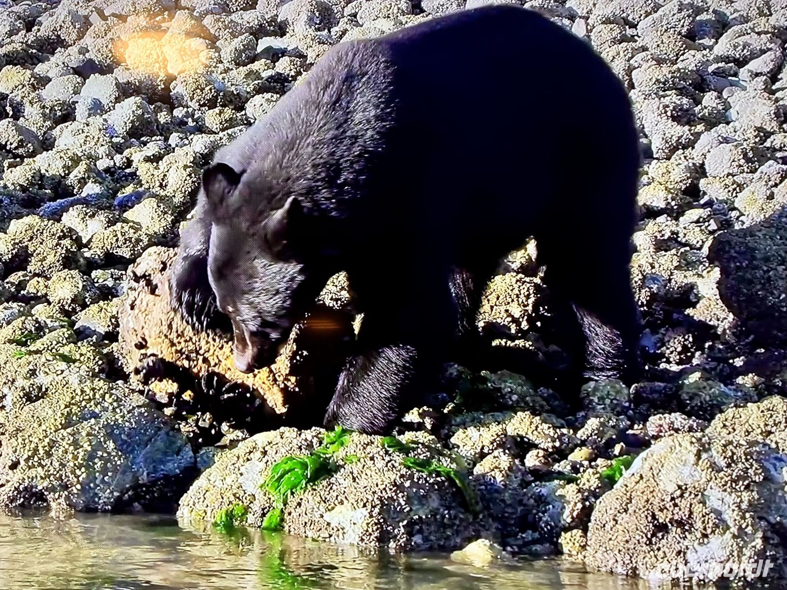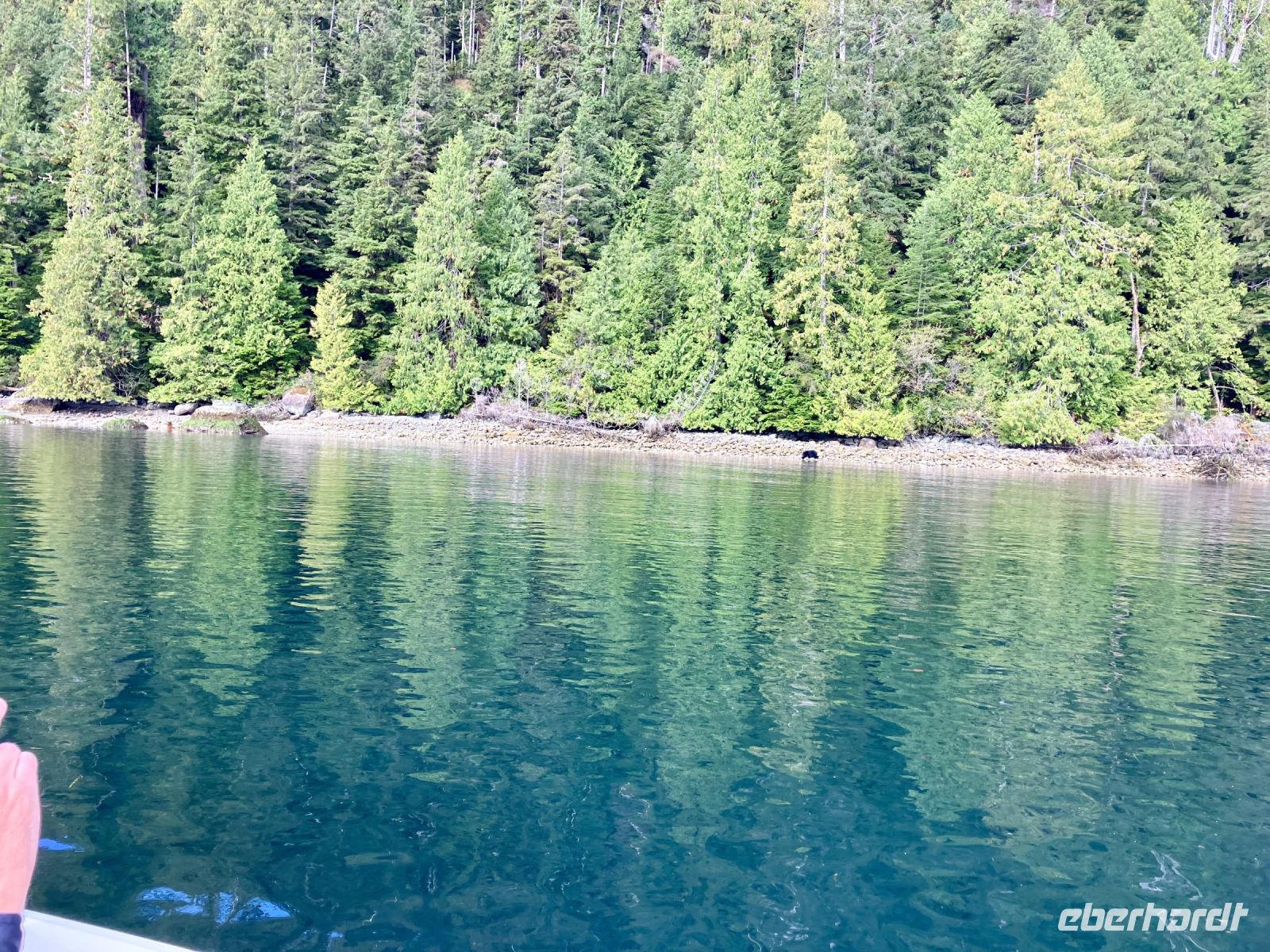 Puenktlich um 8 Uhr frueh gehts fuer die anderen bereits los. Bei der Marine Firma werden wir nun in rote Mars-maennchen verwandelt denn so schauen wir aus in diesen riesen Anzuegen. Noch schnell aufs Klo und ab gehts auf einen grossen weissen Zodiak. Wir haben das ganze Boot fuer uns. Rasant fahren wir ueber die glatte Meeresbucht an vielen Straenden, Berge, 1 Dorf und viel, viel Wald vorbei bis hinter einen riesen Berg. Maers Island heisst diese Insel. Tatsaechlich gehts abrupt langsamer und da sehen wir sie auch. Wirklich, eine grosse schoene schwarze Mama Baer mit 2 Zoeglingen. Sie dreht fast jeden Stein um, um da nachzuschauen, ob sich nicht darunter Krebschen verstecken, oder Muscheln sich angehaftet haben. Das sind alles Lieblingsspeisen von Mama Baer. Die jungen tummeln sich derweilen. Die rasante Fahrt mit unserem riesen Schlauchboot geht nun weiter zu einem anderen Strand wo sich anscheinend ein grosser maennlicher Baer aufhaelt. Auch er besorgt sich gerade das heutige Fruehstueck. So toll, so einmalig, wir werden das niemals vergessen. Auf dem Rueckweg zum Hafen sehen wir noch Felsen mit vielen Seehunden die sich, wie die Wuerstchen auf dem BBQ an der Sonne aufwaermen. Wieder an Land gehen wir schleunigst weiter zum Abenteuer no 2 heute.