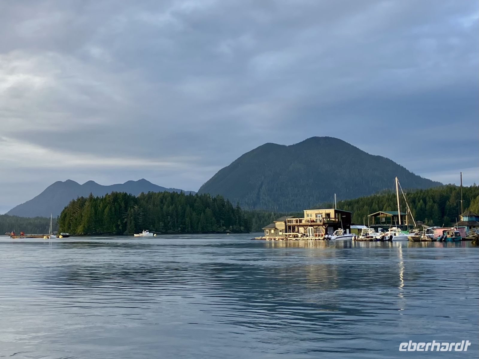 Heute ist ein Wolkentag angesagt, das ist OK da wir viele Kilometer zuruecklegen muessen und unsere Kamera auch mal Urlaub machen moechte. Auf der Sea to Sky Highway fahren wir zuegig in Richtung Vancouver. Oh schau, wie schoen die Tantalus Berge mit ihren riesen Gletscher welche in der Sonne glitzern. Also ist aus mit dem Urlaub fuer unsere Handys und Kameras. Wir steigen alle aus, um diese Aussicht zu geniessen und festzuhalten. Naechster Halt ist Horseshoe Bay, das ist einer der zwei Faehrehafen fuer die vielen Faehren welche Vancouver mit Vancouver Island verbinden. Die Faehre bringt uns in 1 Stunde 35 Minuten auf die Insel von Vancouver. Wir fahren gleich mit dem Bus auf die Faehre und steigen aus um dem Auslaufen beizuwohnen. In der Ferne kann man die Hochhaeuser von Vancouver sehen. Es ist wunderschoen hier inmitten der Inseln. Die Perle des Pazifiks werden wir jedoch erst in 4 Tagen besuchen ! Wir wollen heute nach Tofino, es liegt an der Westkueste der Insel. Der kurze Stop beim Markt in Coombs ist unterhaltsam, die Ziegen stehen auf dem Markthallendach und der Picknickeinkauf fuer Morgen ist daher sehr unterhaltsam in dieser lustigen und farbenfroher Markthalle. Die ½ Stunde vergeht sehr schnell, da es hier so viel anzuschauen gibt. Waeren die Koffer nicht schon so voll, haetten wir gerne so einen Riesenbudda fuer den lieben Nachbarn, ein Holzspielzeug fuer die Enkelchen oder einen handgefertigten Tontopf fuer den eigenen Garten mitgebracht. Leider, leider. Fuers Picknick hats gerade noch gereicht. Spaeter gehen wir ganz vertraeumt in einem Urwald spazieren. Die Riesen in Cathedral Grove schauen auf uns Zwerge hinunter und viele Baeume sind von Moos so umgeben, es scheint sie haetten Pelzmaentel an. Jetzt fahren wir aber weiter, denn die Strecke nach Tofino zieht sich immer in die Laenge. Wir fahren zuegig durch den Wald in praechtigem Sonnenschein und durchqueren so die ganze Insel von Vancouver um an die Westkueste zu gelangen. Dort angekommen, gehen wir gleich mal an einen wilden Strand. Ahh die Luft, das Meer, die Muscheln, das gesunde Kelp, die leeren Krebshuelsen und das viele Schwemmholz, alles passt in dieses Bild. Die Sonne lacht, die Luft ist lau, es ist perfekt. Die kleinen Felsen am Strand lassen die Wellen hochsteigen, das Meer zieht sich in die Ebbe zurueck und hinterlaesst einen 100 Meter breiten hellen Sandstrand. Viele Holzstaemme liegen wie ein riesen-Mikadospiel am Ufer und die Kelp Pflanzen haben sich ineinander gewickelt, sodass sich richtige Kelp-Knoten vom Sand erheben. Mit einer Pflanze springen wir auch Seil, zwei halten die Enden und schwingen die Pflanze und wir springen wie die kleinen Maedchen damals auf dem Schulhof. Wir geniessen diesen Aufenthalt und bleiben auch eine Weile. Nach diesem schoenen ersten Eindruck an der Westkueste fahren wir noch einige Kilometer und checken alsobald in unser Hotel am Hafen von Tofino ein. Noch schnell runter zum Hafen, um diesen tollen Sonnenuntergang zu verewiger. Alle beziehen wir unsere Zimmer und gehen auch gleich ins Dorf Tofino hinein, um ein geeignetes Restaurant zu suchen. Es gibt hier wirklich alles, von kleinen Fisch Kneipen bis zu luxus Restaurants. Nun aber schnell ins Bett denn, den morgigen Tag koennen wir kaum erwarten.
