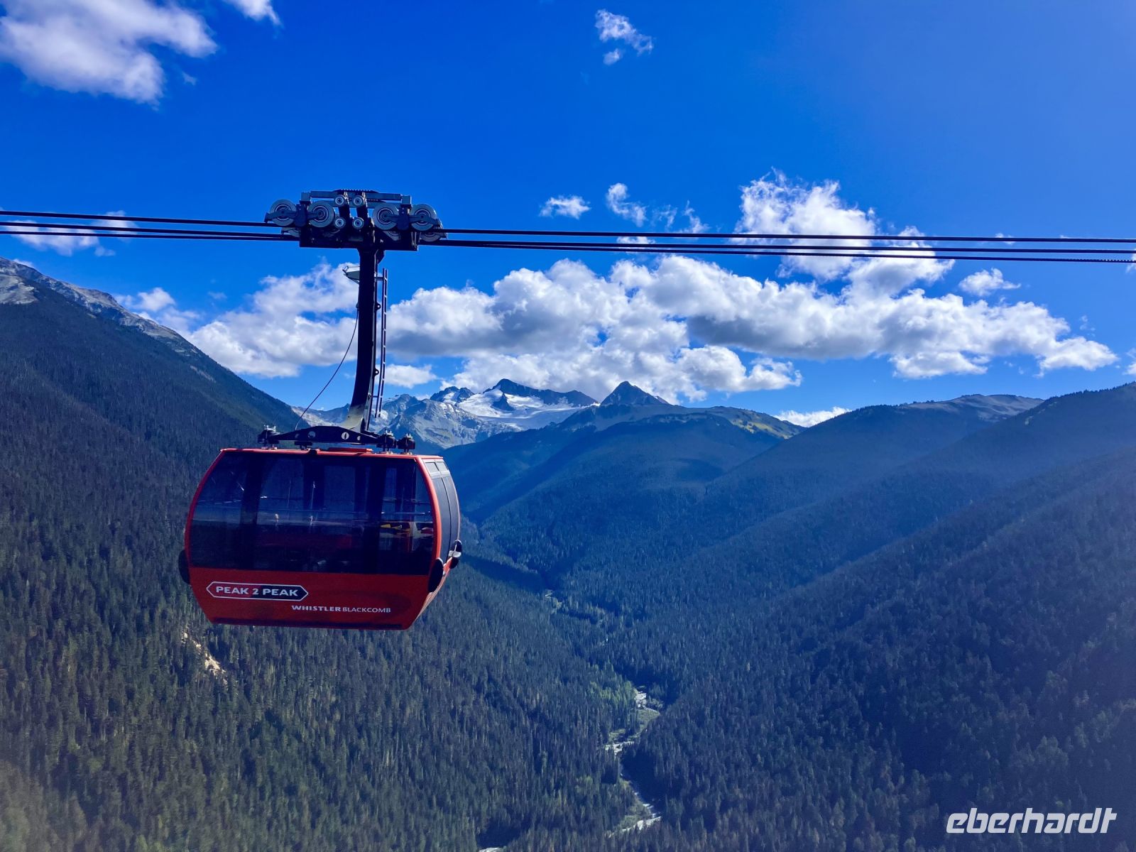 Guten Morgen in Whistler. Es gibt ein paar tiefhaengende Wolken vor der Sonne, es regnet nicht, so ein riesen Glueck ! Fruehstueck gibt es heute in einem nahegelegenen Restaurant. Heute gibt es Ei Benedikt und sie schmecken wirklich sehr gut. Der Capuccino oder Latte sind auch koestlich, endlich wieder einen Kaffee wie daheim. Gestaerkt gehen wir nun die 8 Minuten ins obere Dorf am Fusse des Blackcomb Mountain. Alsobald werden wir mit Tageskarten bestueckt und auf gehts zur Blackcomb Gondola. Mit dieser neuen Gondel schweben wir hinauf. Da gibt es auch einen Zwischenhalt und wir wollen natuerlich gleich aussteigen, ahhh nein, Elisabeth hat doch gesagt, wir sollen sitzen bleiben bis wir ganz oben auf dem Berg sind. Ploetzlich ist aus mit der Sicht, wir sind in der Wolke....grosse Freude kommt jedoch auf, wenn wir oben sind, praechtiger blauer Himmel erwartet uns auf Blackcomb Mt.