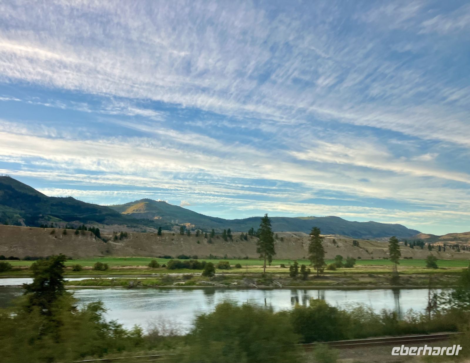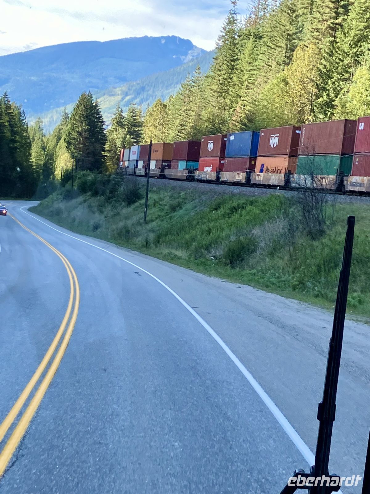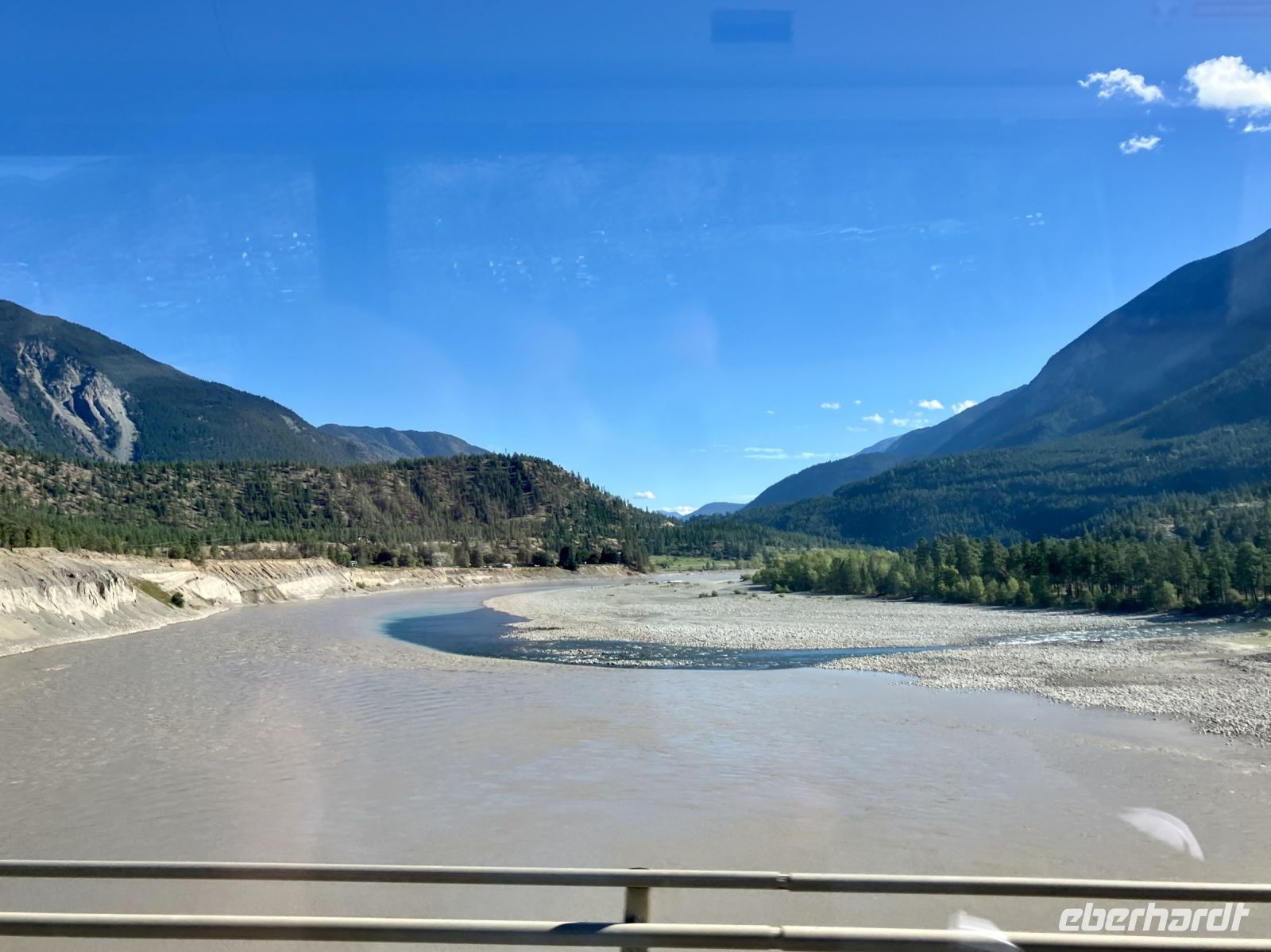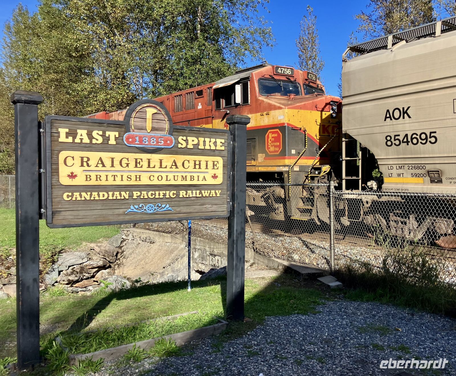 Beim Hotel angekommen steigen wir um in unseren Bus und Chris fahrt uns nach Revelstoke hinein und zum Ufer des Columbia River. Ein tolles kleines Staedtchen dies Revelstoke, mit ein paar historischen Haeuser, viel Gruen, und schnurgeraden Strassen. Die Eisenbahn, der Tourismus und die Stromerzeugung ist hier wohl dass wichtigste. Nun aber weiter denn wir haben noch einen langen Weg vor uns. In Craigallachie schauen wir uns den historisch so wichtigen Punkt an. Mitten im Nirgendwo wurde naemlich im 1885 der letzte Nagel eingeschlagen, der die Eisenbahnlinie vom Osten Kanadas mit dem Westen Kandas fuer immer verbinden wird. Ein Zug kommt auch vorbei, wie schoen, das gibt ein schoenes Bild. Nun aber weiter mit einem kurzen Halt bei der Eisdiele einer hollaendischen Farm. Das schmeckt gut und macht uns aber auch etwas muede. Also machen wir nun ein Nickerchen und wachen erst bei Kamloops wieder auf. Noch 1 1/2 Stunden dann sind wir in Clearwater. Das war nun ein sehr langer und auch sehr schoener Tag.