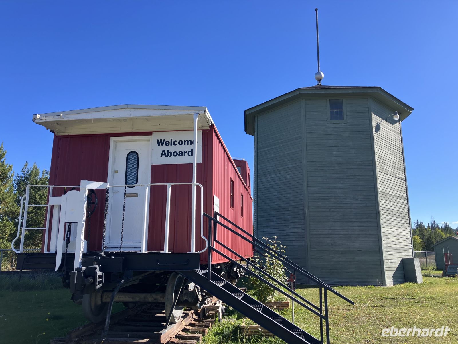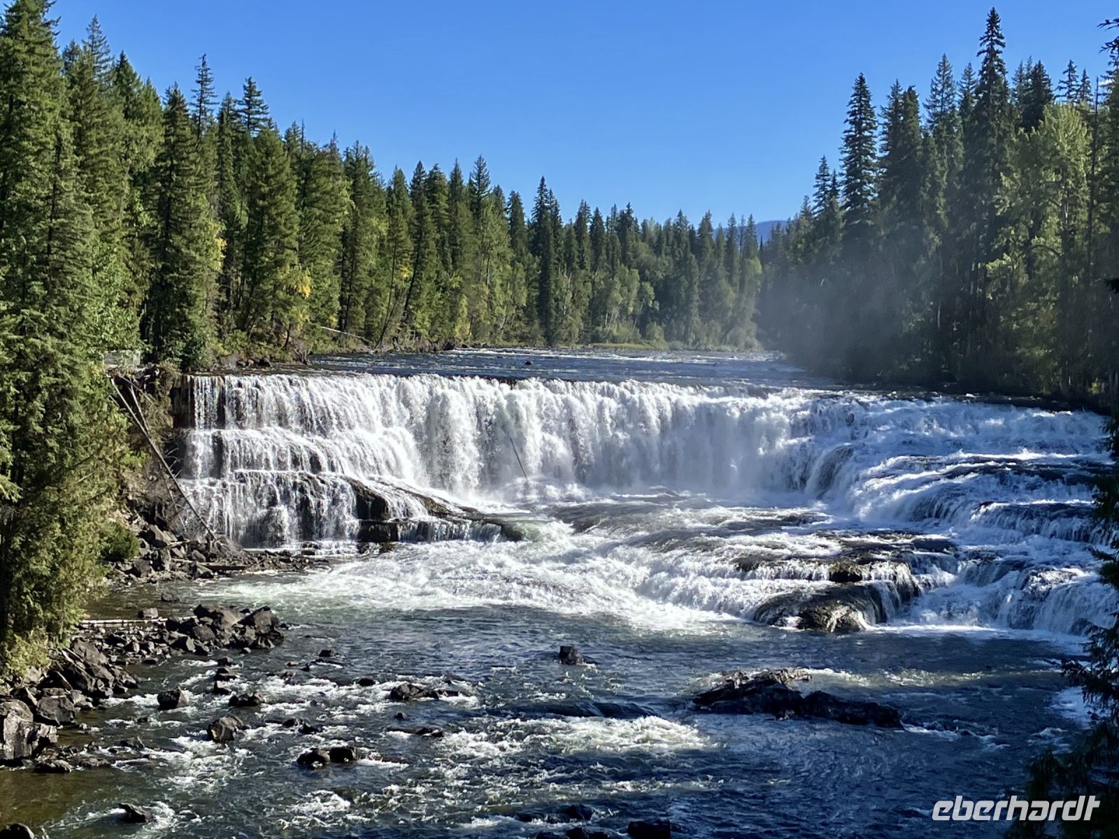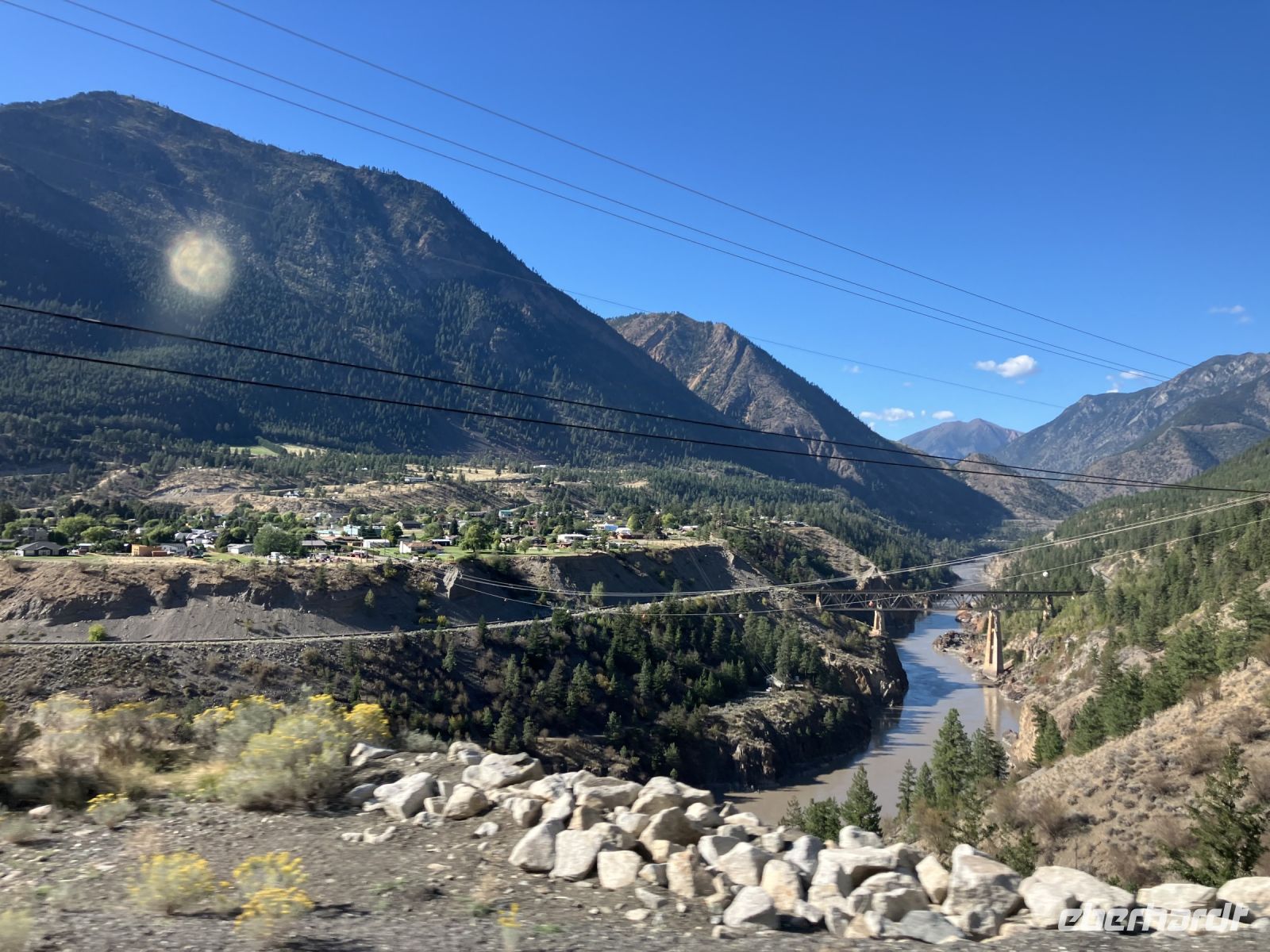 Beim Hotel angekommen steigen wir um in unseren Bus und Chris fahrt uns nach Revelstoke hinein und zum Ufer des Columbia River. Ein tolles kleines Staedtchen dies Revelstoke, mit ein paar historischen Haeuser, viel Gruen, und schnurgeraden Strassen. Die Eisenbahn, der Tourismus und die Stromerzeugung ist hier wohl dass wichtigste. Nun aber weiter denn wir haben noch einen langen Weg vor uns. In Craigallachie schauen wir uns den historisch so wichtigen Punkt an. Mitten im Nirgendwo wurde naemlich im 1885 der letzte Nagel eingeschlagen, der die Eisenbahnlinie vom Osten Kanadas mit dem Westen Kandas fuer immer verbinden wird. Ein Zug kommt auch vorbei, wie schoen, das gibt ein schoenes Bild. Nun aber weiter mit einem kurzen Halt bei der Eisdiele einer hollaendischen Farm. Das schmeckt gut und macht uns aber auch etwas muede. Also machen wir nun ein Nickerchen und wachen erst bei Kamloops wieder auf. Noch 1 1/2 Stunden dann sind wir in Clearwater. Das war nun ein sehr langer und auch sehr schoener Tag.