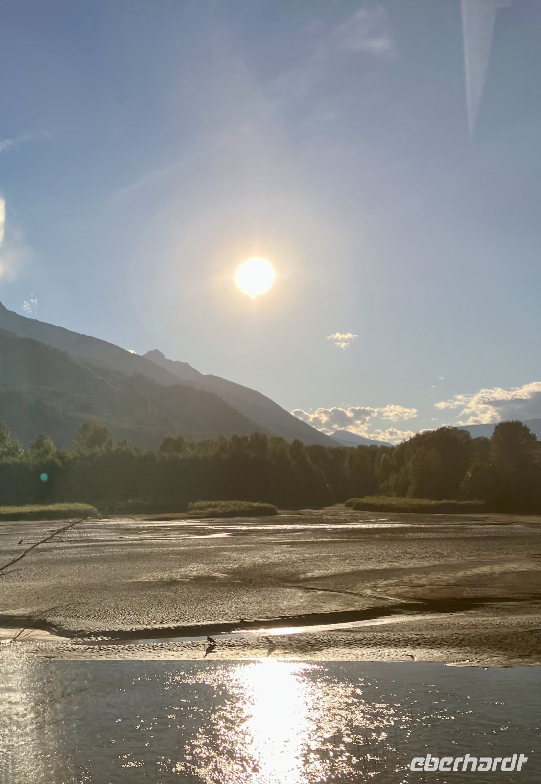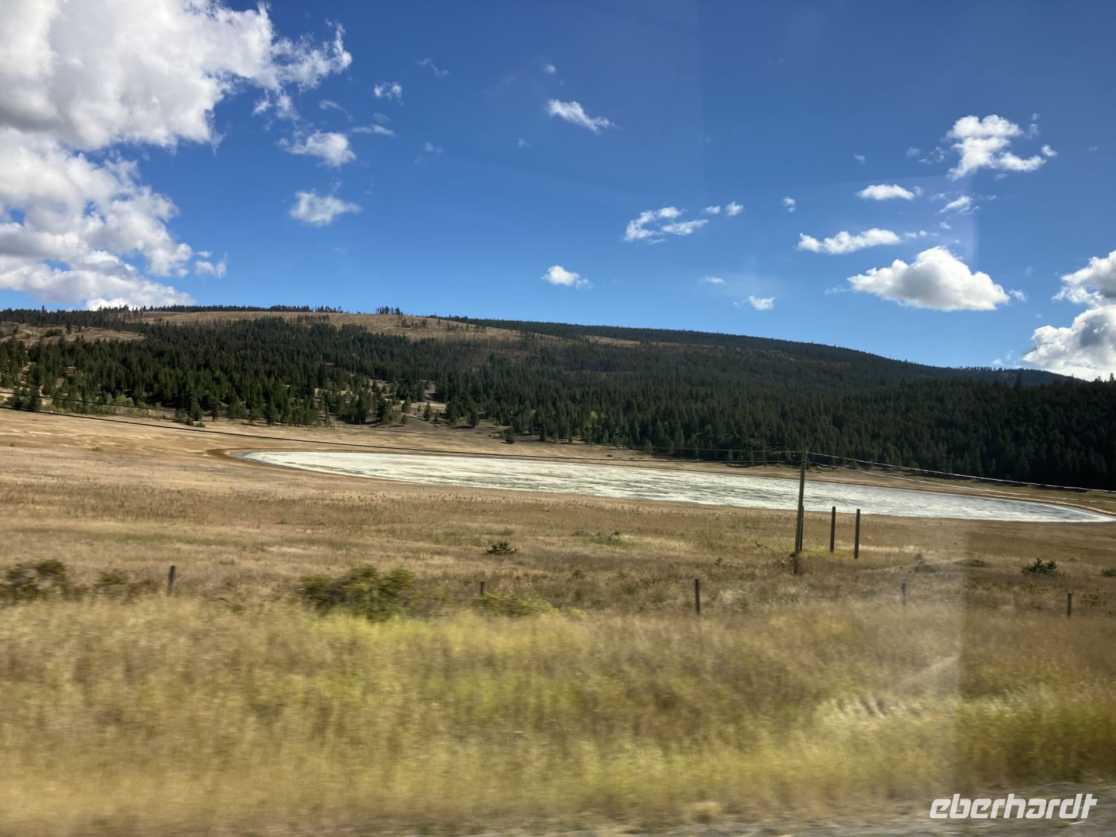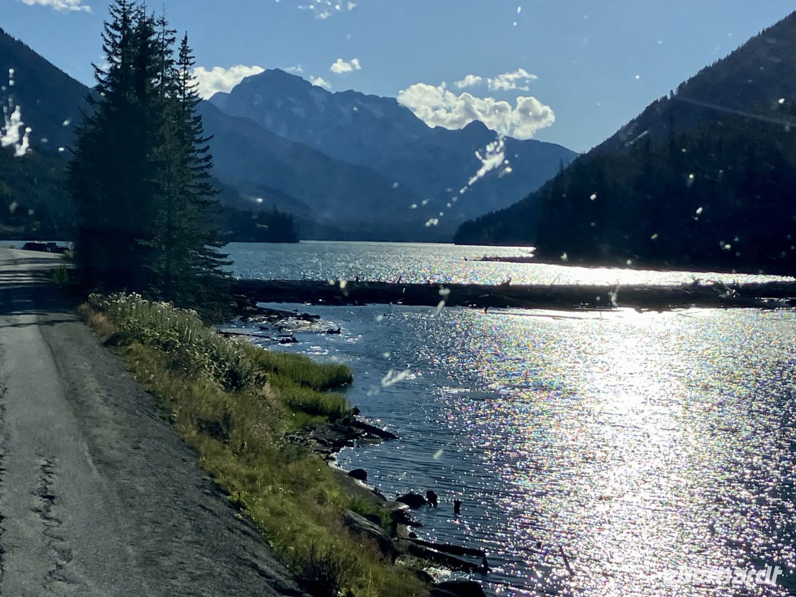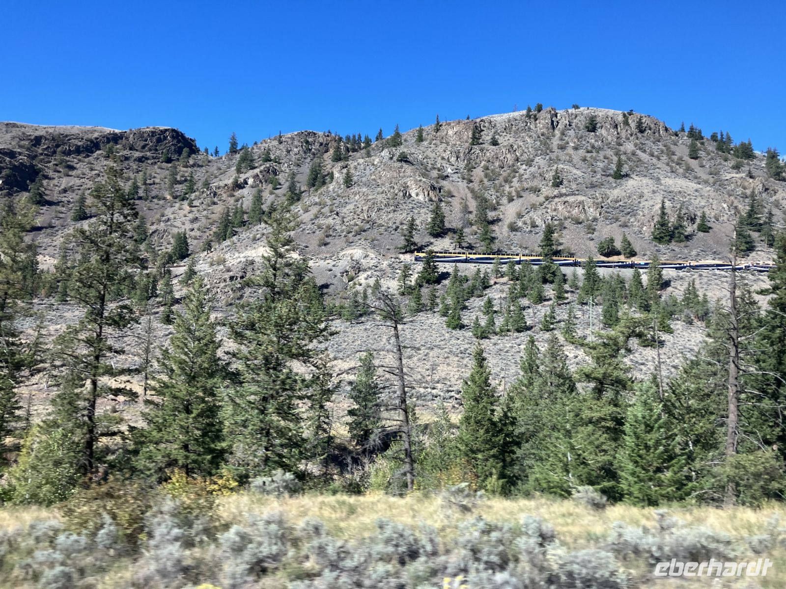 Beim Hotel angekommen steigen wir um in unseren Bus und Chris fahrt uns nach Revelstoke hinein und zum Ufer des Columbia River. Ein tolles kleines Staedtchen dies Revelstoke, mit ein paar historischen Haeuser, viel Gruen, und schnurgeraden Strassen. Die Eisenbahn, der Tourismus und die Stromerzeugung ist hier wohl dass wichtigste. Nun aber weiter denn wir haben noch einen langen Weg vor uns. In Craigallachie schauen wir uns den historisch so wichtigen Punkt an. Mitten im Nirgendwo wurde naemlich im 1885 der letzte Nagel eingeschlagen, der die Eisenbahnlinie vom Osten Kanadas mit dem Westen Kandas fuer immer verbinden wird. Ein Zug kommt auch vorbei, wie schoen, das gibt ein schoenes Bild. Nun aber weiter mit einem kurzen Halt bei der Eisdiele einer hollaendischen Farm. Das schmeckt gut und macht uns aber auch etwas muede. Also machen wir nun ein Nickerchen und wachen erst bei Kamloops wieder auf. Noch 1 1/2 Stunden dann sind wir in Clearwater. Das war nun ein sehr langer und auch sehr schoener Tag.