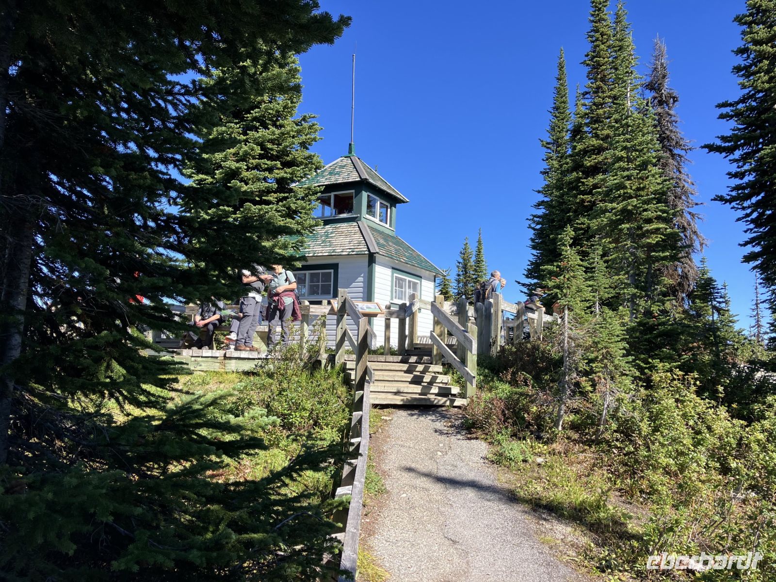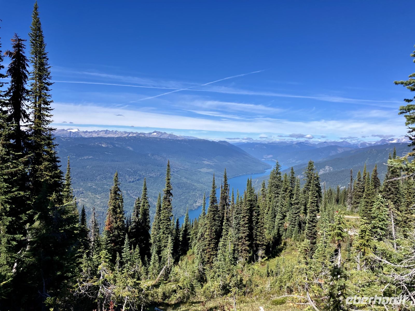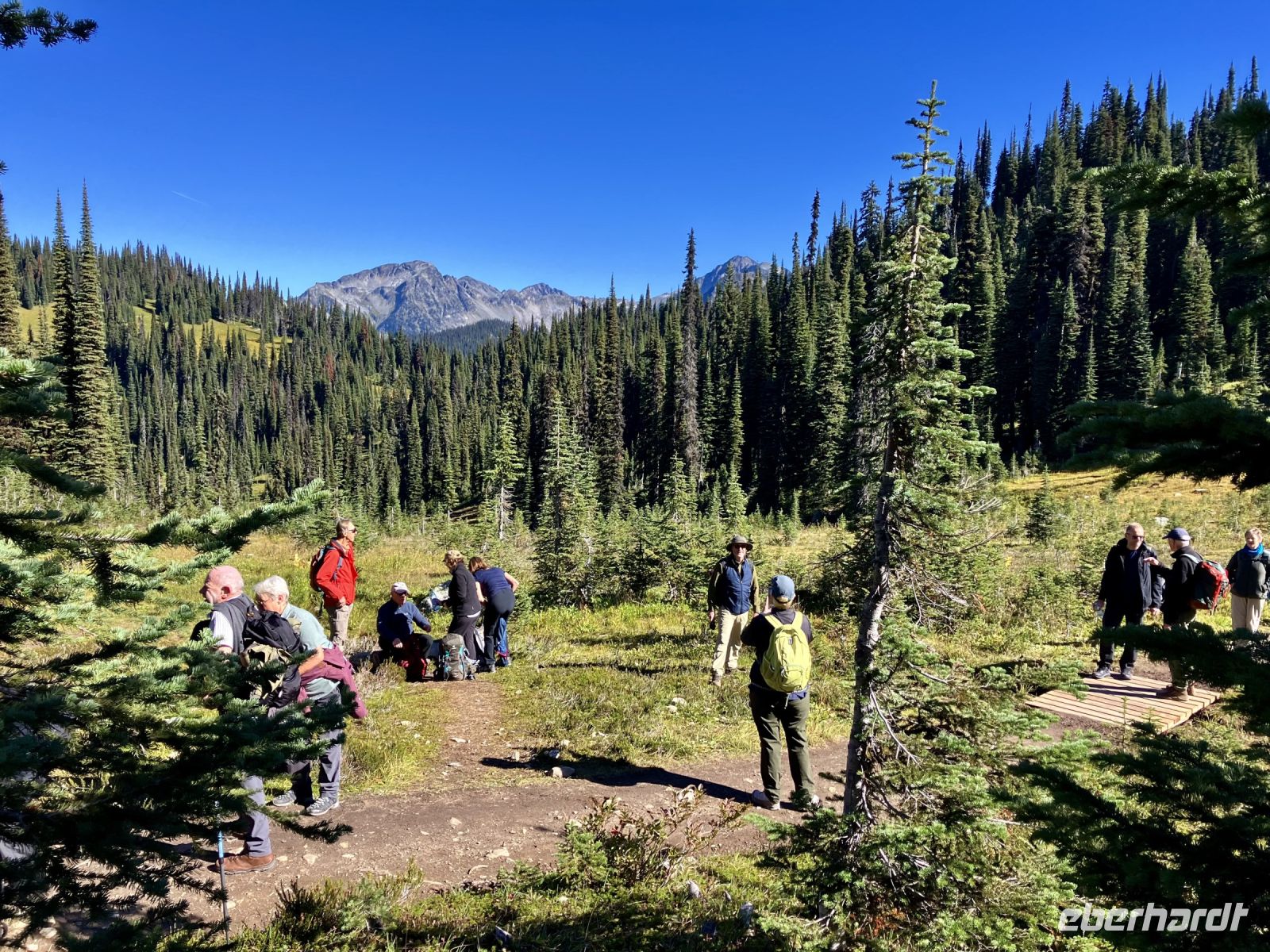 Nach dem schoenen Fruehstueck mit herrlicher Aussicht auf Revelstoke und seinen Columbia Fluss warten auch bereits zwei Minibusse auf uns. Unser heutiges Picknick ist bereit zur Abholung und wir stehen mit unseren Rucksaecken und Wanderschuhe bereit fuer diese Wanderung. Tom und Rob sind die beiden Fahrer und mit den Minibussen fahren wir nun auf den Parkway of the Sky. Ja, 26 Km fahren wir hinauf auf den Berg dieses National Parks. Wir befinden uns auf 1830 Meter ueber Meer, die Luft ist frisch, die Sonne Lacht, kein Woelkchen ist zu sehen. Echt perfektes Wanderwetter. Dem Balsam See wandern wir entlang auf die andere Seite und nehmen gleich schon mal einen falschen Weg der bloss eine Schlaufe macht. Nun aber sind wir auf dem richtigen Pfad der uns zu Millet Lake und Eva Lake fuehren wird. Gluecklich und gespraechig, wandern wir auf einem sehr schoenen Wanderweg an Wiesen vorbei ein bisschen bergauf und dann wieder bergab. Dieser National Park ist im Selkirk Gebirge und die Aussicht auf das Monashee Gebirge gegenueber ist einfach atemberaubend. Dazwischen sehen wir ihn auch immer wieder weit unten im Tal. Es ist der maechtige Columbia River. Nach 2 Stunden, entscheiden wir uns nicht hinunter zu den Seen zu wandern sondern hier auf einer schoenen trockenen Wiese mit tollem Panorama zu verschnaufen und unser Picknick auszupacken. Nach dieser erholsamen Pause wandern wir wieder zurueck und sehen diese Bergwelt nun nochmals aber von der anderen Seite. Angekommen beim Parkplatz haben wir noch Zeit um die Aussicht von dem Feuerwachturm aus zu bestaunen und noch mehr Fotos zu knipsen. Ach schau, da sind sie ja, unsere Minibusse mit Rob und Tom, sie fuehren uns nun wieder den Berg hinunter mit einem kurzen Fotostop dazwischen. Da sehen wir sie auch, 2 Weisskopfadler kreisen ueber unseren Koepfen und nutzen die Thermik um schwebend Hoehe zu gewinnen, immer kleiner werden sie, bis sie nicht im Himmel verschwinden.